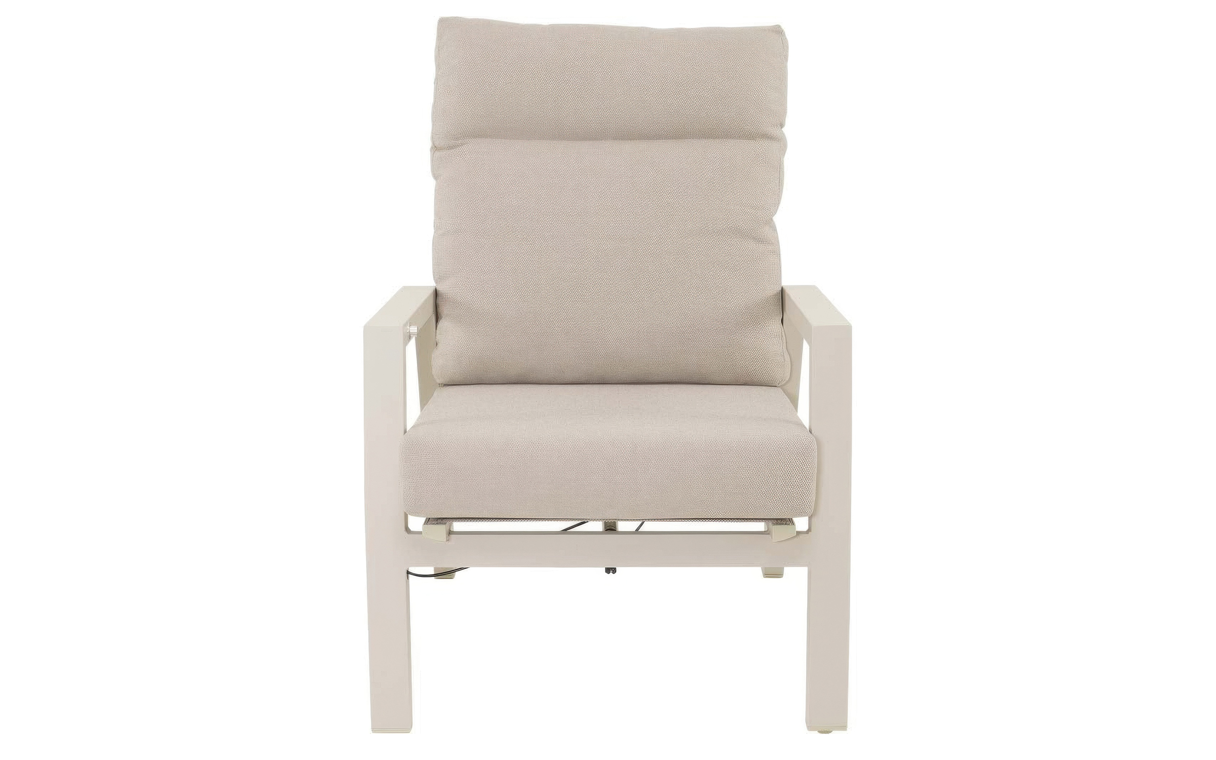 Aluminiowa konstrukcja malowana proszkowo. Na siedzisku i oparciu pod poduszkami gęsta tekstylina.
