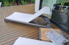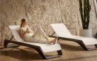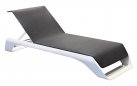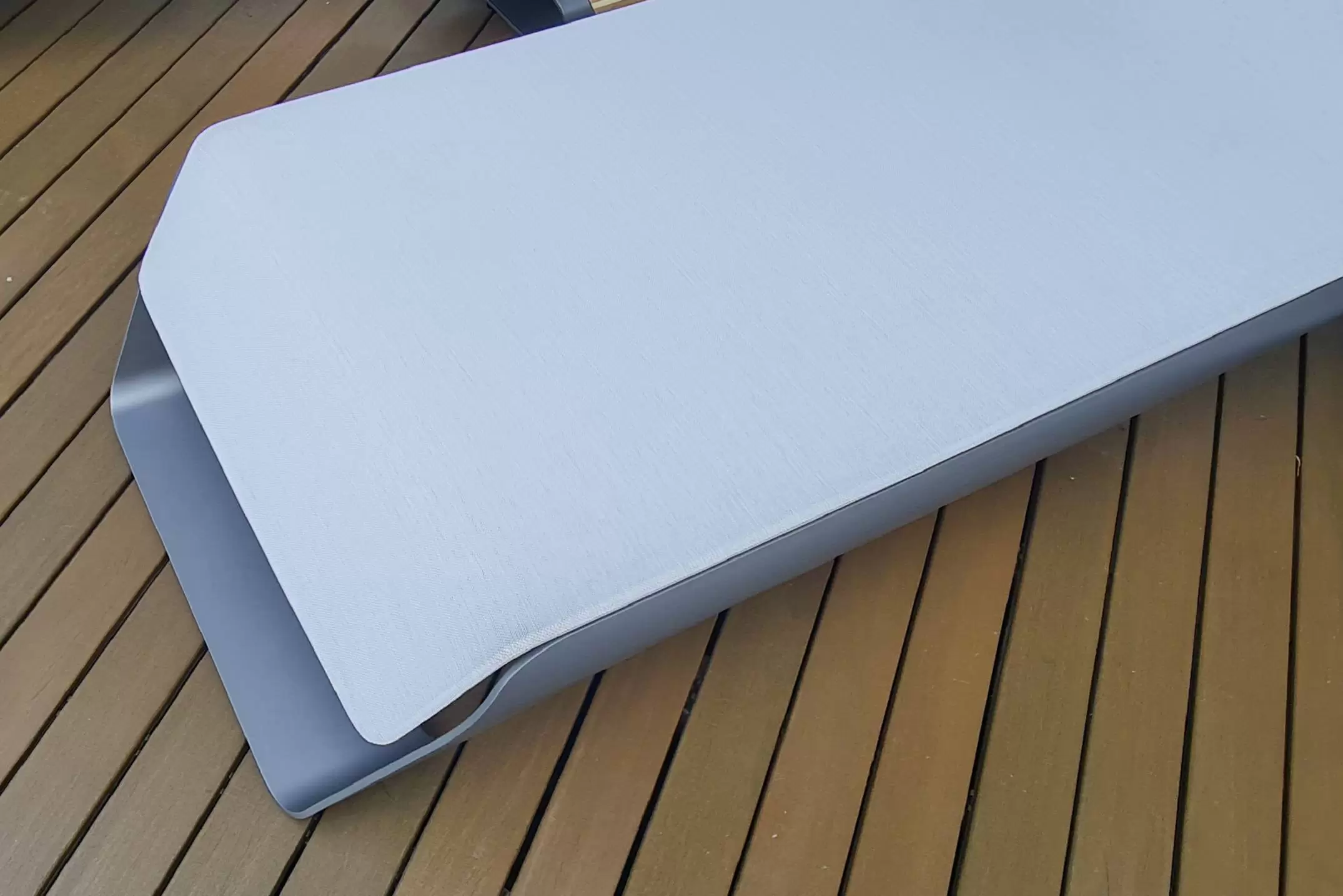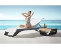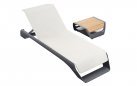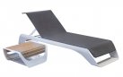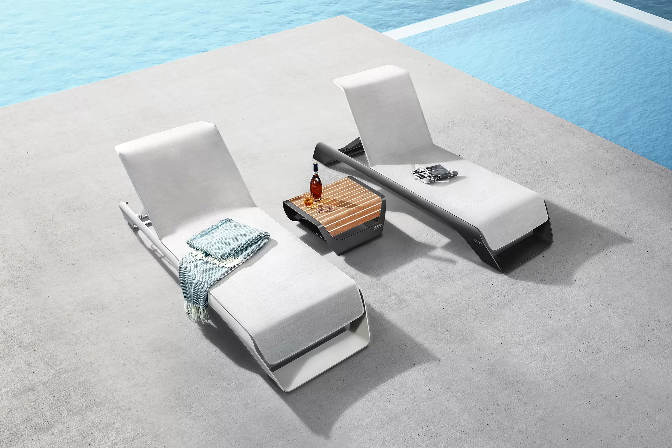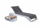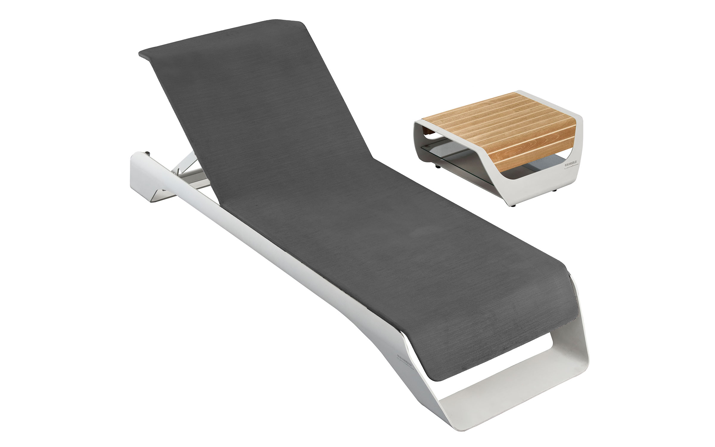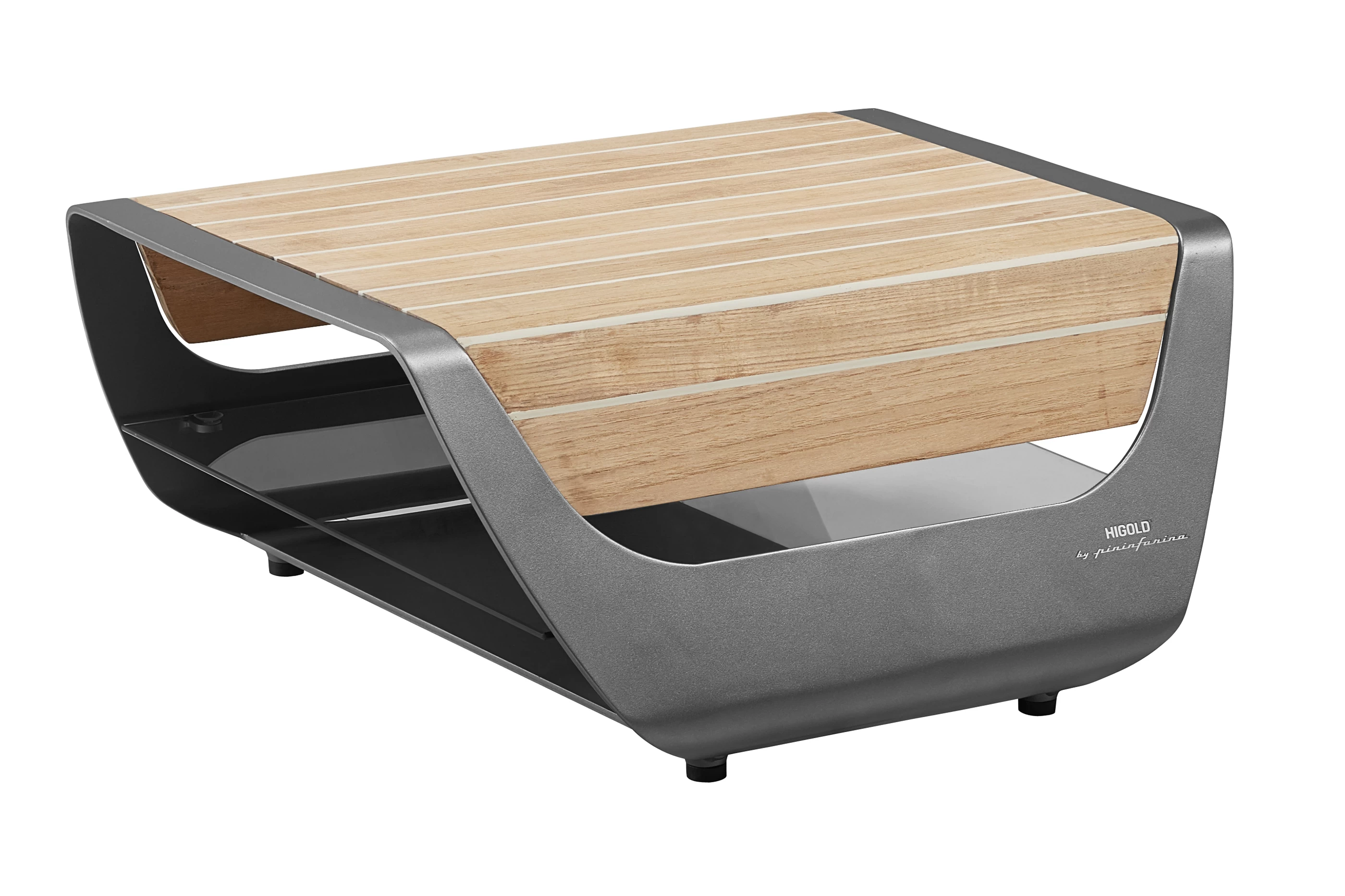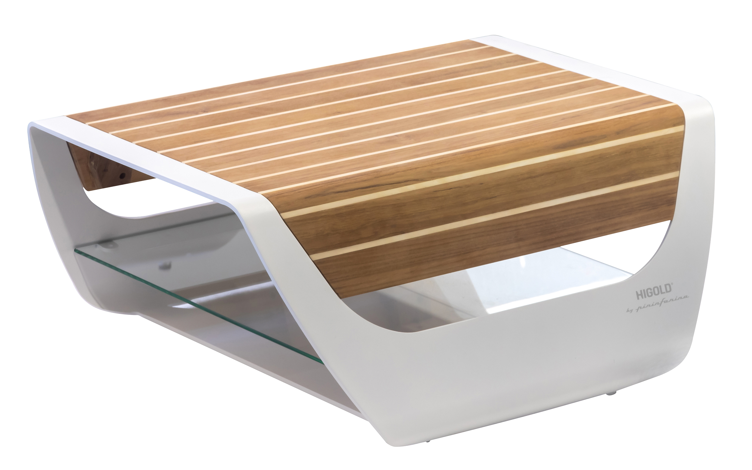 Nowoczesny futurystyczny leżak ogrodowy z kółkami oraz stolik boczny firmy HIGOLD zaprojektowany przez znane studio projektowe Pininfarina. Konstrukcja opiera się na profilowanej konstrukcji aluminiowej o gr. 6 mm malowanej proszkowo, elementach dekoracyjnych z teaku i wygodnych wodoodpornych poduszek z obiciami z miłego w dotyku wodoodpornego materiału Sunbrella. Blat stolika z deseczek teakowych. Pod blatem stolika półka ze szkła hartowanego.