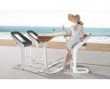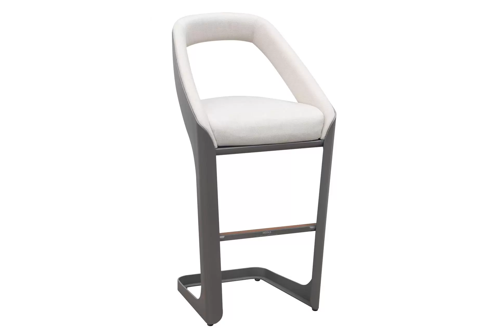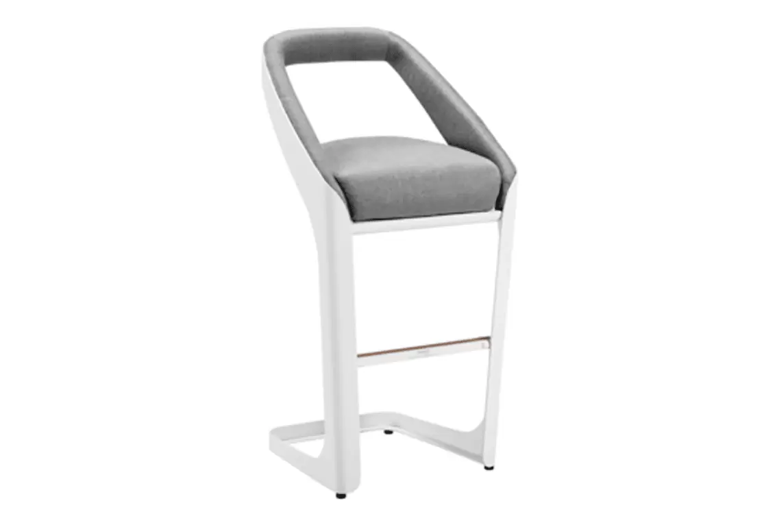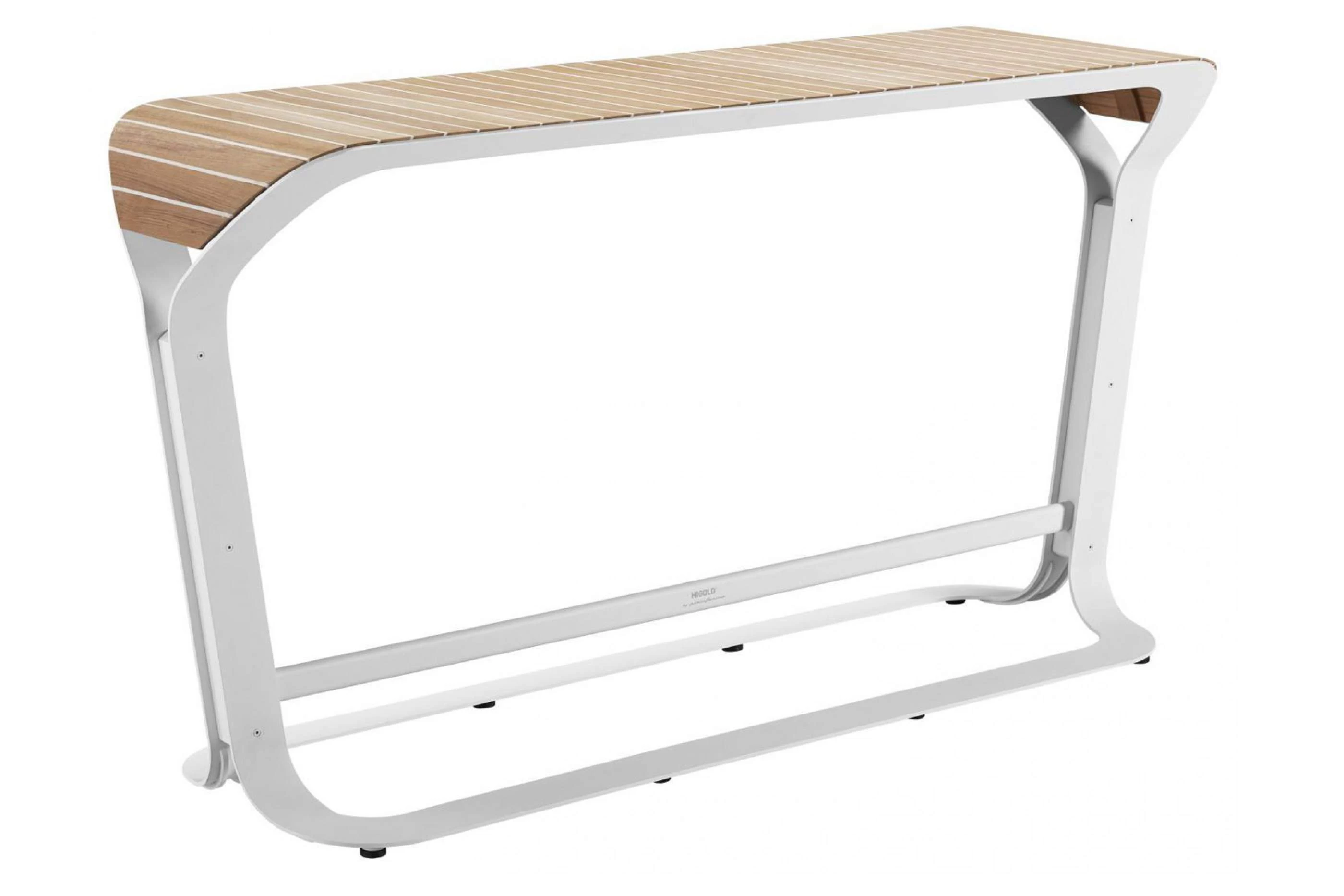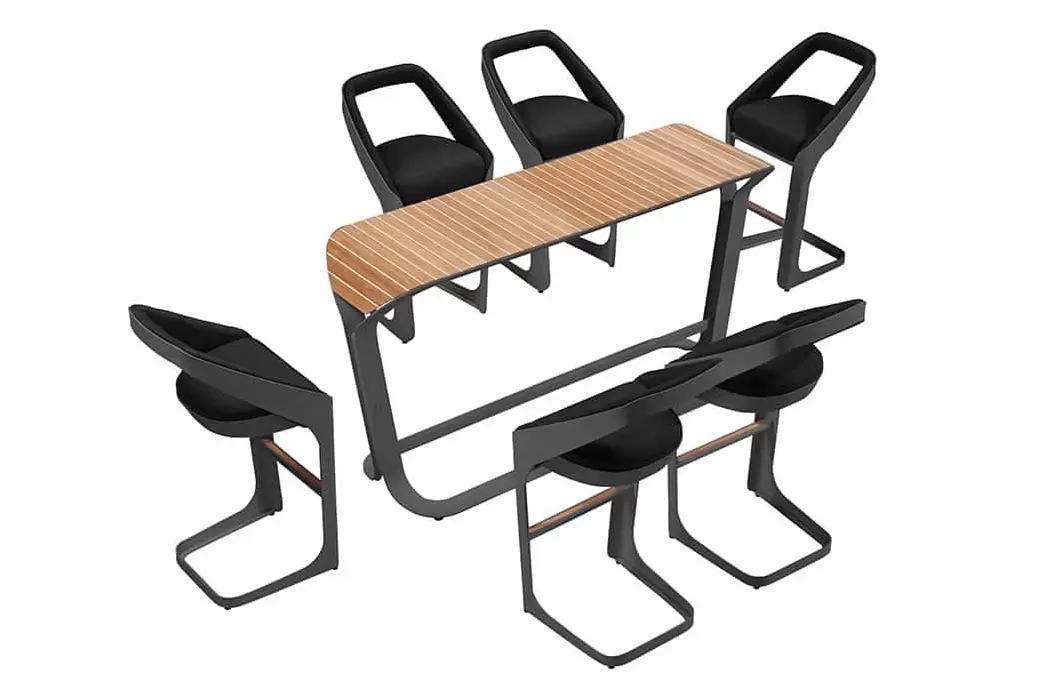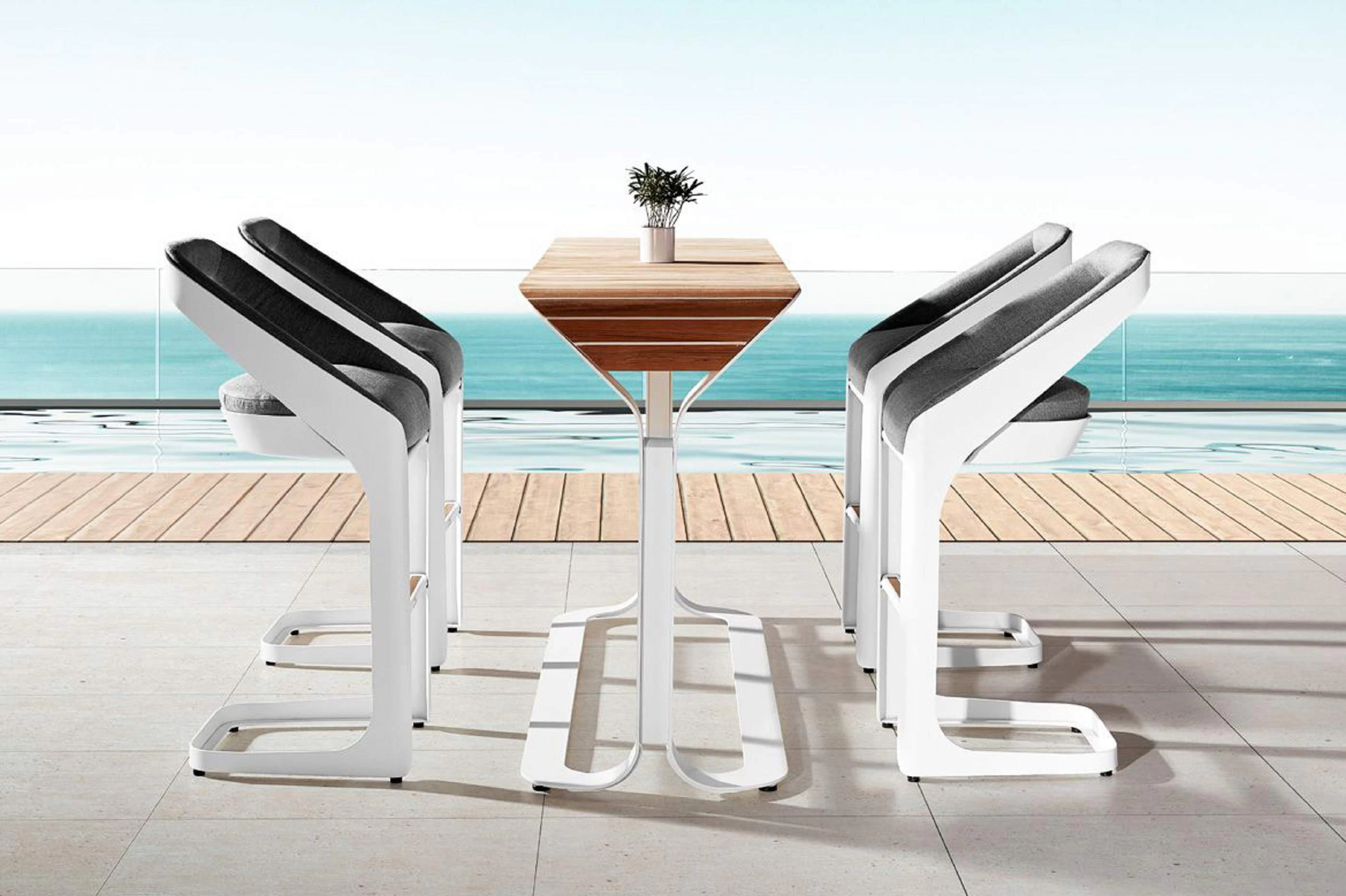 Ekskluzywny zestaw barowy aluminiowy na taras firmy HIGOLD zaprojektowany przez znane studio projektowe Pininfarina. Konstrukcja opiera się na profilowanej konstrukcji aluminiowej malowanej proszkowo, blacie stołu z teaku i wygodnych wodoodpornych poduszek z obiciami z miłego w dotyku wodoodpornego materiału Sunbrella. Stołek z wygodnymi poduszkami z materiału Sunbrella.