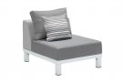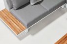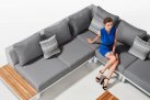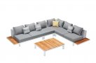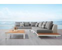Aluminiowy modułowy narożnik ogrodowy na taras firmy HIGOLD w nowoczesnym stylu. Konstrukcja opiera się na spawanej ramie aluminiowej malowanej proszkowo, elementach dekoracyjnych z teaku i wygodnych poduszek z obiciami z materiału Olefin. Oparcie także obite materiałęm Olefin w jaśniejszym odcieniu niż poduszki. Poduszki położone na opinającej siedzisko tekstylinie.
