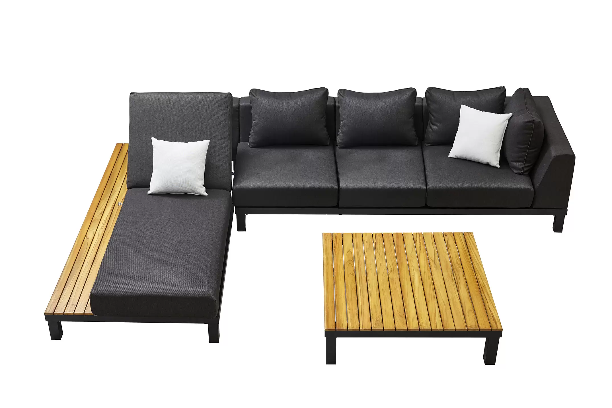 W skład zestawu wchodzi leżanka z boczną półką, sofa środkowa oraz narożna część prawego narożnika, a także stolik kawowy z blatem z drewna teak.