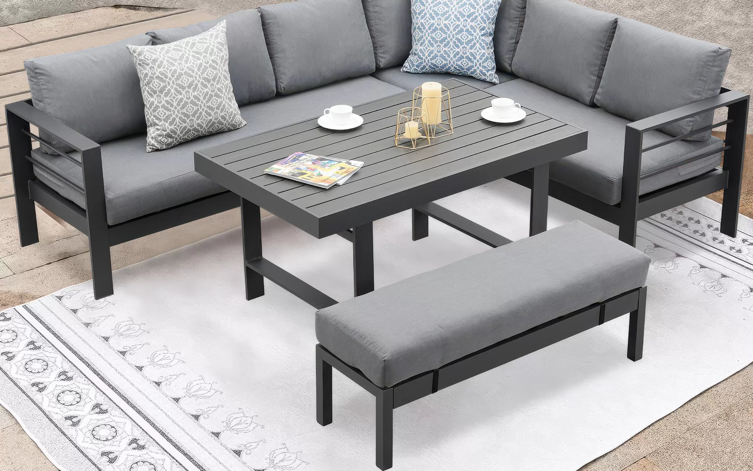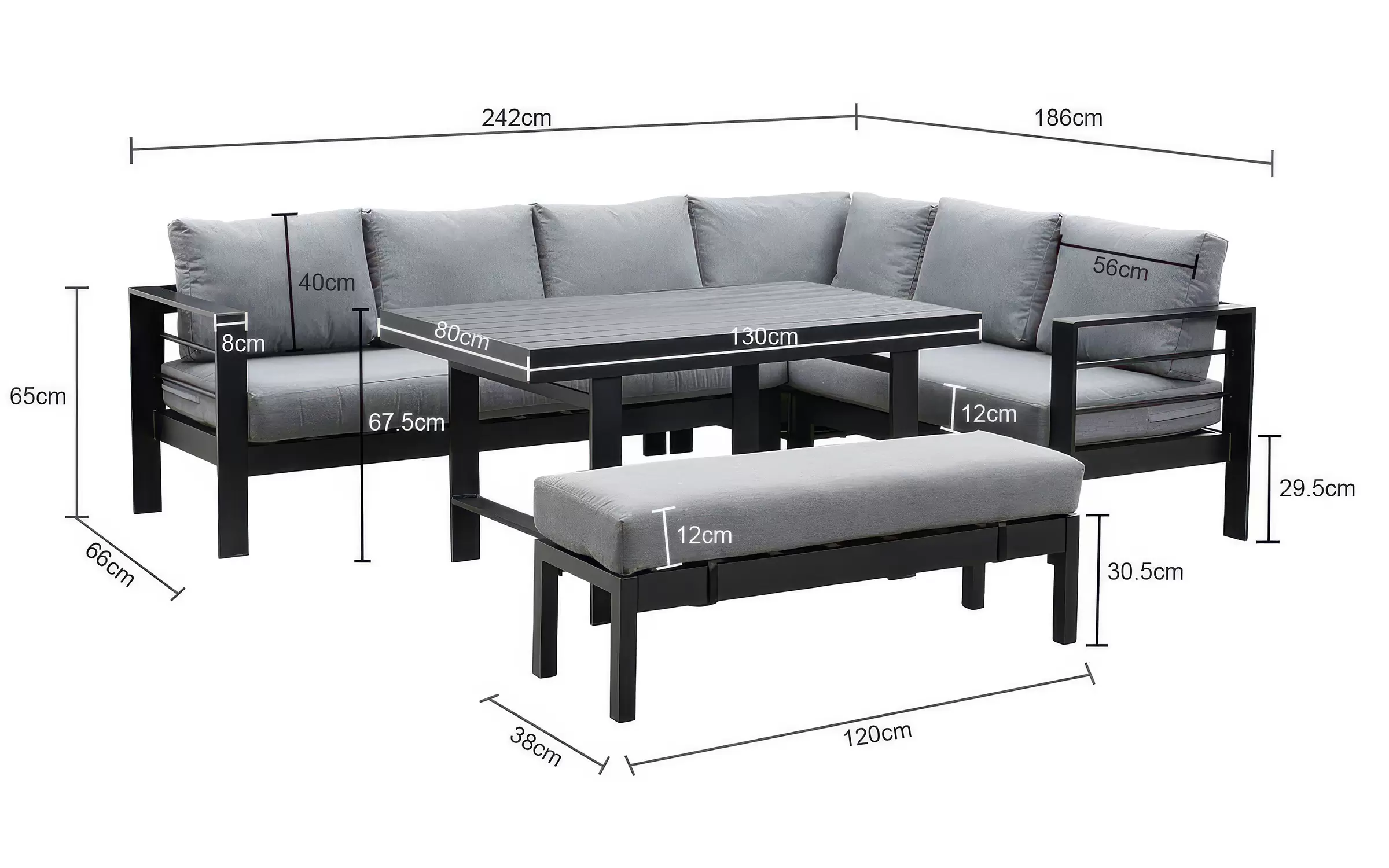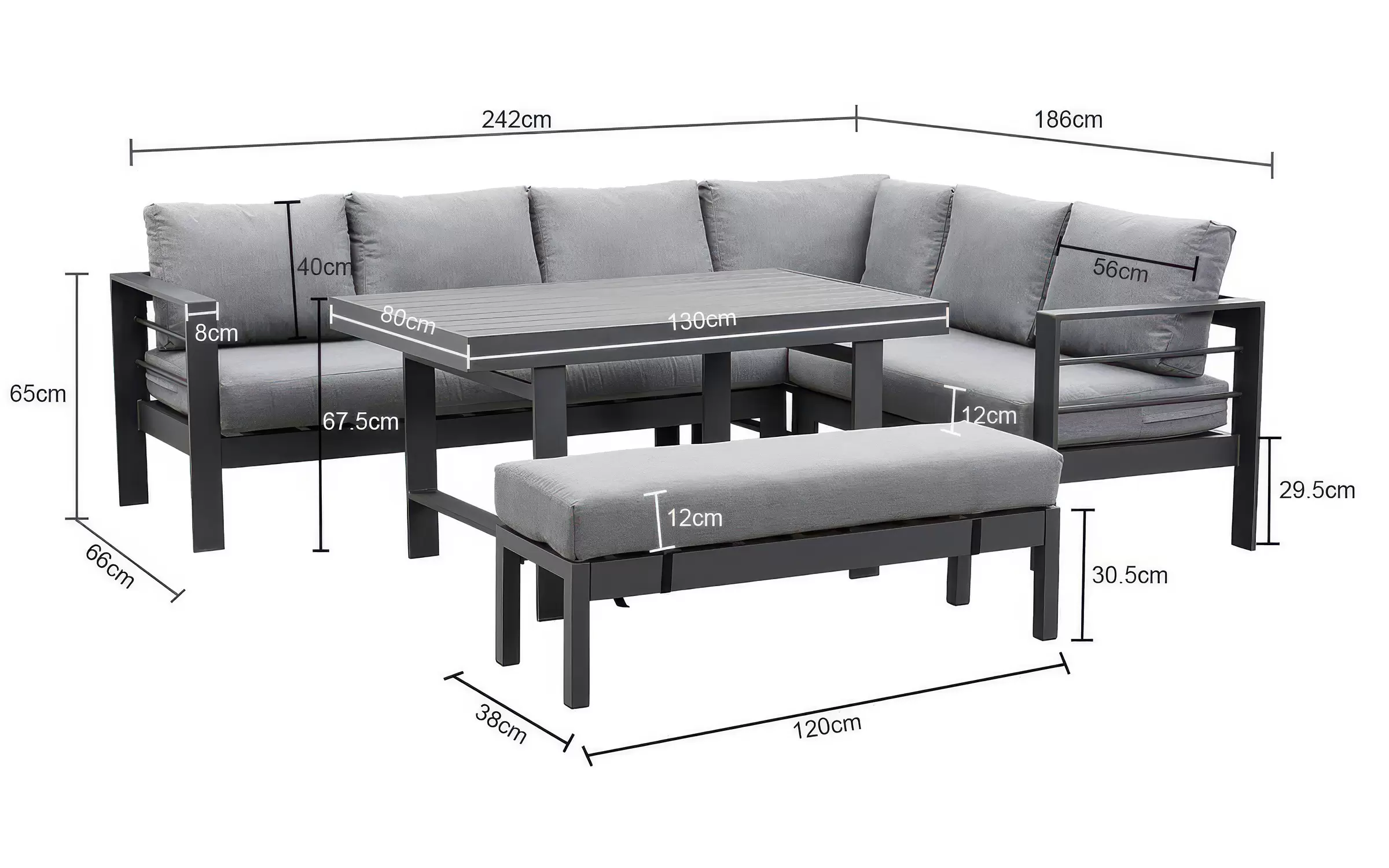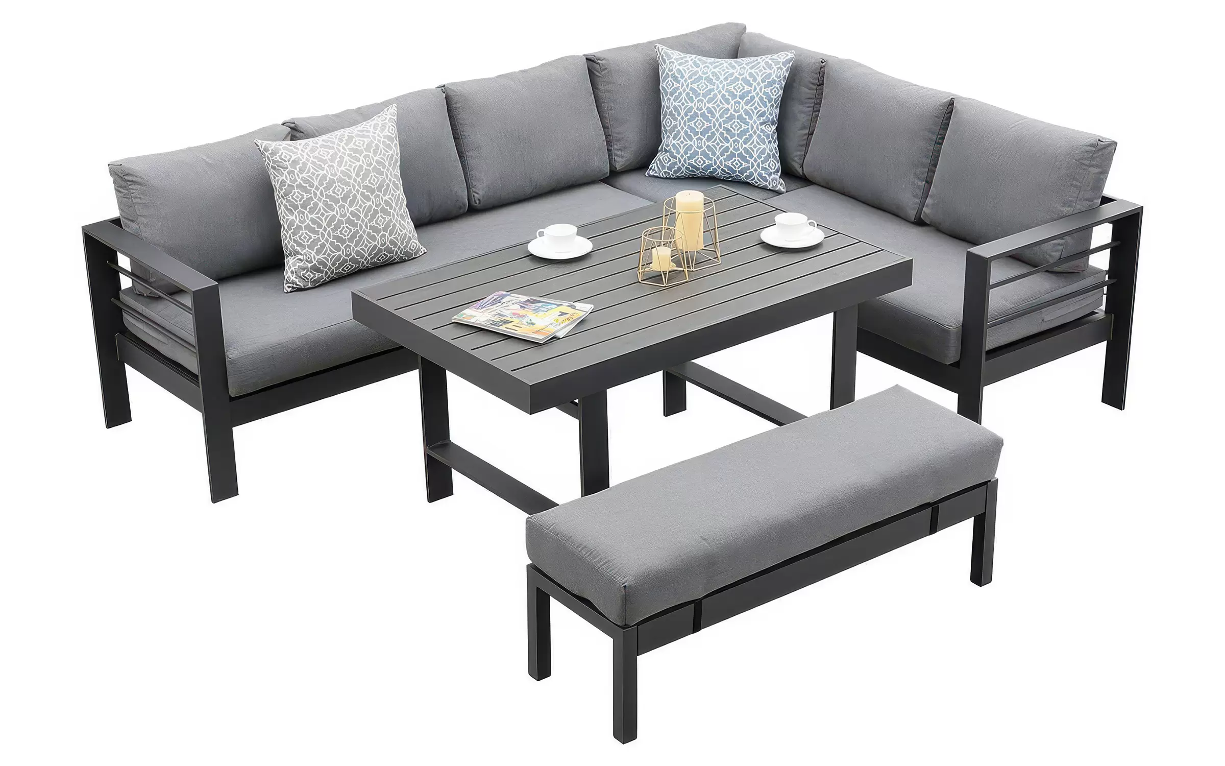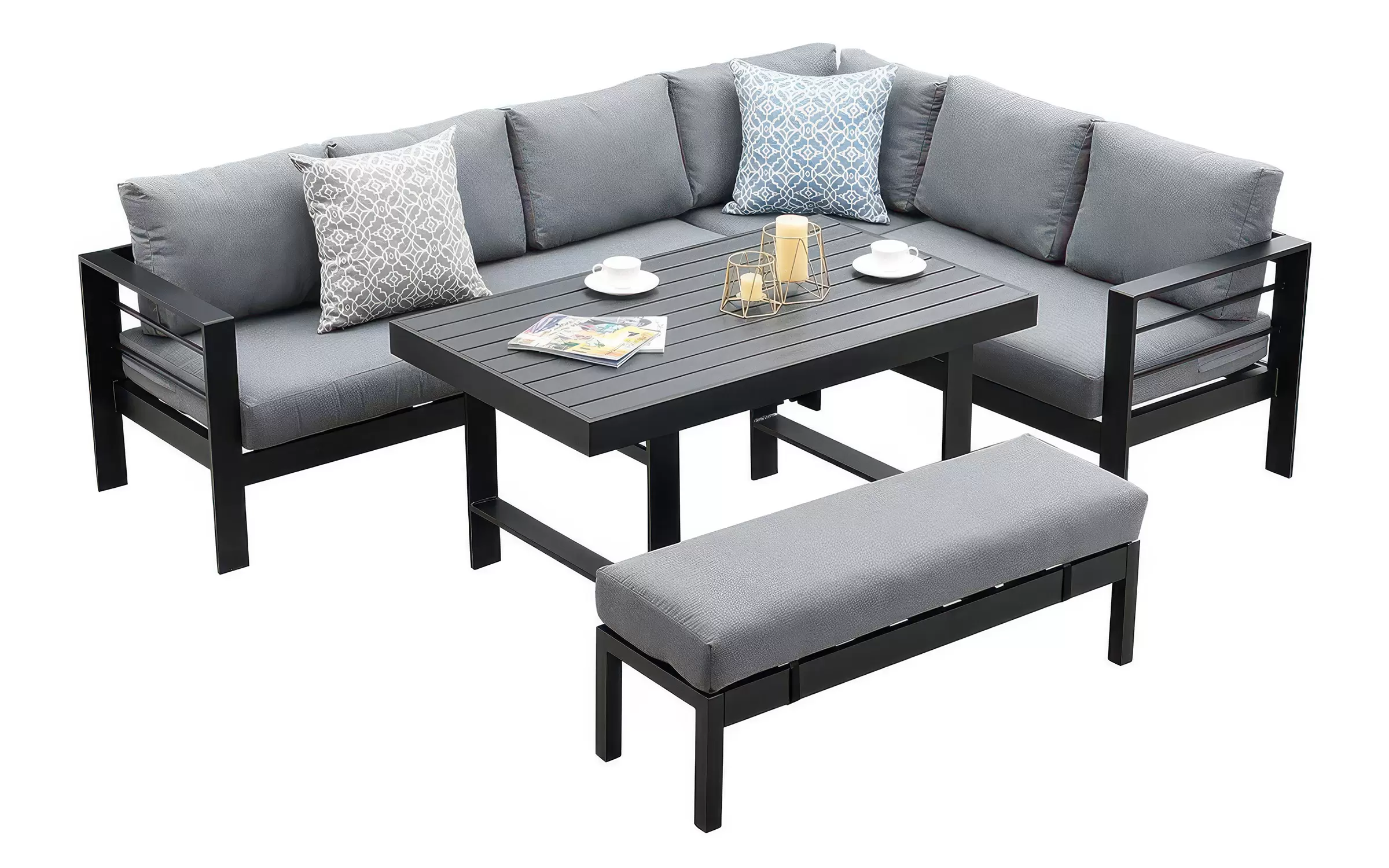 Narożnik na taras z bokami z materiału tetoron z wkładami gumowymi. Grube, wygodne poduszki ze zdejmowanymi poszewkami. Stolik z blatem aluminiowym cienoszarym.