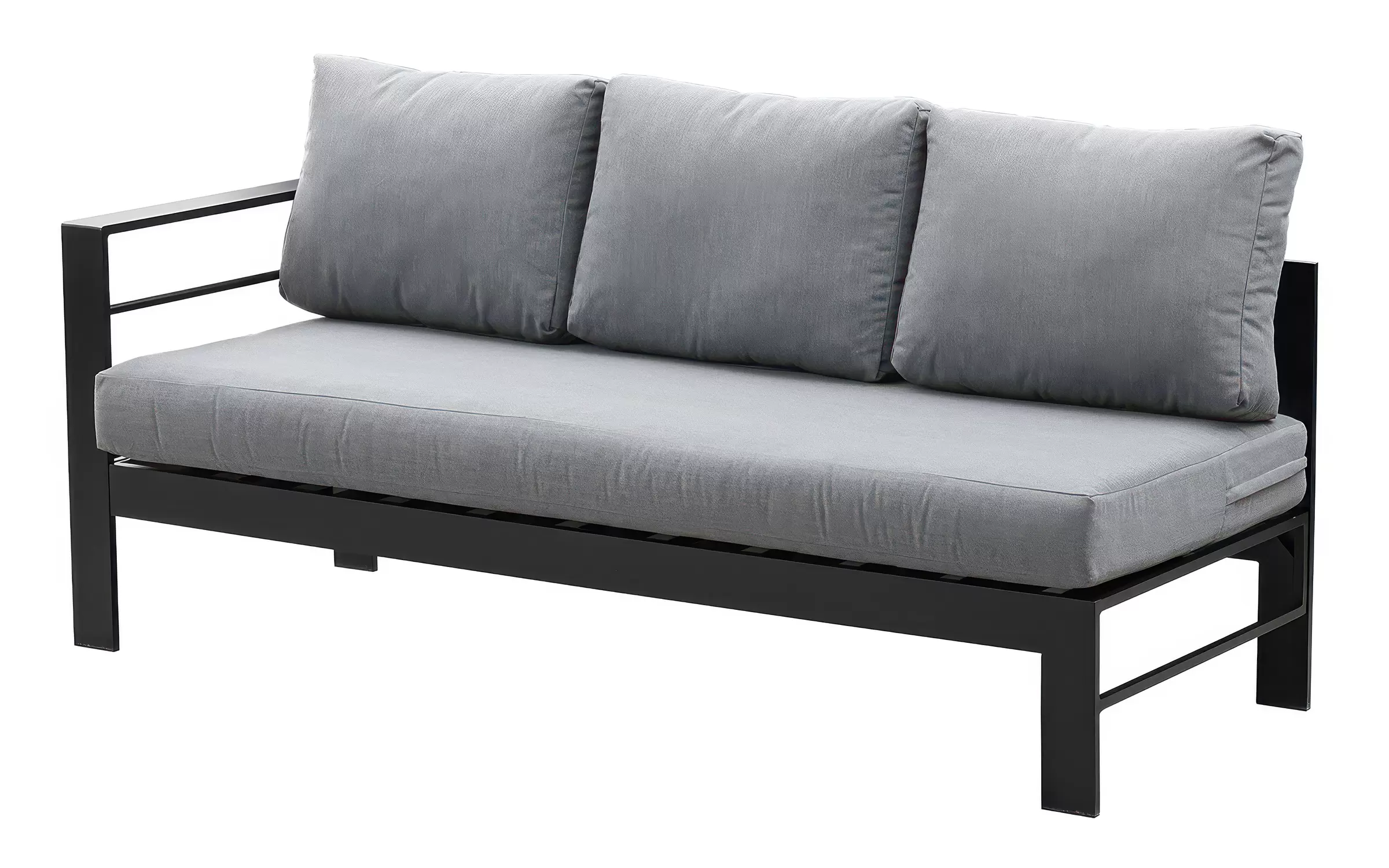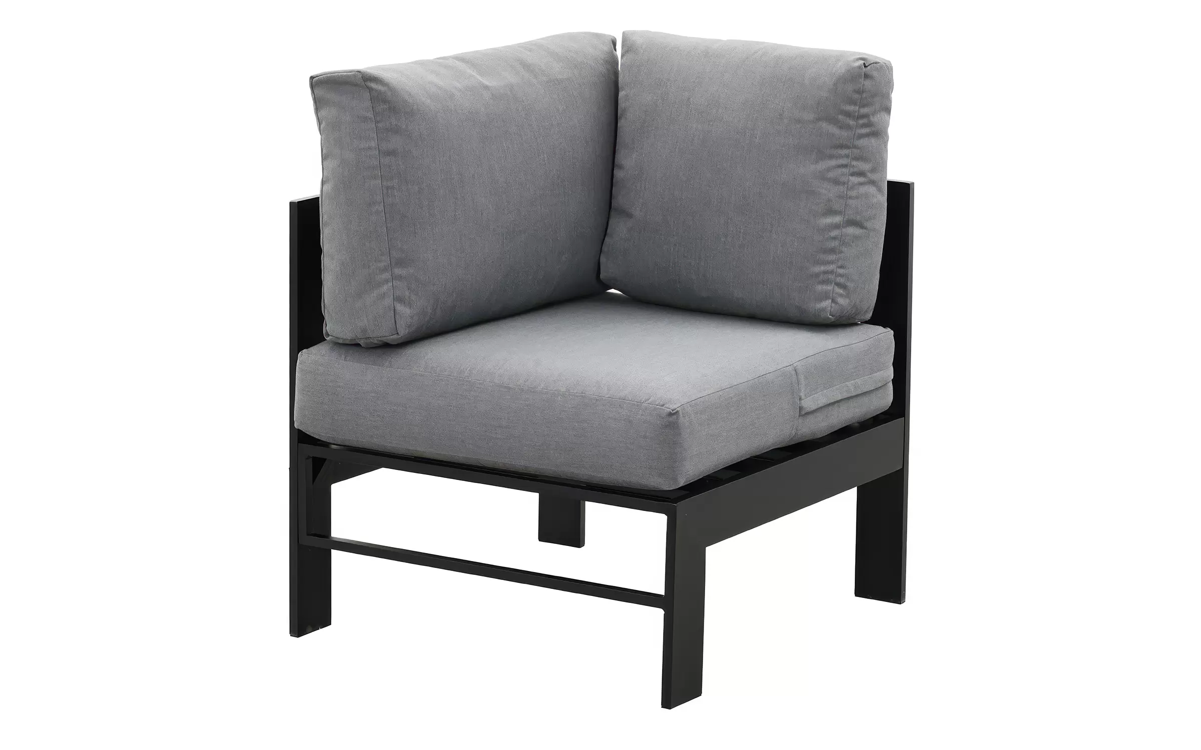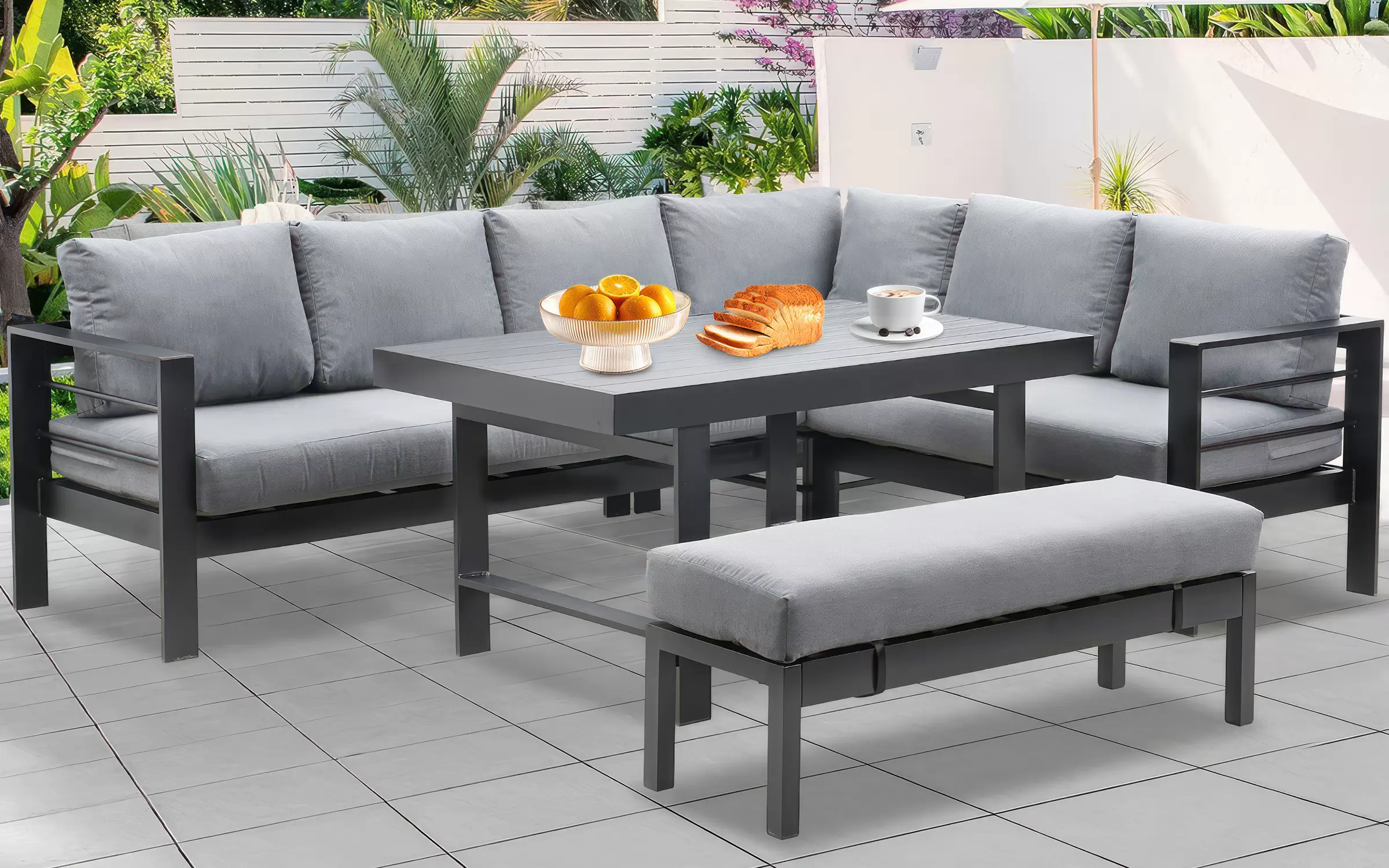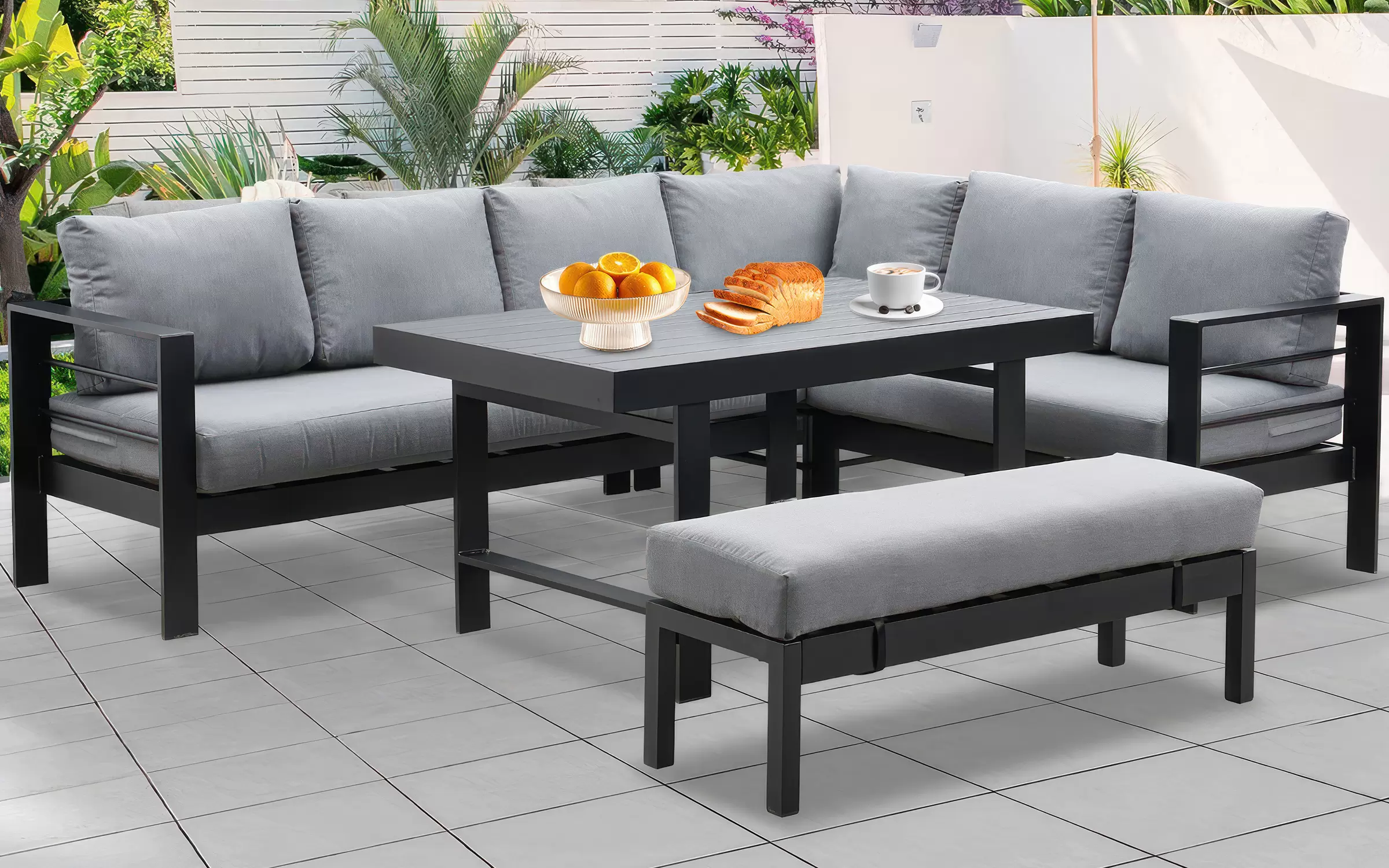 Narożnik na taras z bokami z materiału tetoron z wkładami gumowymi. Grube, wygodne poduszki ze zdejmowanymi poszewkami. Stolik z blatem aluminiowym cienoszarym.