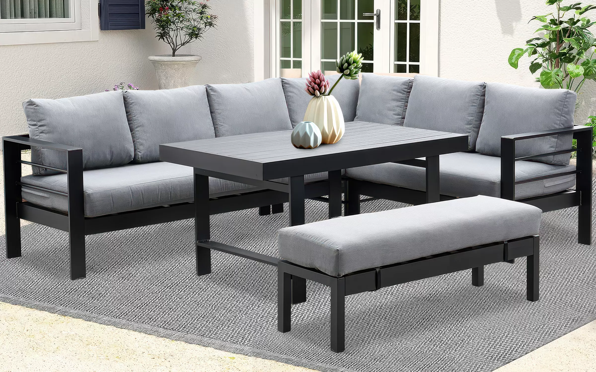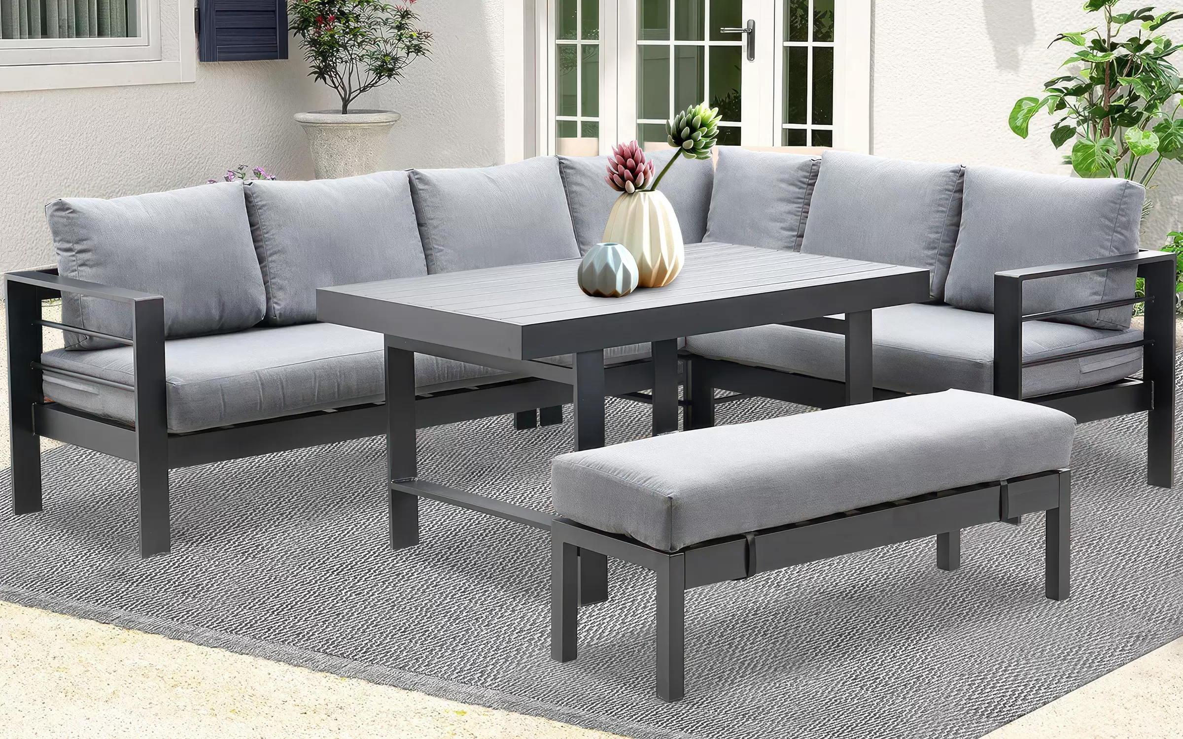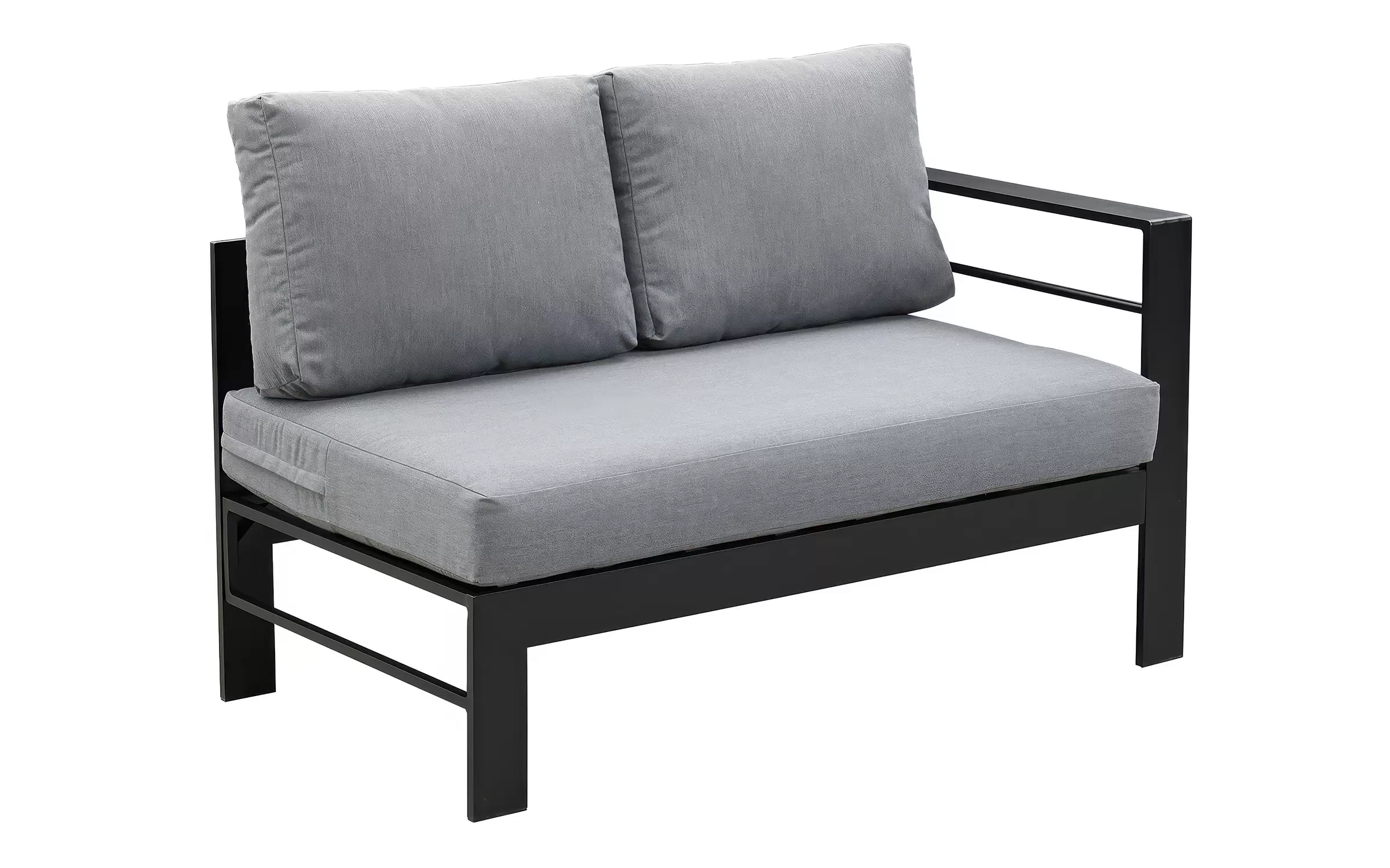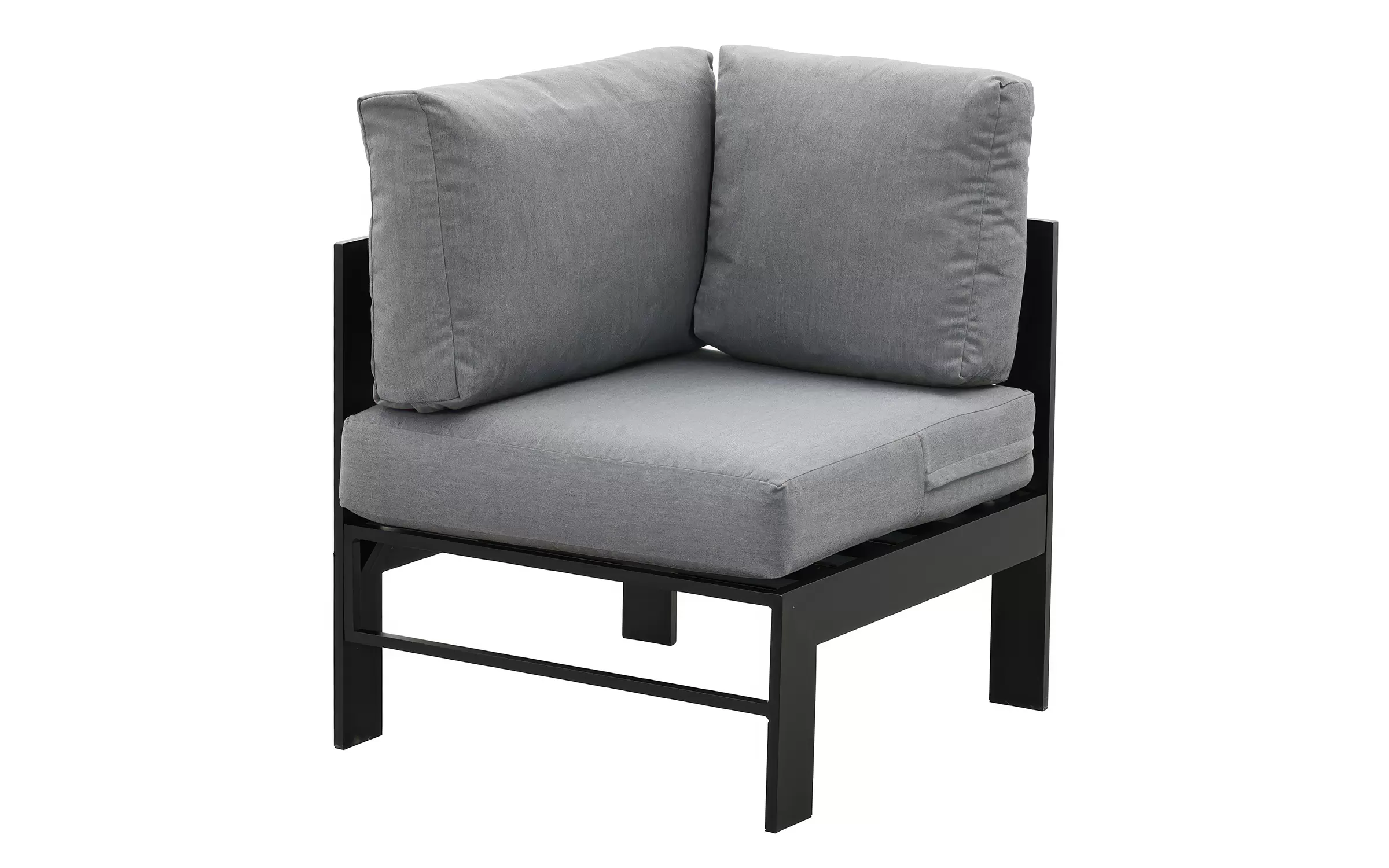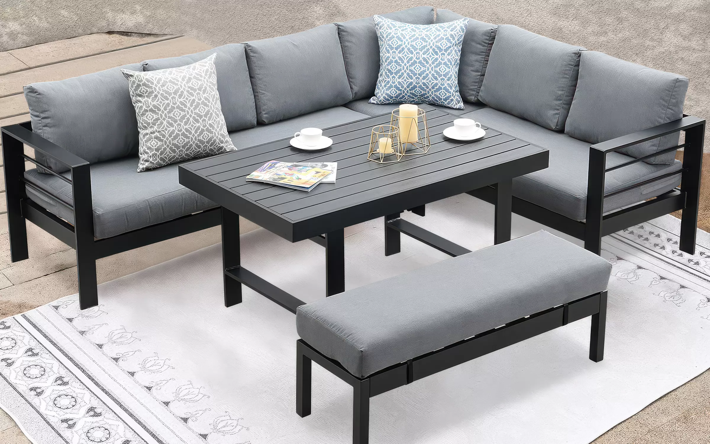 Narożnik na taras z bokami z materiału tetoron z wkładami gumowymi. Grube, wygodne poduszki ze zdejmowanymi poszewkami. Stolik z blatem aluminiowym cienoszarym.