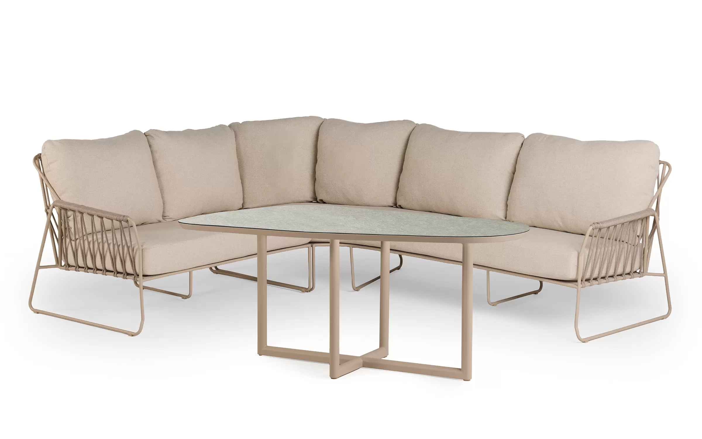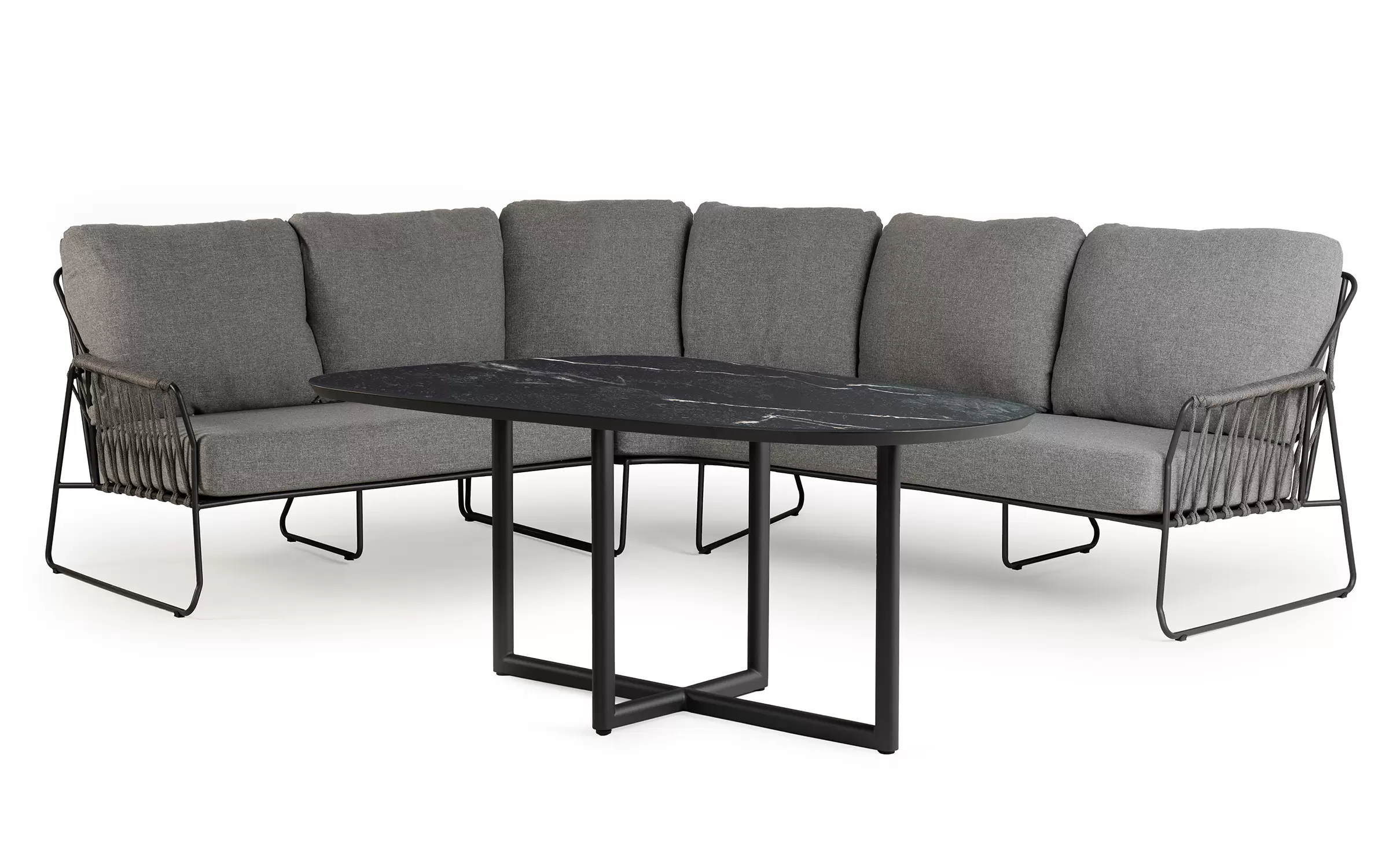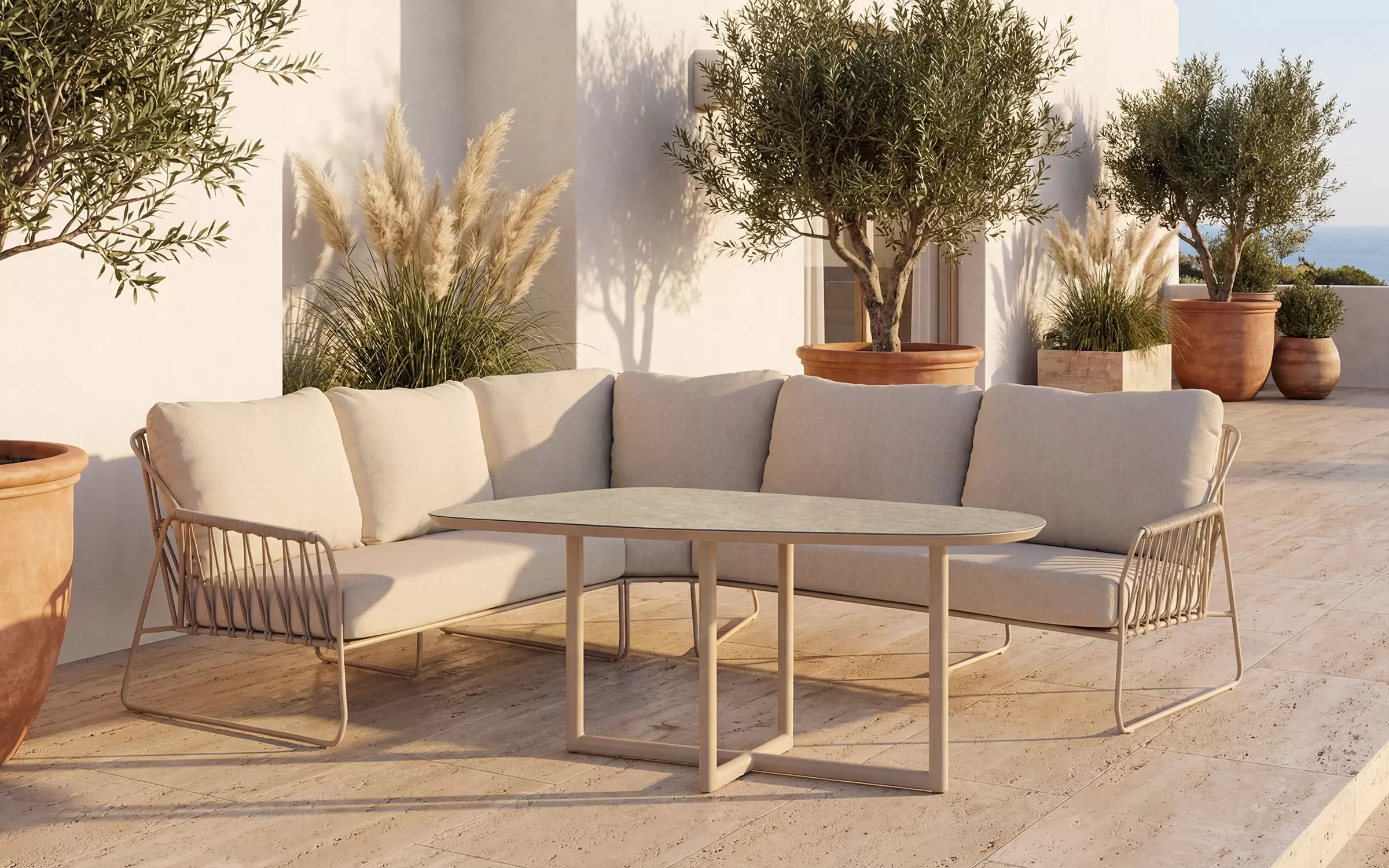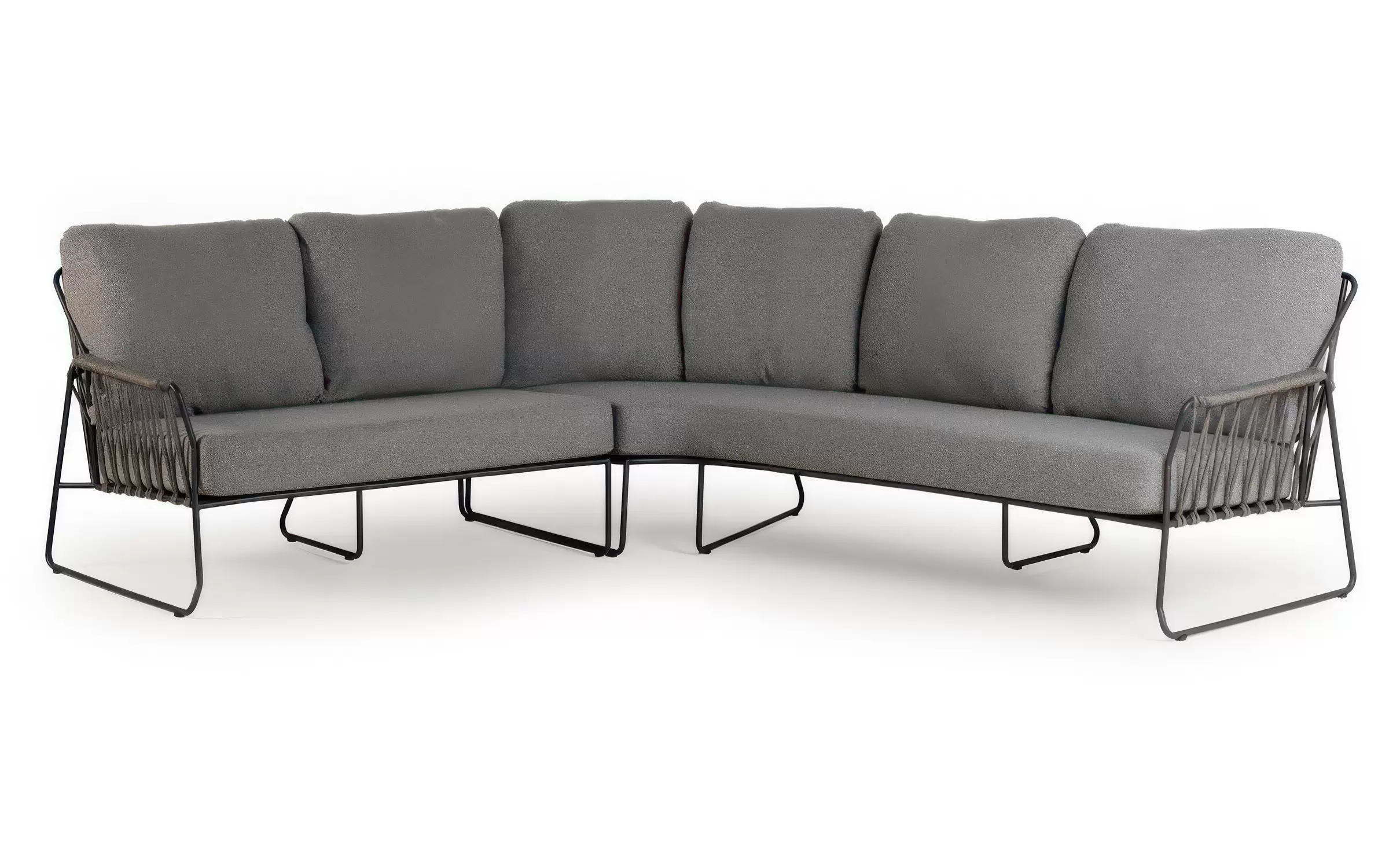 RIVERAto nowoczesny narożnik ogrodowy, który łączy minimalistyczną elegancję z funkcjonalnością zestawu jadalnianego. Jego charakterystyczna, lekko zaokrąglona linia oraz masywne, komfortowe poduszki tworzą harmonijną przestrzeń do wypoczynku i wspólnych posiłków na świeżym powietrzu.