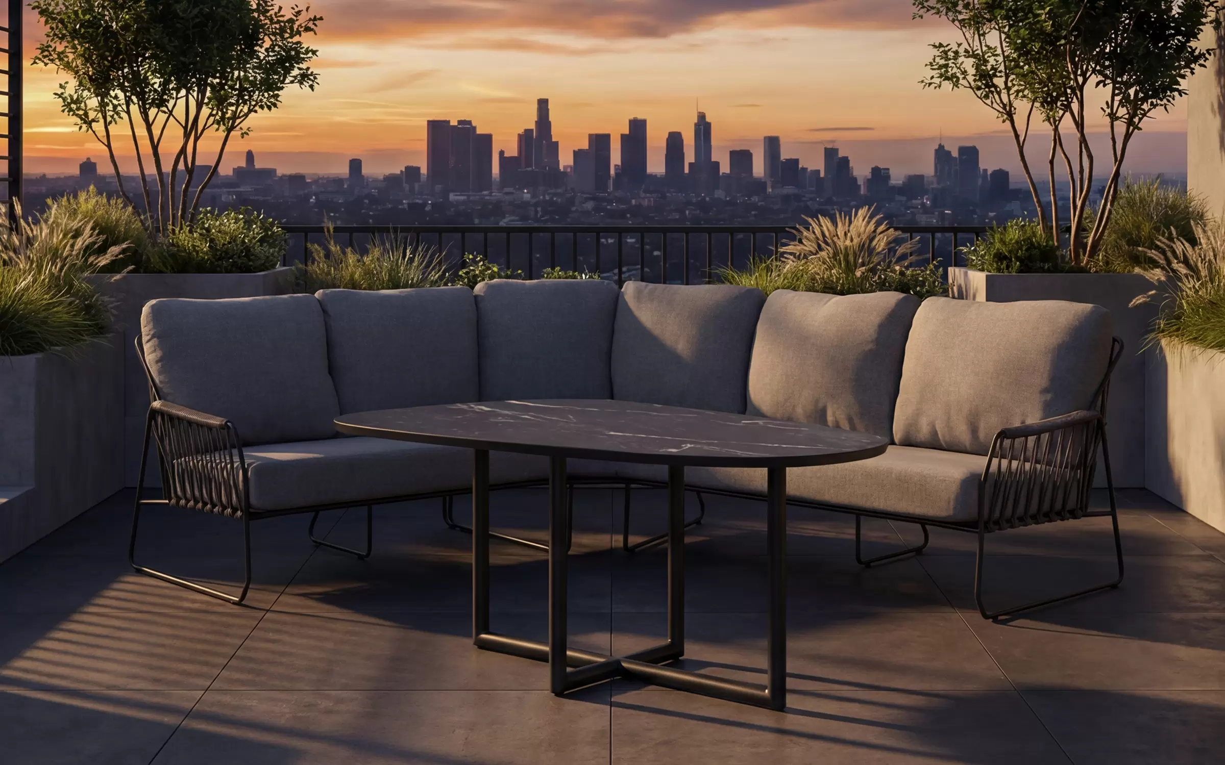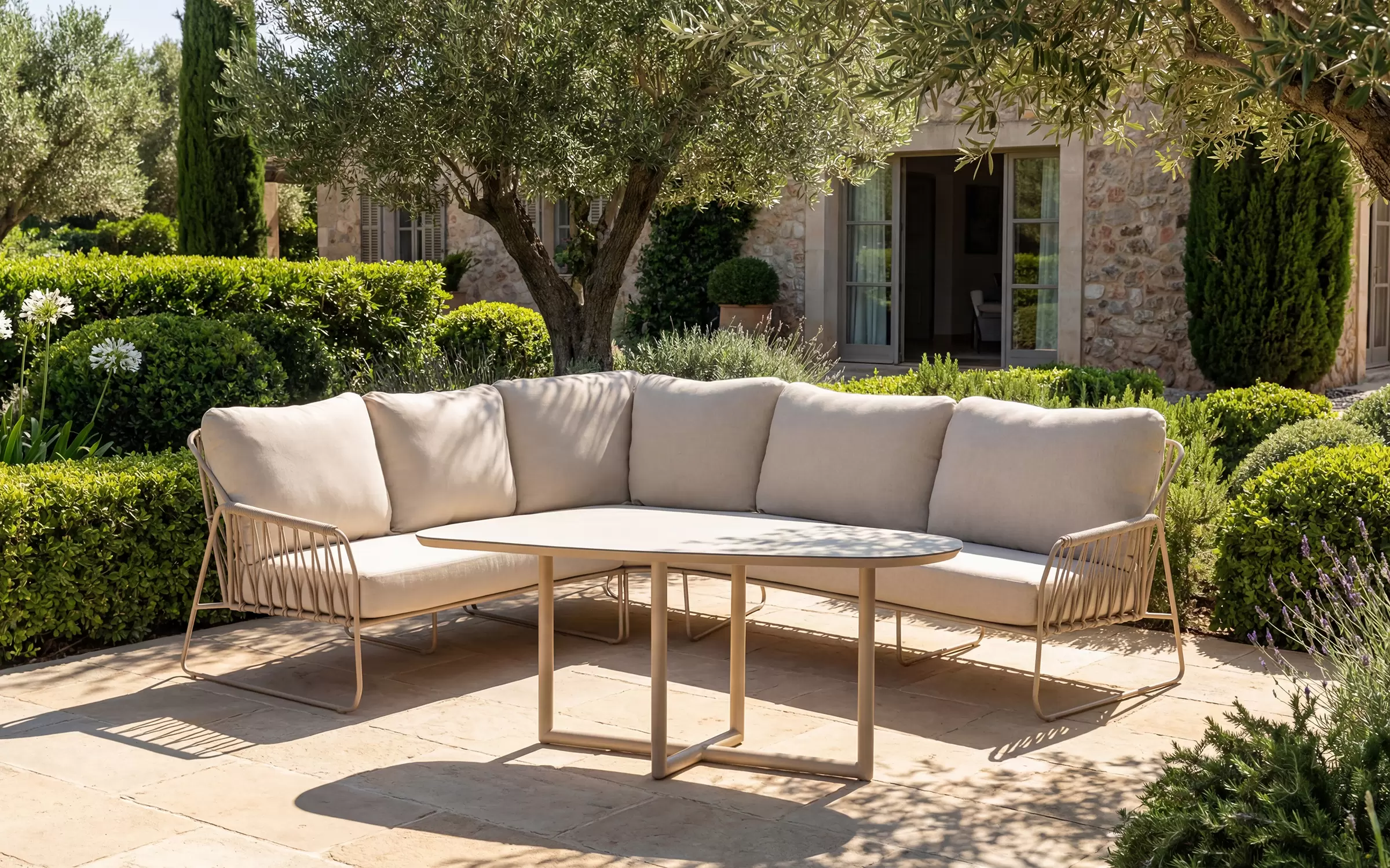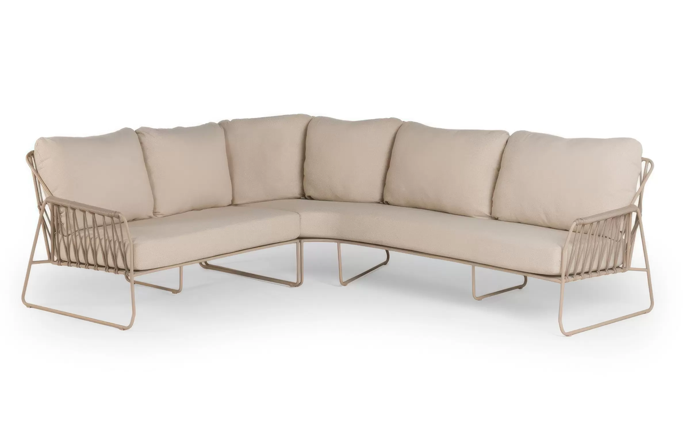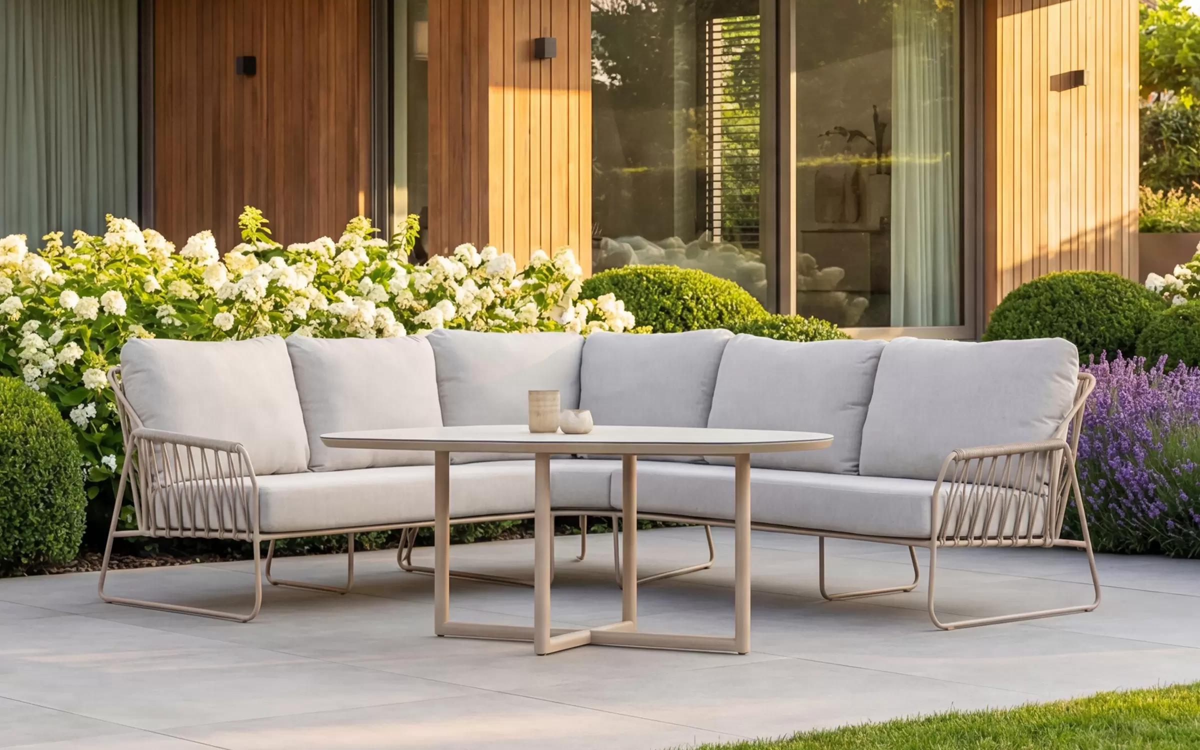 RIVERAto nowoczesny narożnik ogrodowy, który łączy minimalistyczną elegancję z funkcjonalnością zestawu jadalnianego. Jego charakterystyczna, lekko zaokrąglona linia oraz masywne, komfortowe poduszki tworzą harmonijną przestrzeń do wypoczynku i wspólnych posiłków na świeżym powietrzu.
