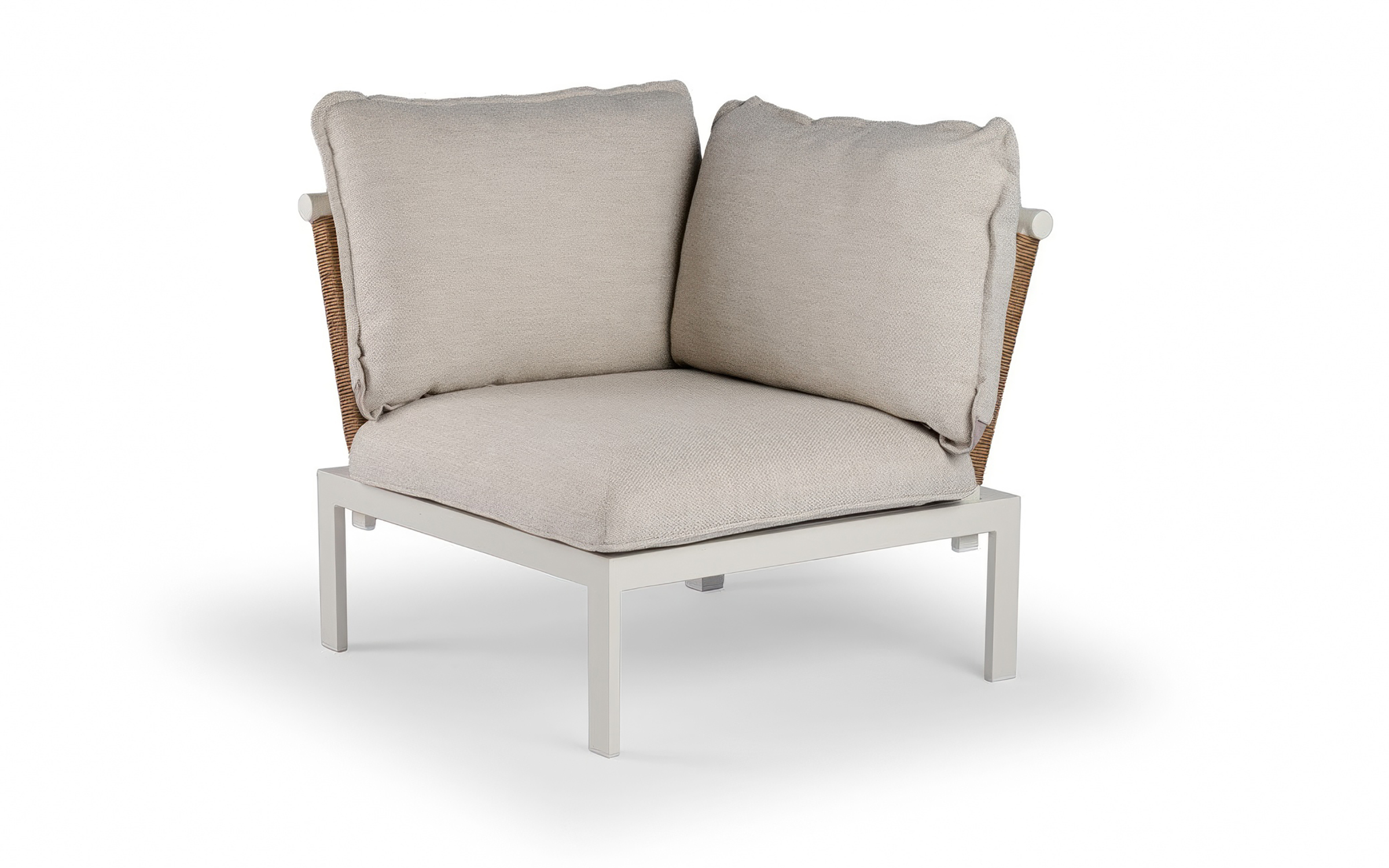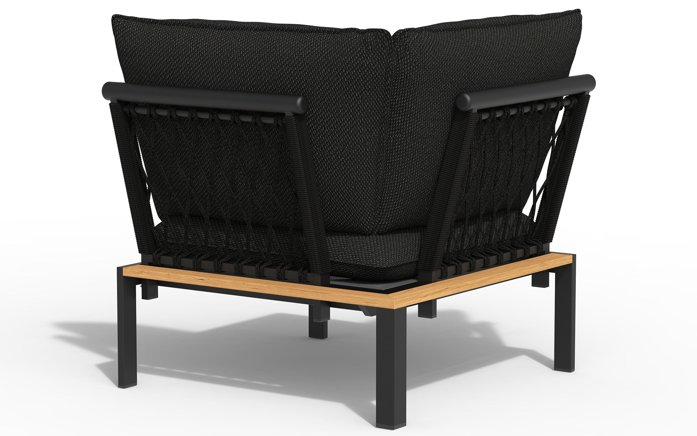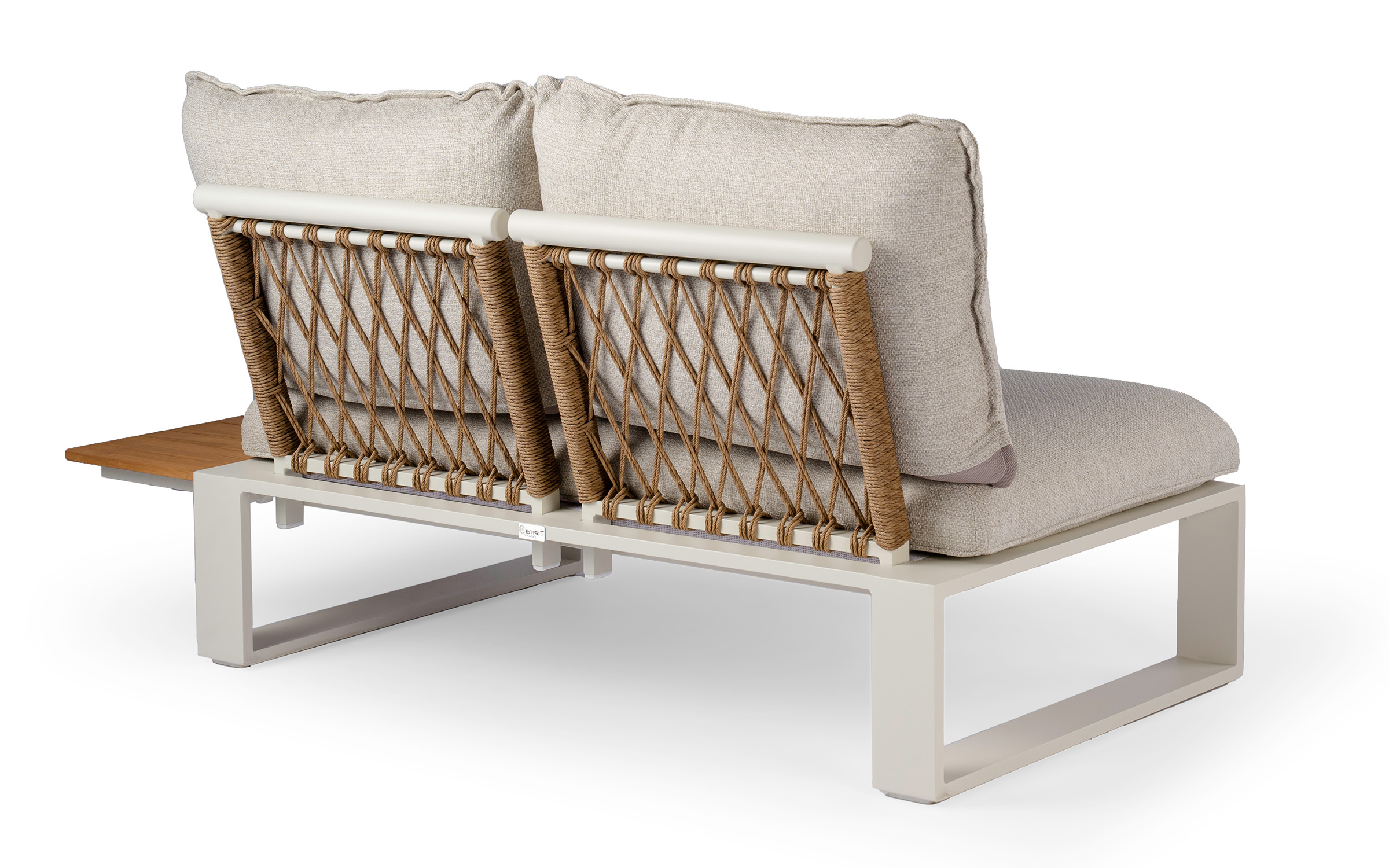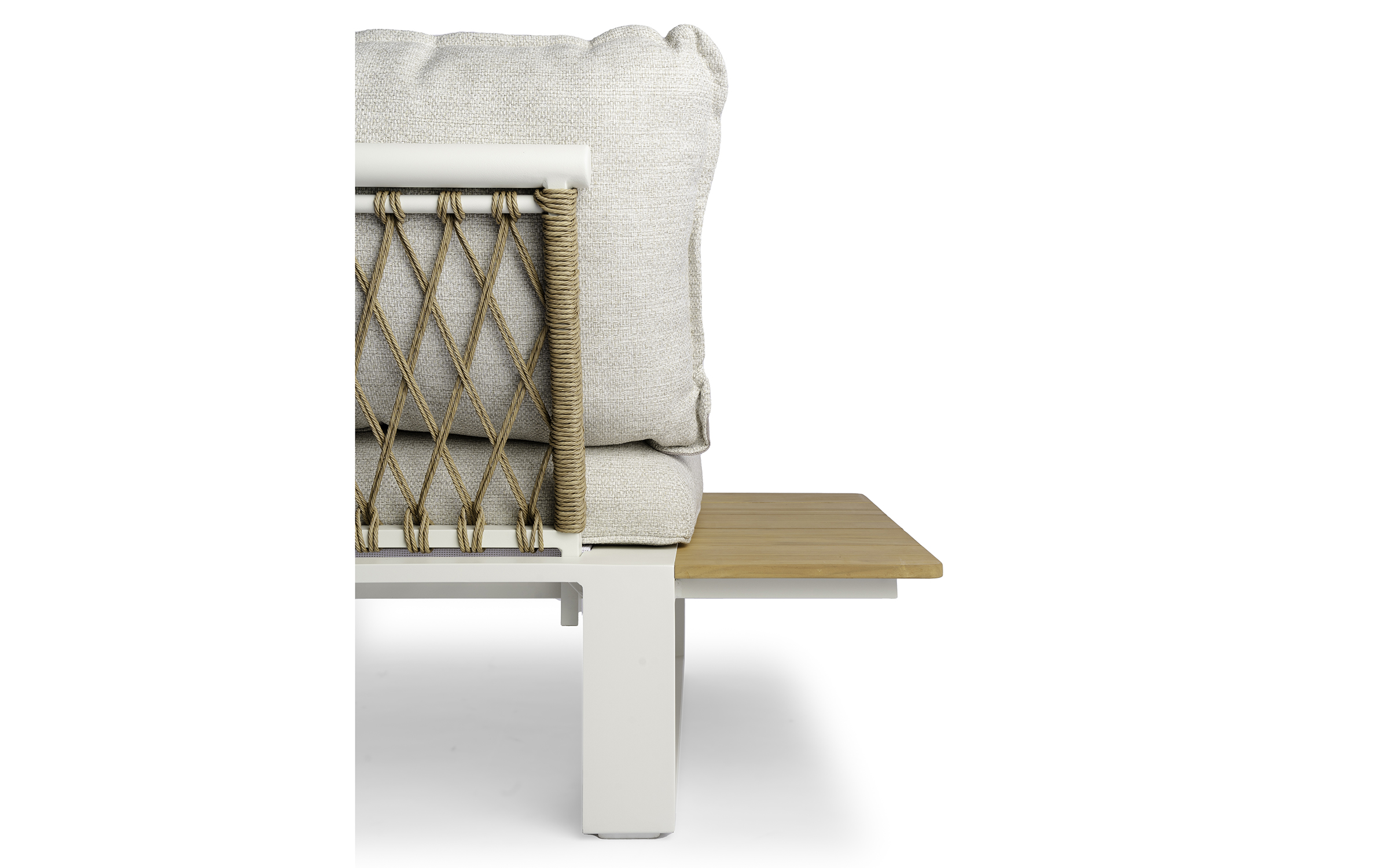 Solidny, pięknie wykończony narożnik wypoczynkowy ma wyrafinowaną mieszankę chłodnego aluminium, ciepłego drewna i modnej liny polipropylenowej.