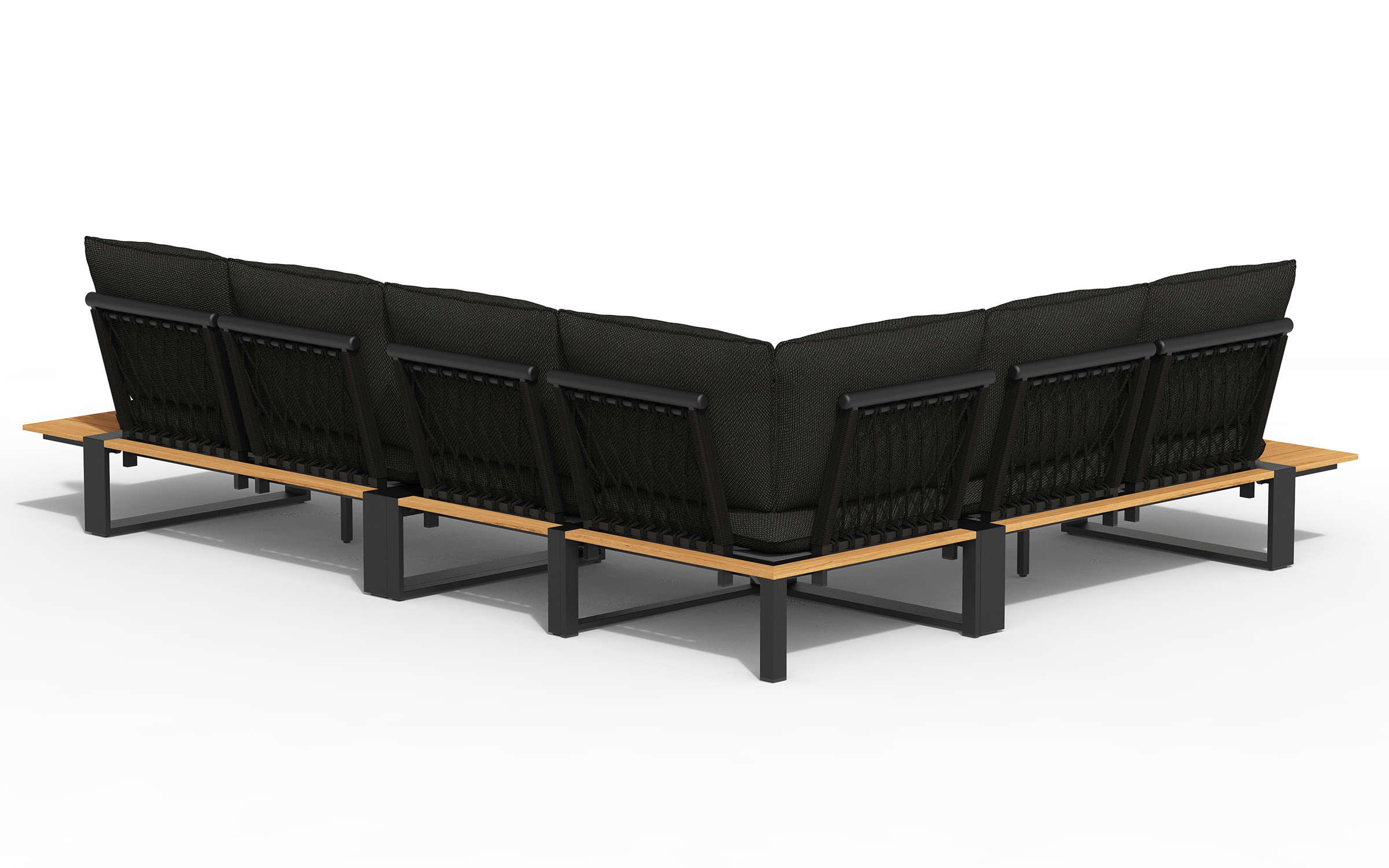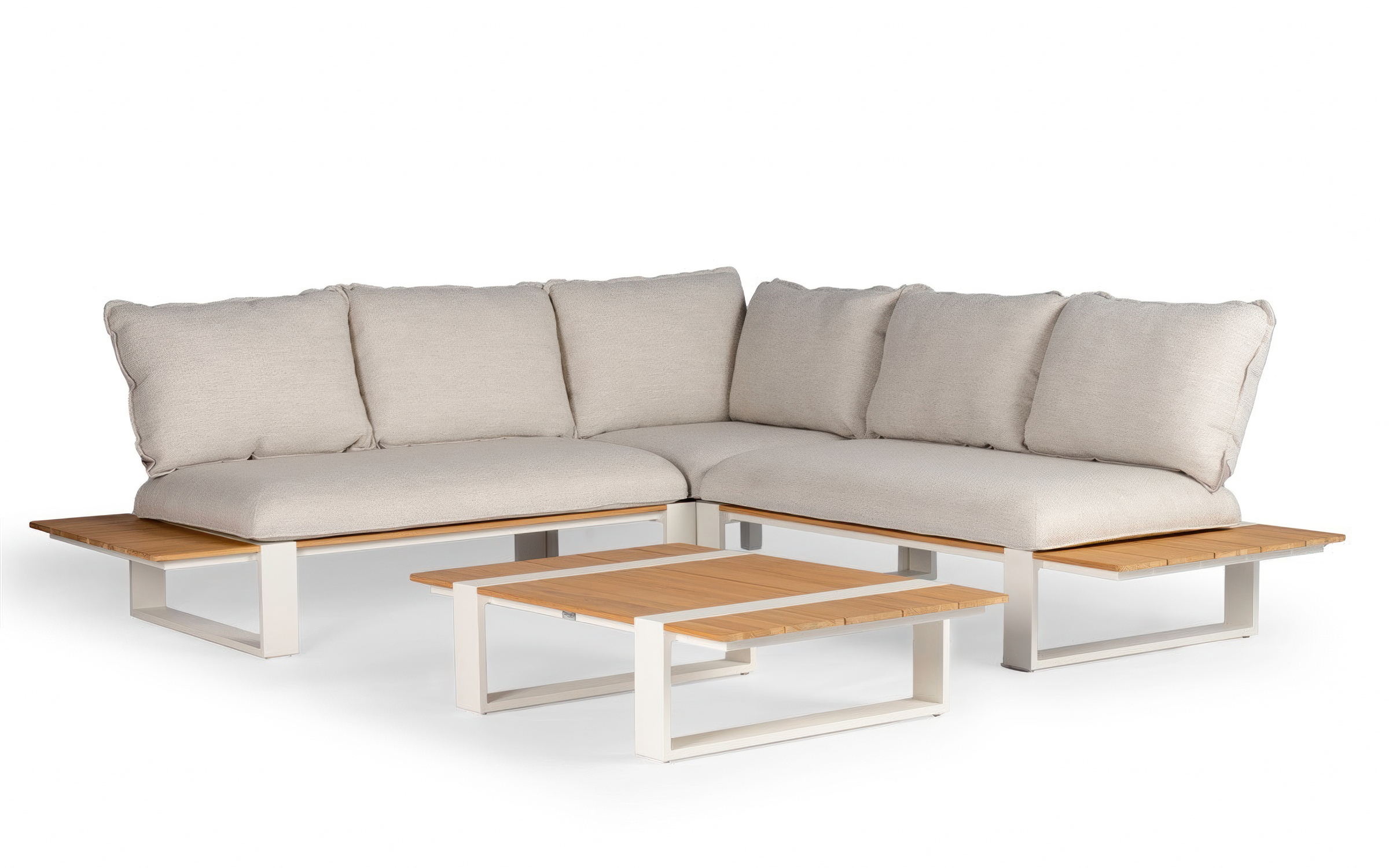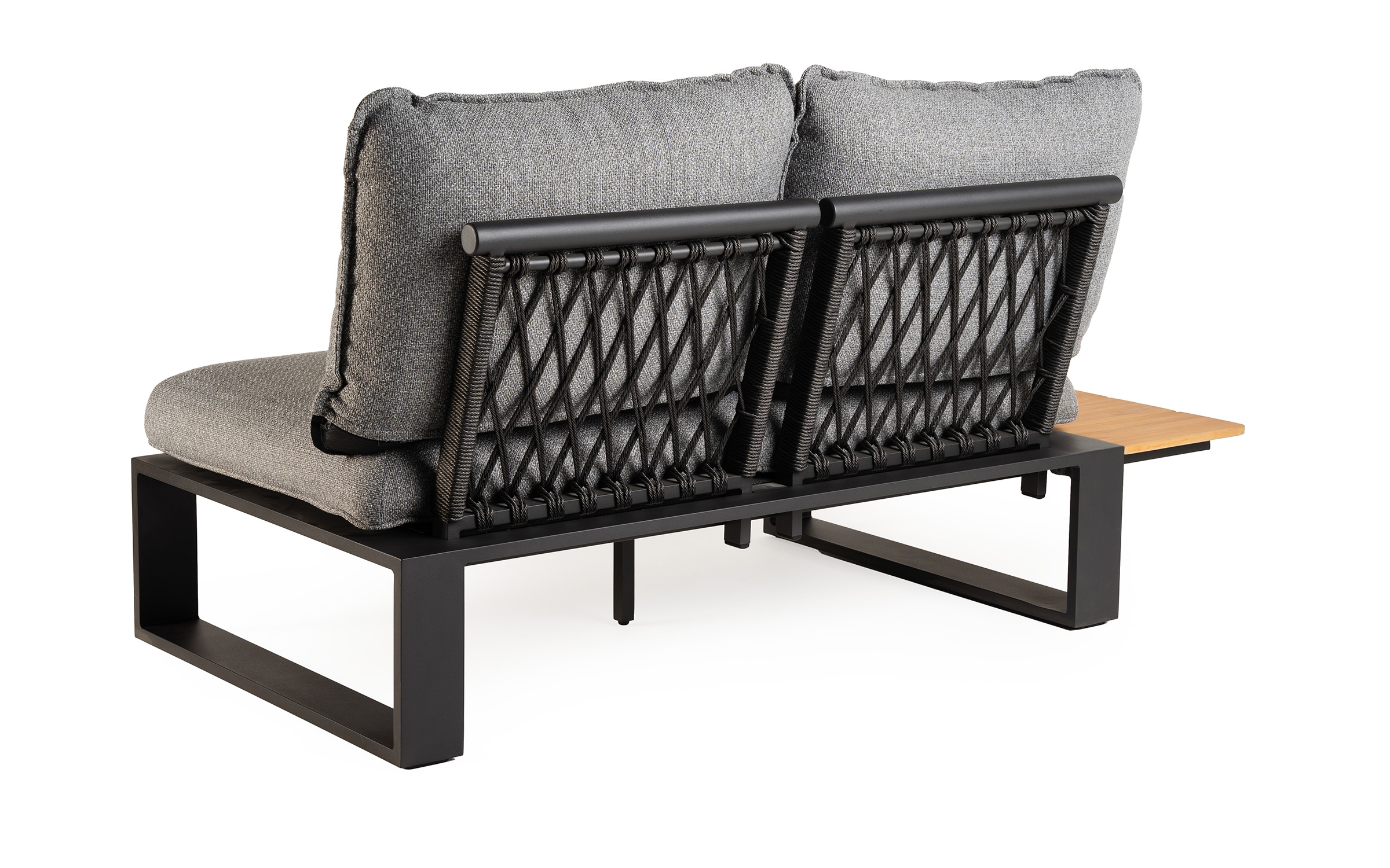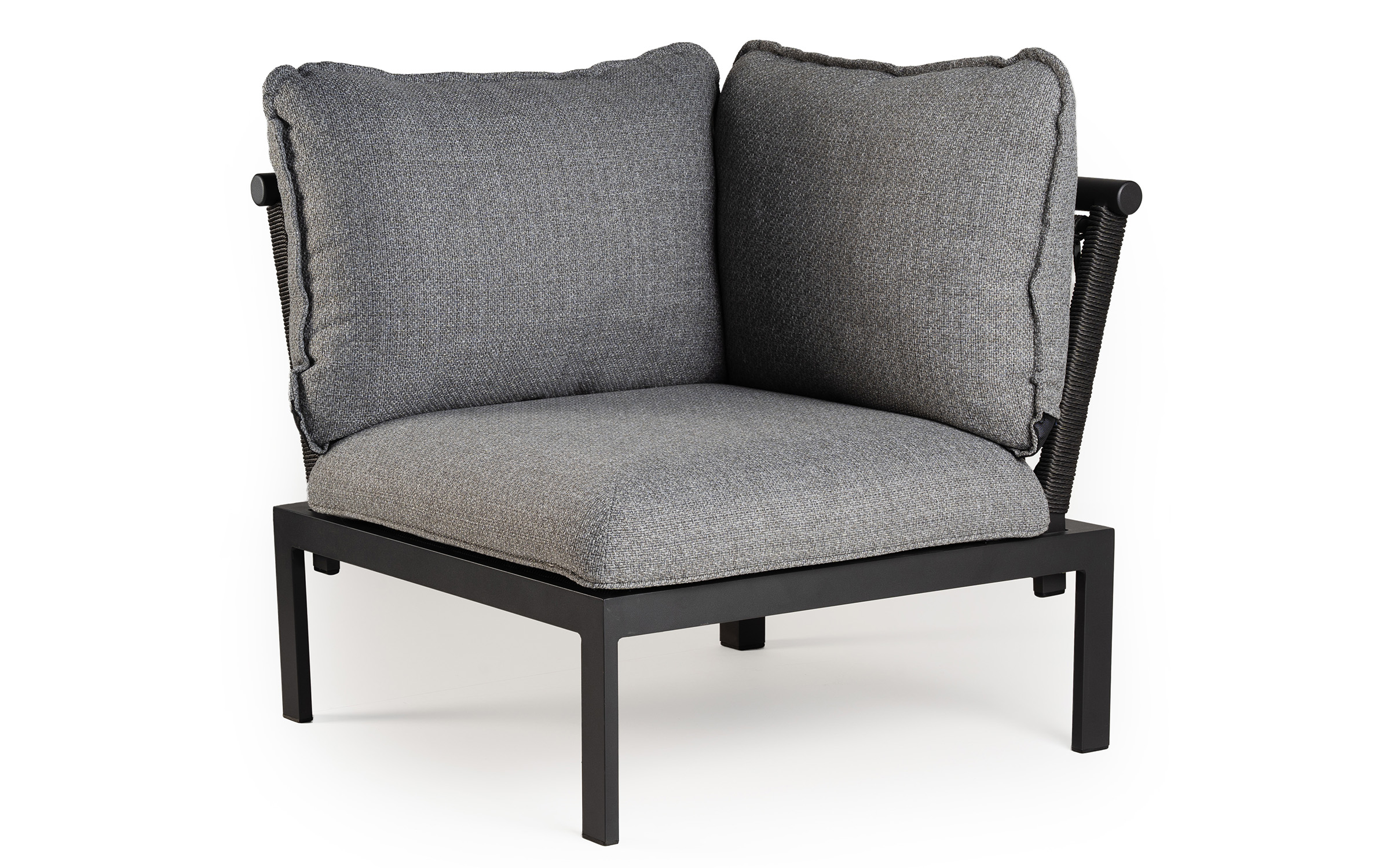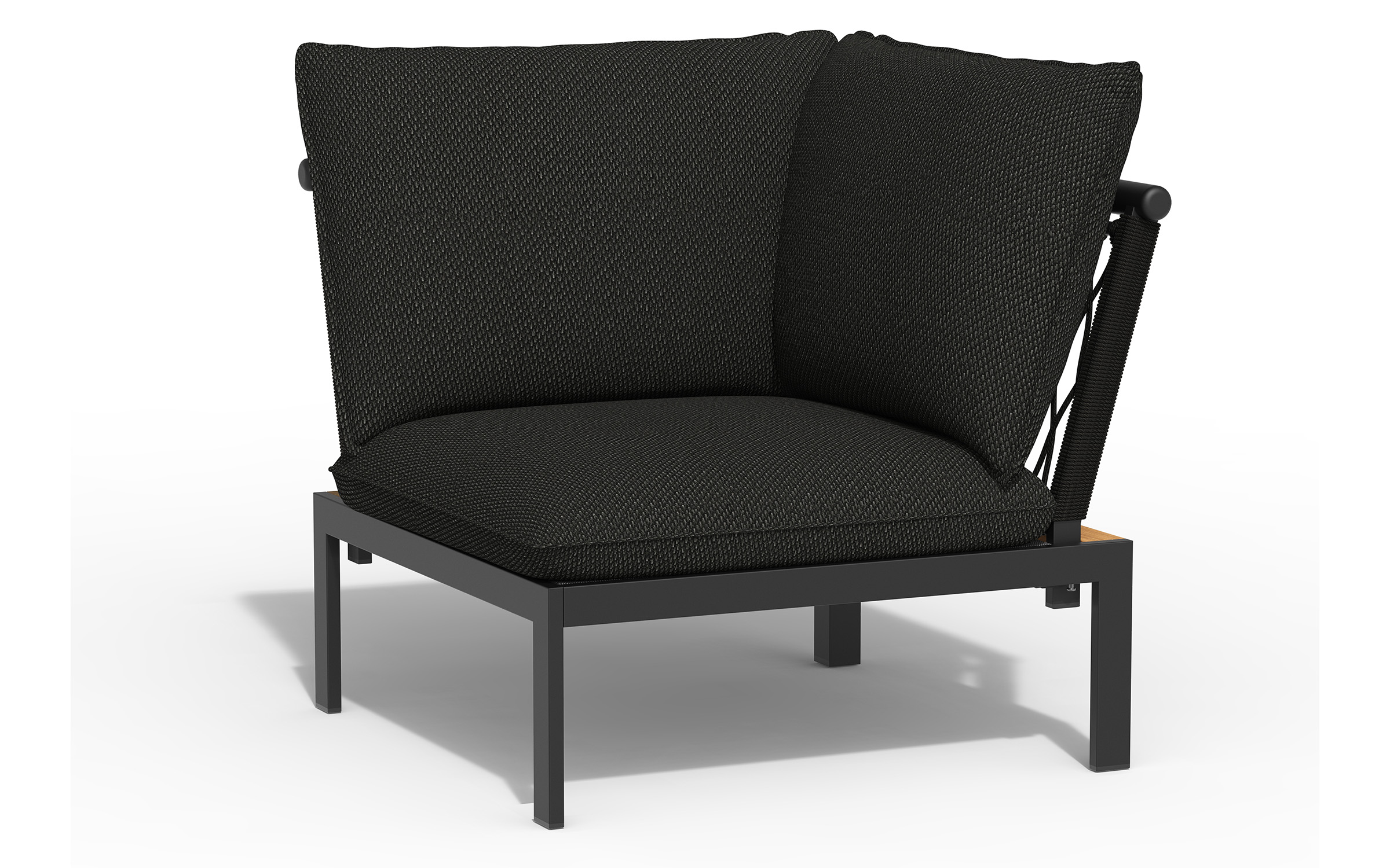 Solidny, pięknie wykończony narożnik wypoczynkowy ma wyrafinowaną mieszankę chłodnego aluminium, ciepłego drewna i modnej liny polipropylenowej.