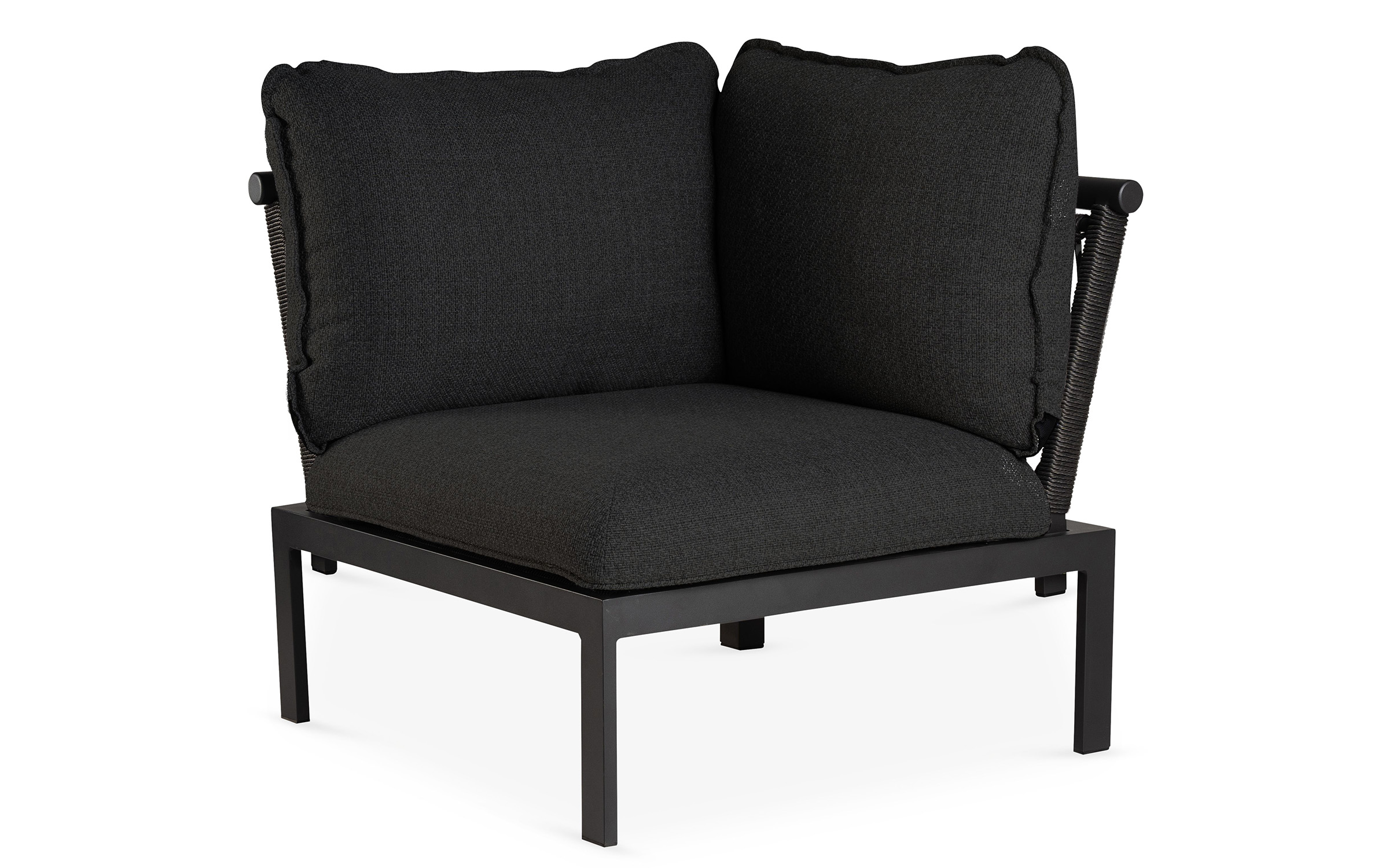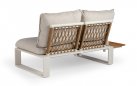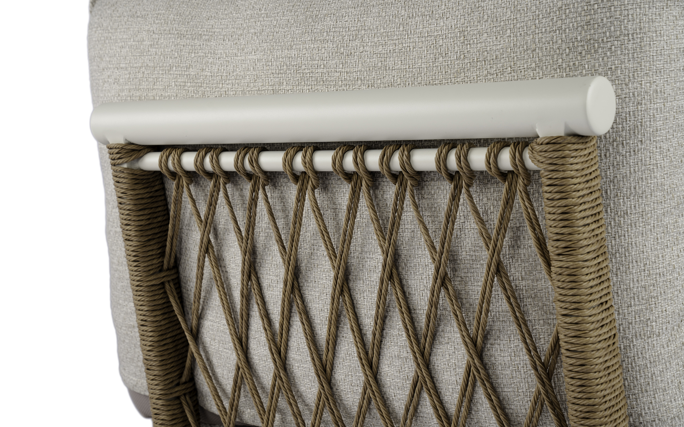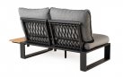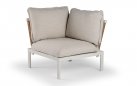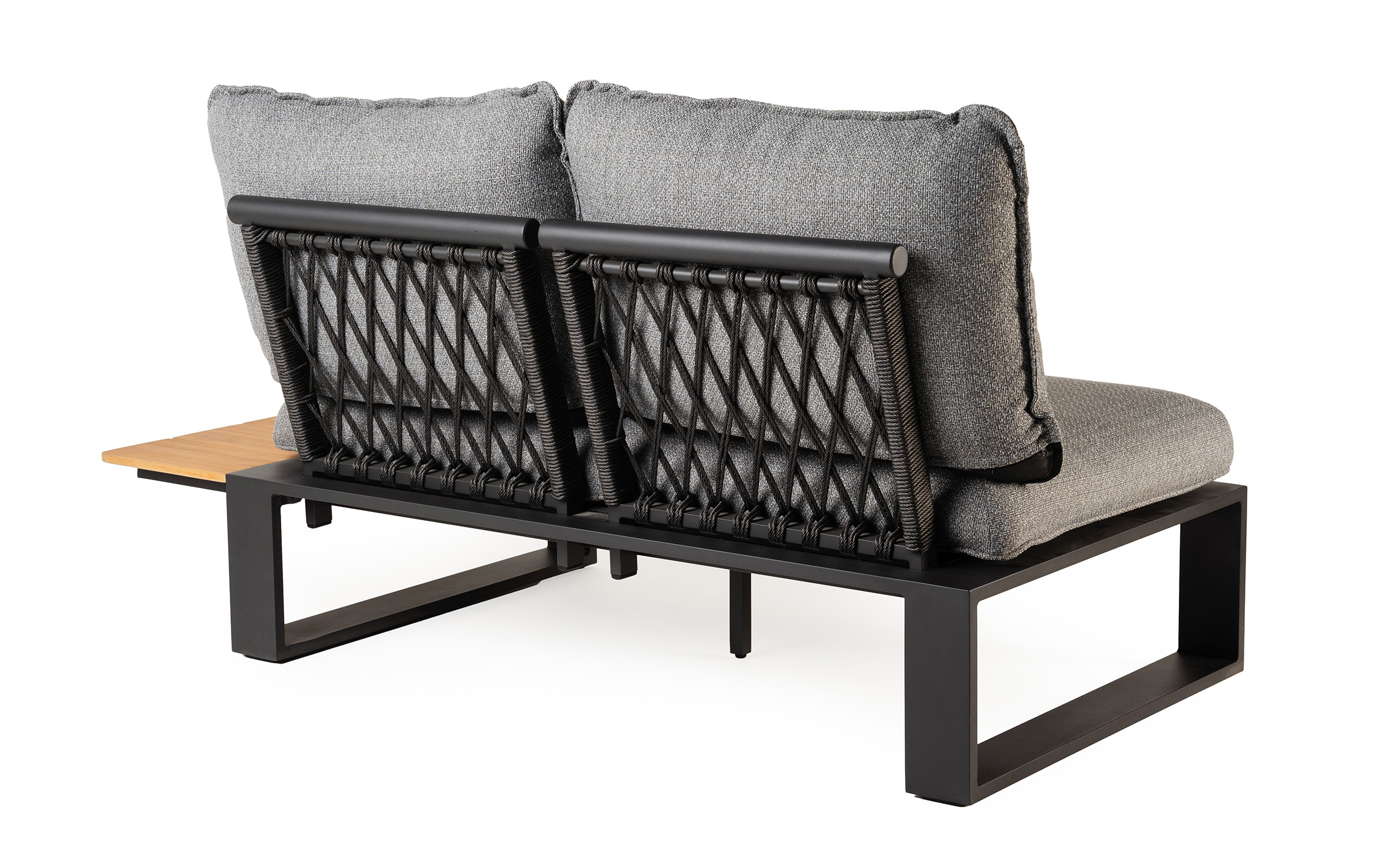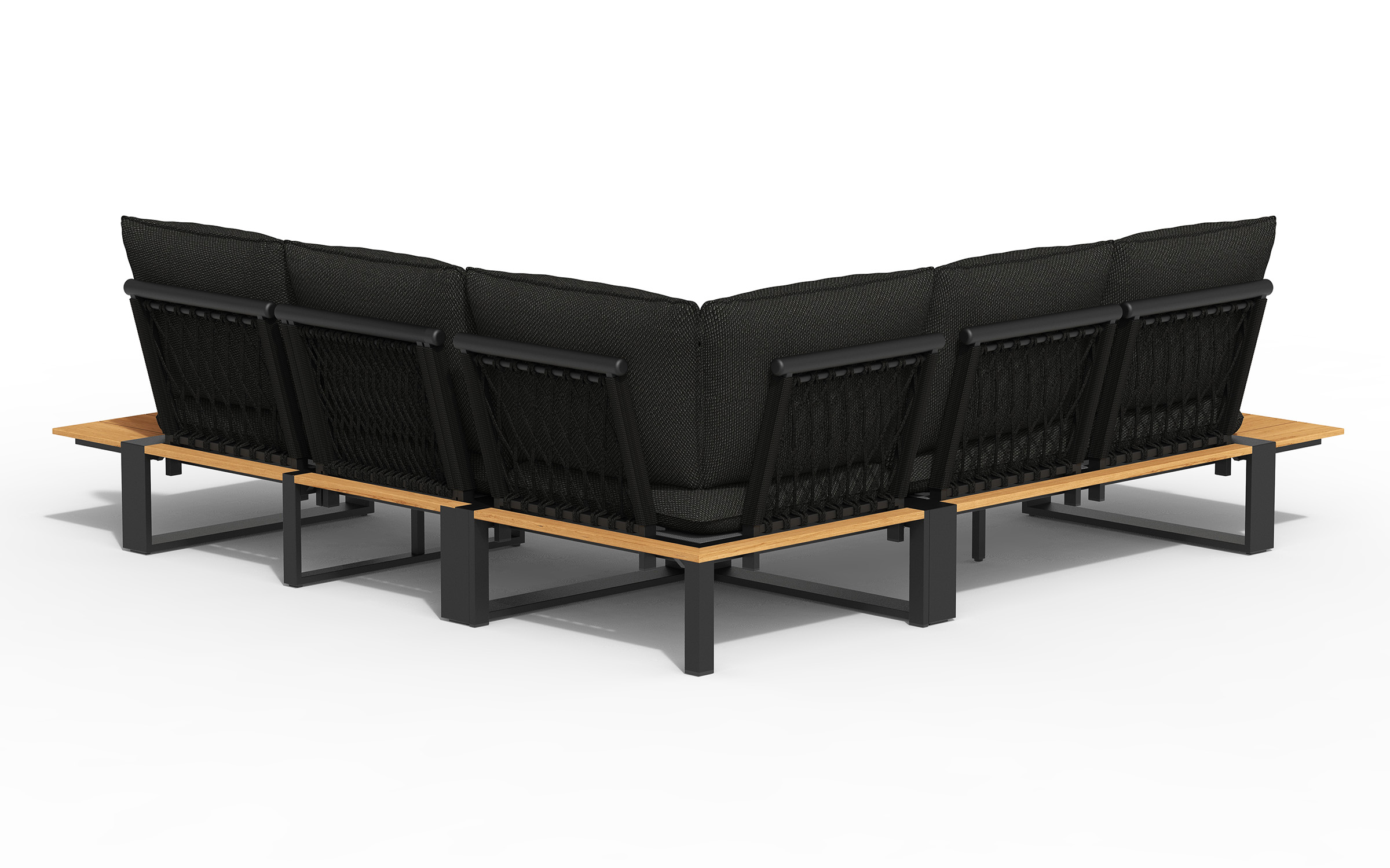 Solidny, pięknie wykończony narożnik wypoczynkowy ma wyrafinowaną mieszankę chłodnego aluminium, ciepłego drewna i modnej liny polipropylenowej.