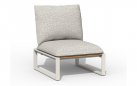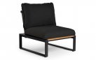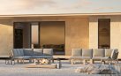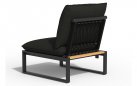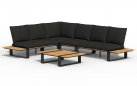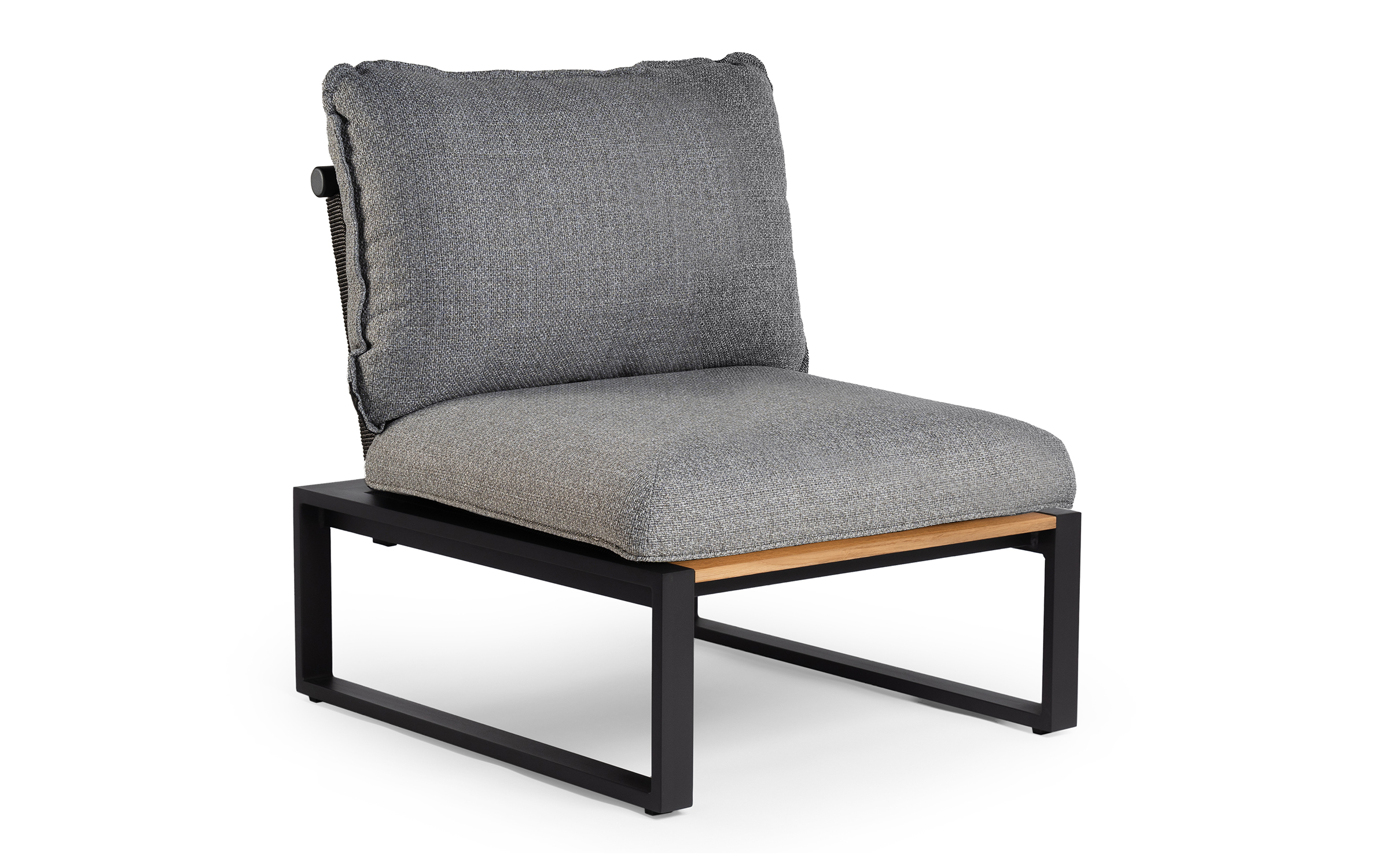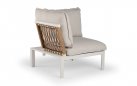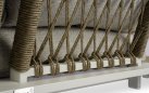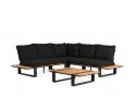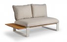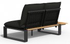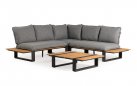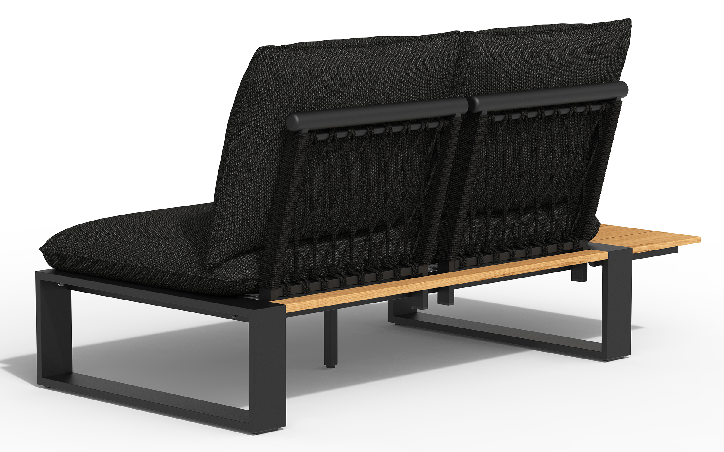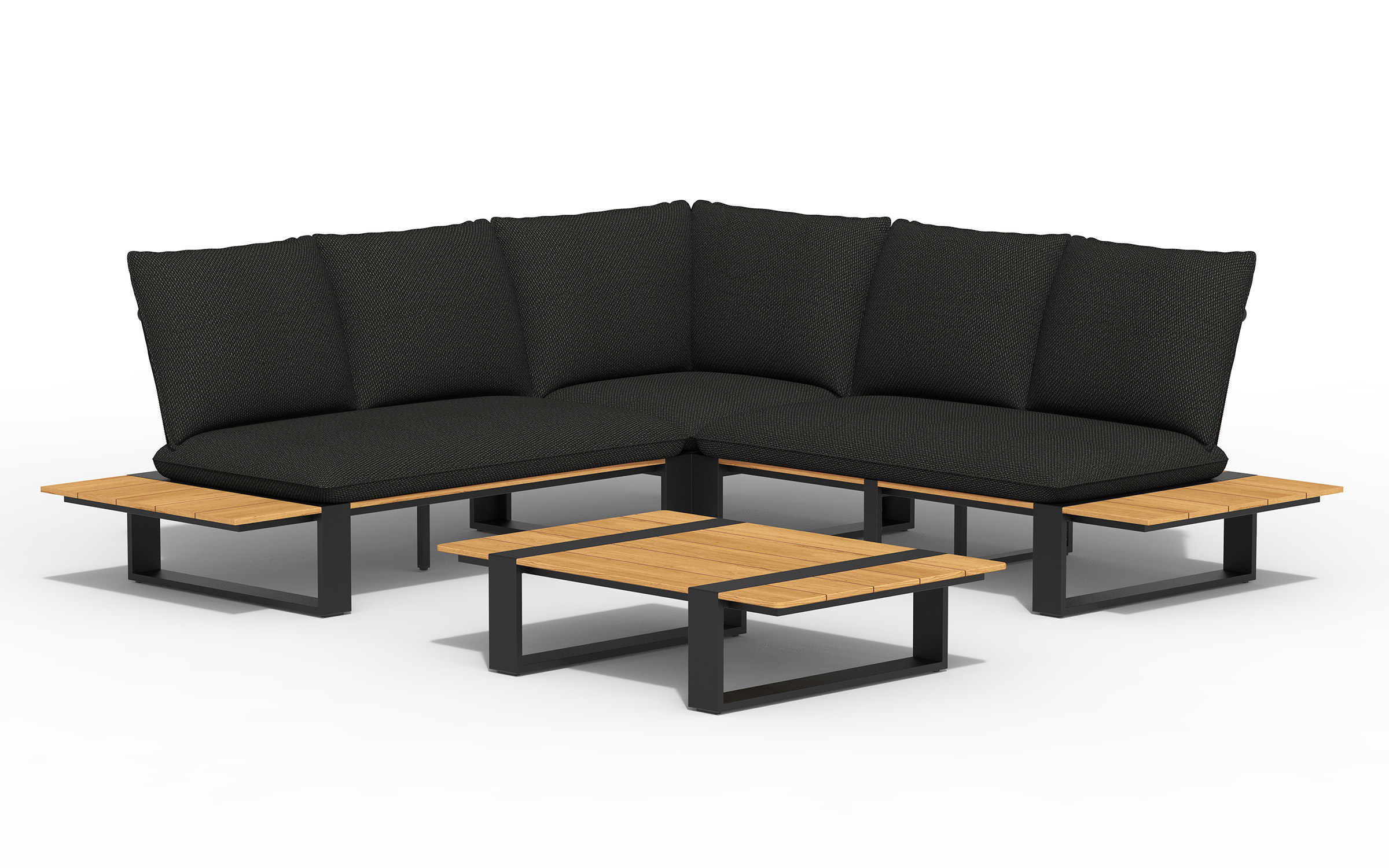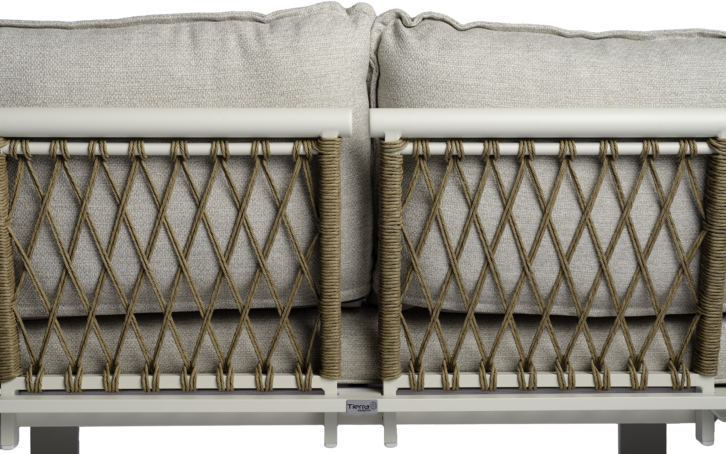 Solidny, pięknie wykończony narożnik wypoczynkowy ma wyrafinowaną mieszankę chłodnego aluminium, ciepłego drewna i modnej liny polipropylenowej.