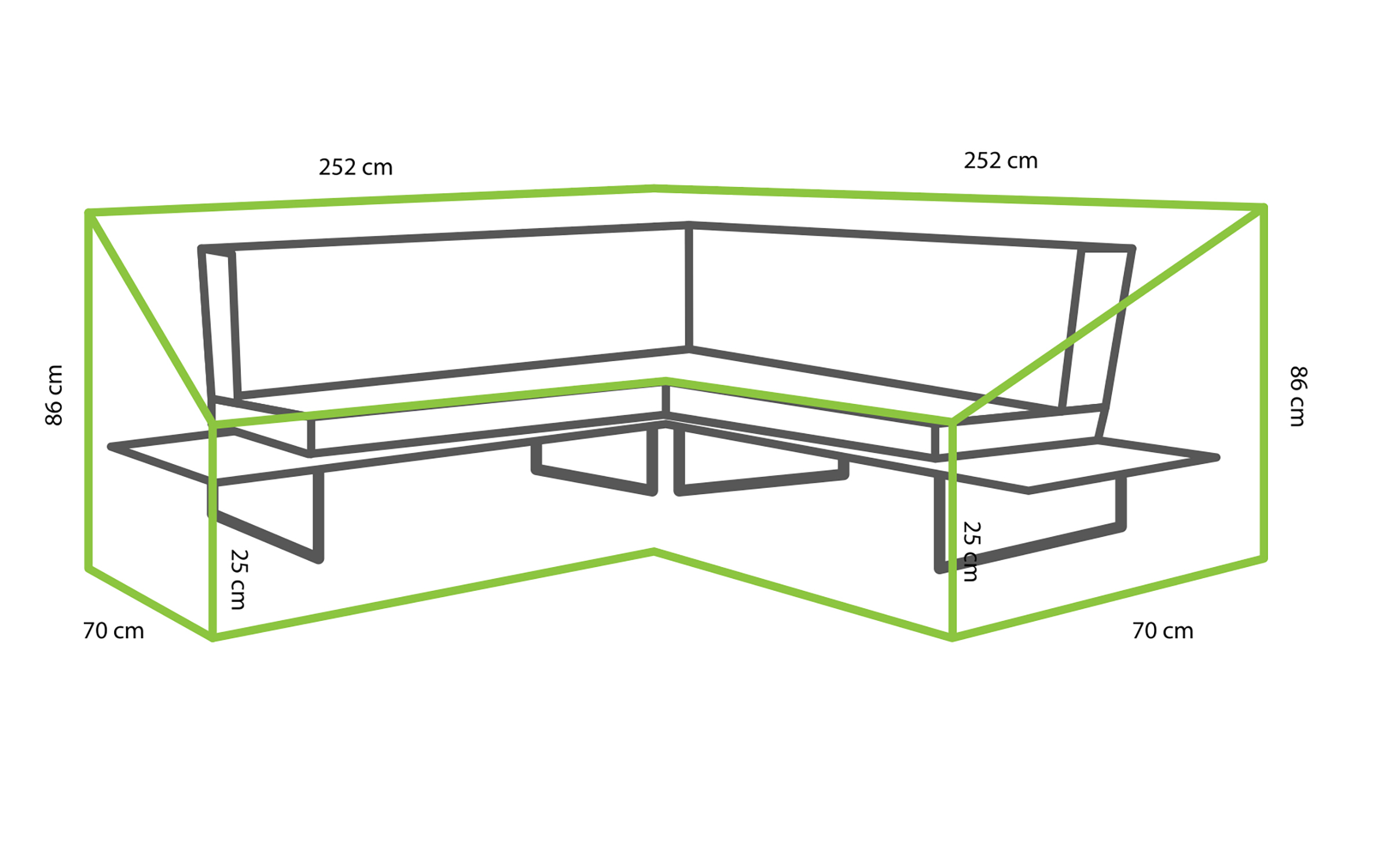 Szerokość 247 cm / Głębokość 247 cm / Wysokość 75 cm (90 cm do wysokości poduszek)