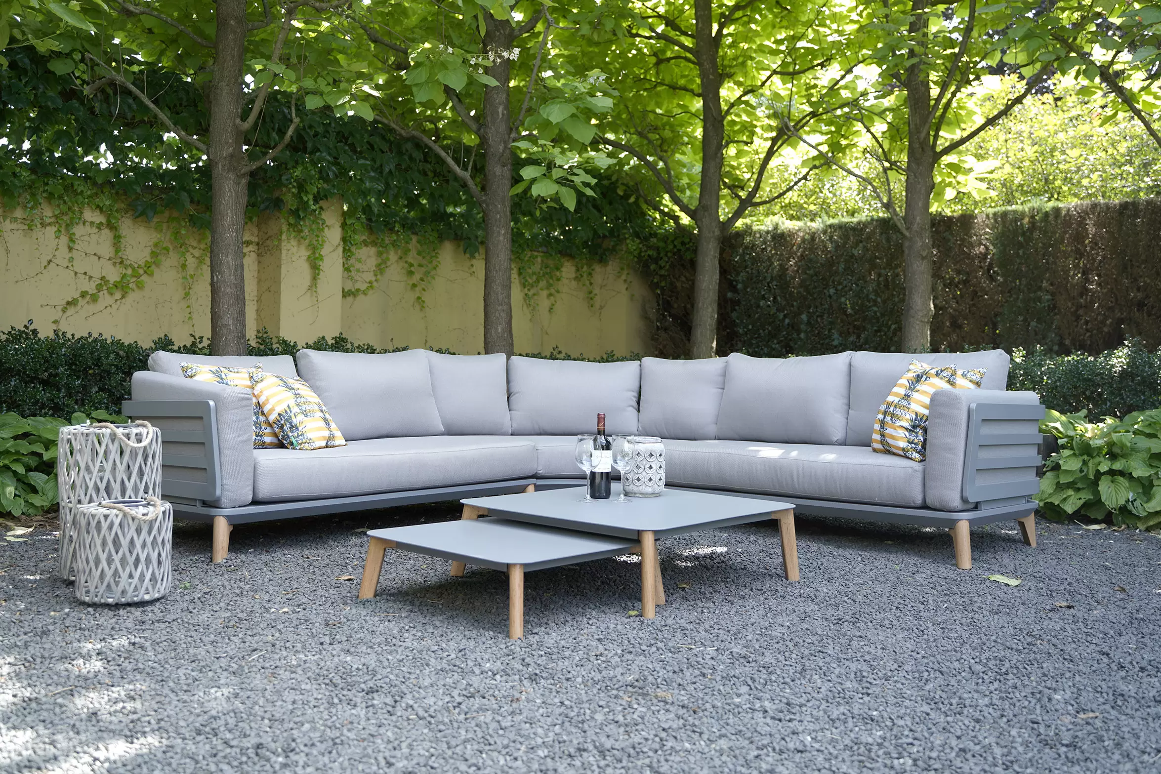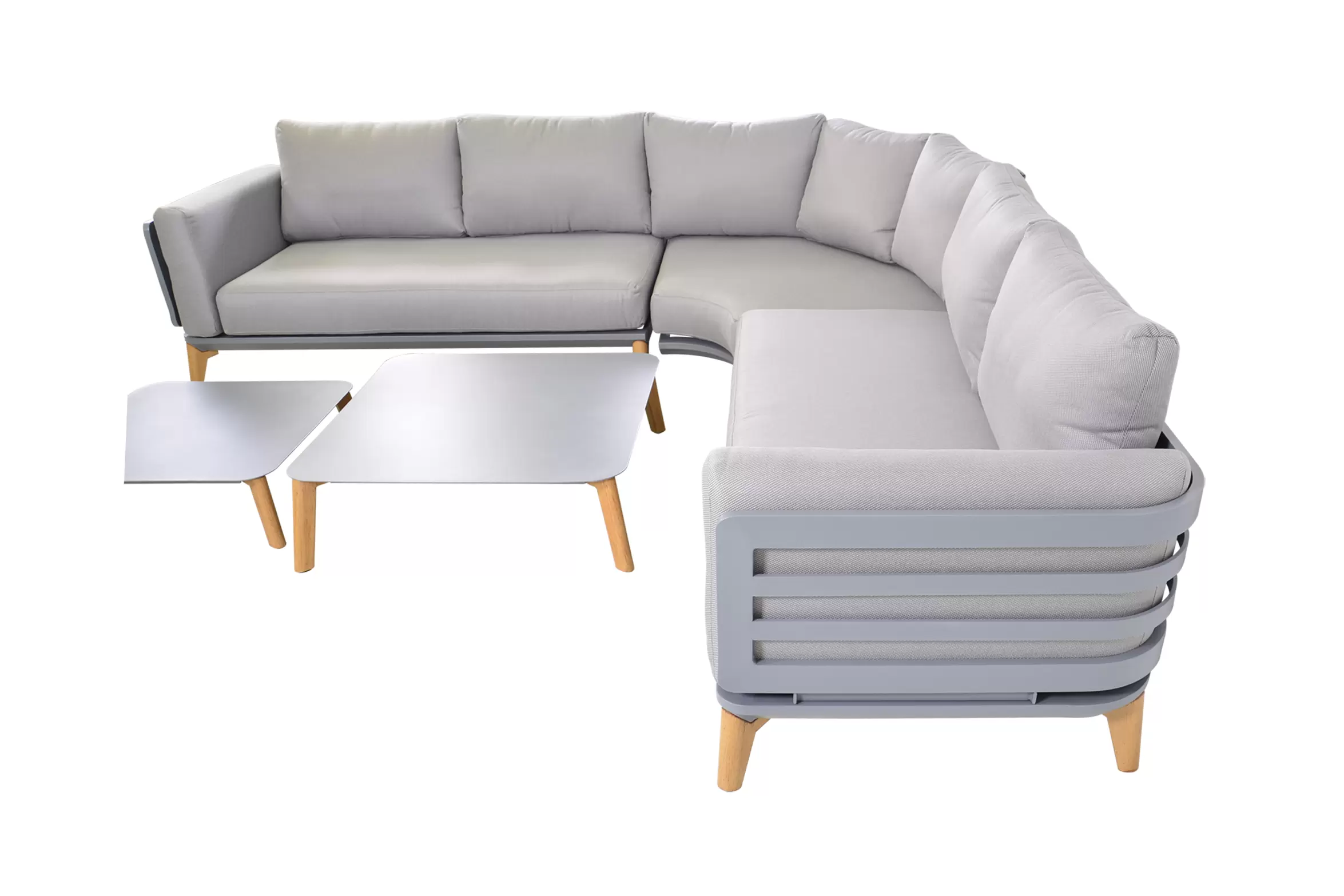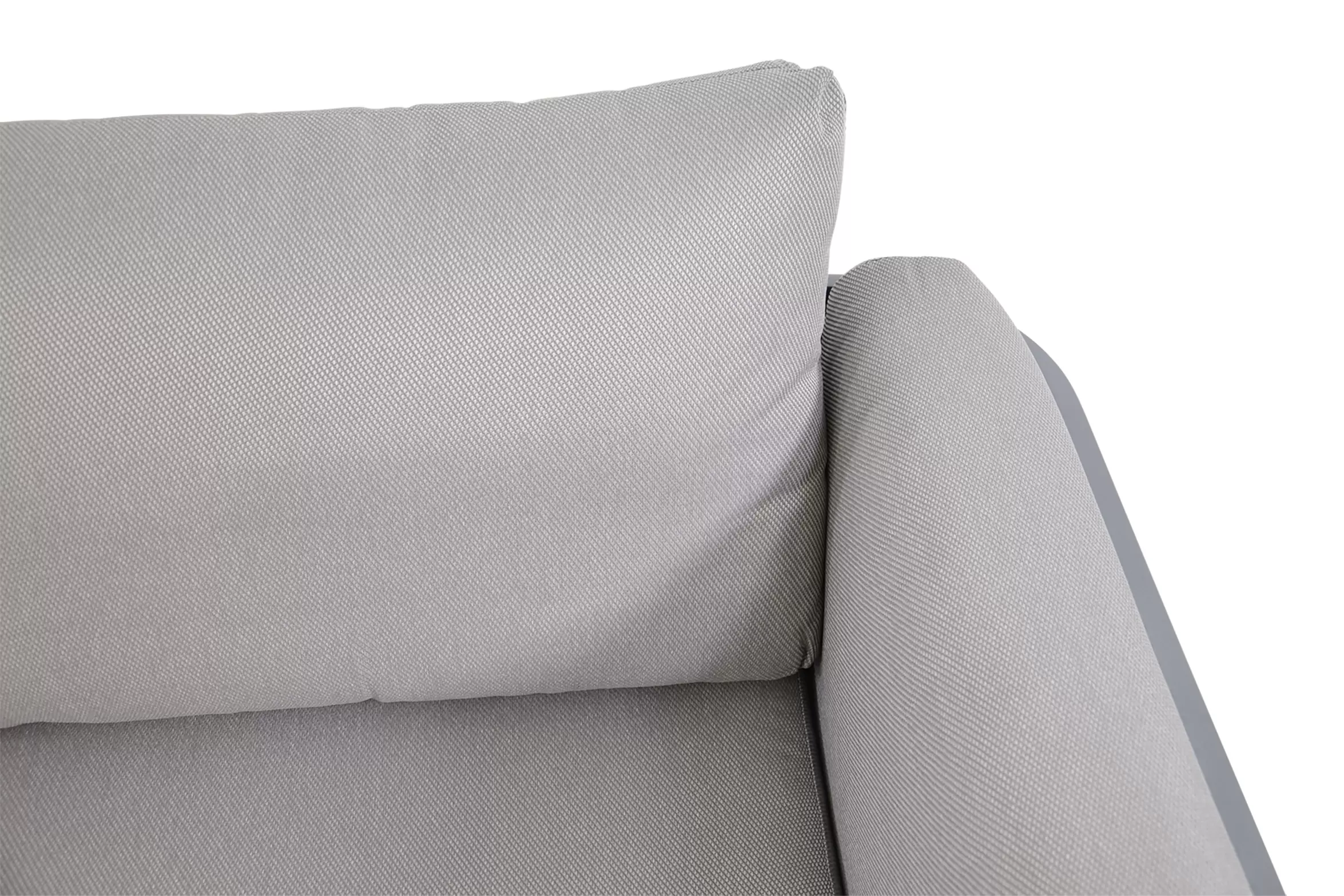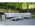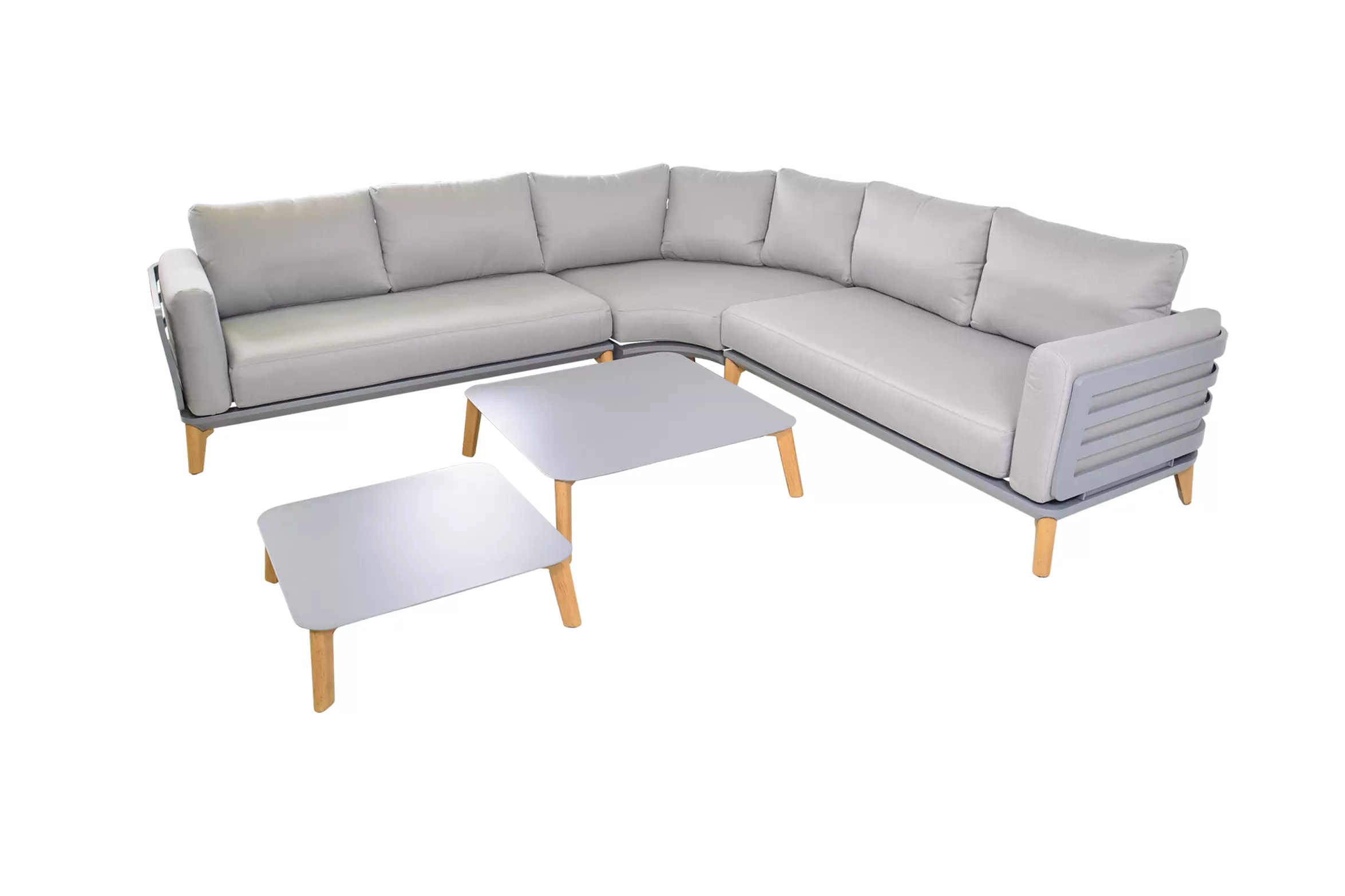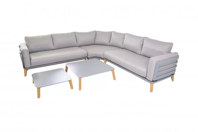 Wysokiej jakości zestaw wypoczynkowy z wysokiej jakości matową aluminiową ramą z jasnoszarą tapicerką. Super gruba wyściółka i najnowocześniejsza stylizacja dla Twojego domu. Narożnik ma wymiar 280 x 280 cm.