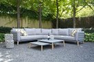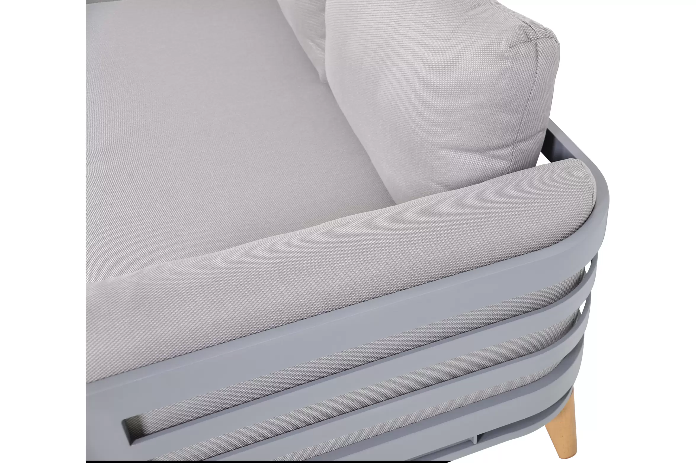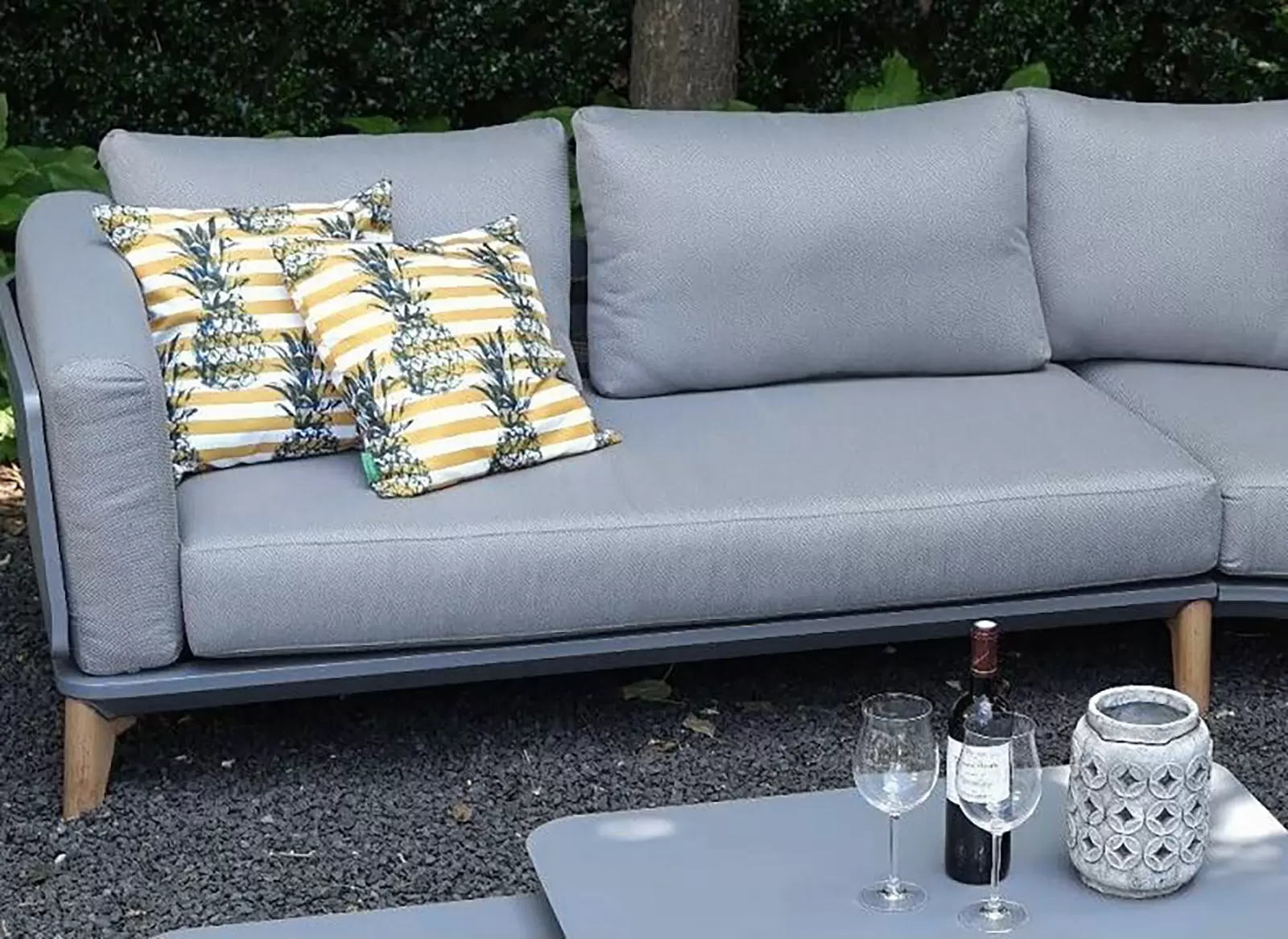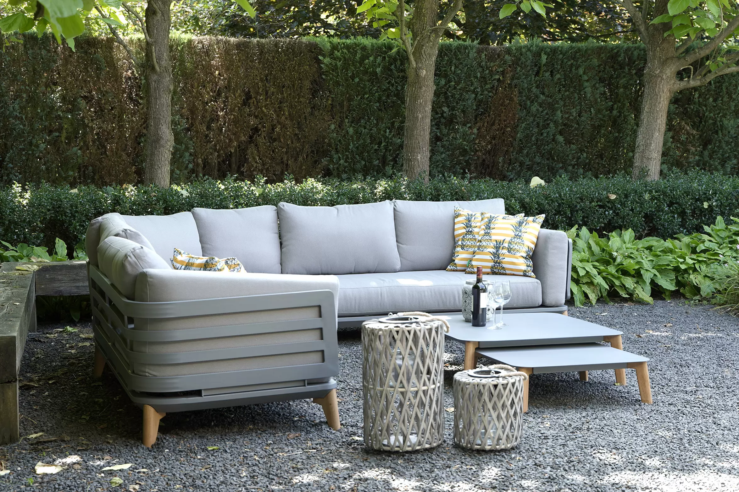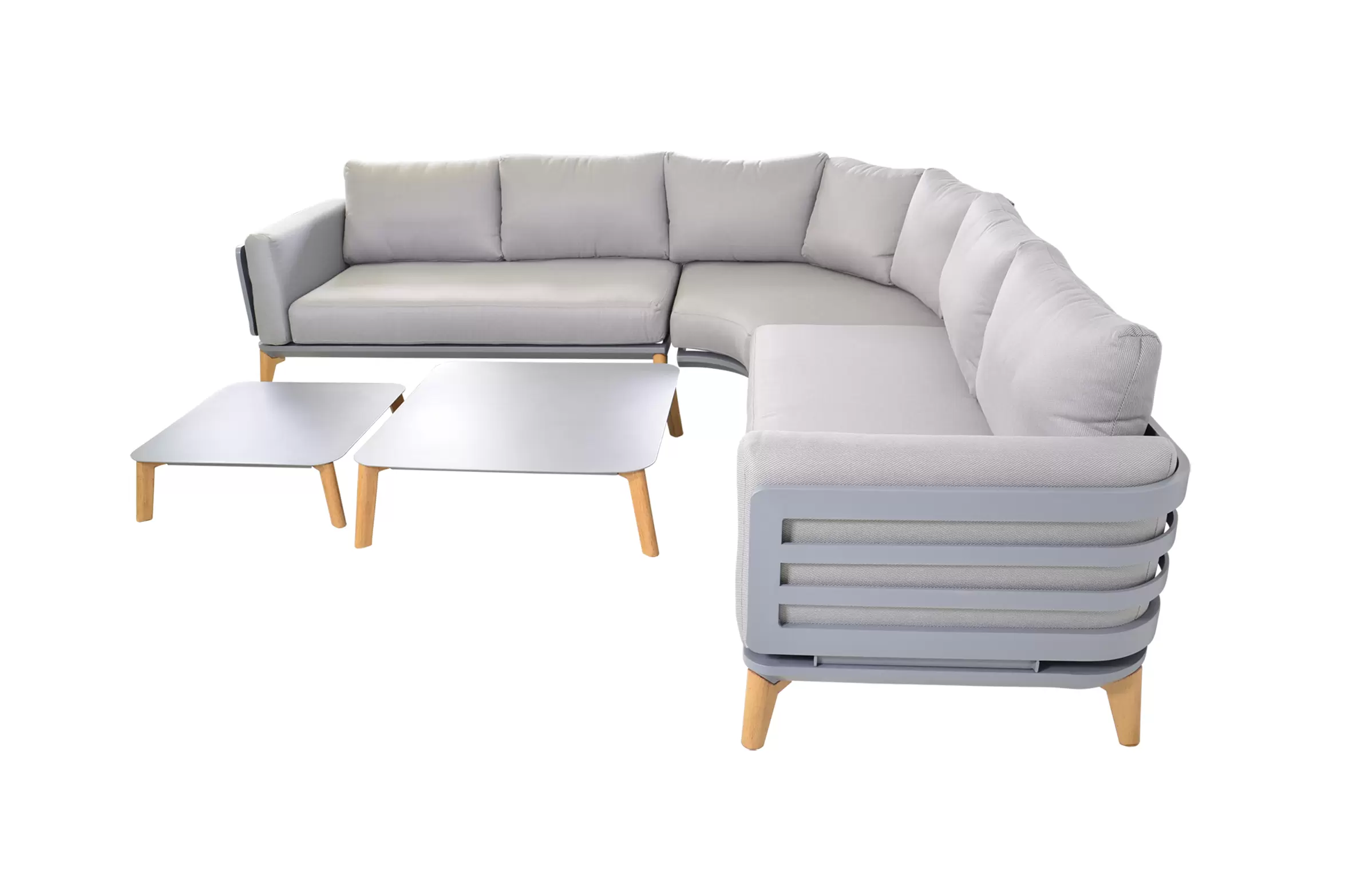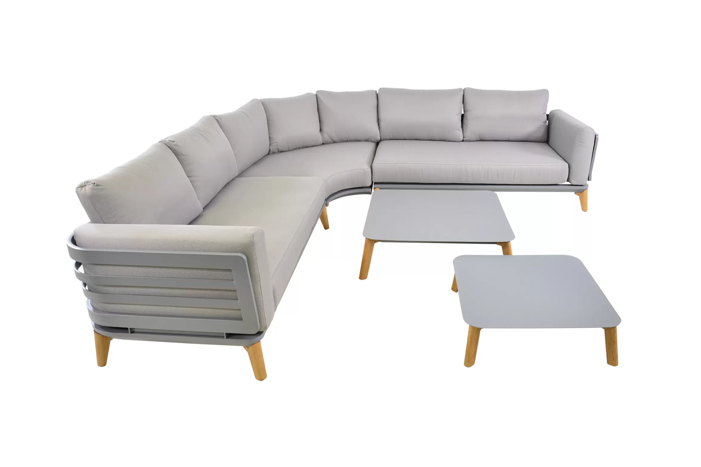 Wysokiej jakości zestaw wypoczynkowy z wysokiej jakości matową aluminiową ramą z jasnoszarą tapicerką. Super gruba wyściółka i najnowocześniejsza stylizacja dla Twojego domu. Narożnik ma wymiar 280 x 280 cm.