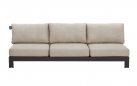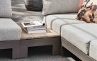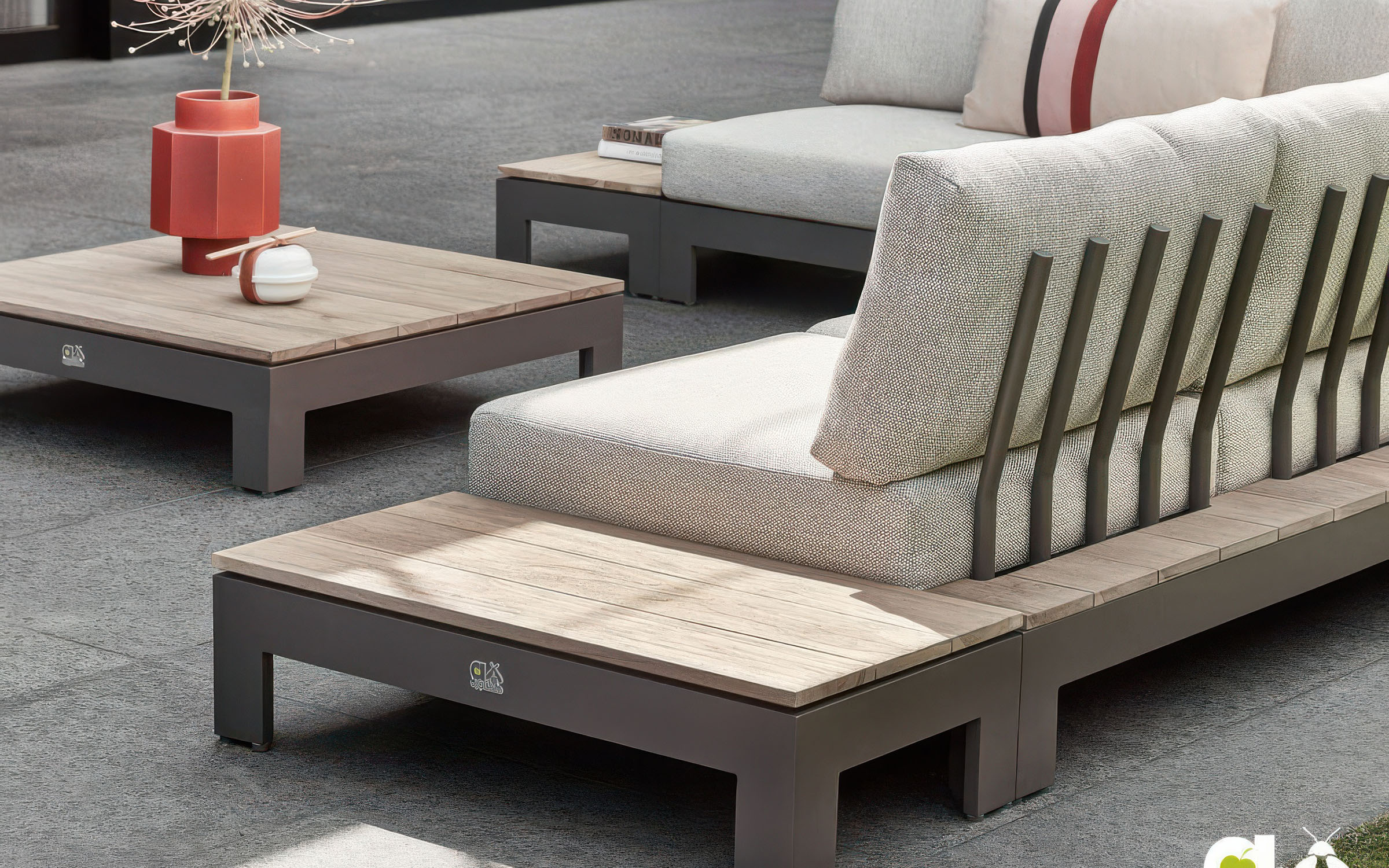 Narożnik ogrodowy STICKS AND MORE — modułowy symetryczny zestaw z aluminiową ramą w kolorze taupe, poduszkami Bee Wett all‑weather i blatami teakowymi; przeznaczony do stałego użytkowania na zewnątrz. Wersja lewa; możliwość dokupienia pojedynczych modułów i akcesoriów ochronnych. Na zdjęciach widać wersję z 1 sofą 2-osobową i 1 sofą 3-osobową - niedostępna.