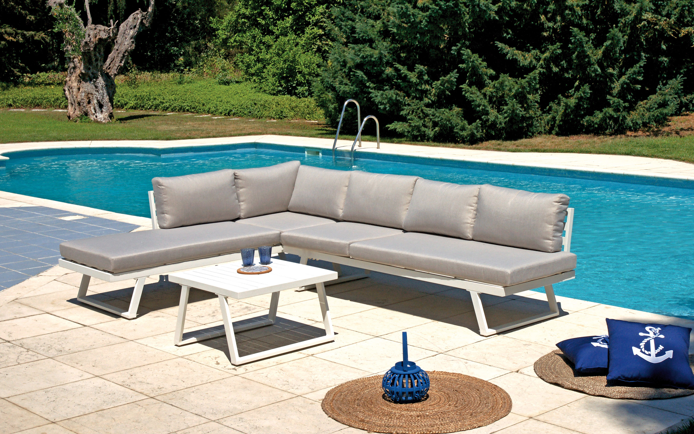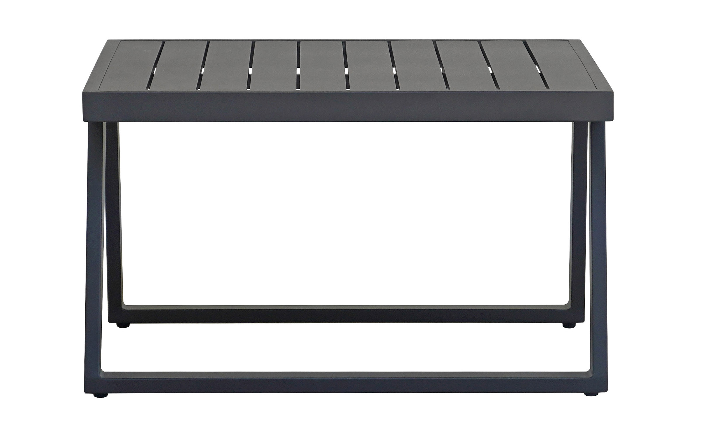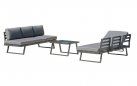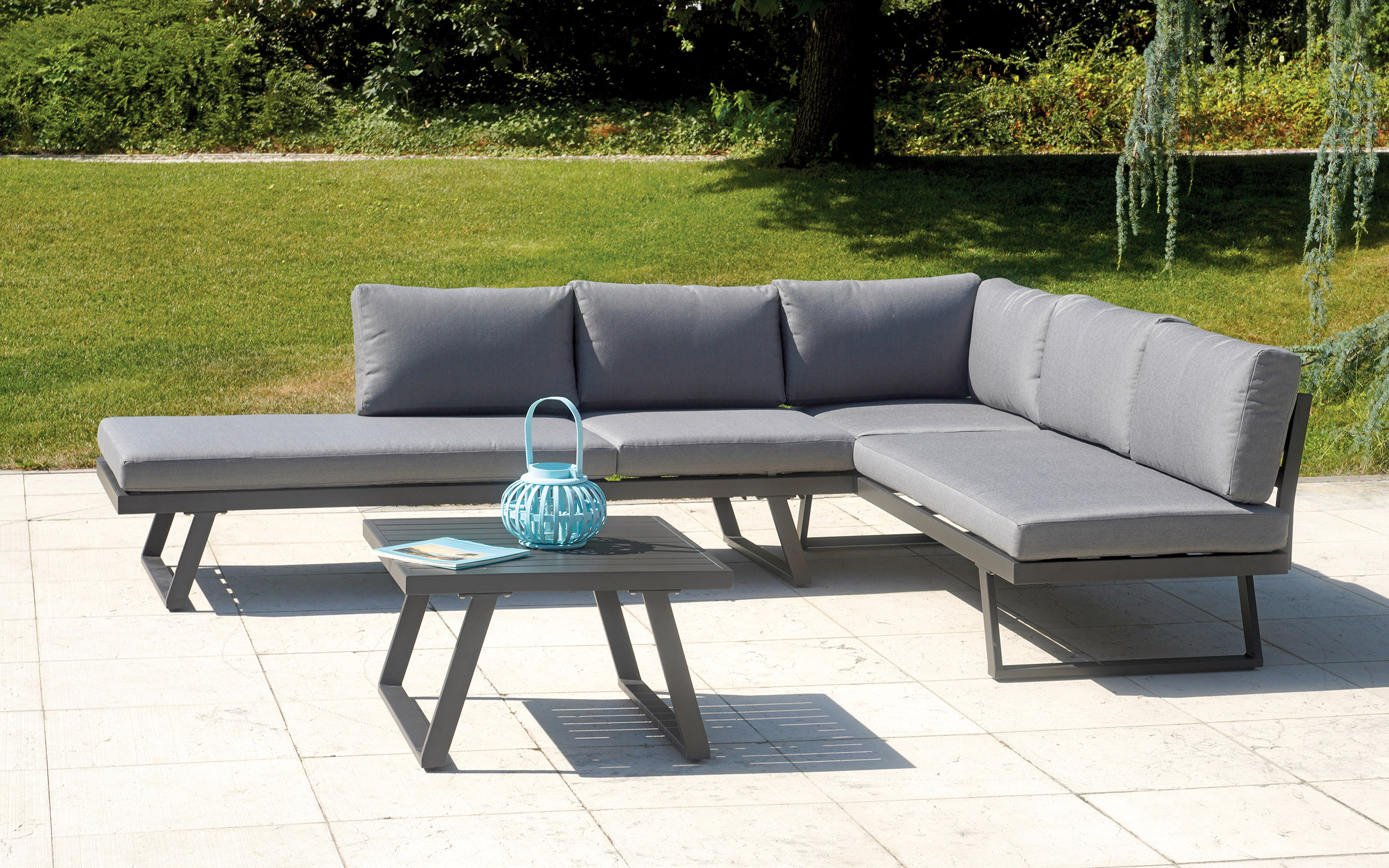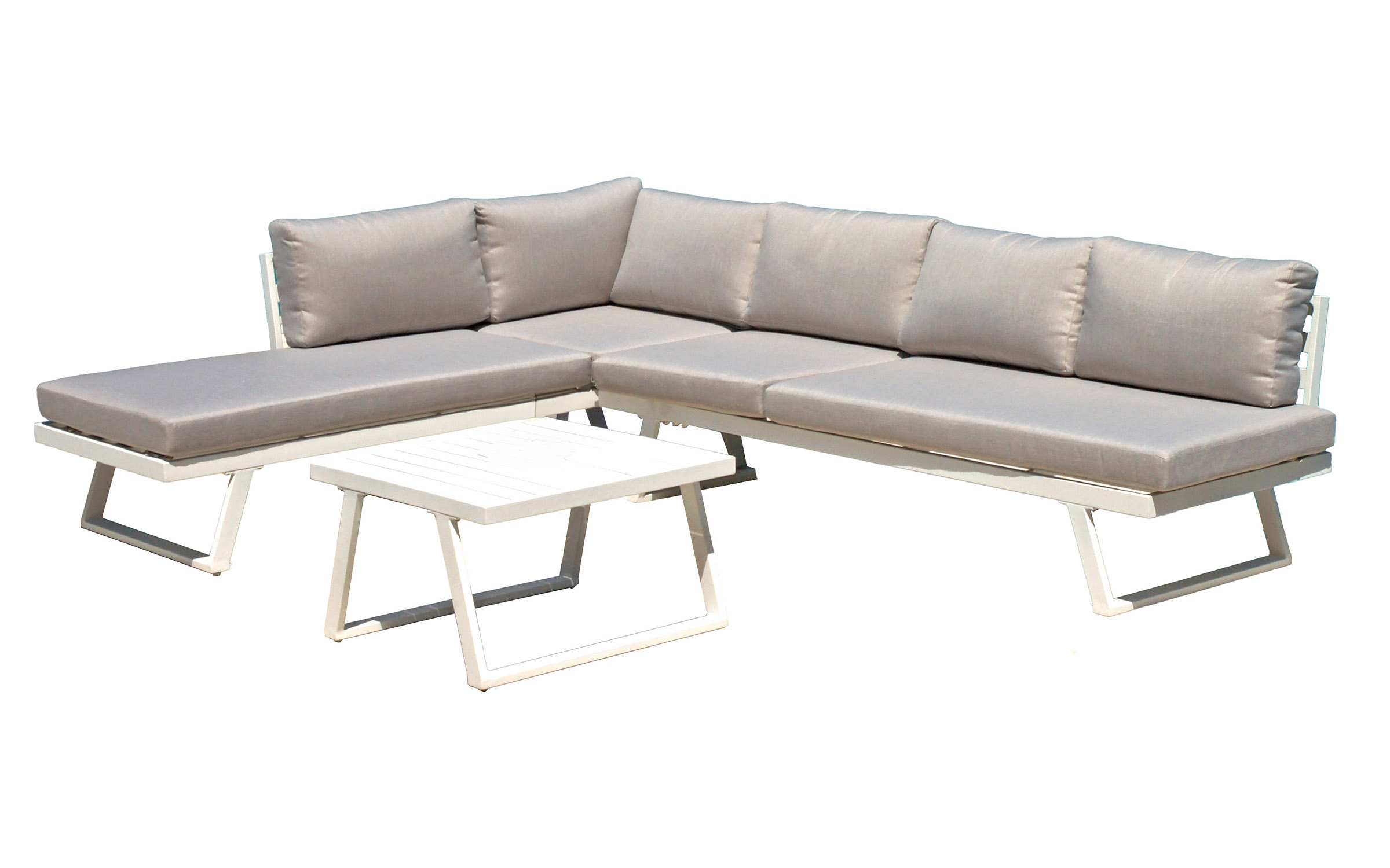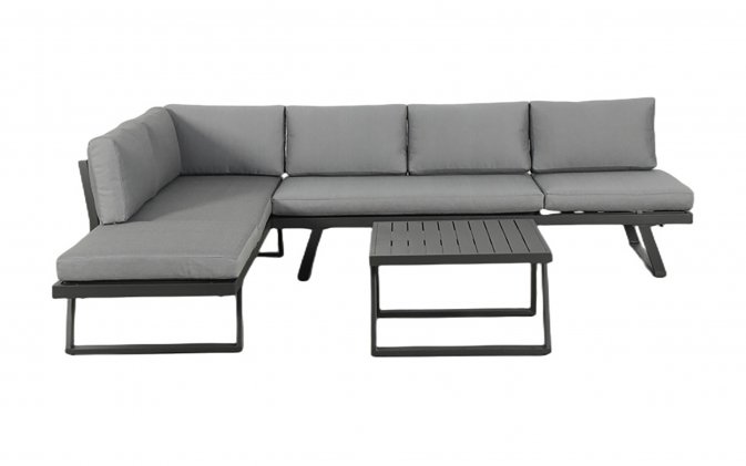Konstrukcja z aluminium malowanego proszkowo. Blat stolika z aluminiowych listew. Poduszki zdejmowane z tkaniny odpornej na warunki atmosferyczne.