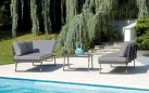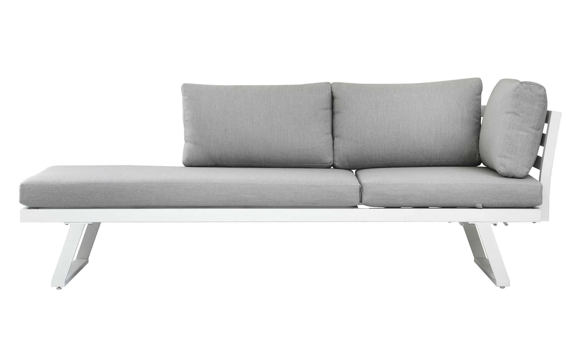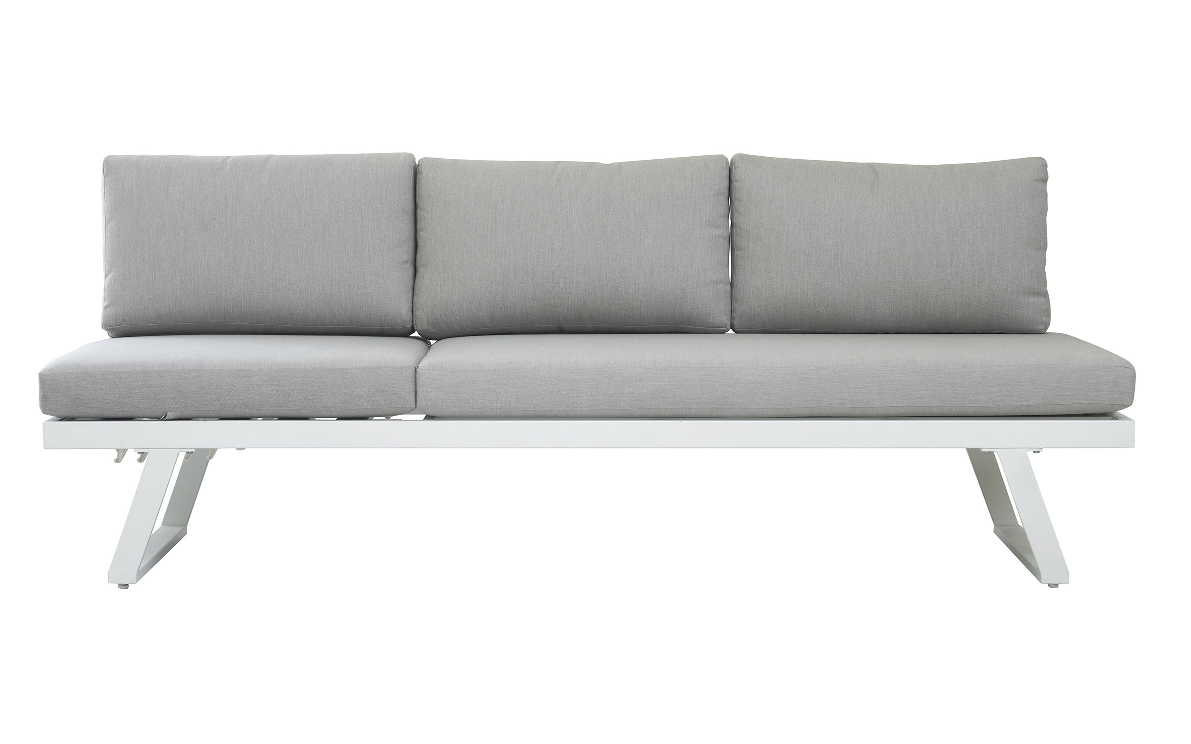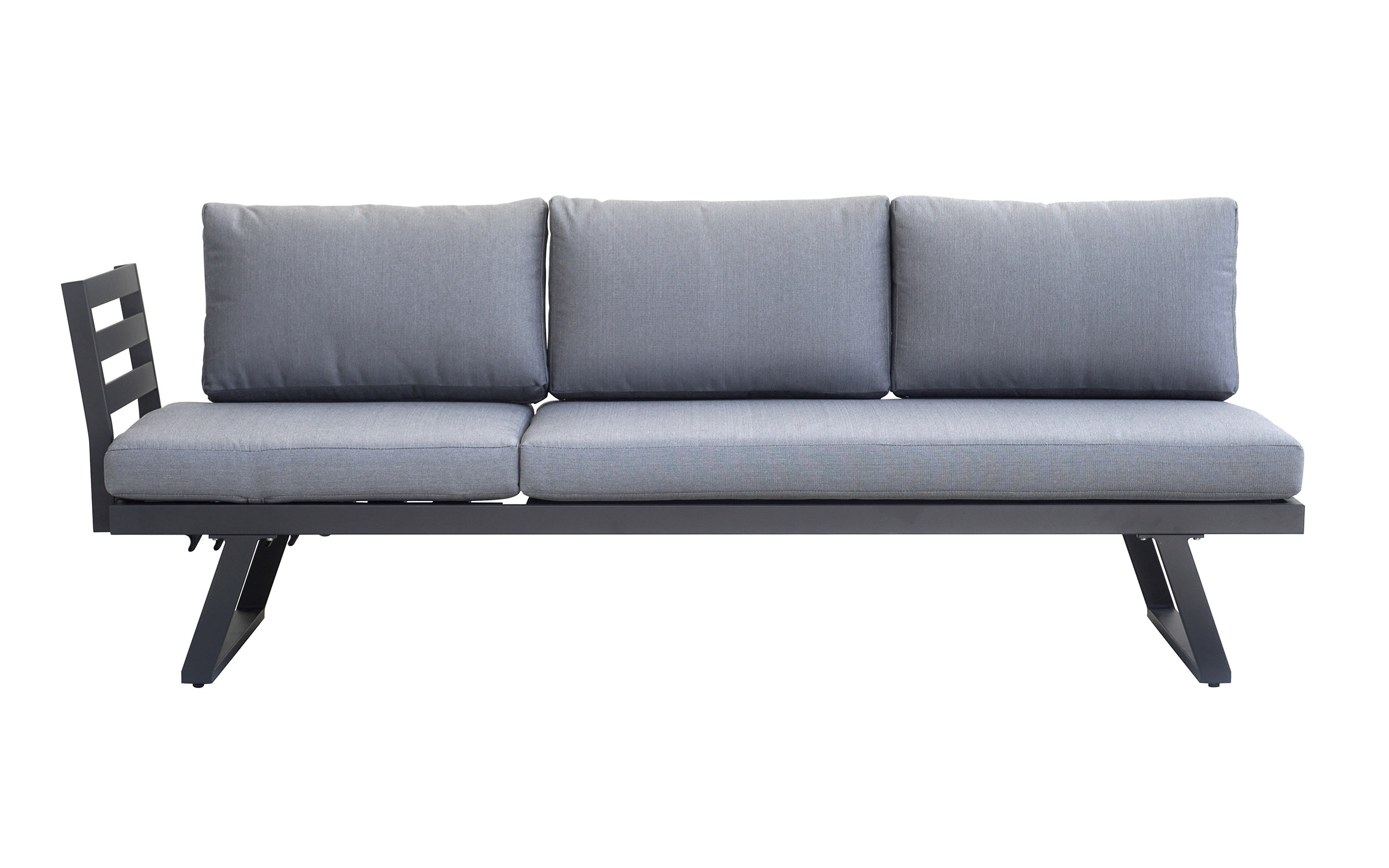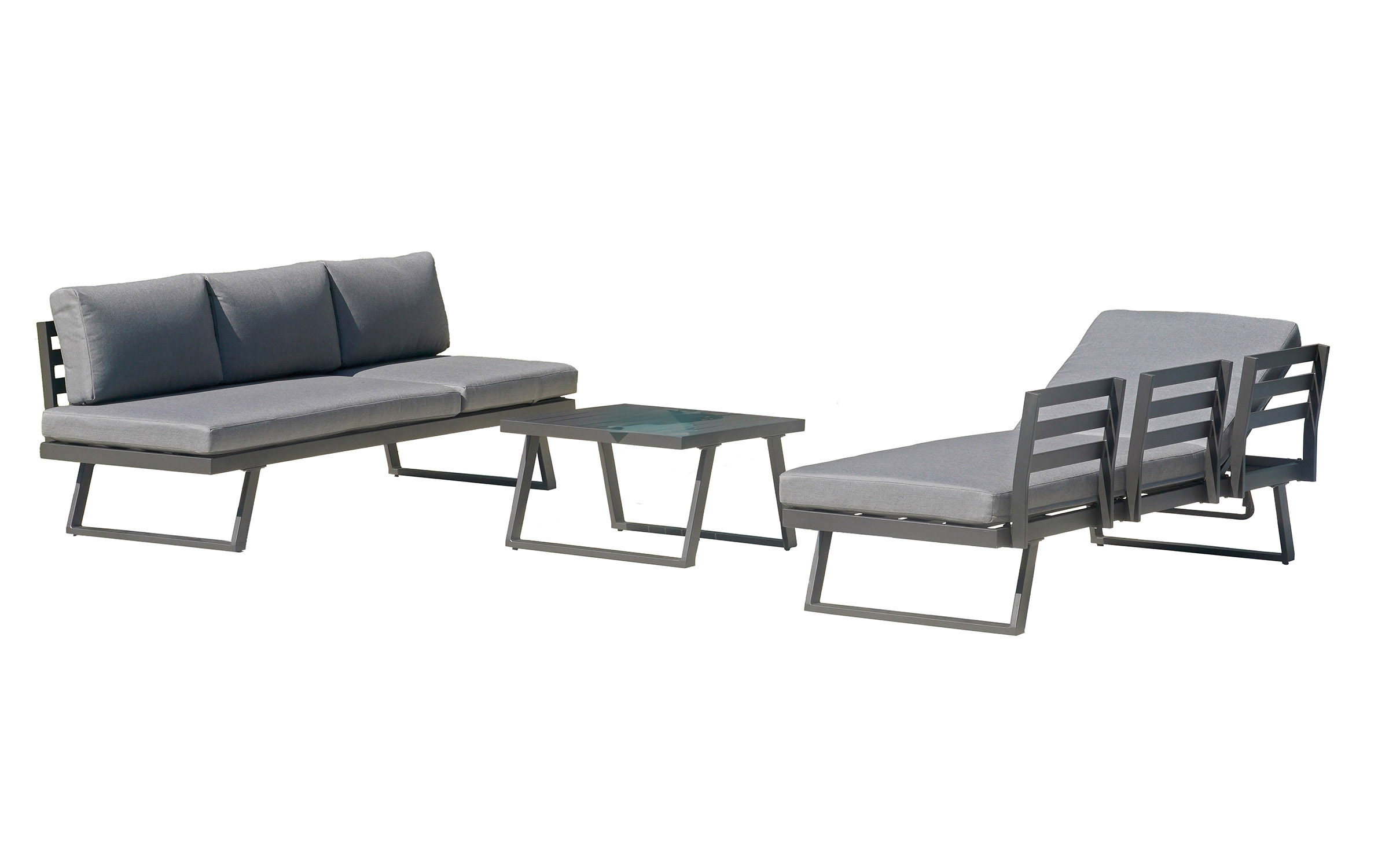 Zestaw wypoczynkowy TUNISI to nowoczesna i funkcjonalna propozycja do ogrodu, na taras lub balkon. Składa się z dwóch sof 3-osobowych, które można przekształcić w leżanki, oraz stolika kawowego z blatem z aluminiowych listew. Konstrukcja wykonana z aluminium malowanego proszkowo, odporna na warunki atmosferyczne.