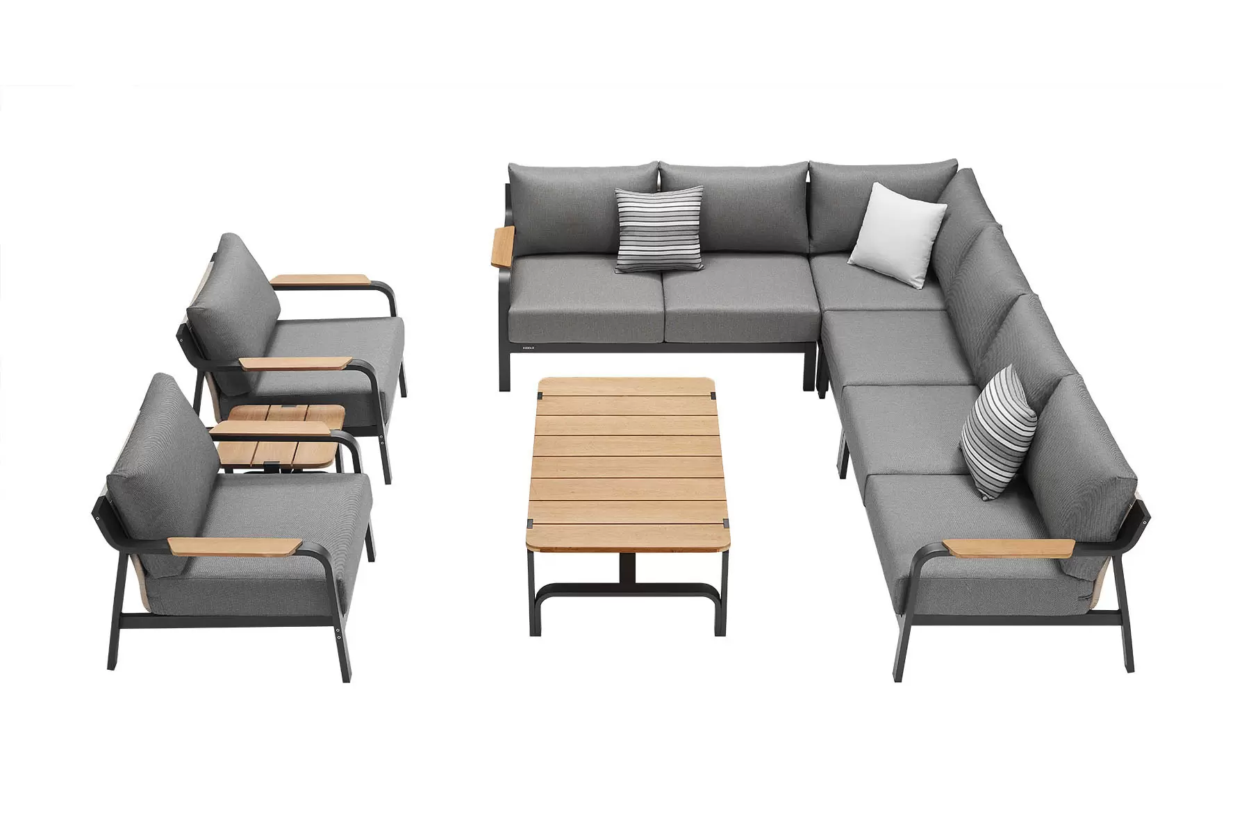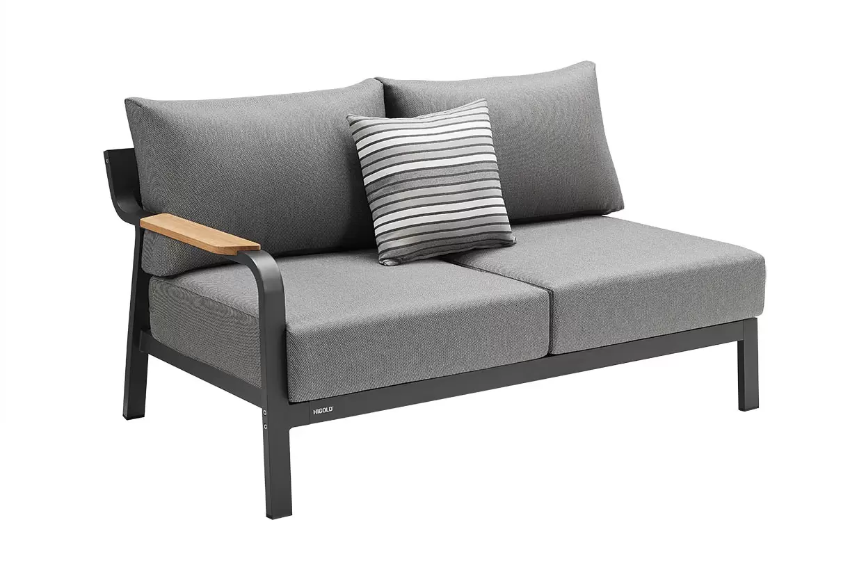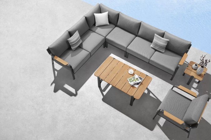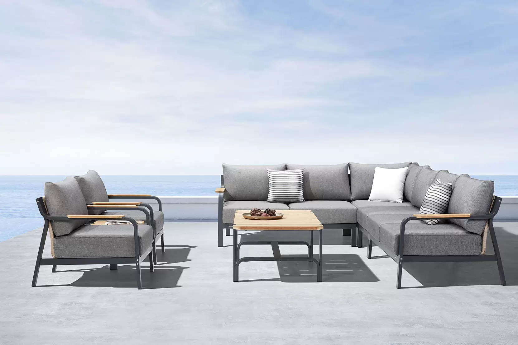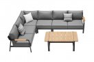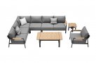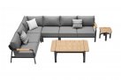 Zaprojektowany i wykonany z najwyższą jakością i detalami nowoczesny modułowy komplet narożnikowy na taras firmy HIGOLD. Konstrukcja opiera się na spawanej ramie aluminiowej malowanej proszkowo, elementach dekoracyjnych z teaku i wygodnych poduszek z obiciami z materiału Olefin. Oparcie oplecione wysokiej jakości beżową liną polipropylenową odporną zarówno na warunki atmosferyczne panujące w Polsce.