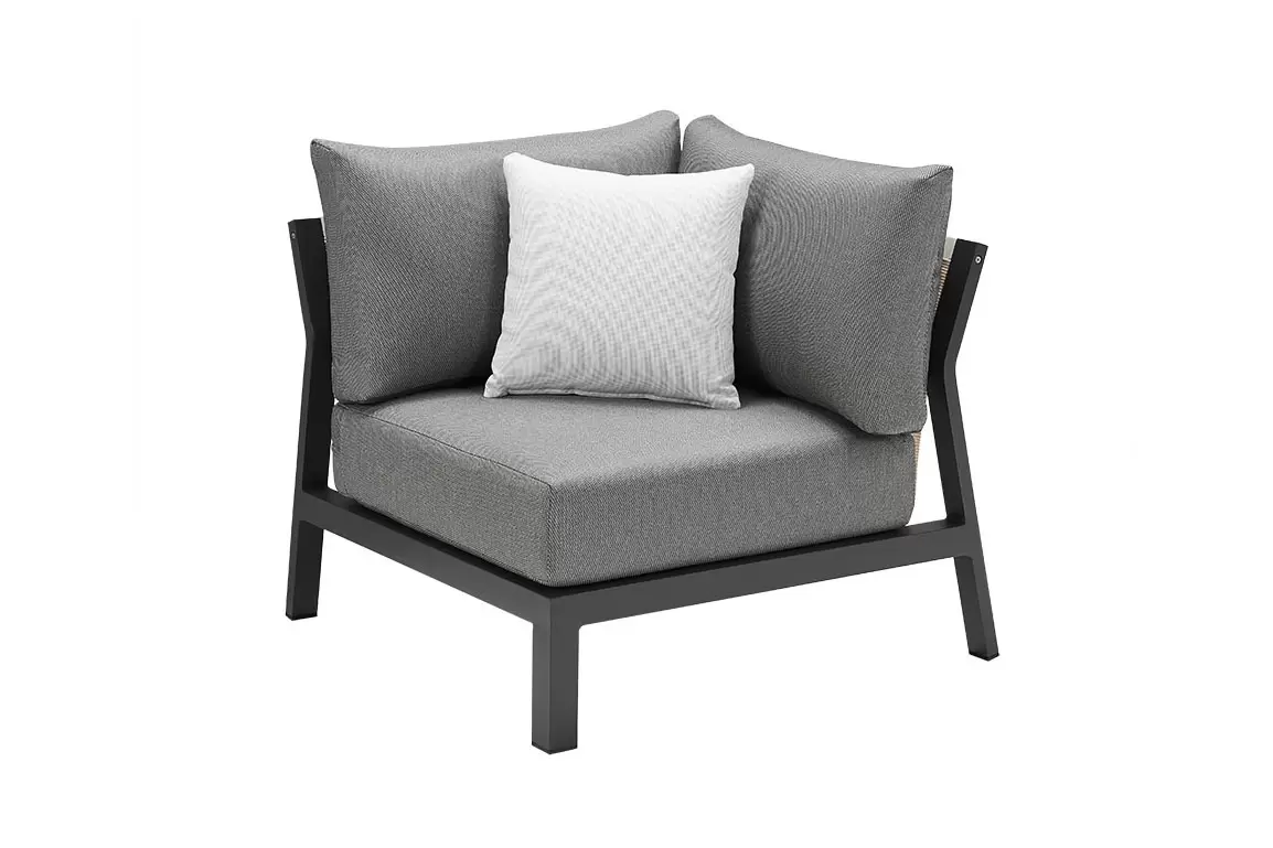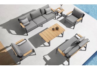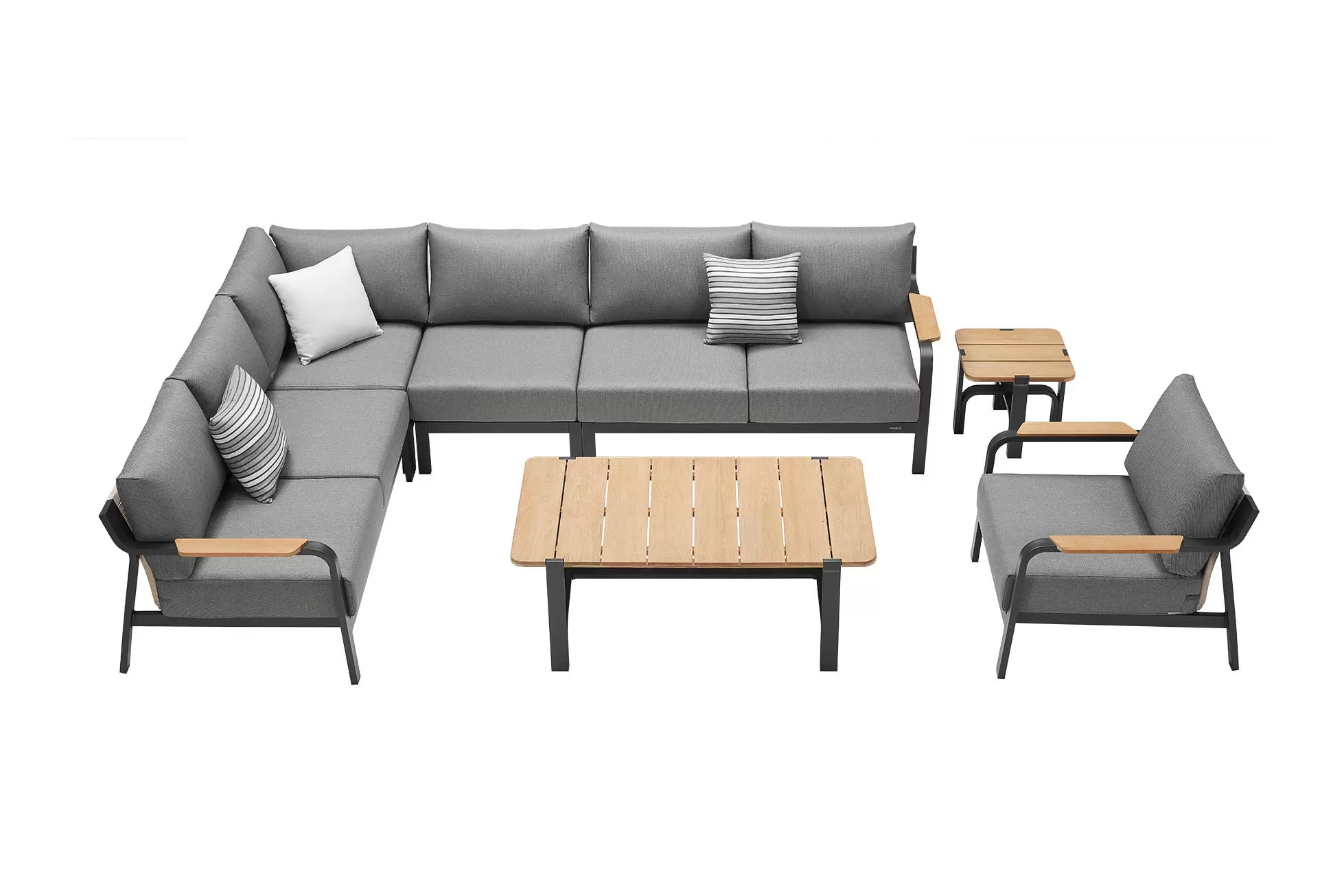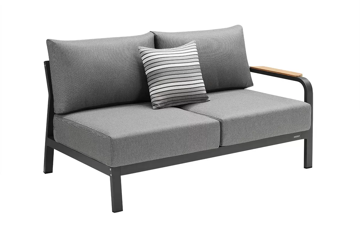 Zaprojektowany i wykonany z najwyższą jakością i detalami nowoczesny modułowy komplet narożnikowy na taras firmy HIGOLD. Konstrukcja opiera się na spawanej ramie aluminiowej malowanej proszkowo, elementach dekoracyjnych z teaku i wygodnych poduszek z obiciami z materiału Olefin. Oparcie oplecione wysokiej jakości beżową liną polipropylenową odporną zarówno na warunki atmosferyczne panujące w Polsce.