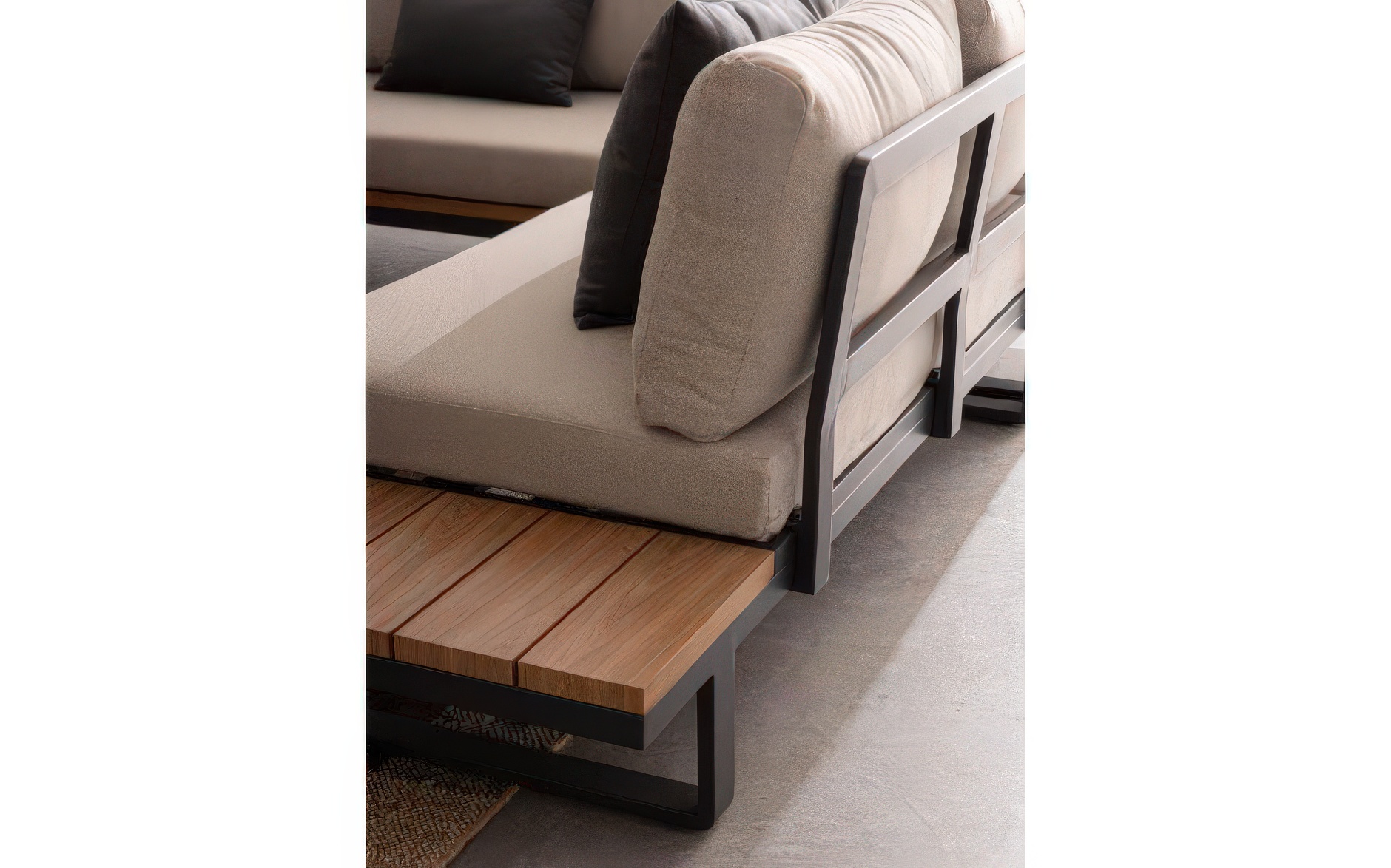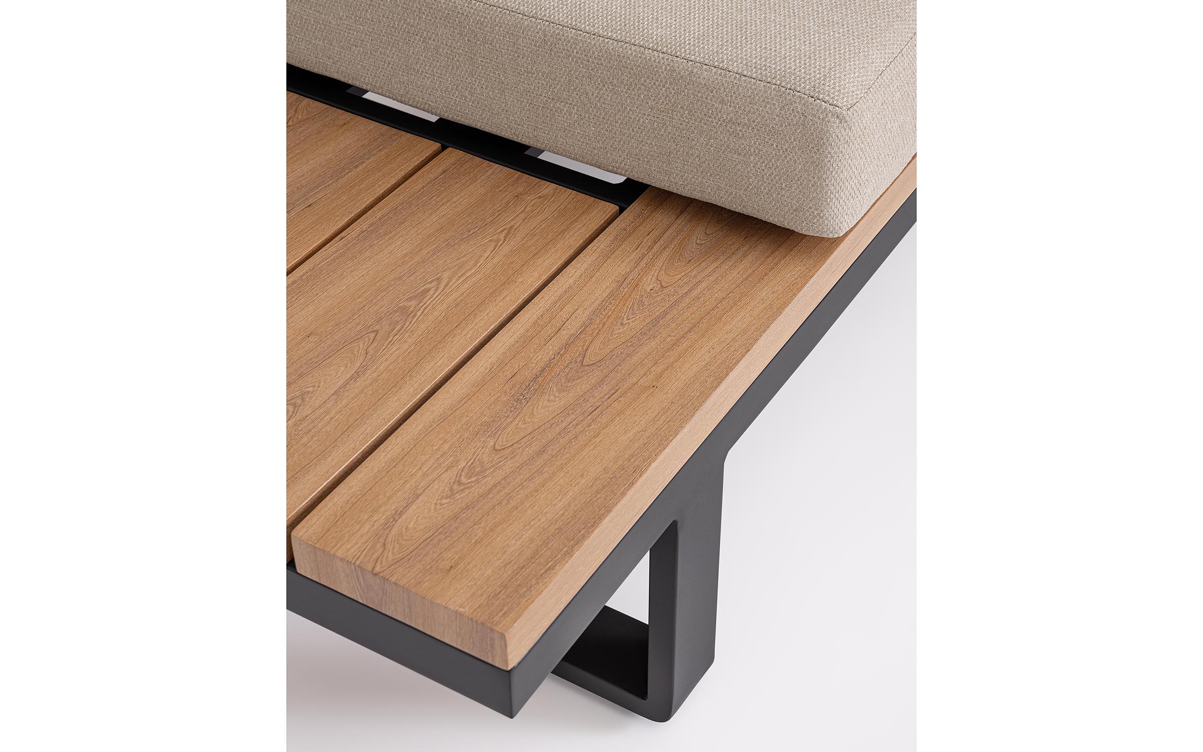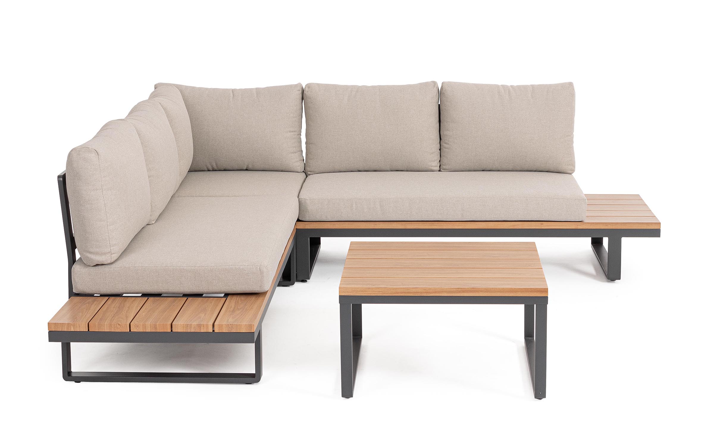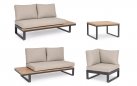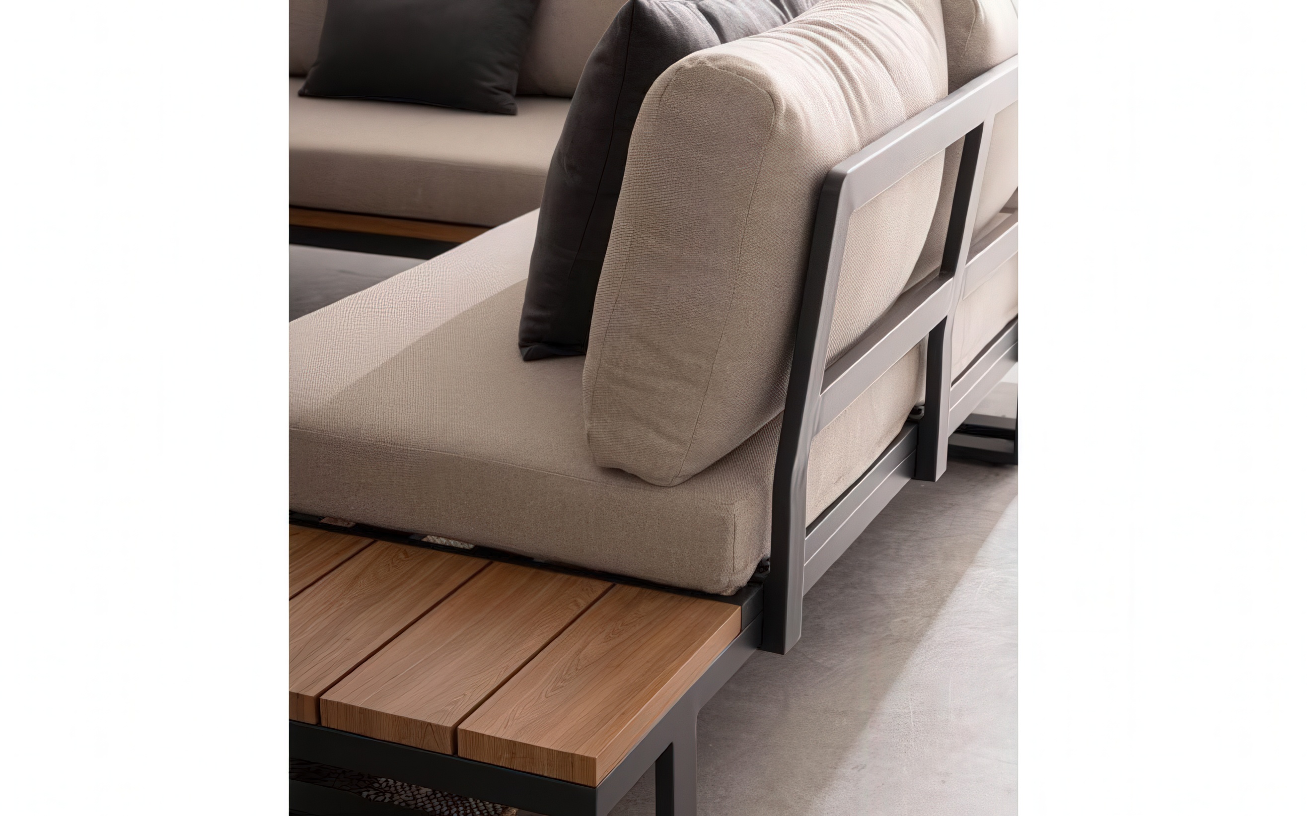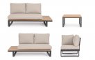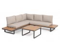 Narożnik ogrodowy aluminiowy o symetrycznych ramionach złożony z 3 elementów ze stolikiem kawowym. Blat stolika i blat platformy narożnika z aluminium z powłoką drewnopodobna.