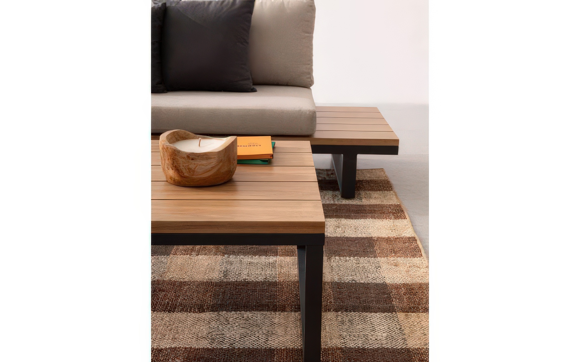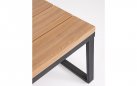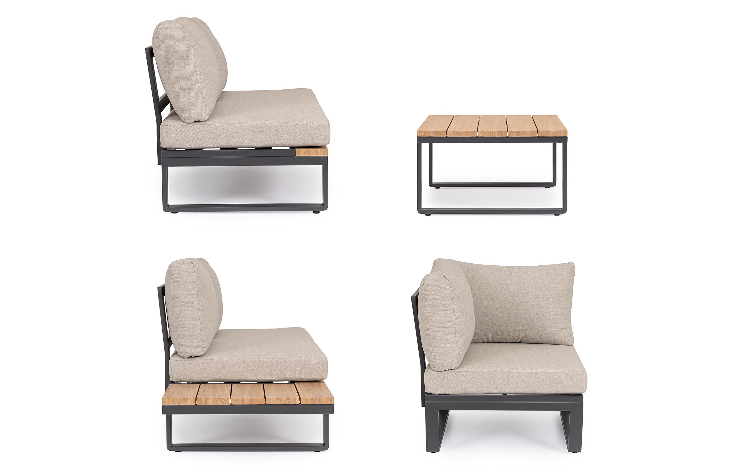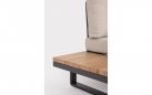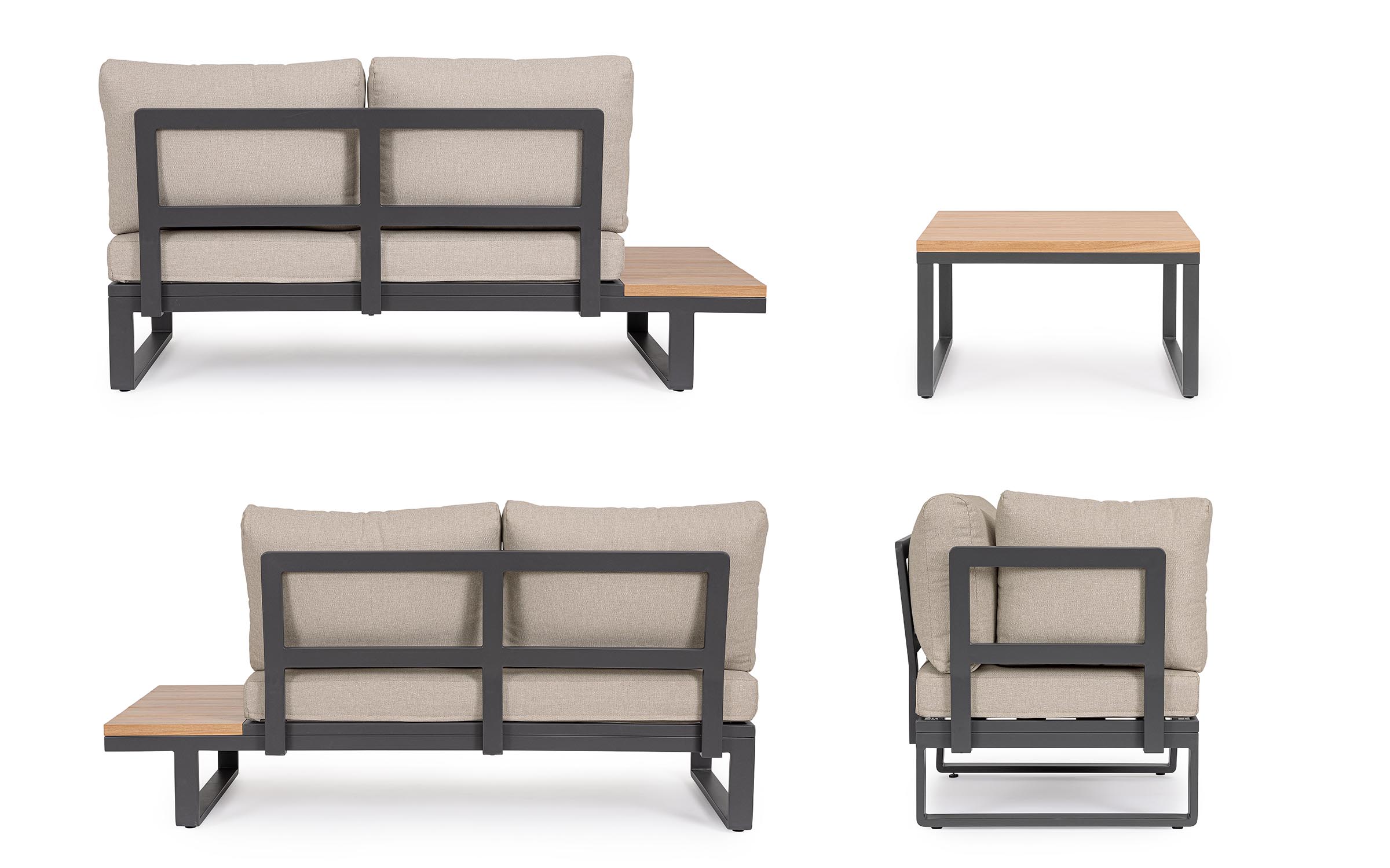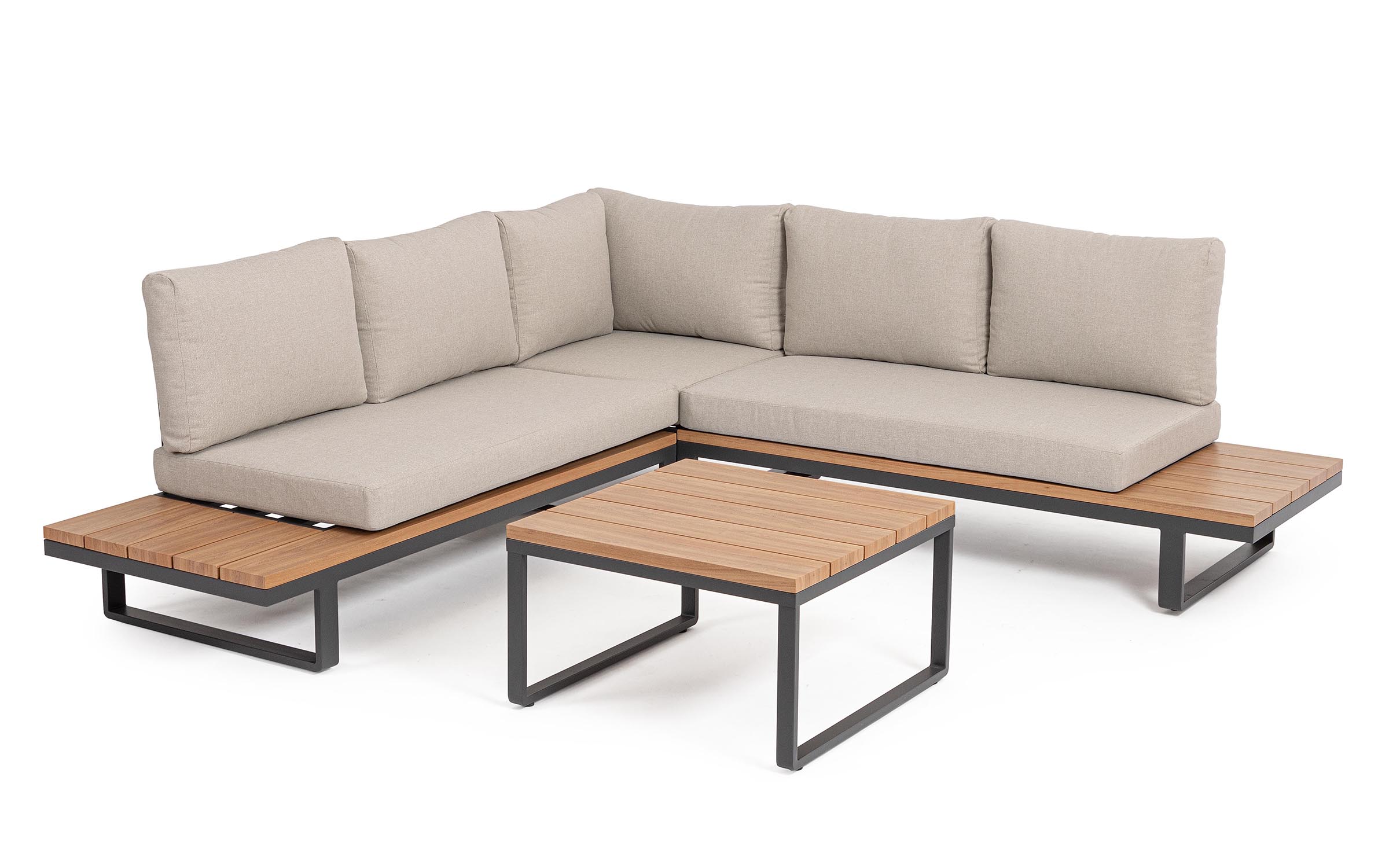 Narożnik ogrodowy aluminiowy o symetrycznych ramionach złożony z 3 elementów ze stolikiem kawowym. Blat stolika i blat platformy narożnika z aluminium z powłoką drewnopodobna.