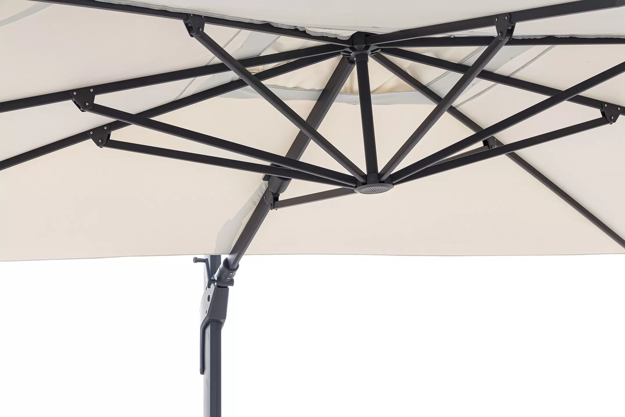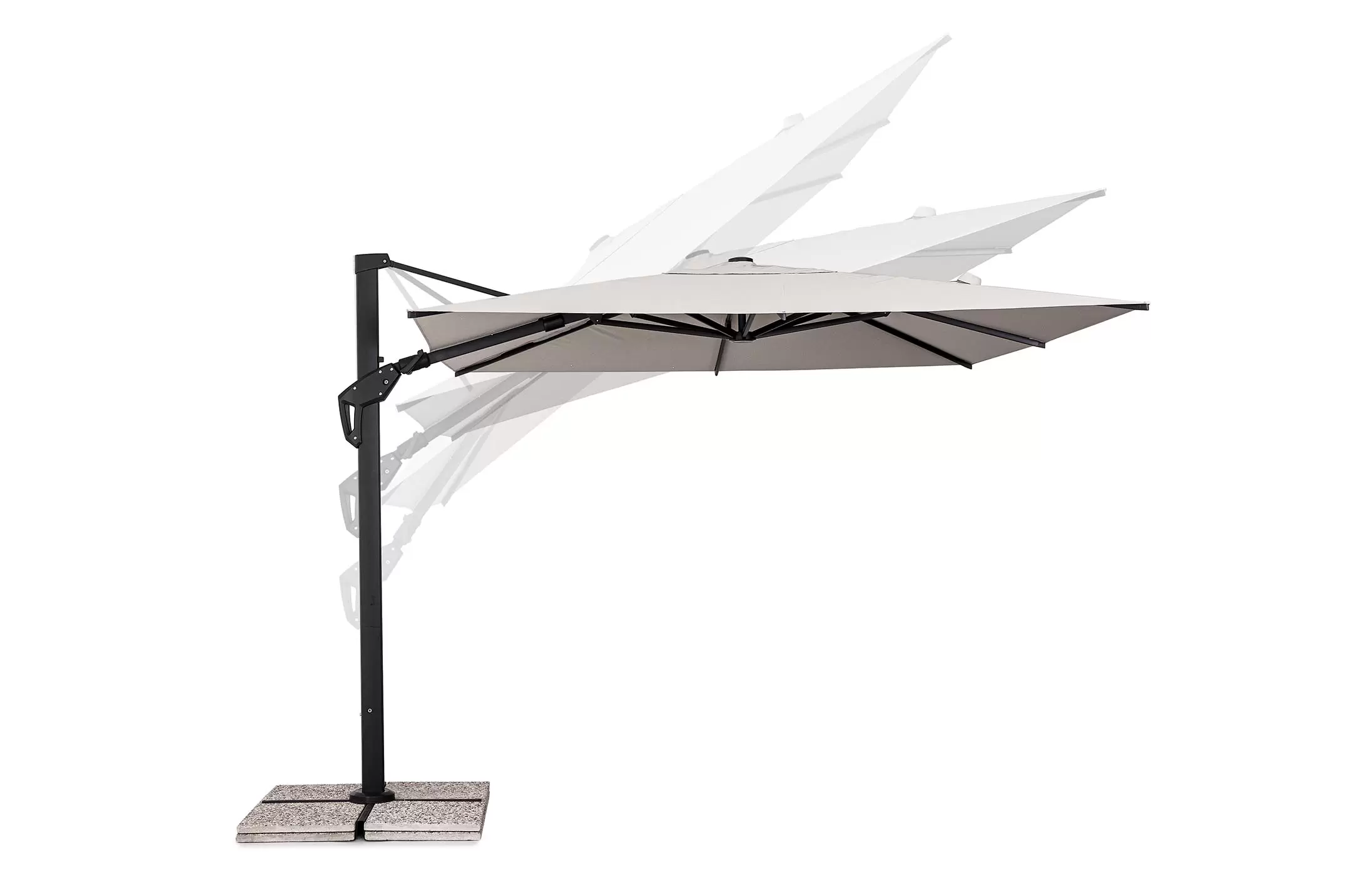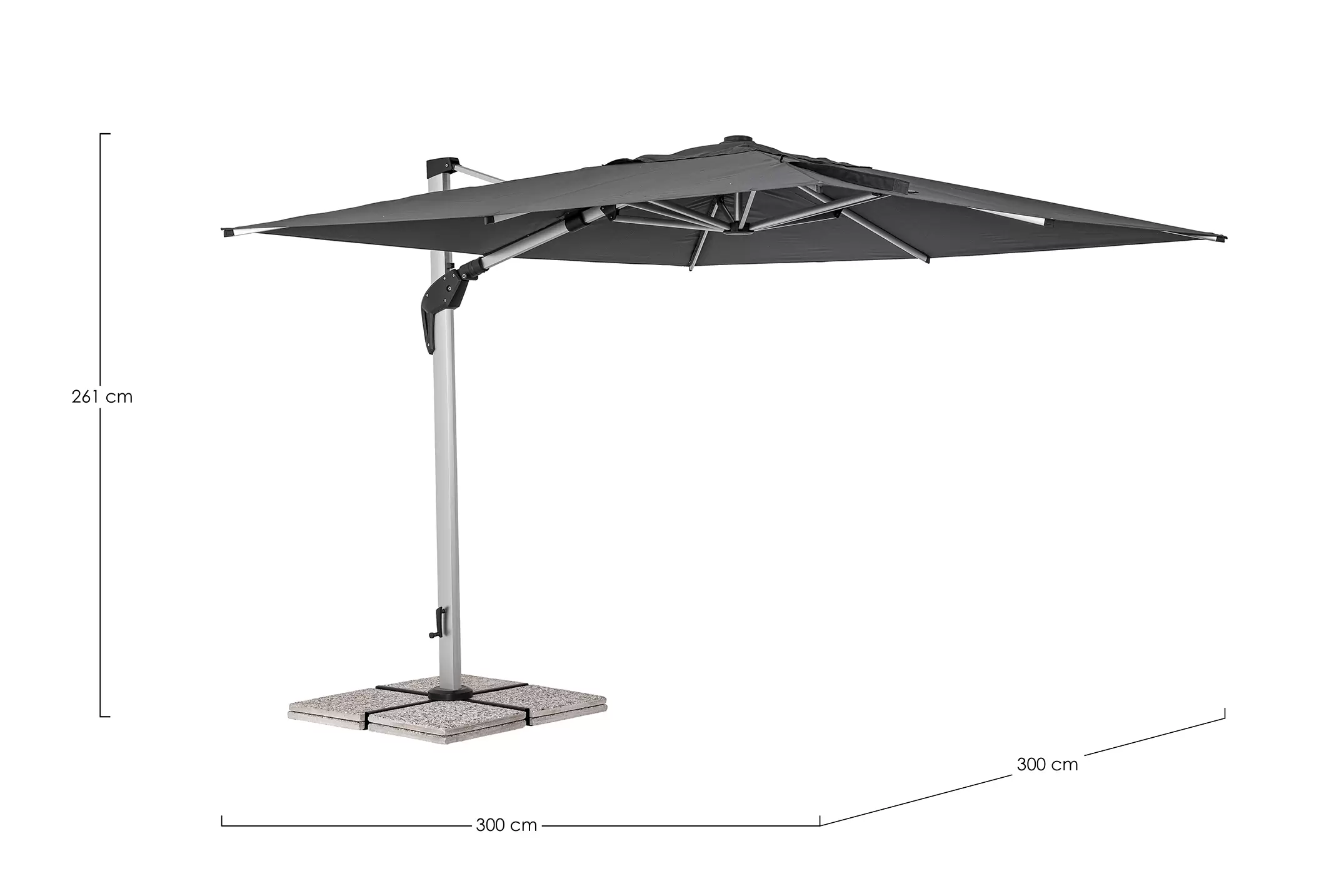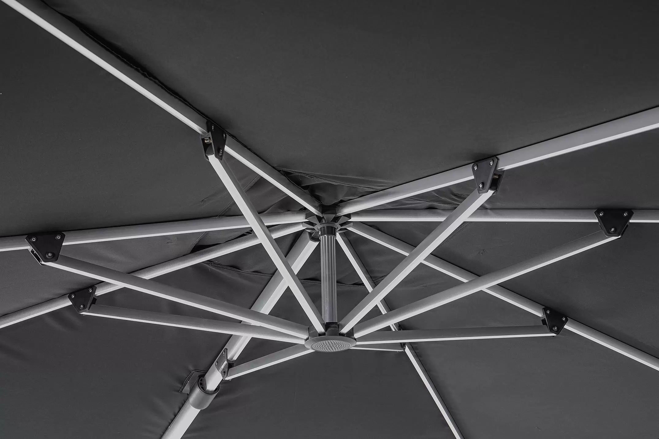 Parasol Ariel 3x3 to doskonała opcja zarówno do ogrodu, jak i na taras. Posiada on ramę wykonaną z aluminium i poszycie poliestrowe o gęstości 250 g/m2 rozpiętą na ramionach. Czasza parasola może być obrócona o 360° wokól osi pionowej słupa lub zmienić kąt płynnie w 2 płaszczyznach.