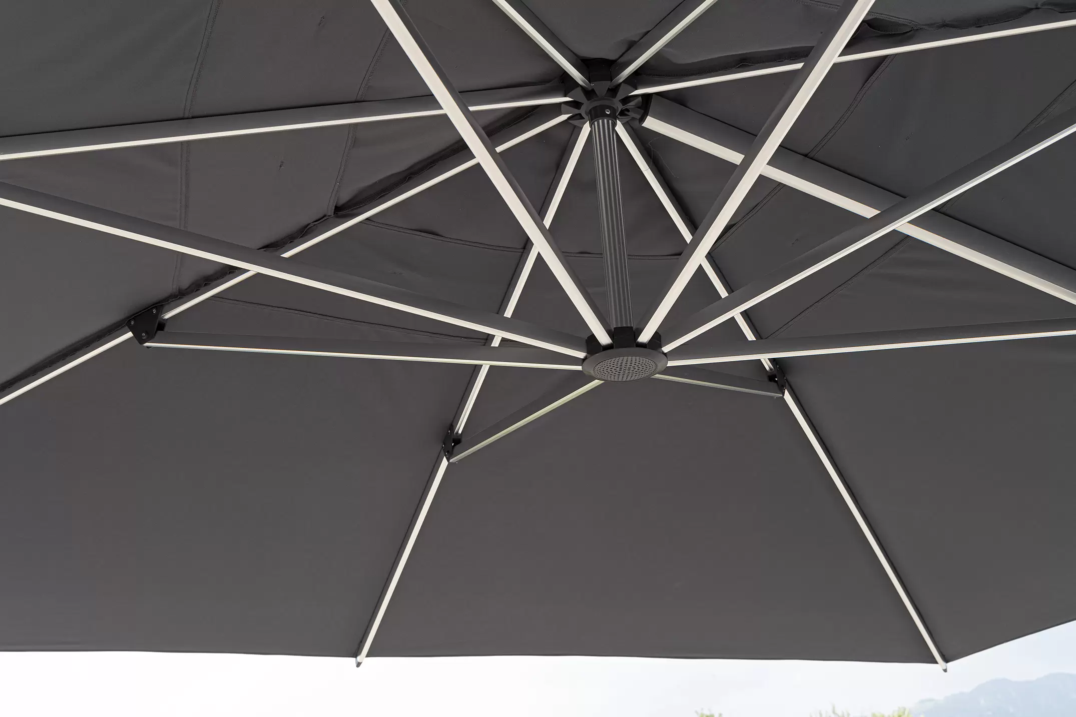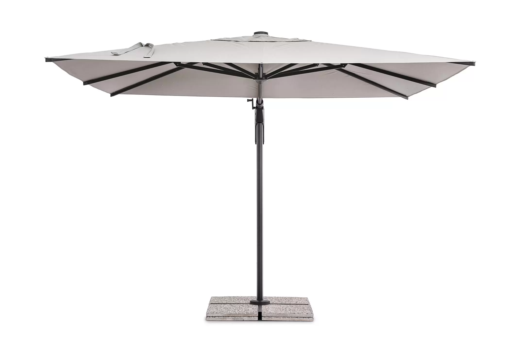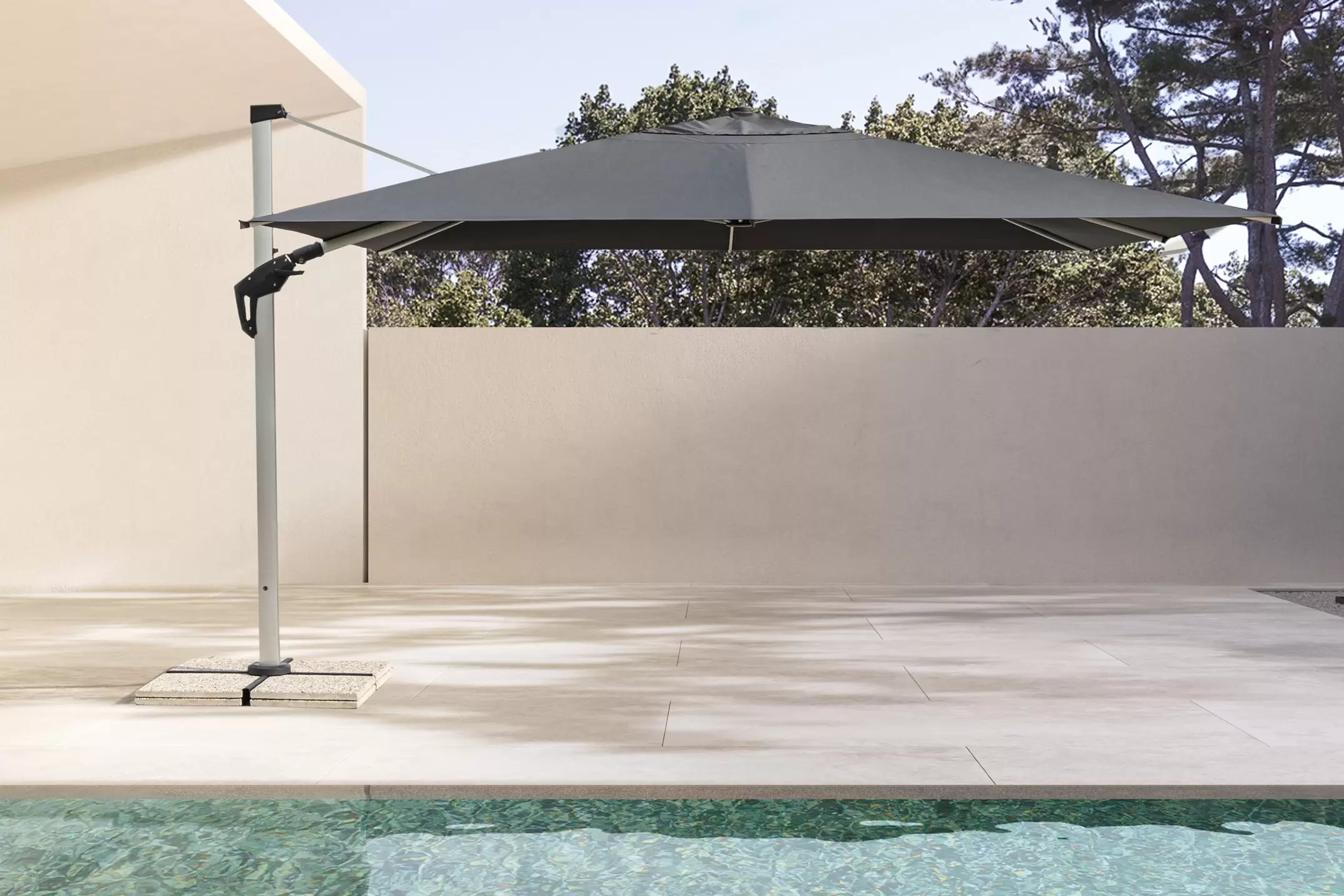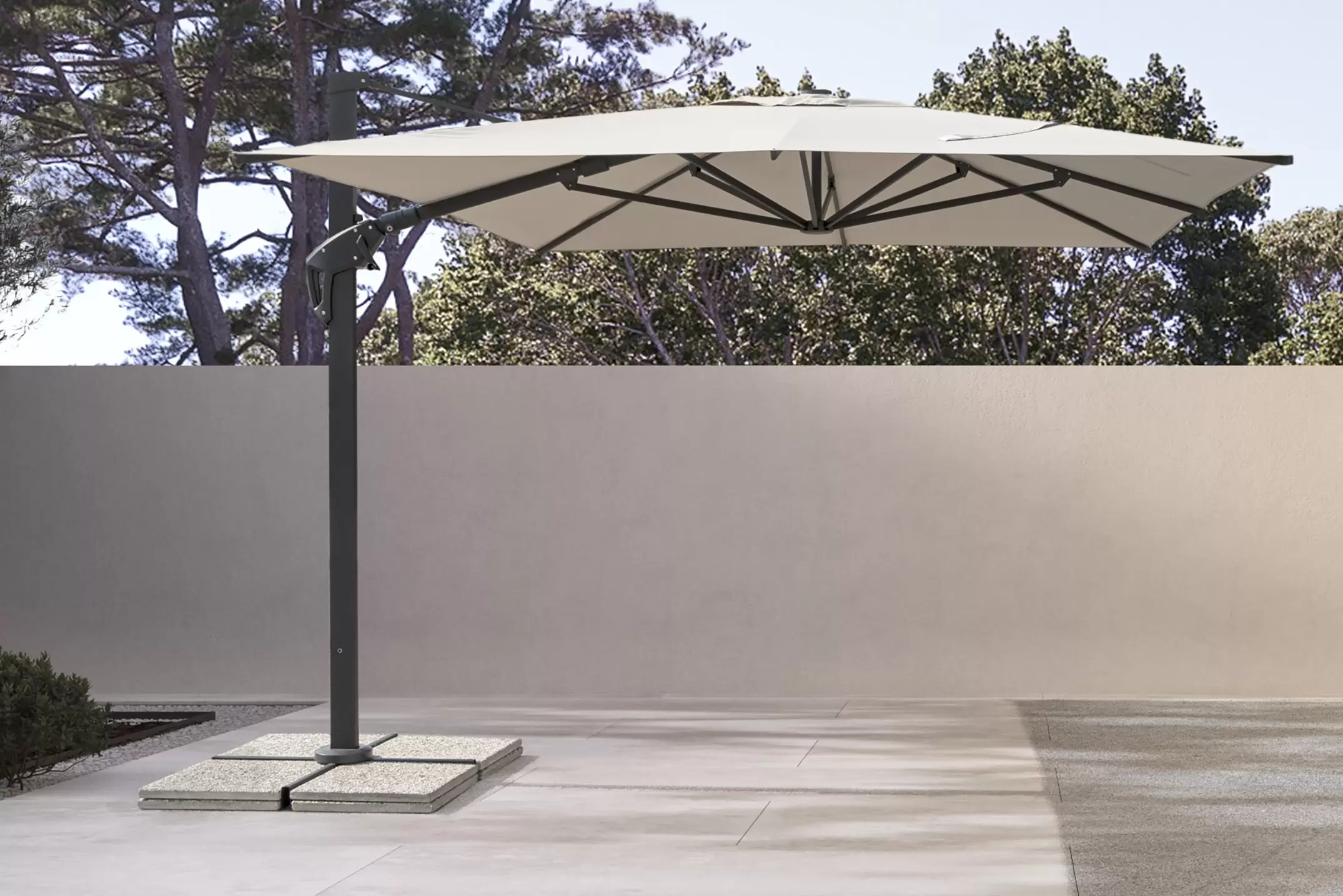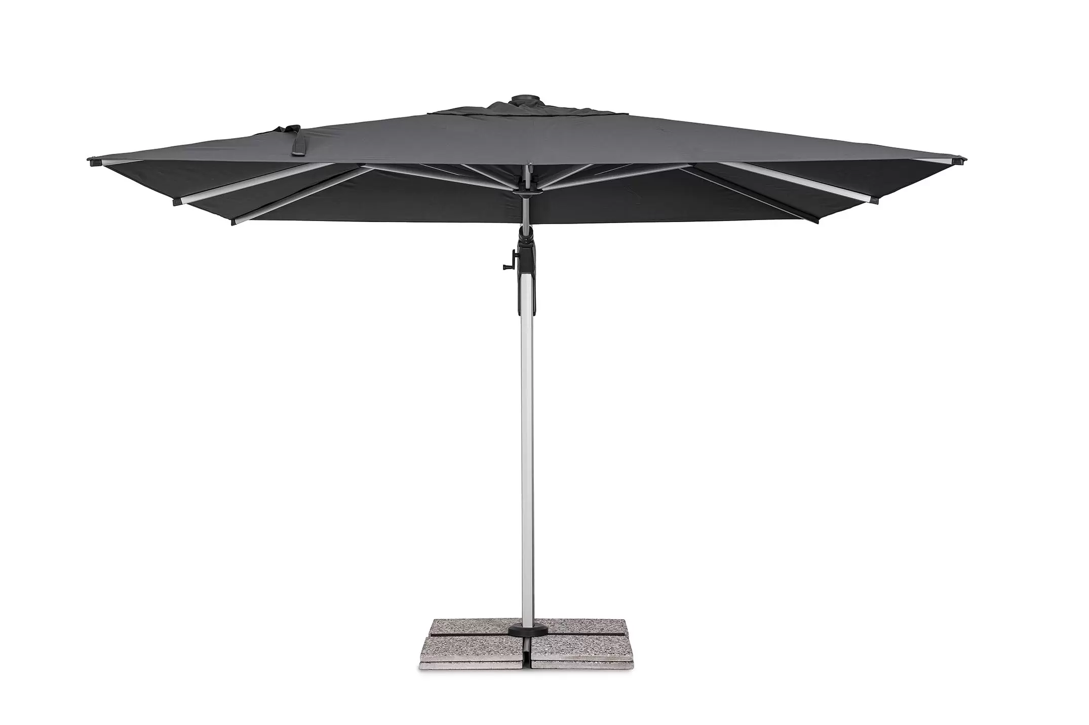 Parasol Ariel 3x3 to doskonała opcja zarówno do ogrodu, jak i na taras. Posiada on ramę wykonaną z aluminium i poszycie poliestrowe o gęstości 250 g/m2 rozpiętą na ramionach. Czasza parasola może być obrócona o 360° wokól osi pionowej słupa lub zmienić kąt płynnie w 2 płaszczyznach.