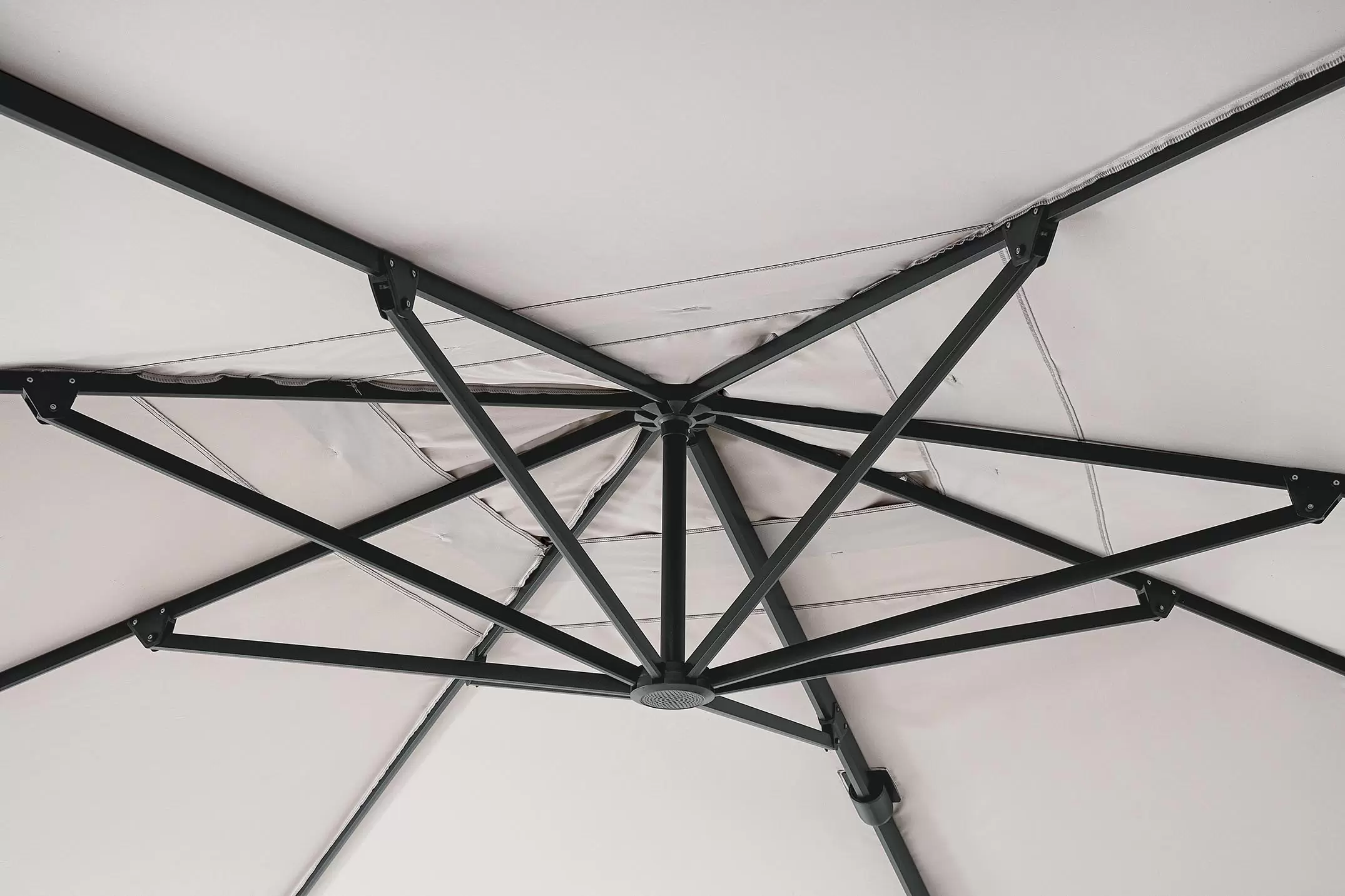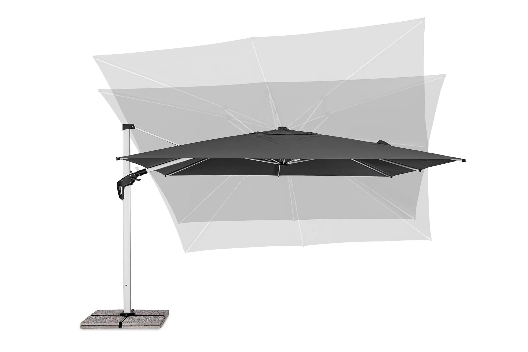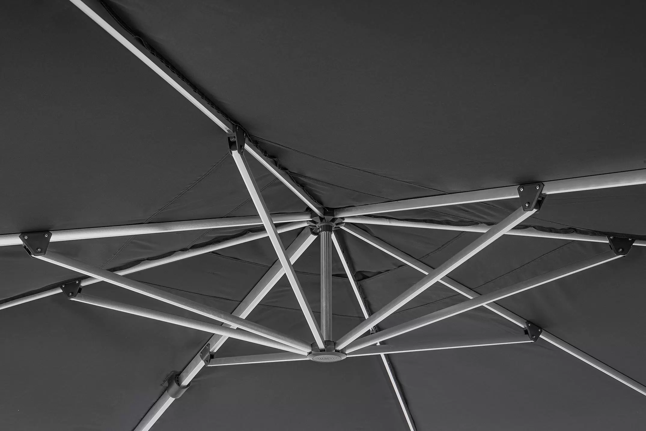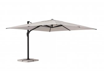 Parasol Ariel 3x3 to doskonała opcja zarówno do ogrodu, jak i na taras. Posiada on ramę wykonaną z aluminium i poszycie poliestrowe o gęstości 250 g/m2 rozpiętą na ramionach. Czasza parasola może być obrócona o 360° wokól osi pionowej słupa lub zmienić kąt płynnie w 2 płaszczyznach.
