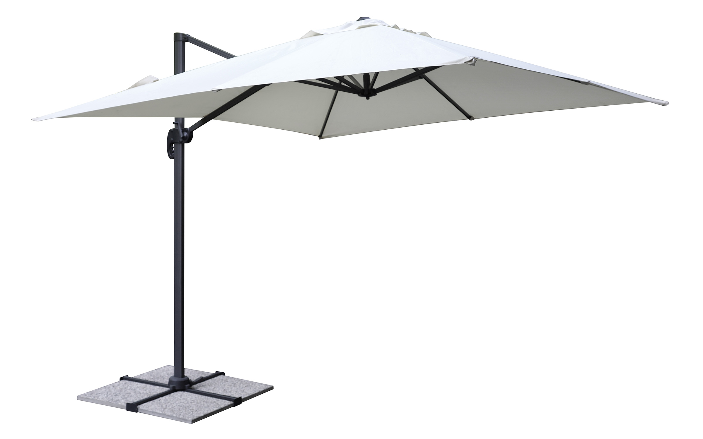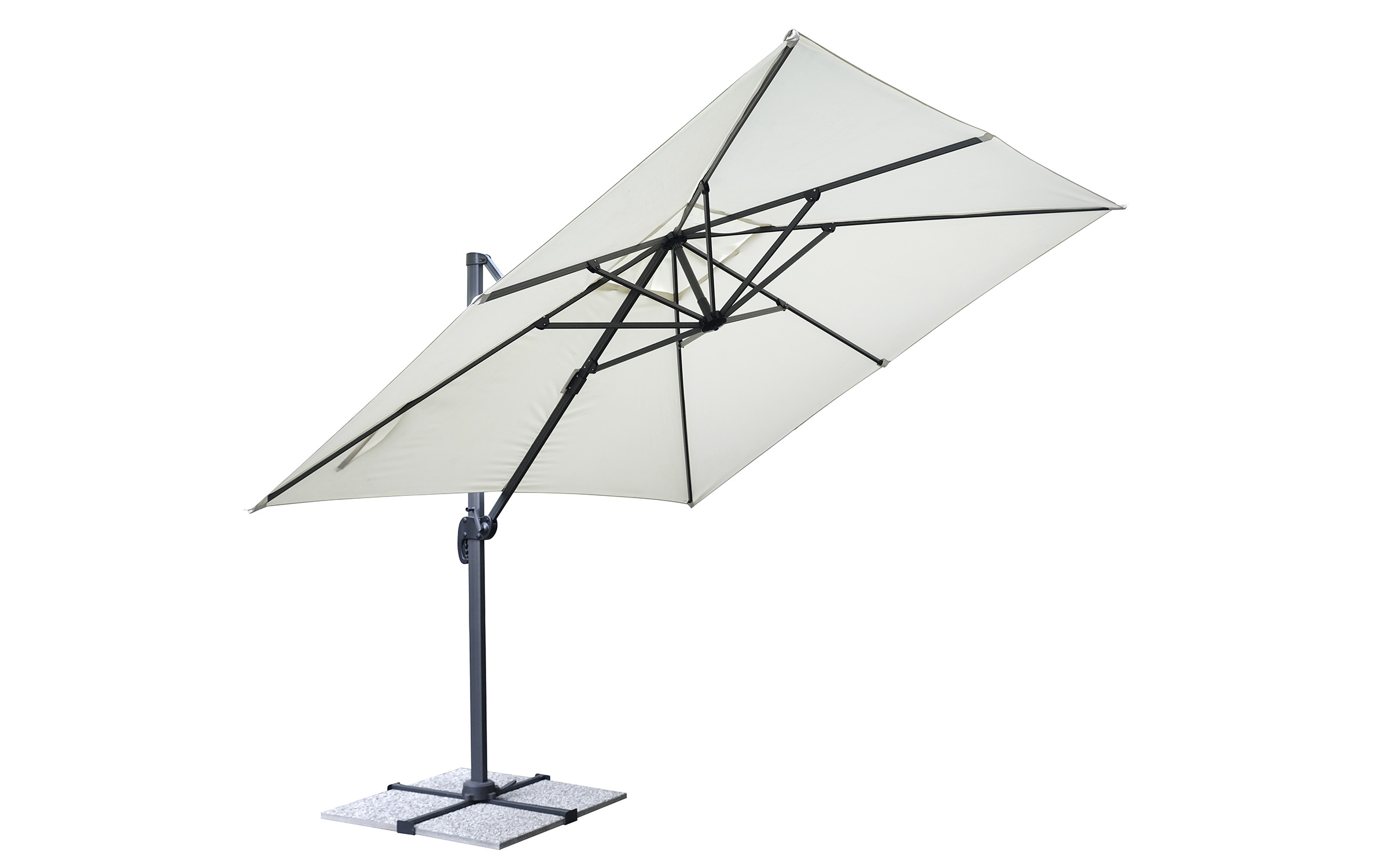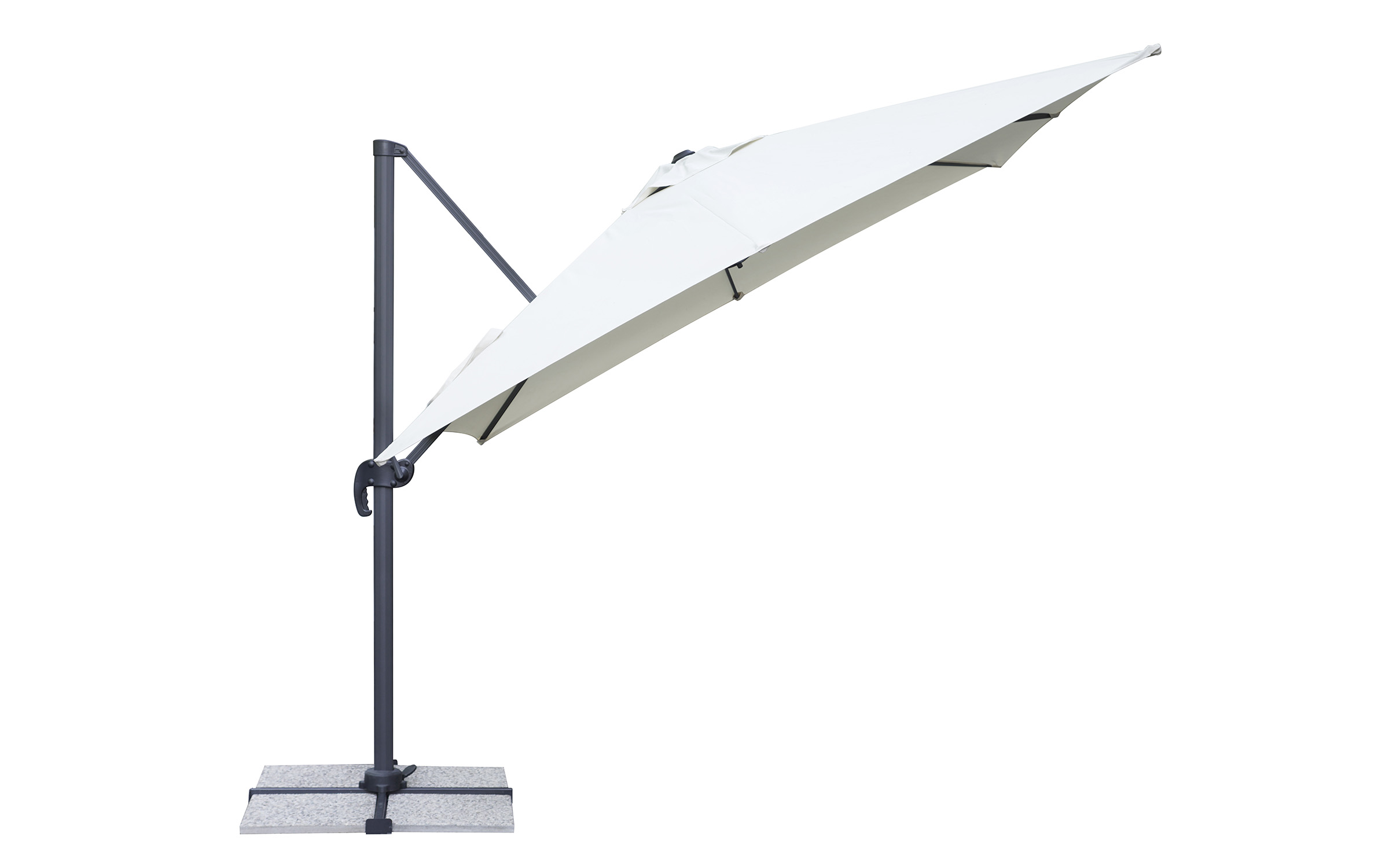 Parasol ogrodowy BATISTA to elegancki model o wymiarach 3×4 m, idealny do ochrony przed słońcem na tarasie, balkonie lub w ogrodzie. Konstrukcja wykonana z aluminium malowanego proszkowo w kolorze antracyt, z poszyciem z tkaniny poliestrowej ecru.