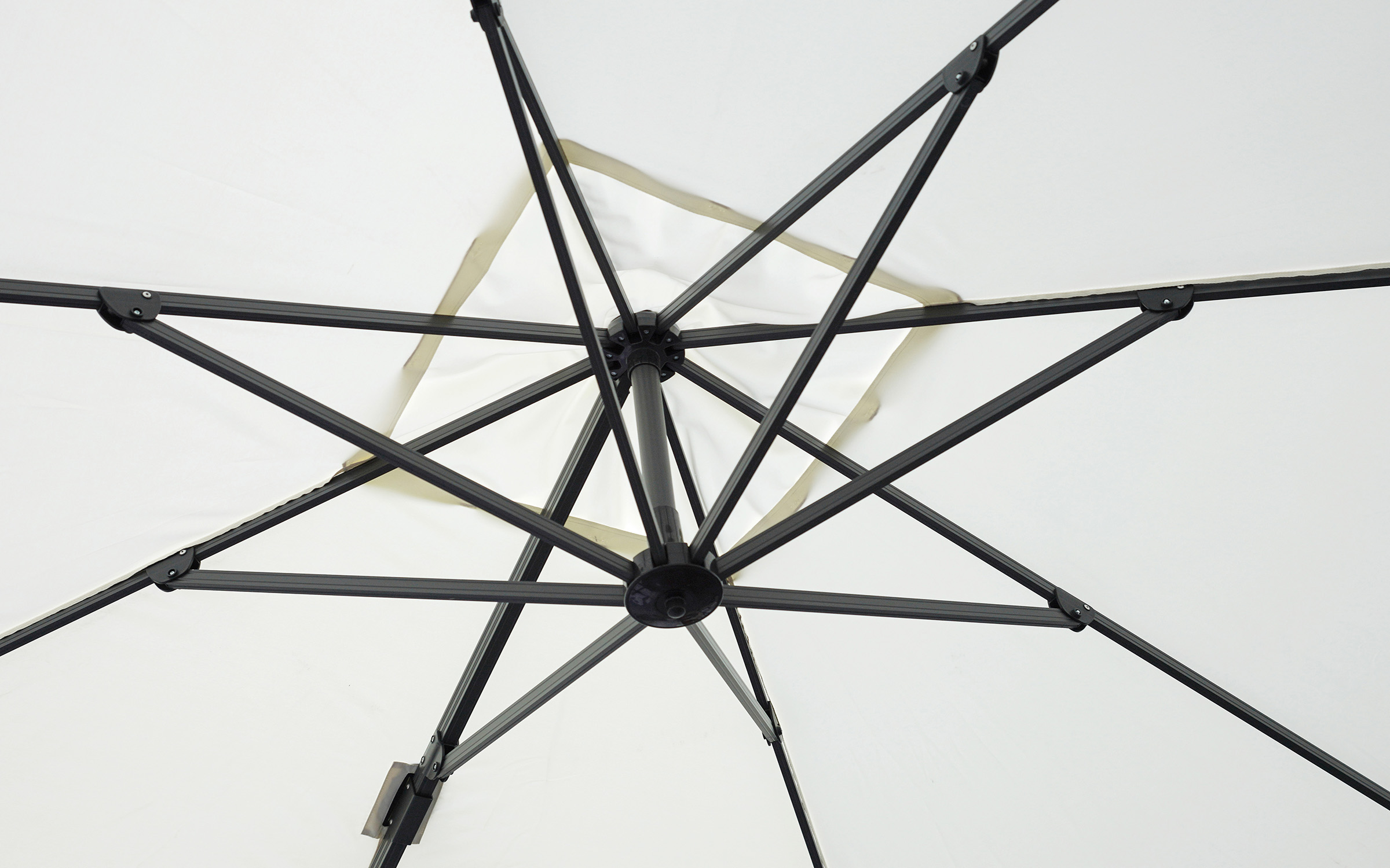 Stelaż wykonany z aluminium malowanego proszkowo (palo 48 mm, 8 żeber 18×28 mm). Poszycie z poliestrowej tkaniny ecru o gramaturze 180 g/m². Wyposażony w system korbowy oraz wentylację przeciwwiatrową.