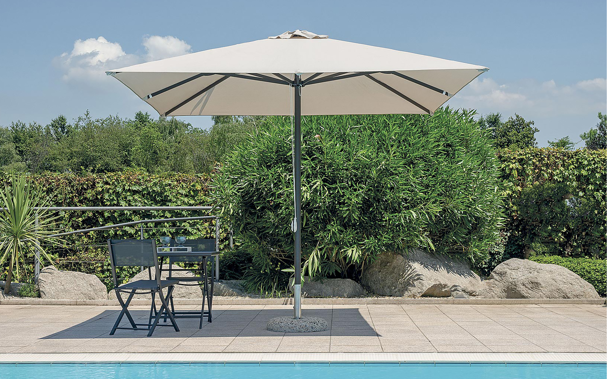 Parasol ogrodowy BORA to solidny model z kolekcji Greenwood, produkowanej przez włoską firmę MOIA. Konstrukcja nogi wykonana z aluminium malowanego proszkowo w kolorze białym, poszycie dostępne w dwóch wariantach: akryl 300 g/m² lub Olefin 190 g/m². Parasol wyposażony w komin przeciwwiatrowy, 8 profili aluminiowych o przekroju 18 × 28 mm oraz system otwierania na podwójny, bloczkiem z blokadą. Możliwość zamówienia z falbaną lub bez. Idealny do ogrodu, tarasu, restauracji lub hotelu.