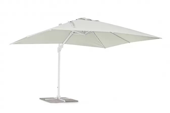 Parasol Eden 3x3 to doskonała opcja zarówno do ogrodu, jak i na taras. Posiada on ramę wykonaną z aluminium malowaną proszkowo na kolor biały i poszycie poliestrowe o gęstości 250 g/m2 pokryte PA (poliamidem) rozpięte na ramionach.