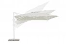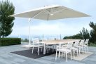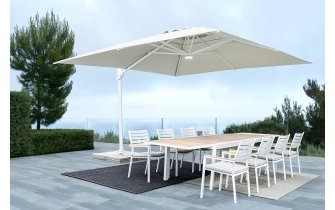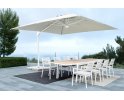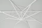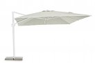 Parasol Eden 3x3 to doskonała opcja zarówno do ogrodu, jak i na taras. Posiada on ramę wykonaną z aluminium malowaną proszkowo na kolor biały i poszycie poliestrowe o gęstości 250 g/m2 pokryte PA (poliamidem) rozpięte na ramionach.
