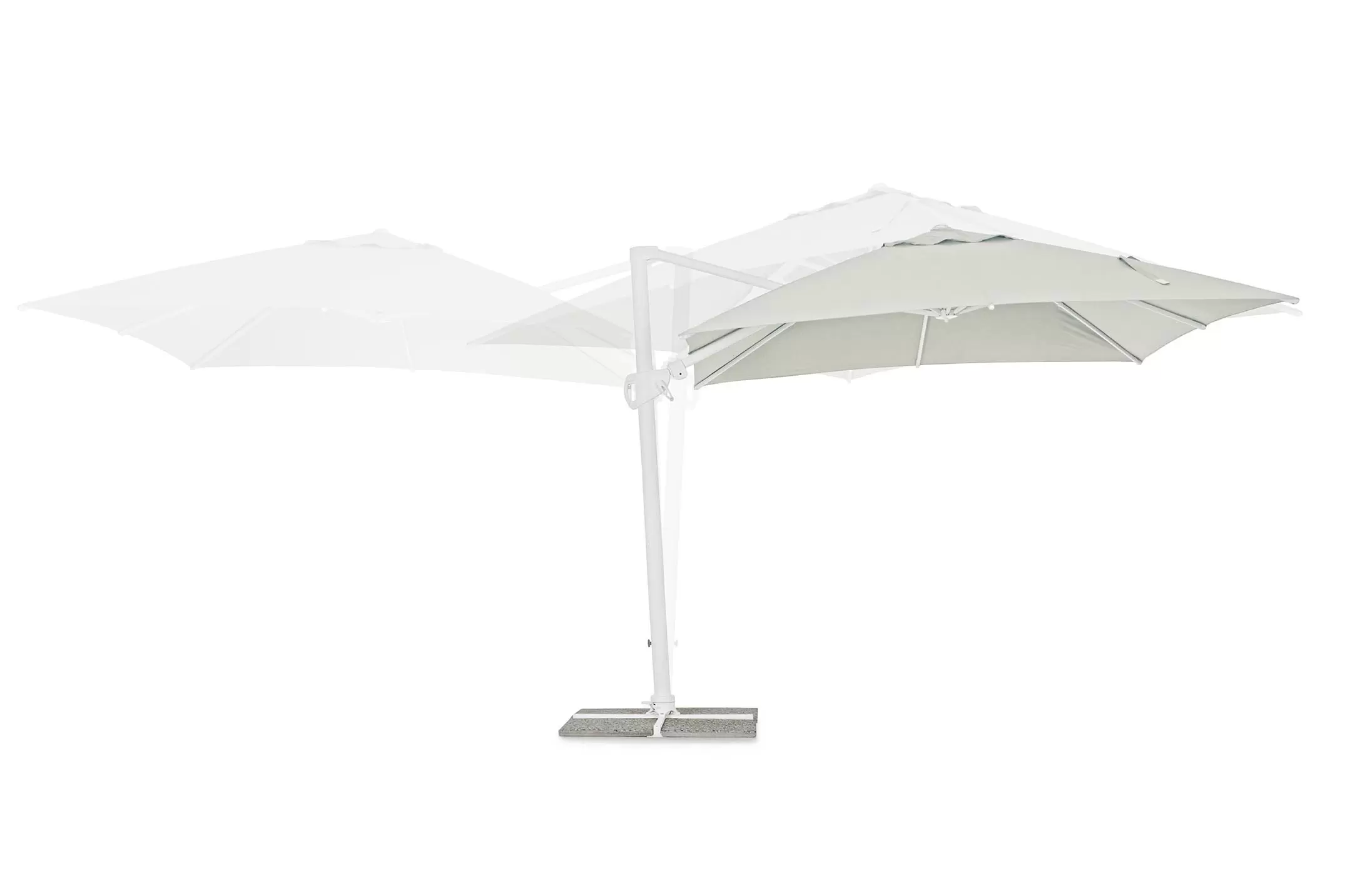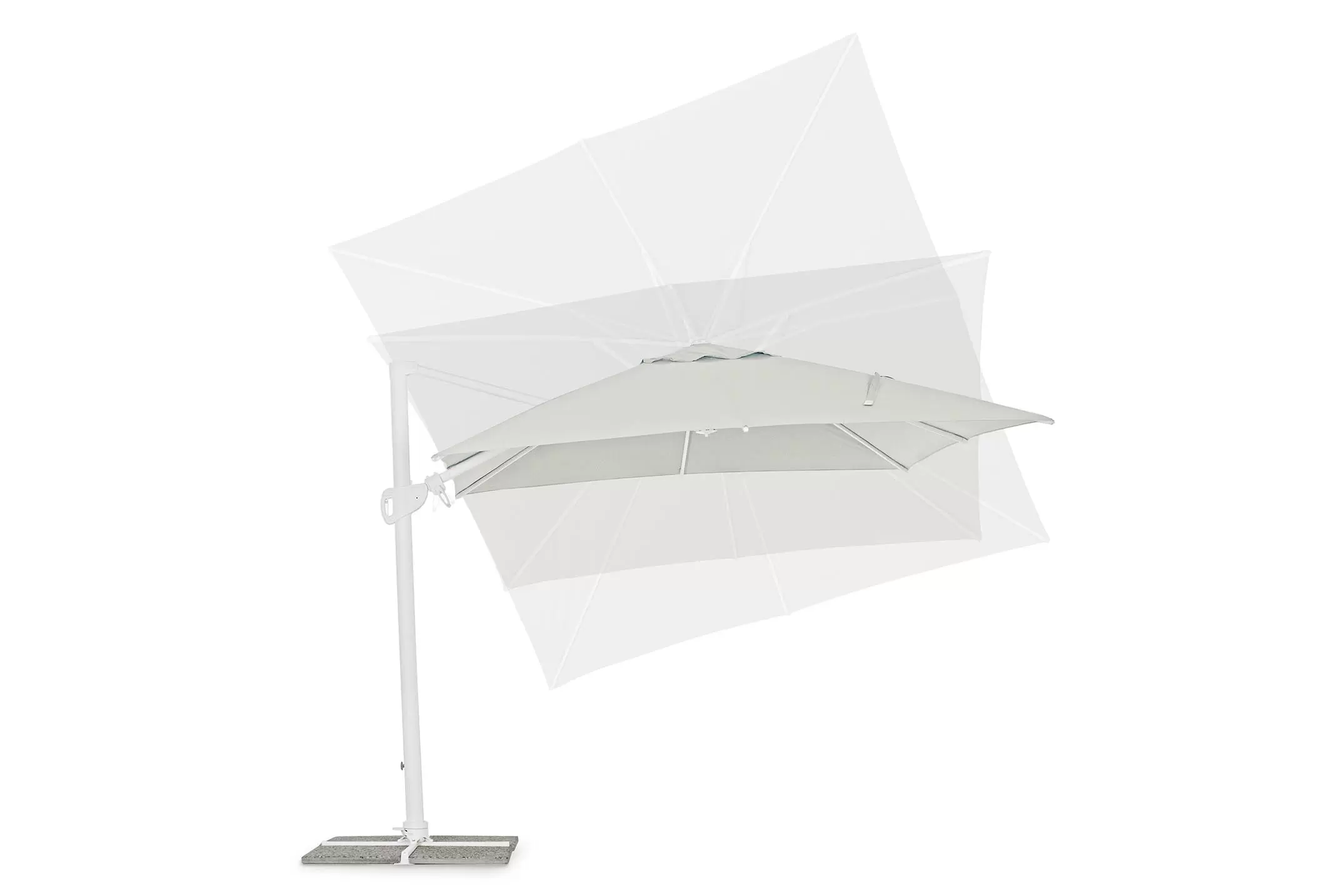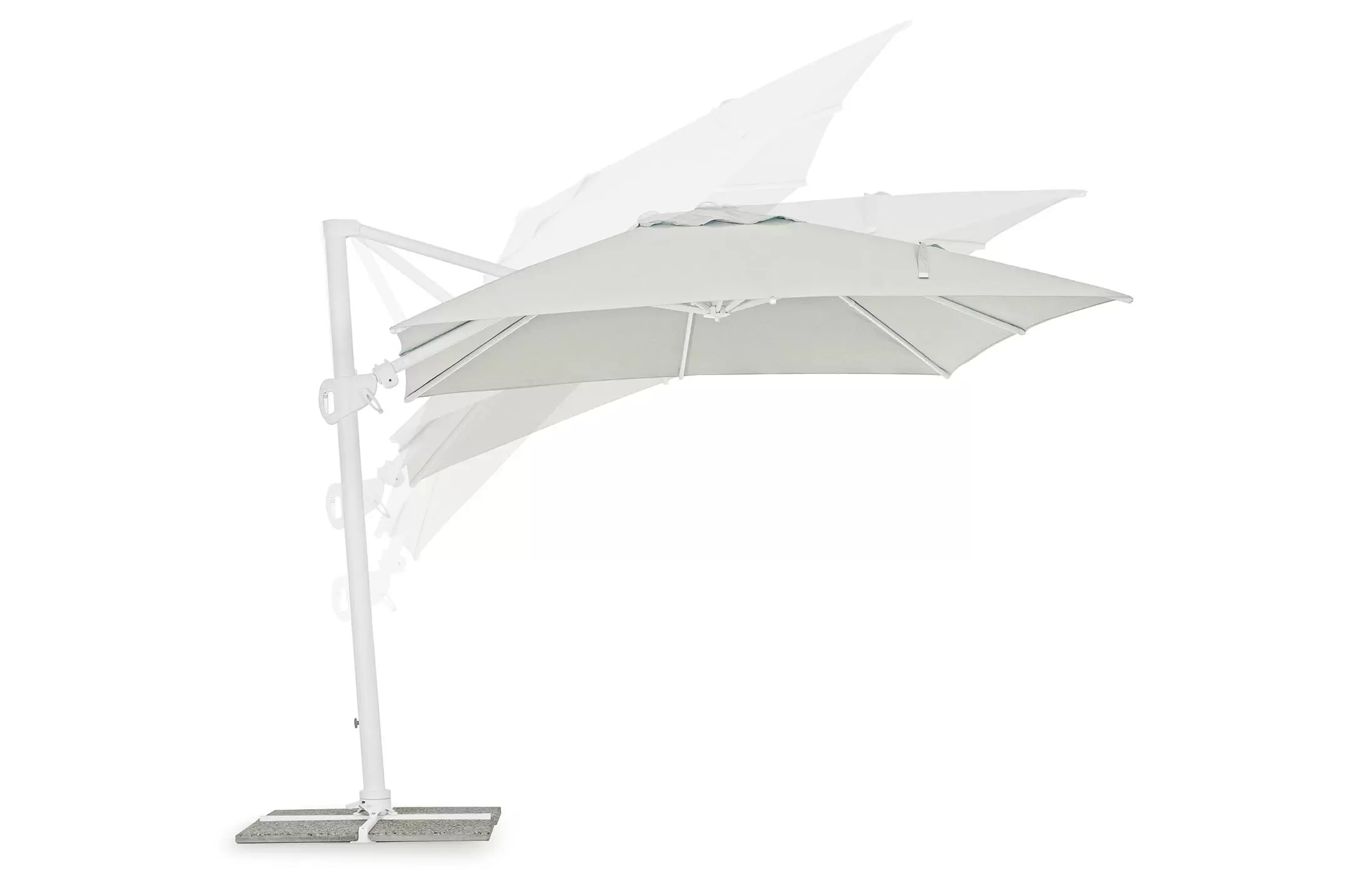 Czasza parasola może być obrócona o 360° wokól osi pionowej słupa lub zmienić kąt w 2 płaszczyznach : podnoszenie (6 pozycji) oraz płynne pochylanie na prawo/lewo.