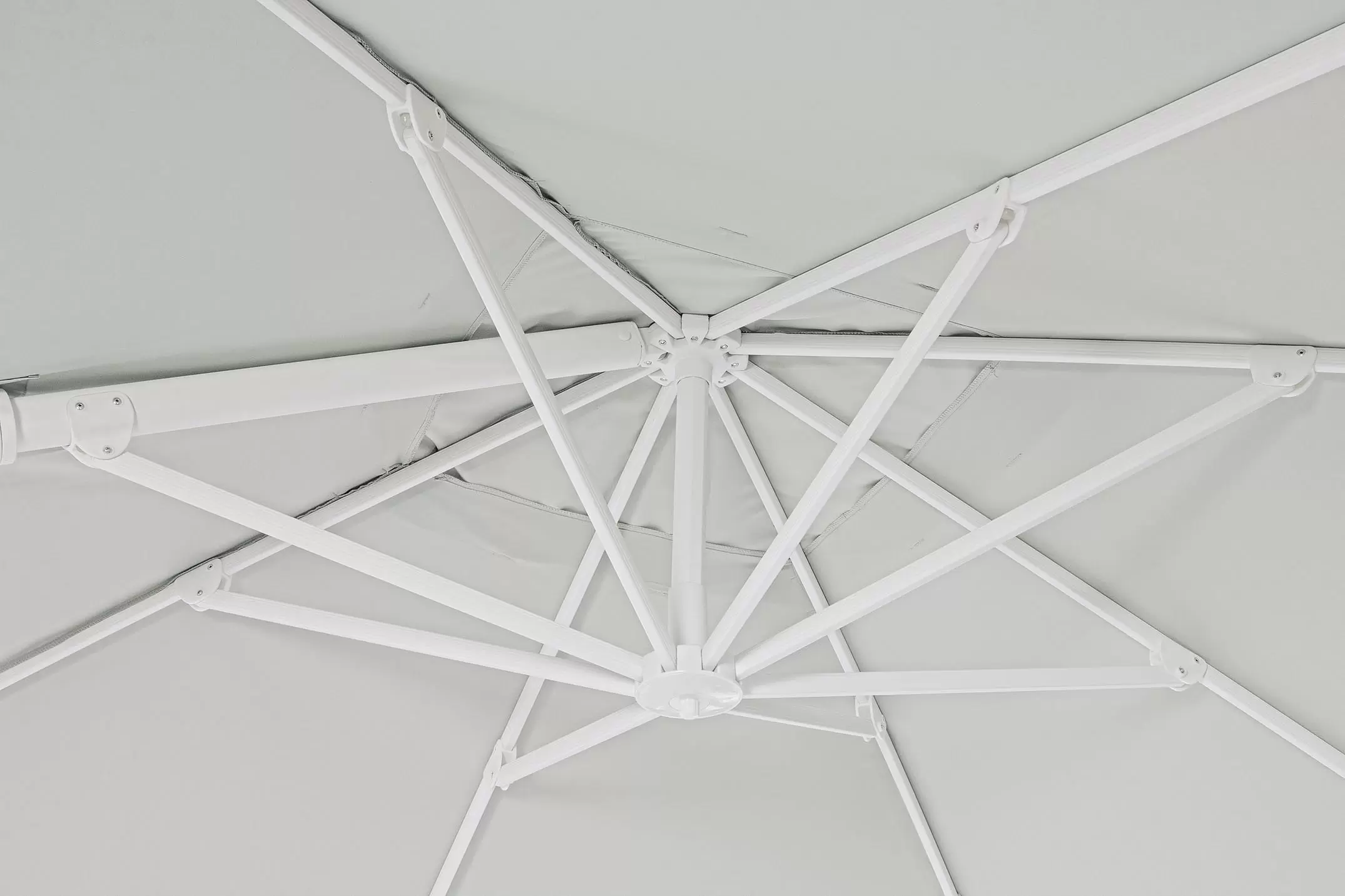 Konstrukcja aluminiowa malowana proszkowo na kolor biały. Słup główny 90x60 mm. 8 żeber 25x17 mm.
