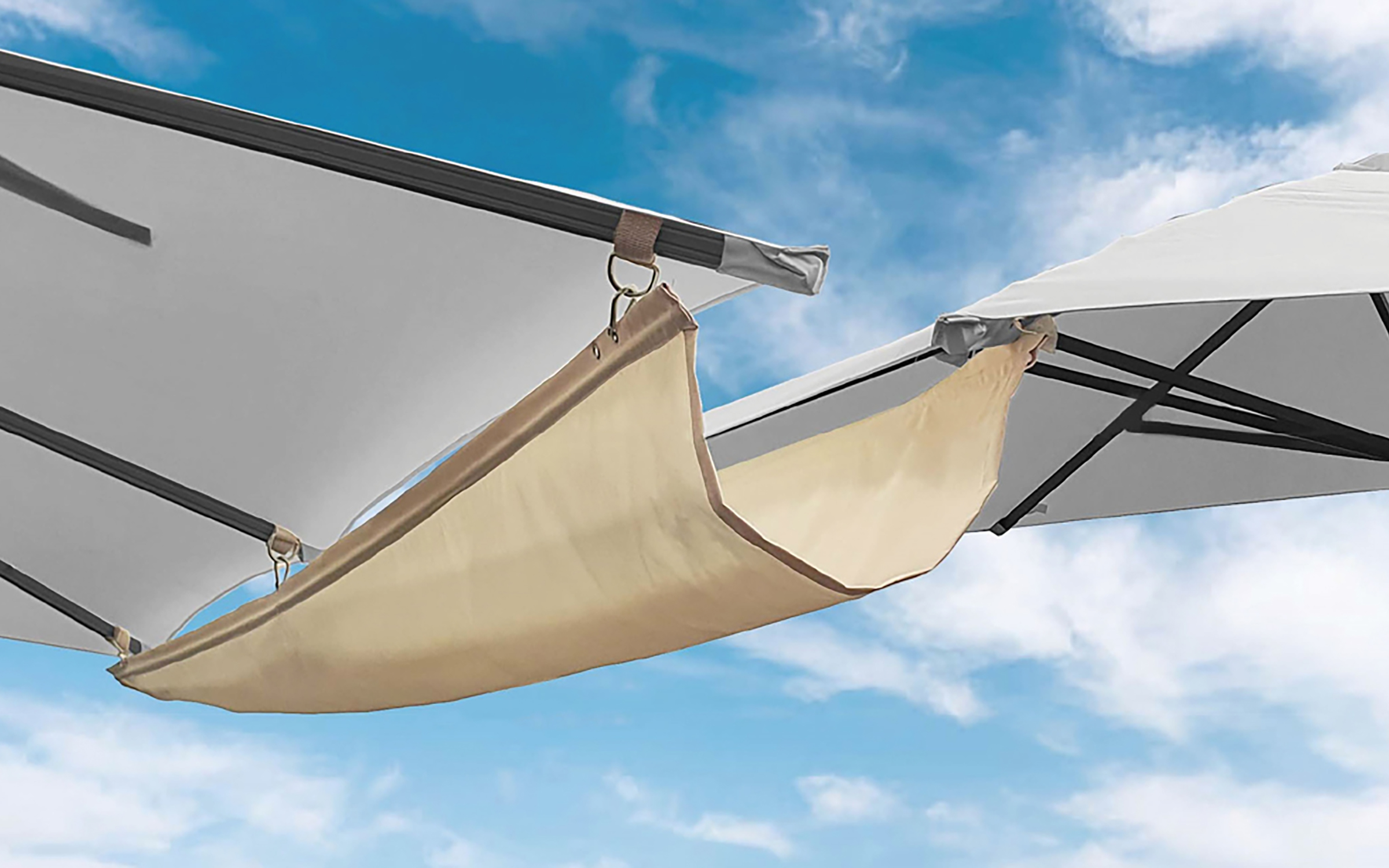 Rynna GRONDAIA to praktyczne akcesorium do parasoli ogrodowych Greenwood, produkowane przez włoską firmę MOIA. Umożliwia połączenie dwóch parasoli o szerokości 3 m, tworząc jednolitą osłonę przed deszczem. Mocowana między czaszami, zapobiega spływaniu wody w przestrzeni między parasolami. Dostępna w kolorach poszyć akrylowych, Olefin i Tempotest.