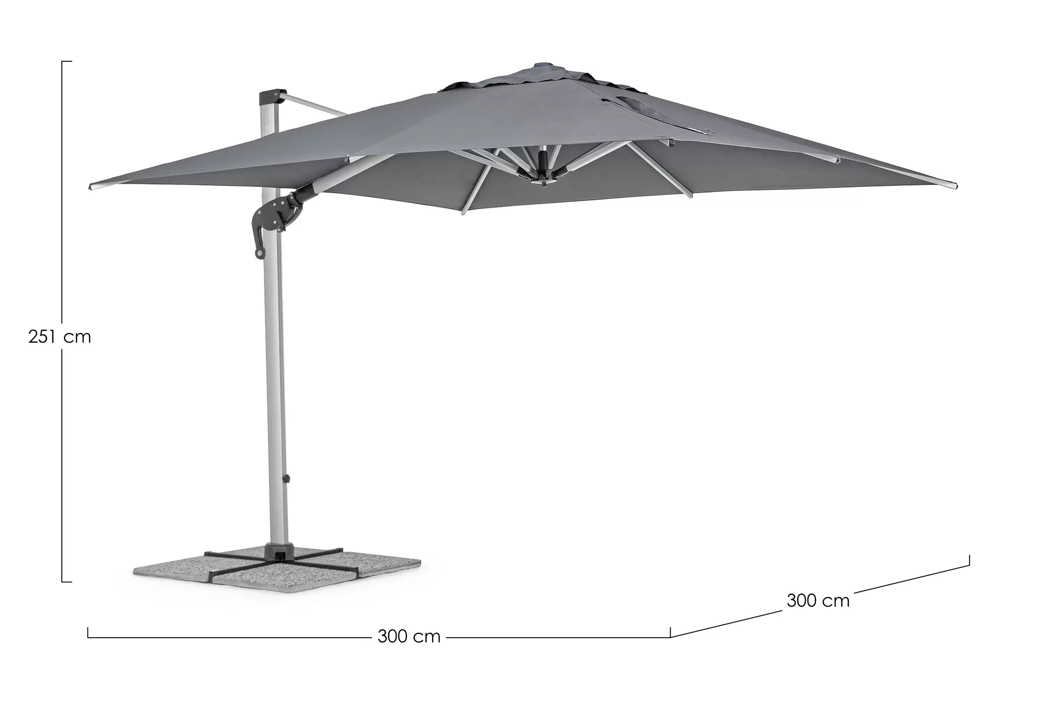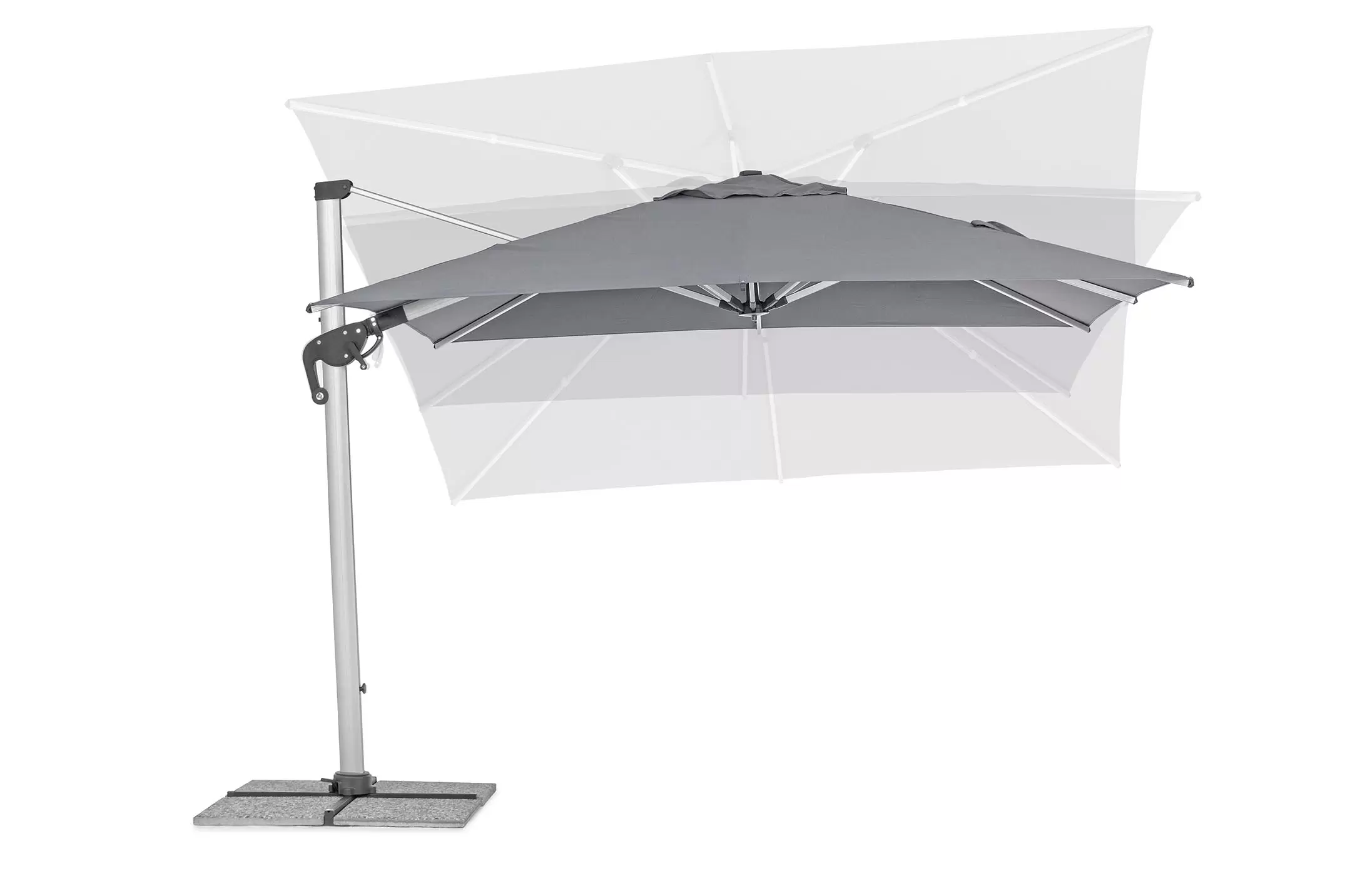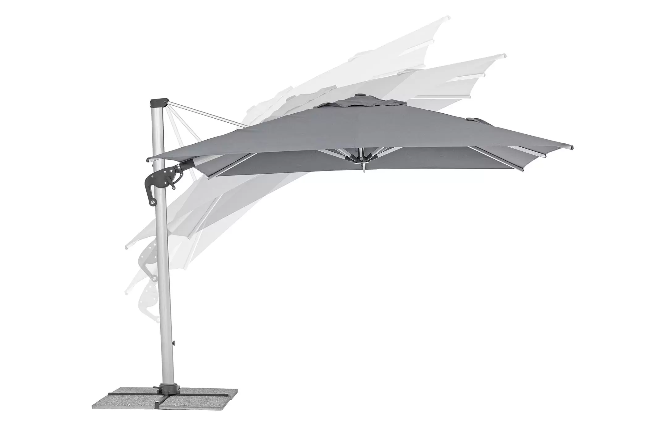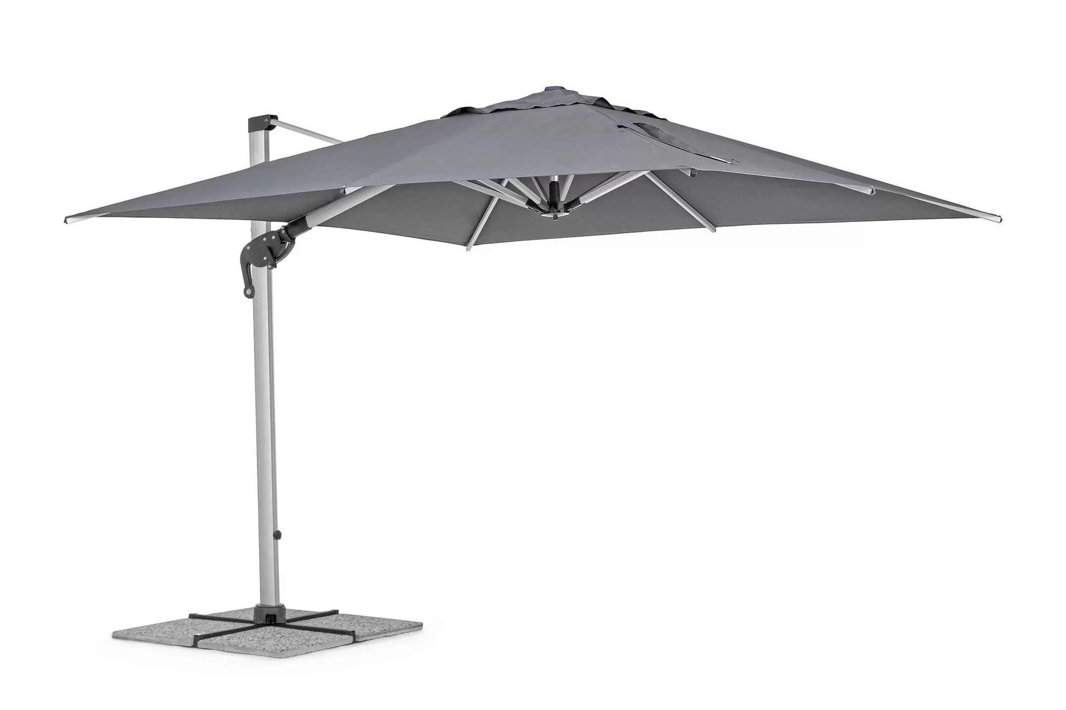 Czasza parasola może być obrócona o 360° lub zmienić kąt nachylenia na jeden z czterech dostępnych. Podstawa w kształcie krzyża wykonana jest ze stali. W zestawie znajduje się pokrowiec, jednak cementowe bazy należy dokupić oddzielnie.