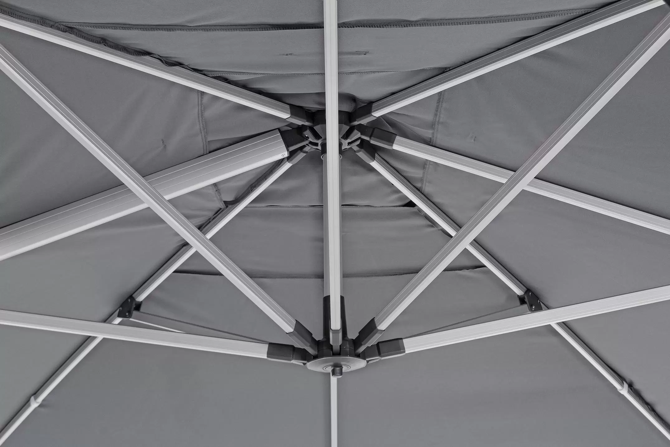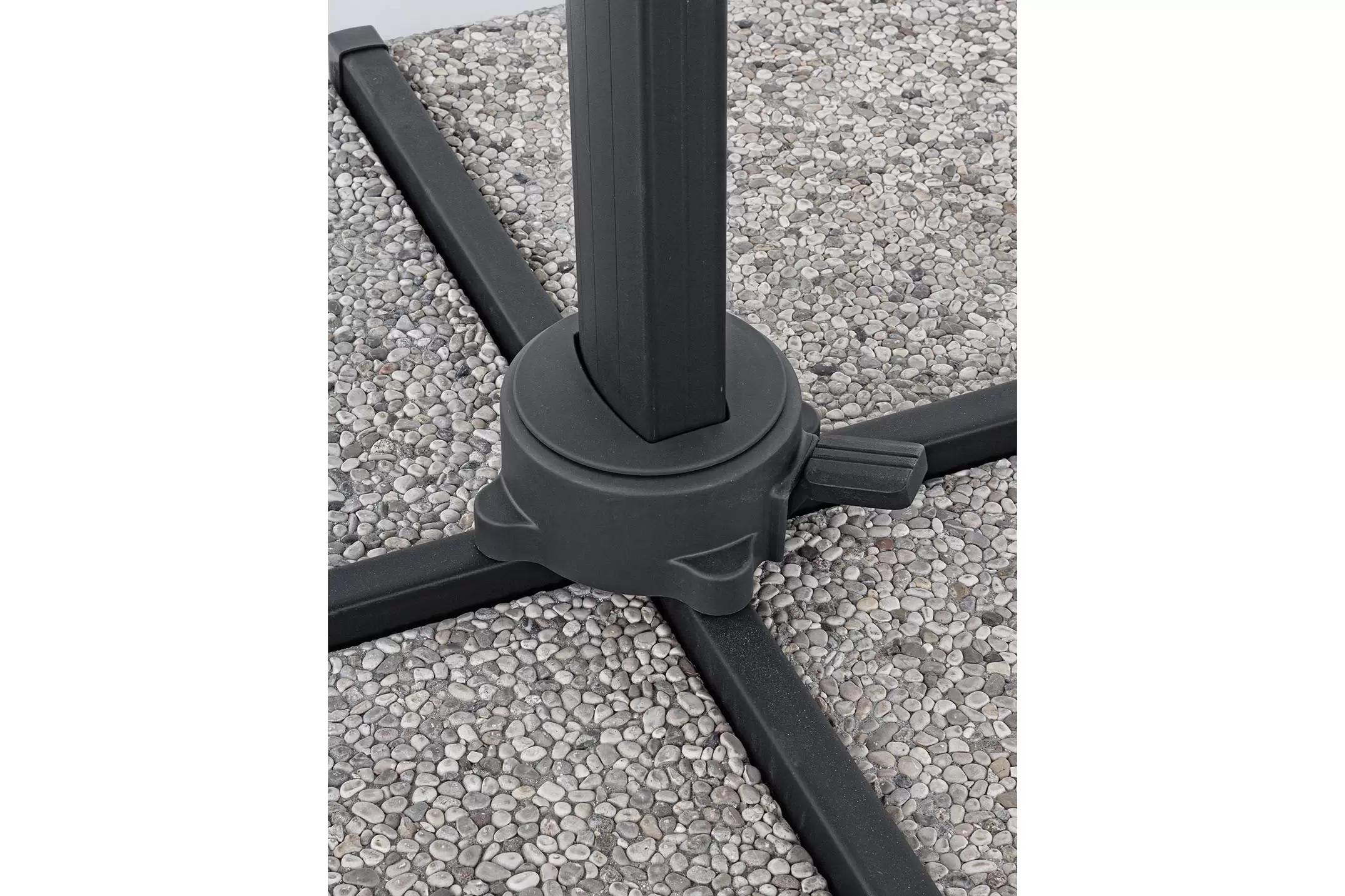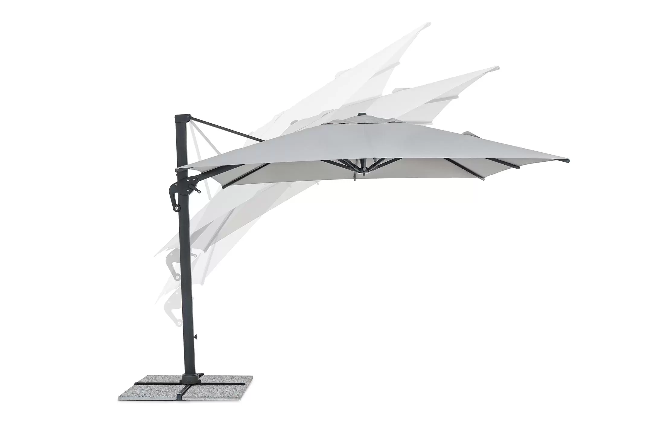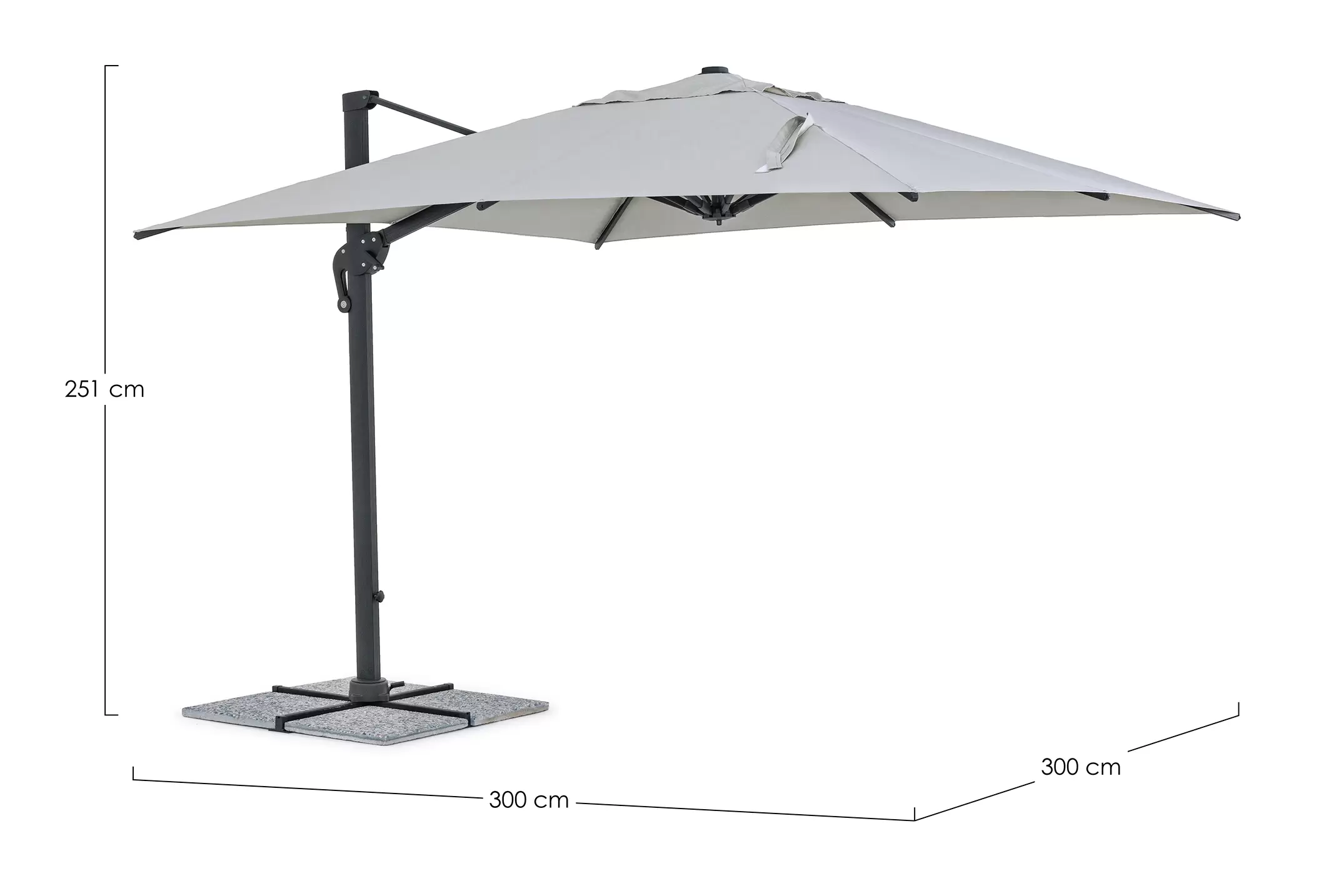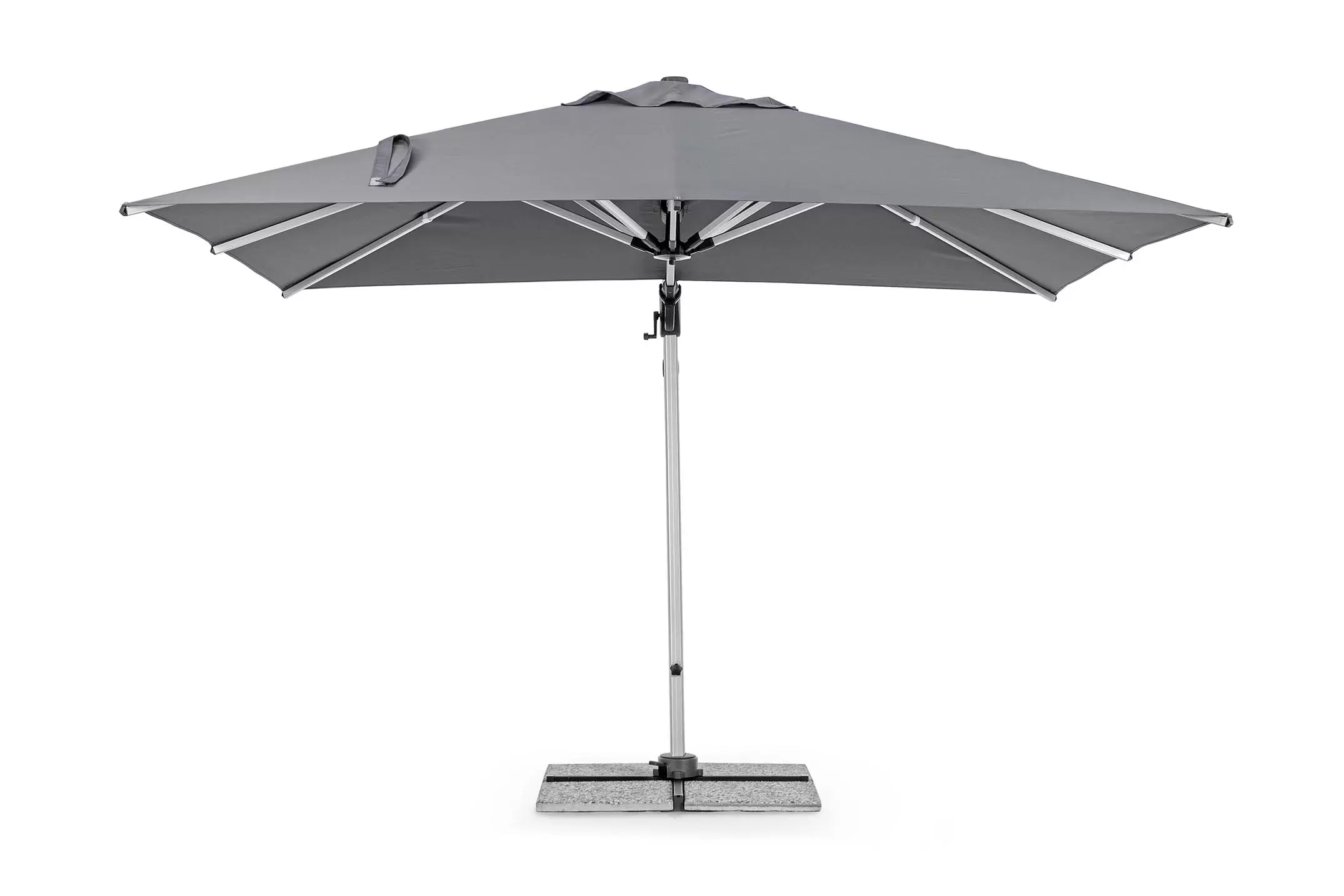 Czasza parasola może być obrócona o 360° lub zmienić kąt nachylenia na jeden z czterech dostępnych. Podstawa w kształcie krzyża wykonana jest ze stali. W zestawie znajduje się pokrowiec, jednak cementowe bazy należy dokupić oddzielnie.