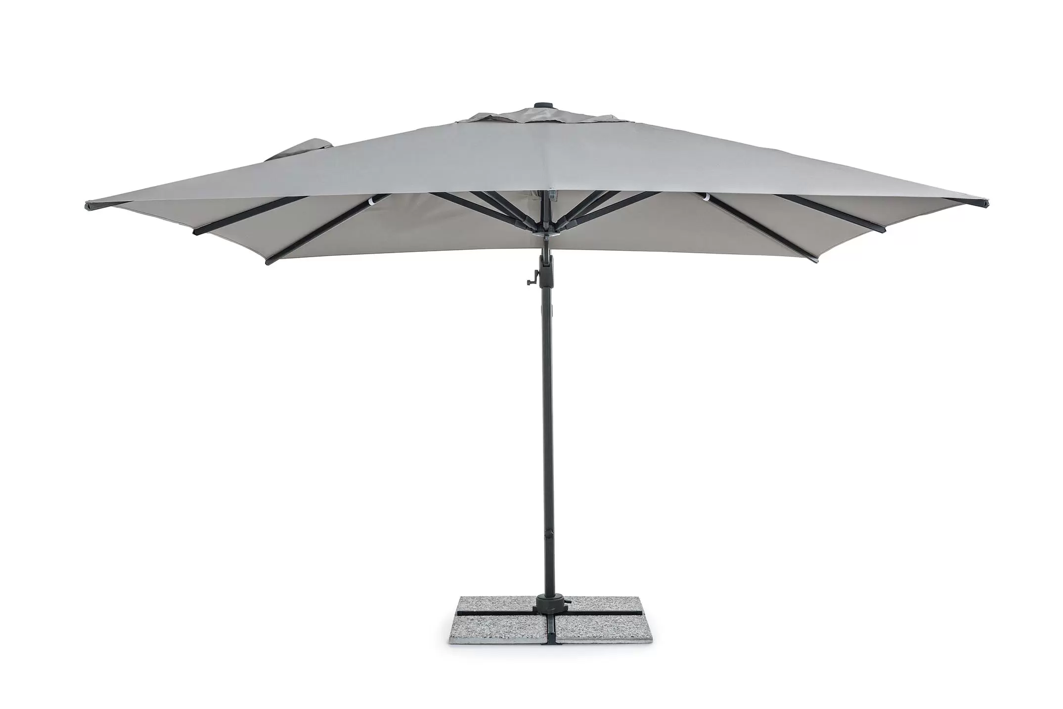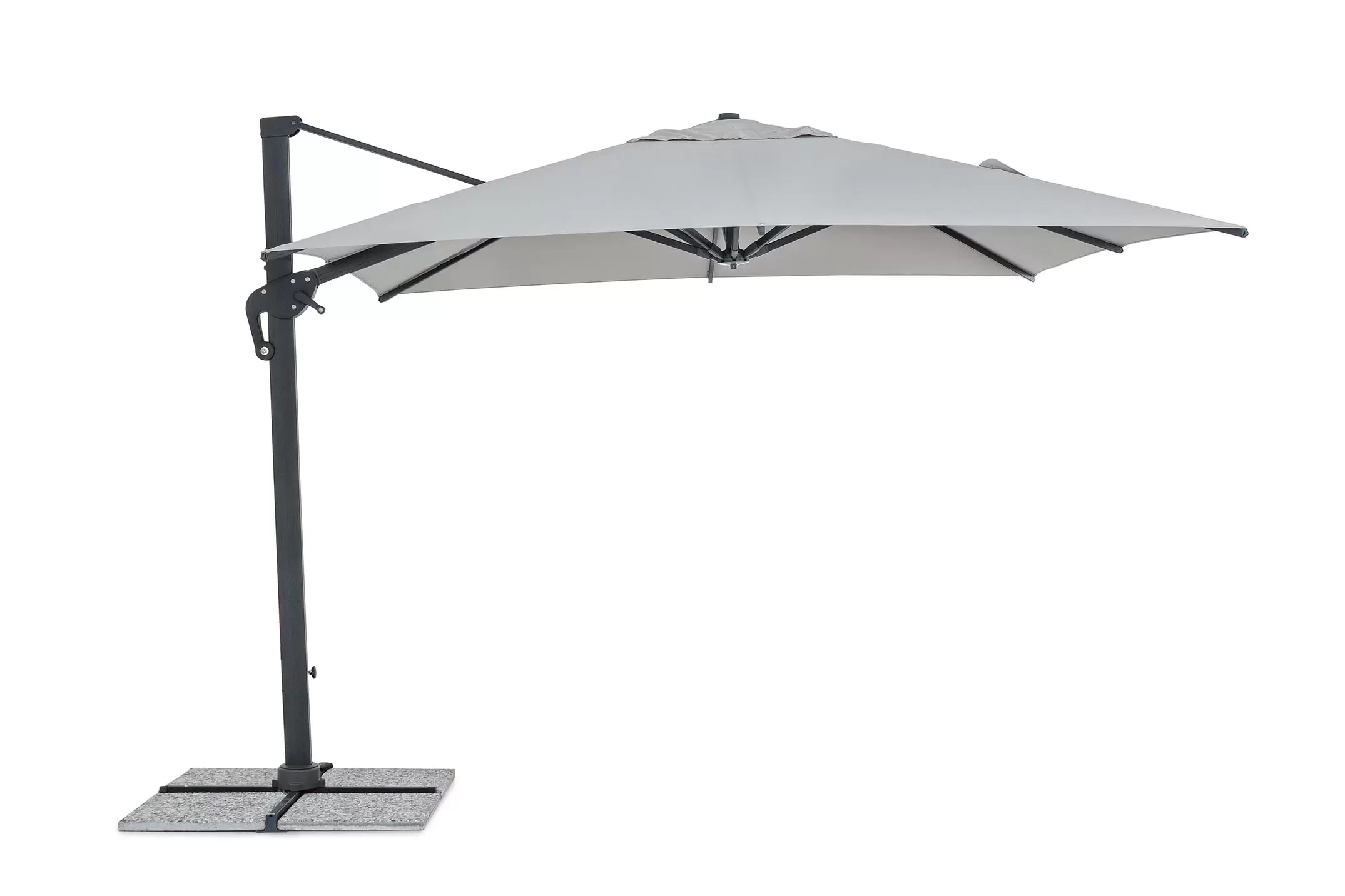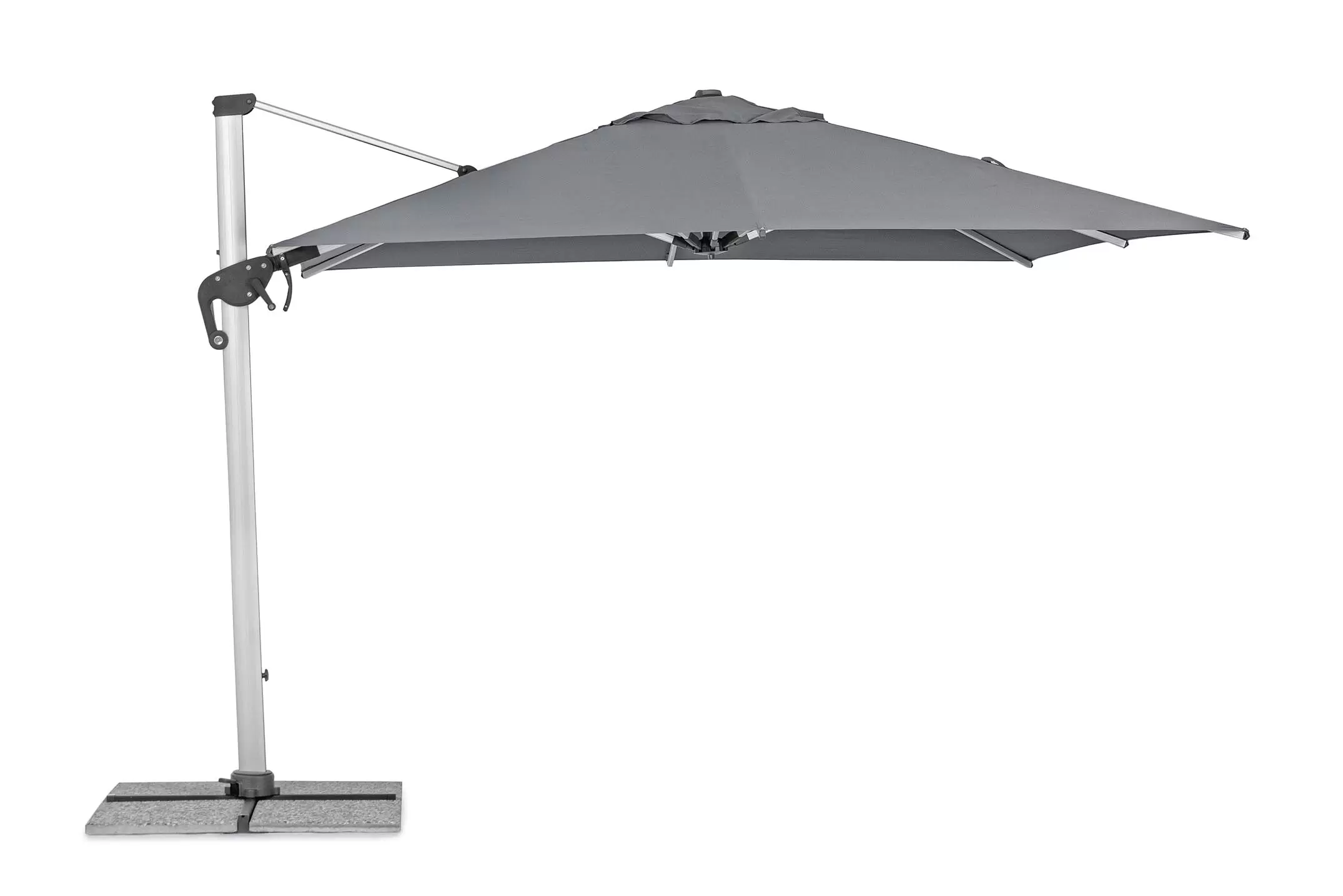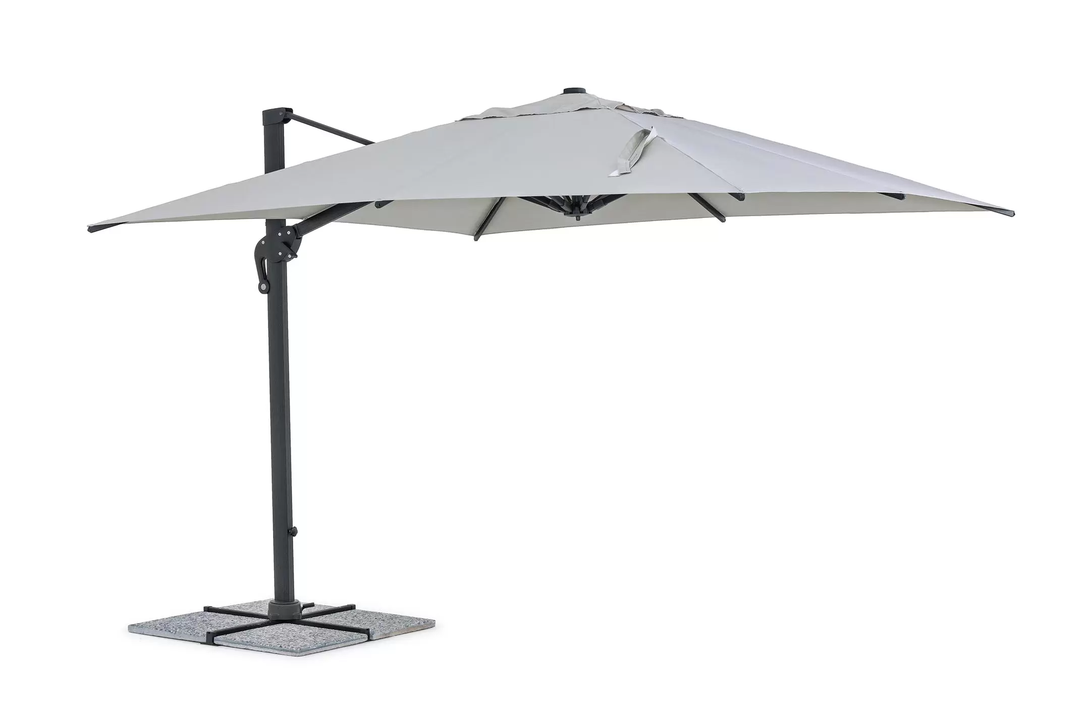 Czasza parasola może być obrócona o 360° lub zmienić kąt nachylenia na jeden z czterech dostępnych. Podstawa w kształcie krzyża wykonana jest ze stali. W zestawie znajduje się pokrowiec, jednak cementowe bazy należy dokupić oddzielnie.