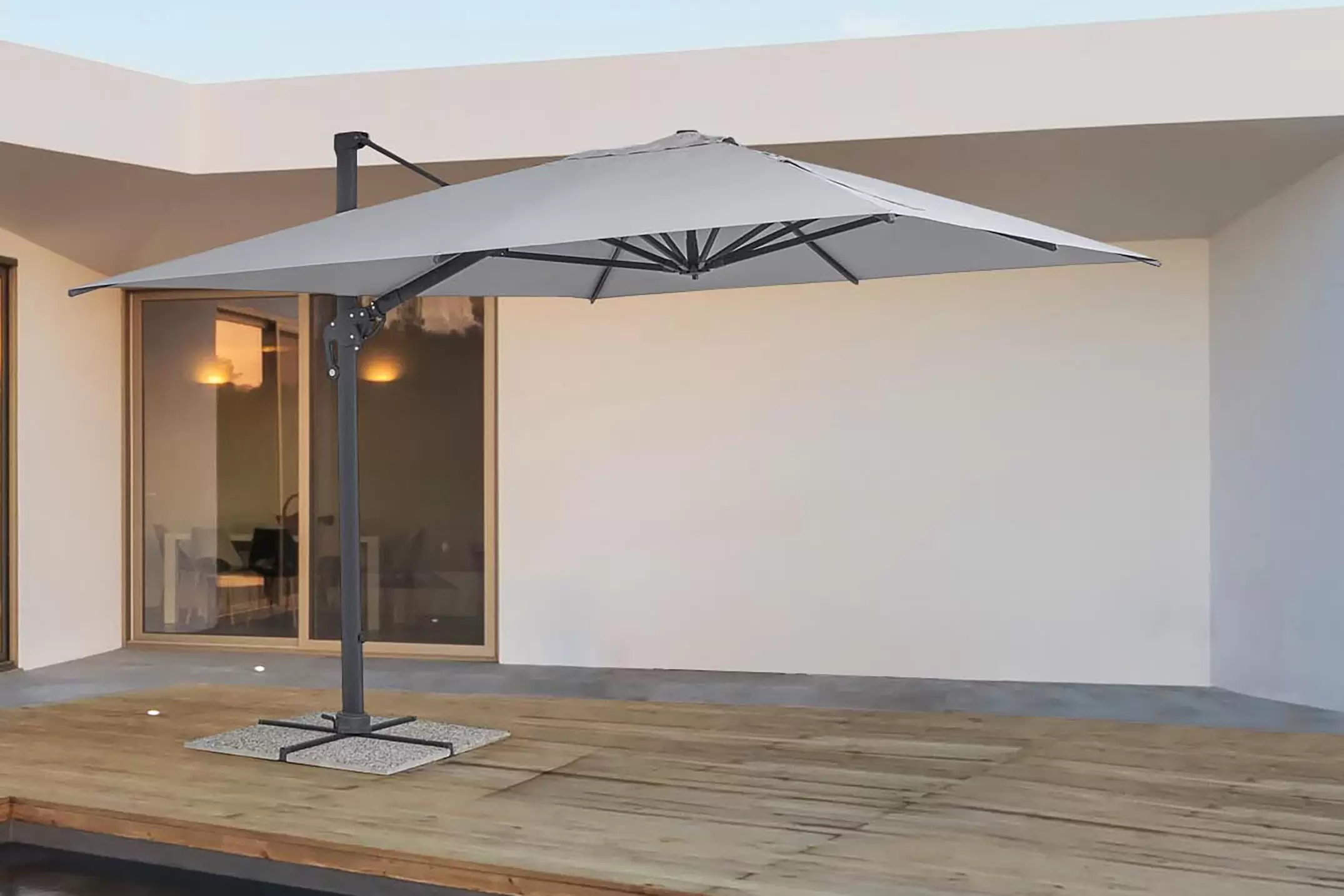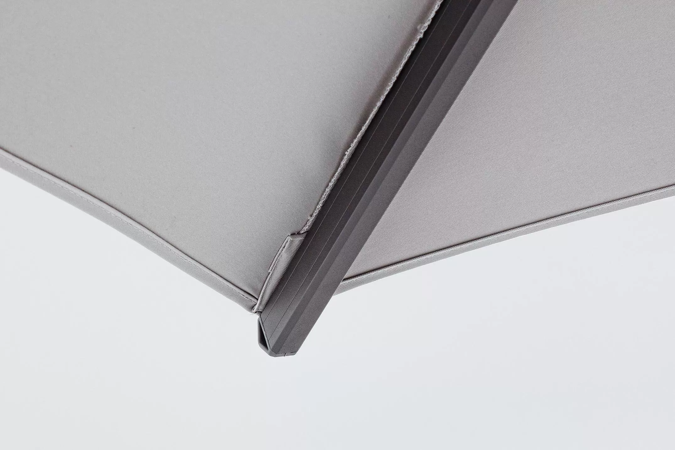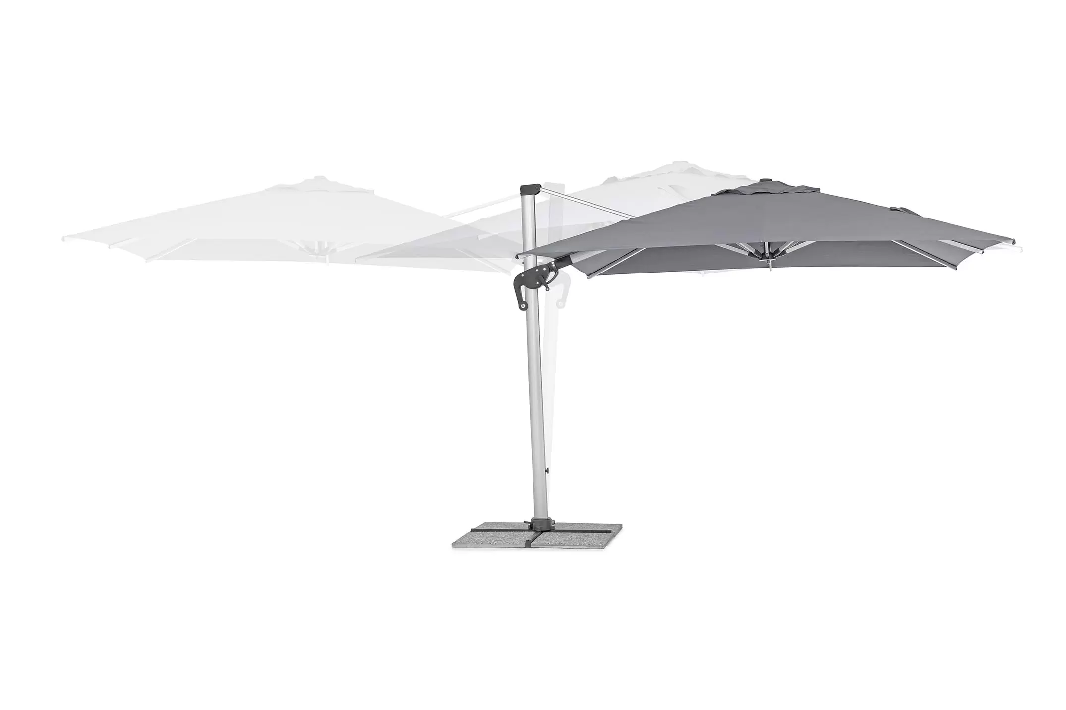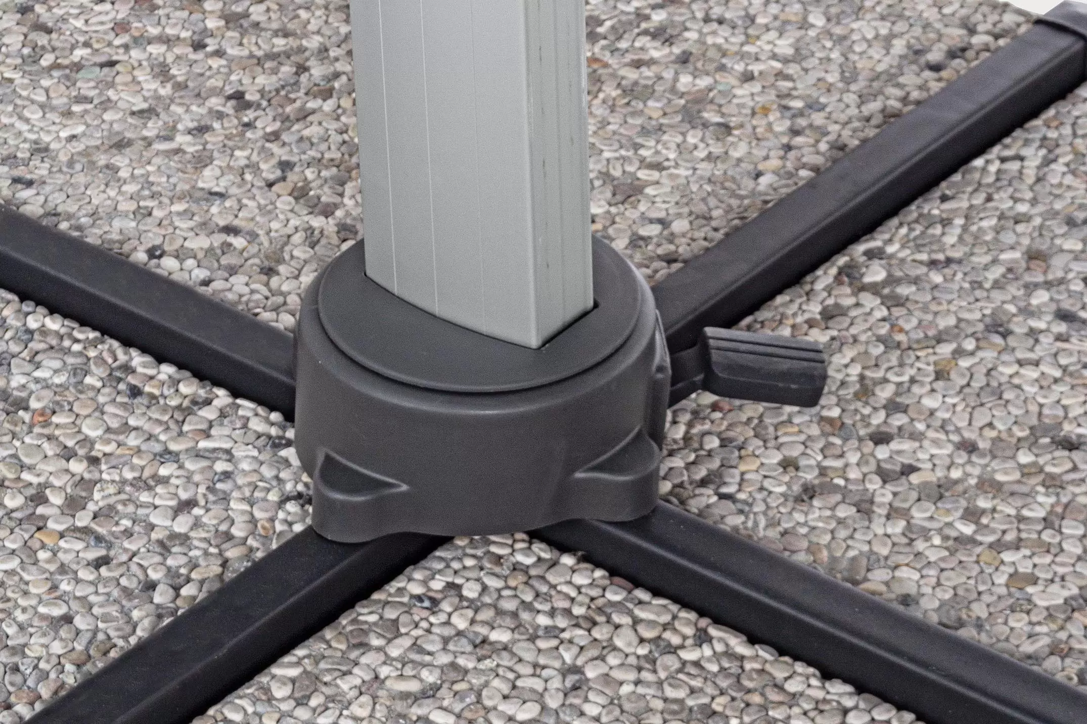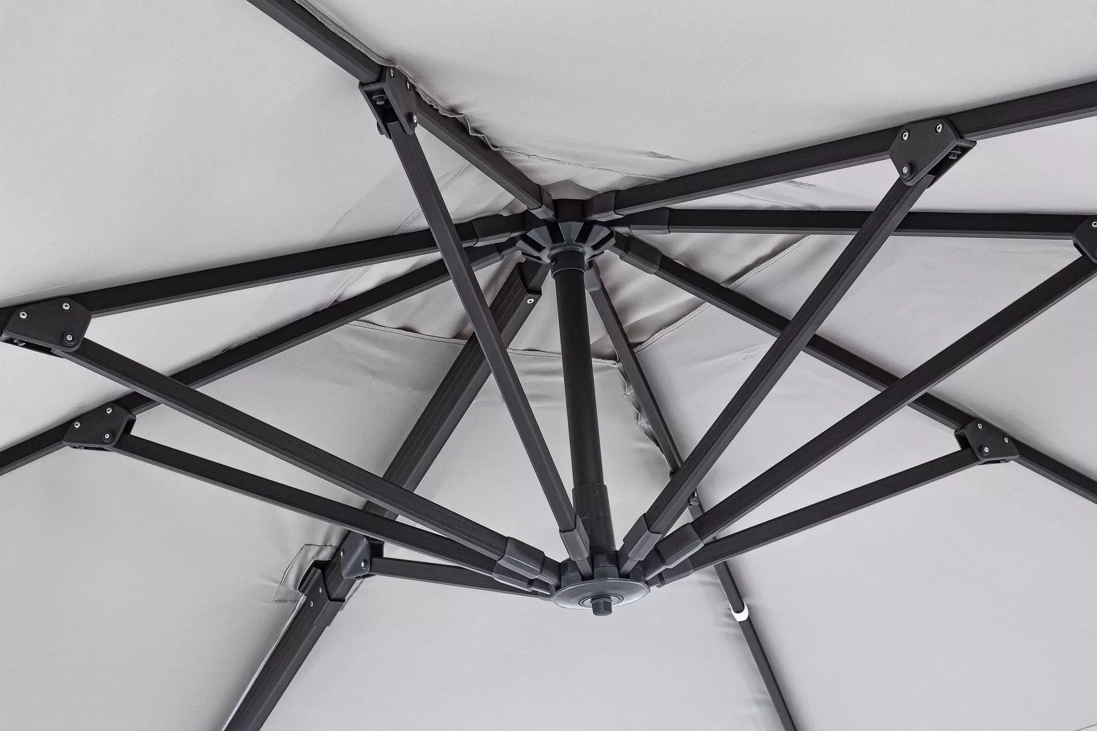 Czasza parasola może być obrócona o 360° lub zmienić kąt nachylenia na jeden z czterech dostępnych. Podstawa w kształcie krzyża wykonana jest ze stali. W zestawie znajduje się pokrowiec, jednak cementowe bazy należy dokupić oddzielnie.
