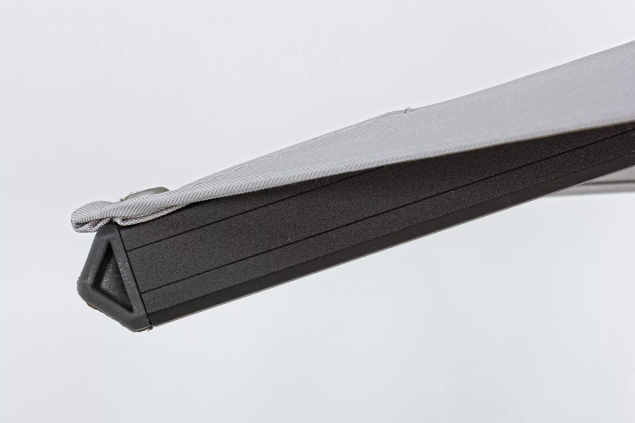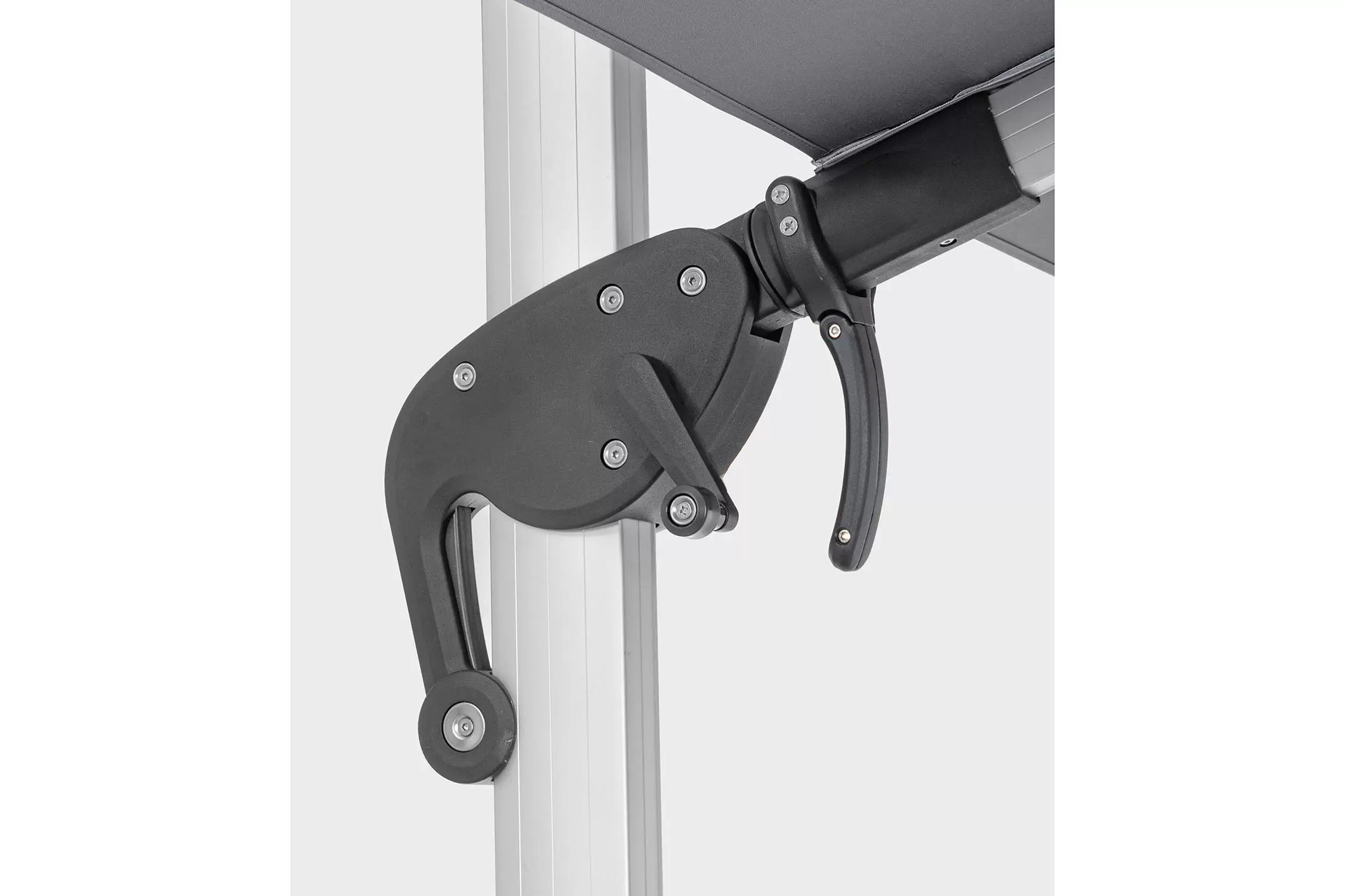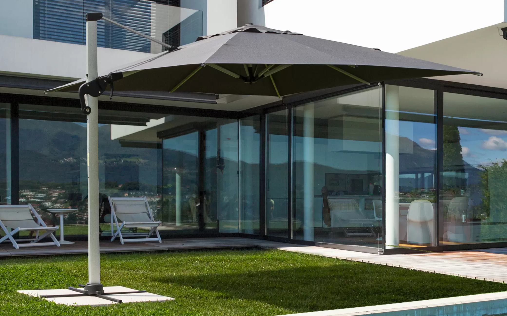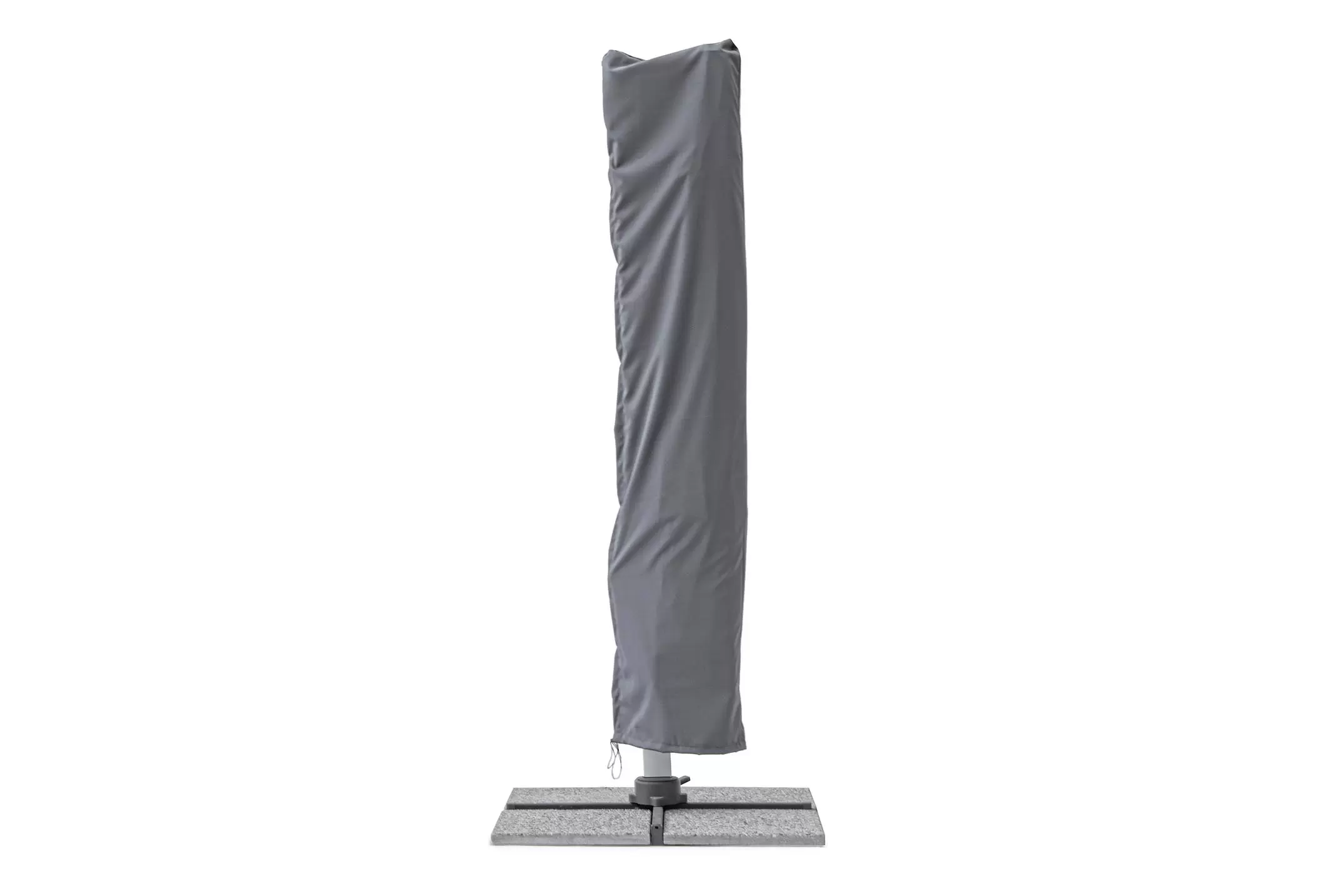 Czasza parasola może być obrócona o 360° lub zmienić kąt nachylenia na jeden z czterech dostępnych. Podstawa w kształcie krzyża wykonana jest ze stali. W zestawie znajduje się pokrowiec, jednak cementowe bazy należy dokupić oddzielnie.