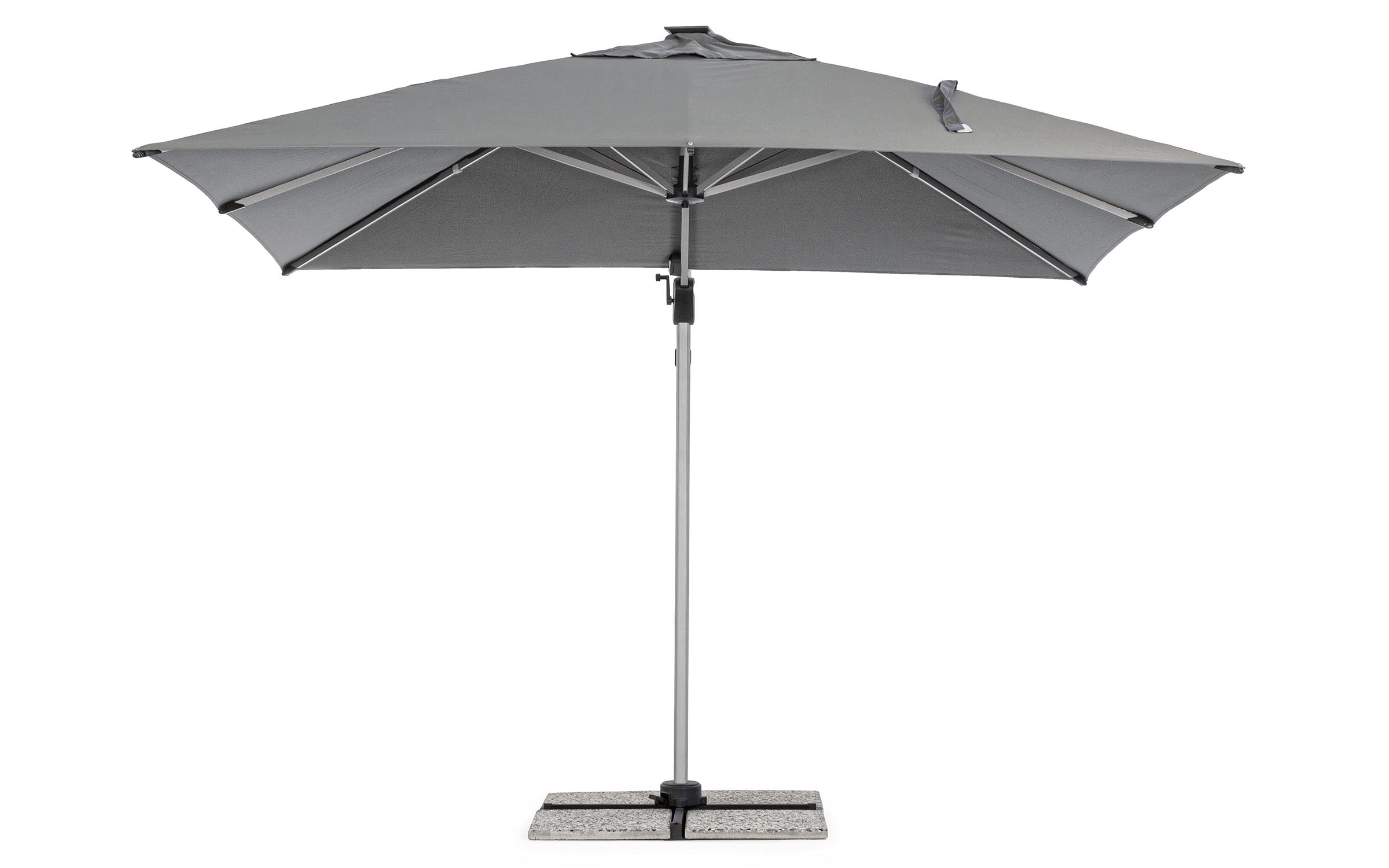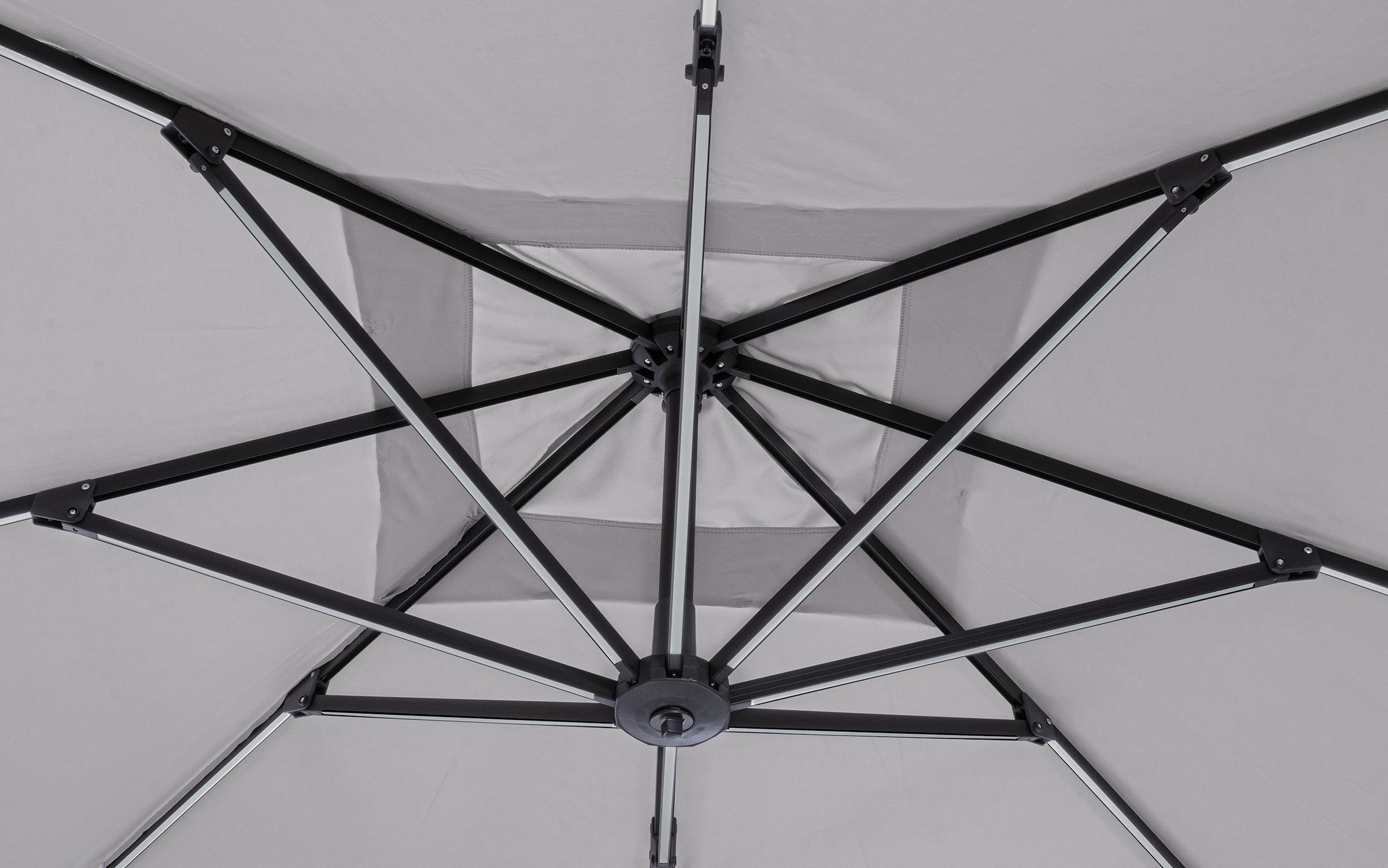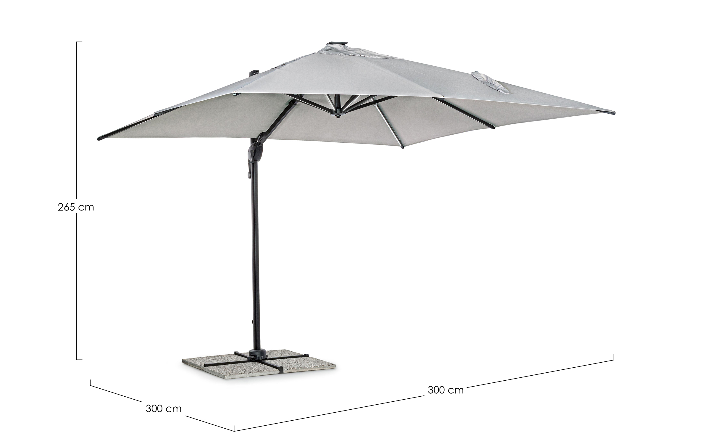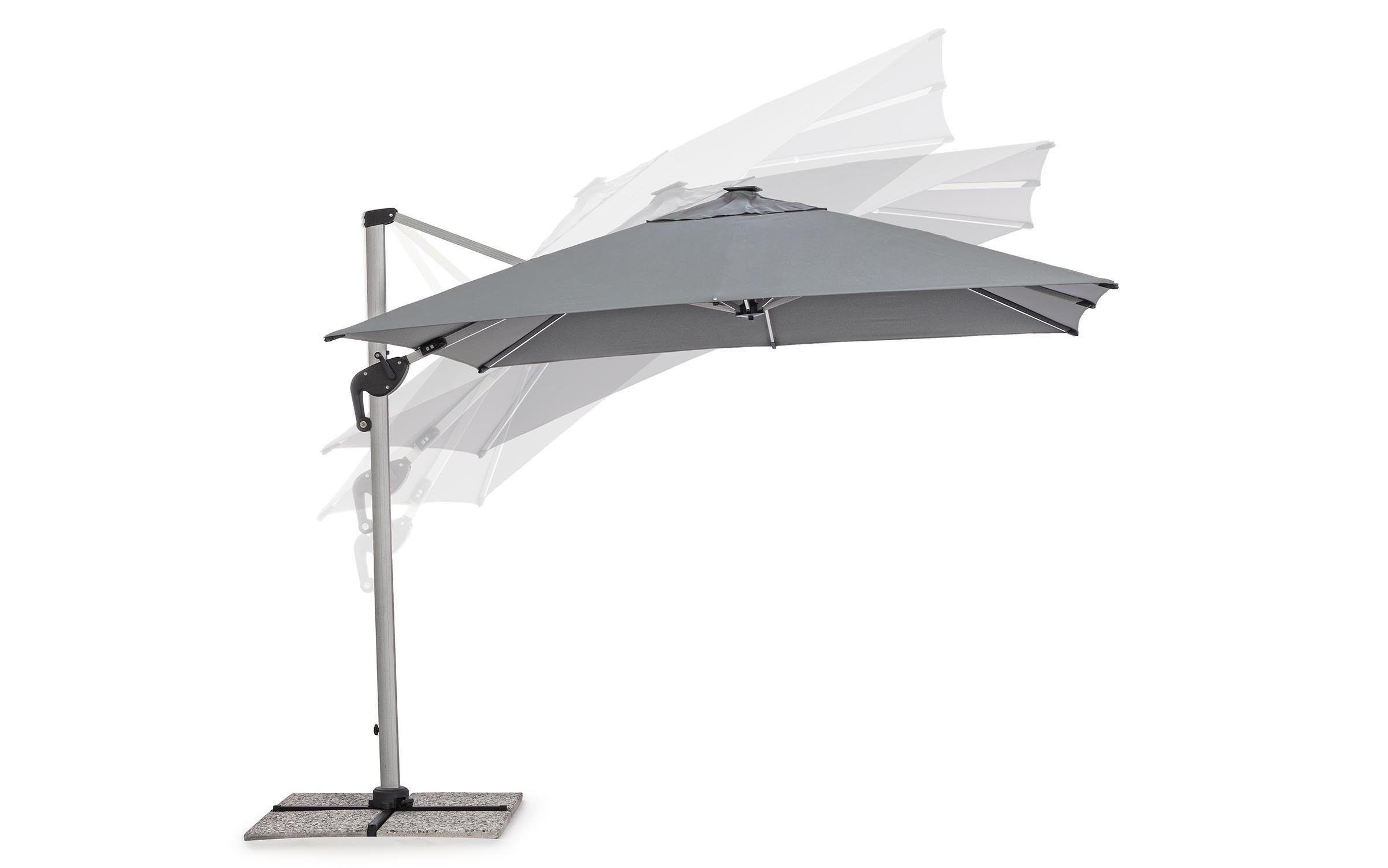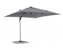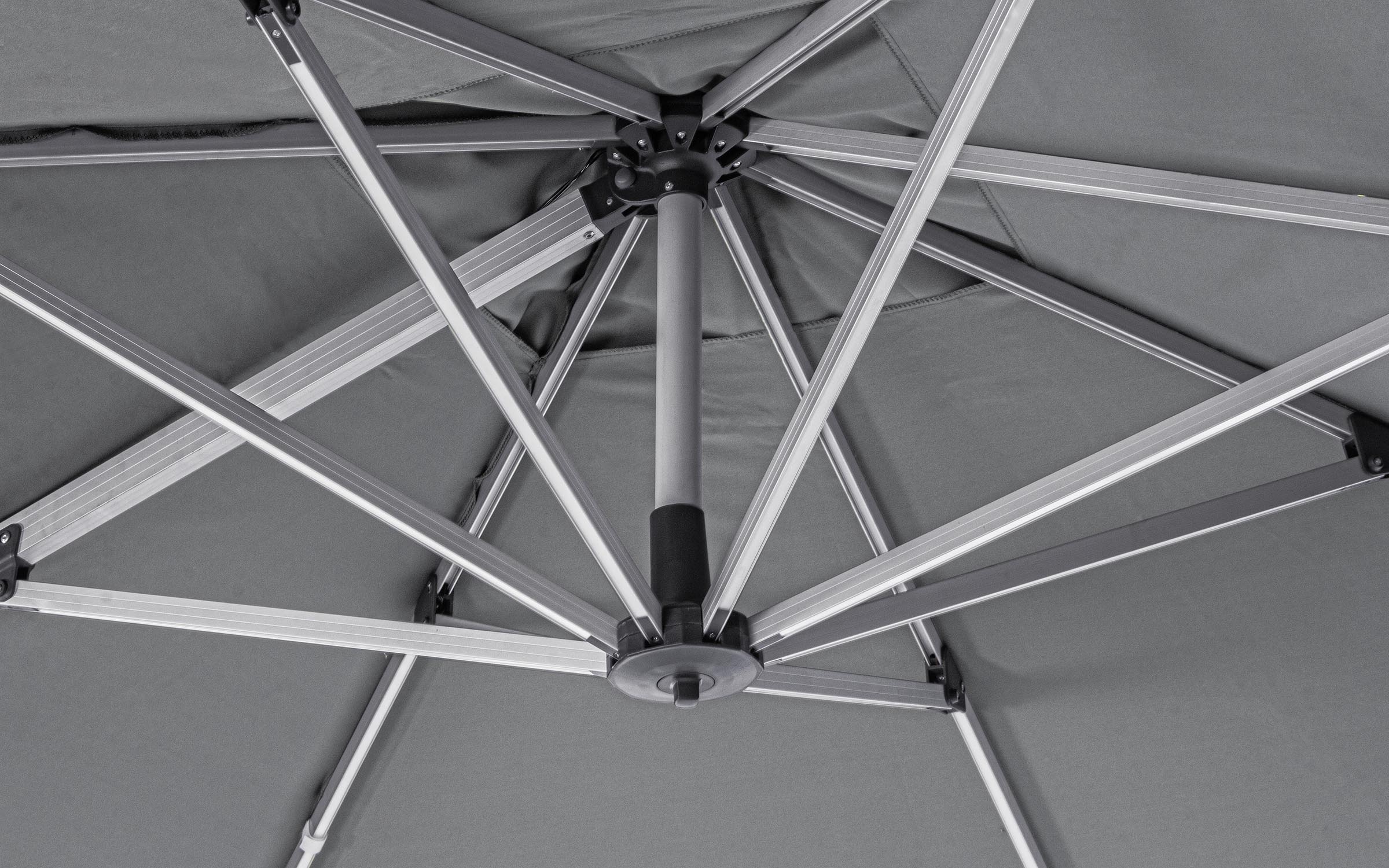 Czasza parasola może być obrócona o 360° lub zmienić kąt nachylenia na jeden z czterech dostępnych. Podstawa w kształcie krzyża wykonana jest ze stali. W zestawie znajduje się pokrowiec, jednak cementowe bazy należy dokupić oddzielnie.