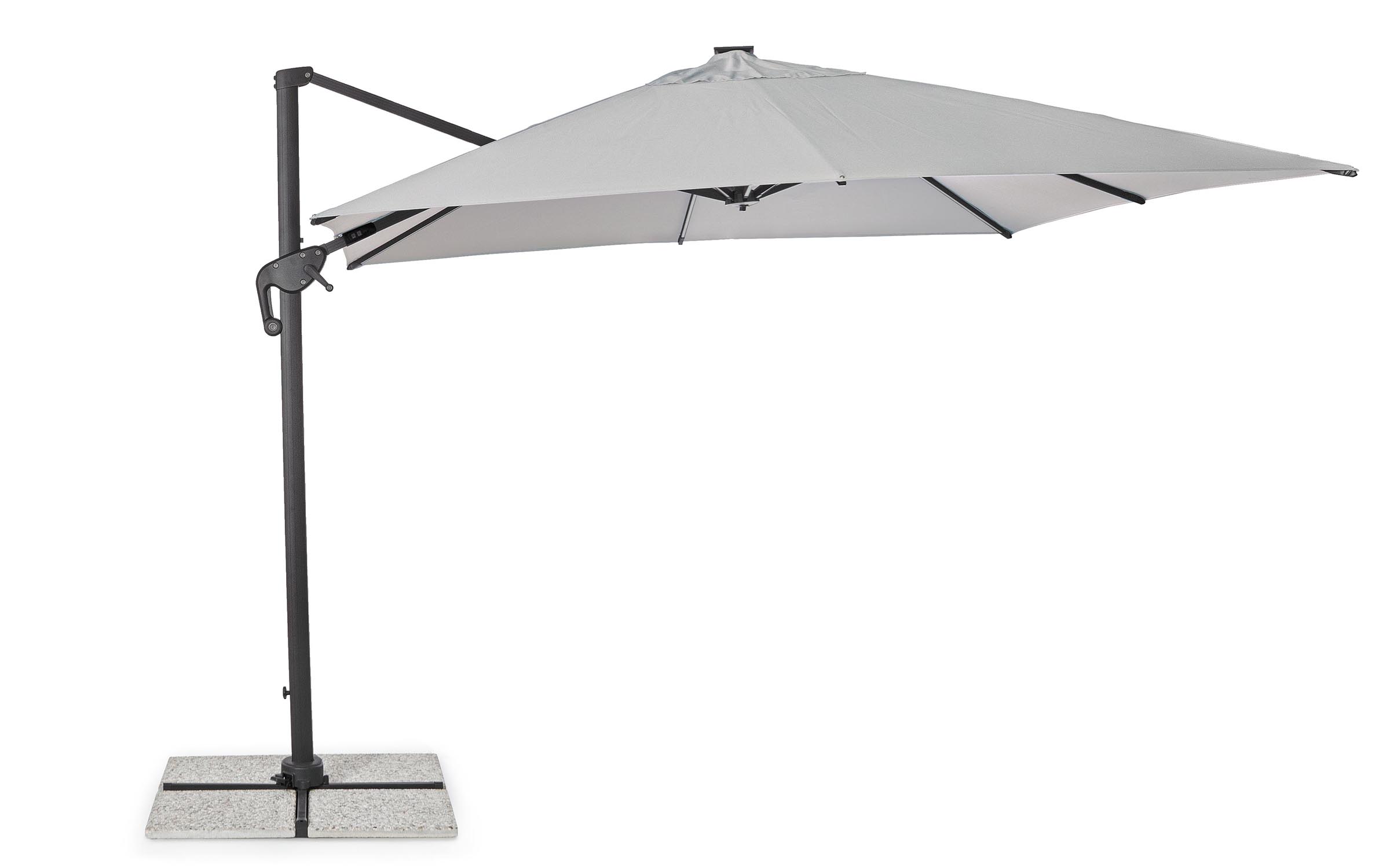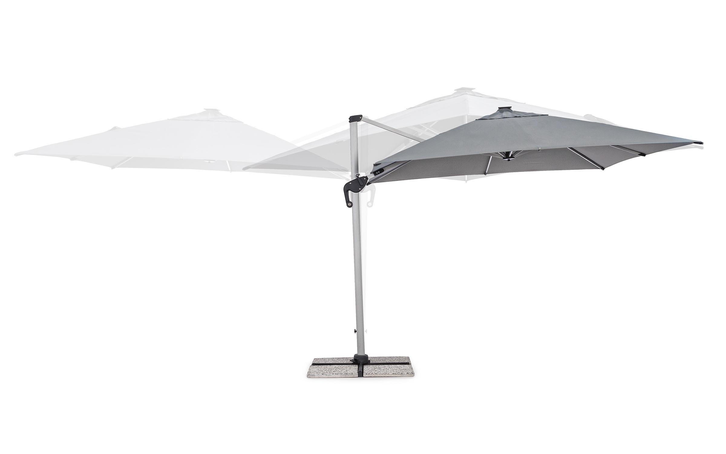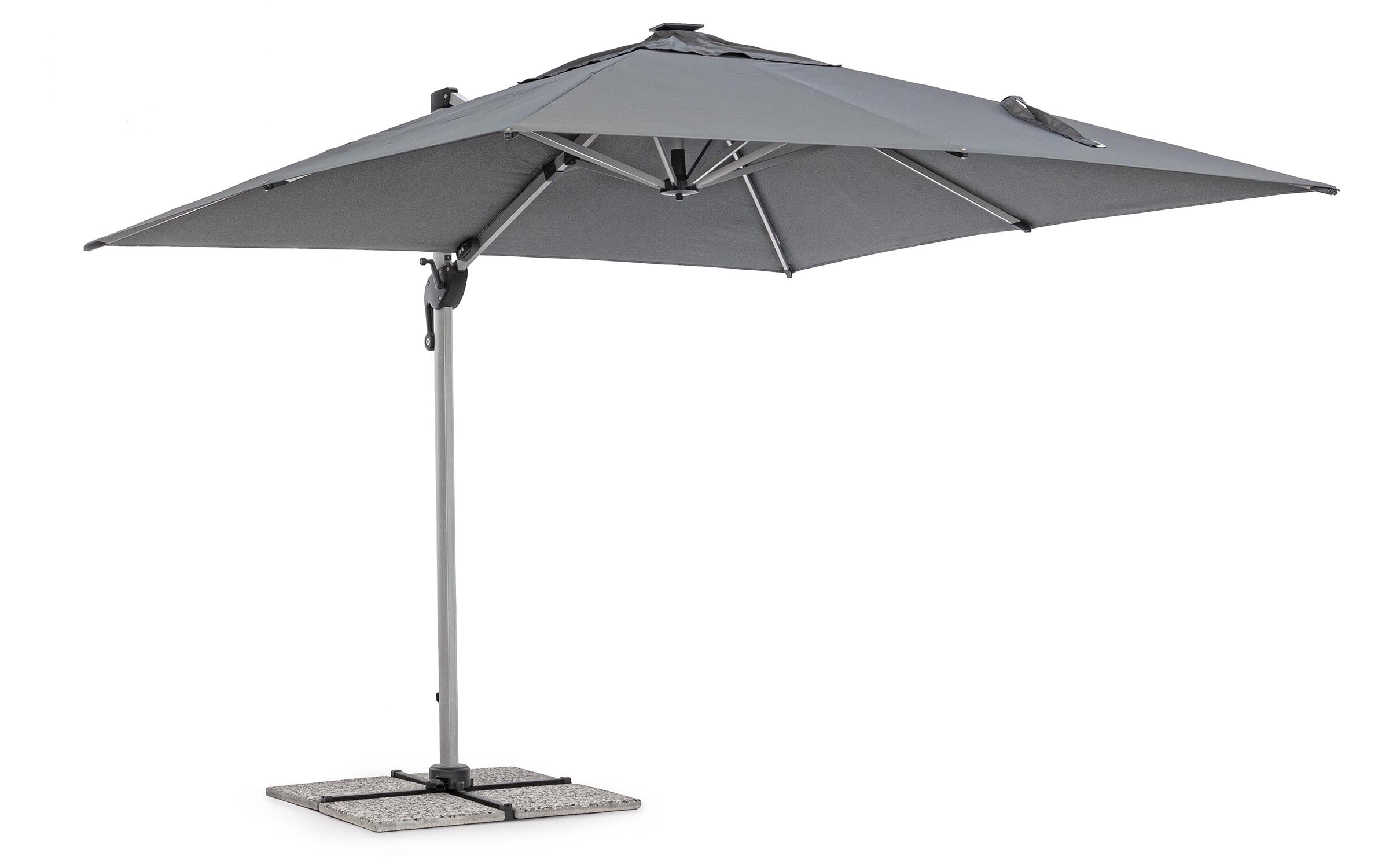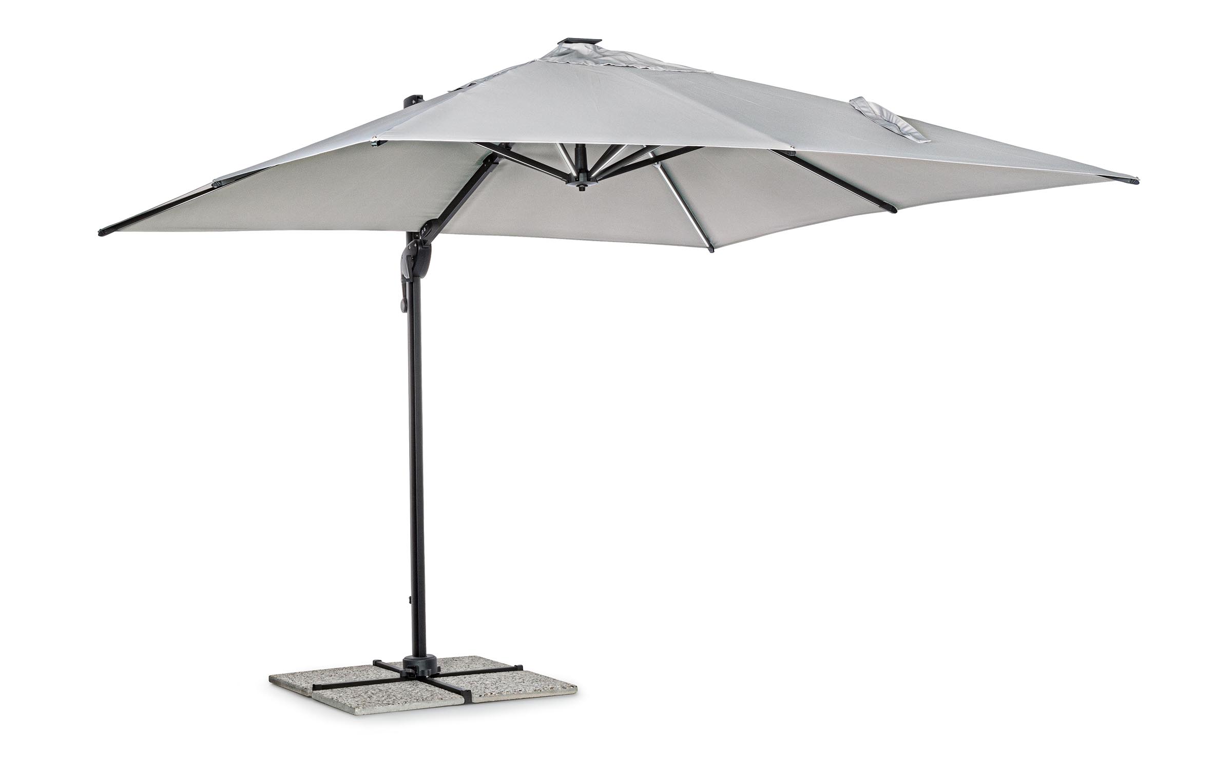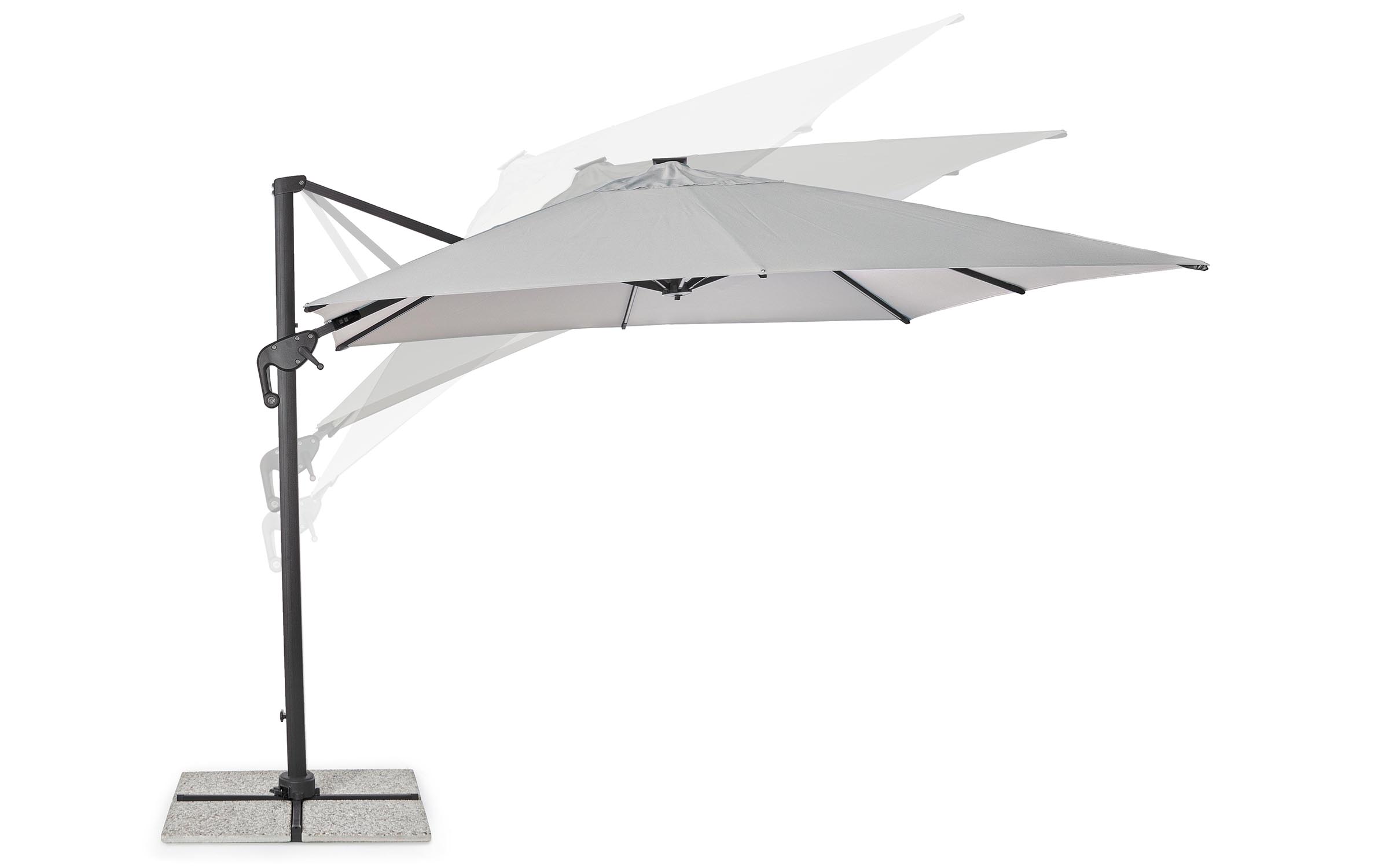 Czasza parasola może być obrócona o 360° lub zmienić kąt nachylenia na jeden z czterech dostępnych. Podstawa w kształcie krzyża wykonana jest ze stali. W zestawie znajduje się pokrowiec, jednak cementowe bazy należy dokupić oddzielnie.