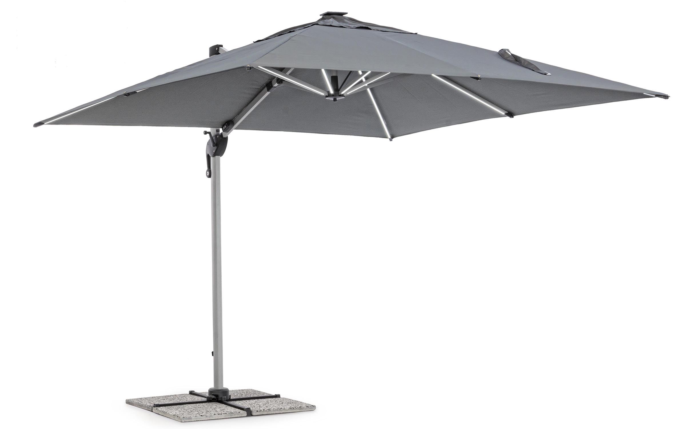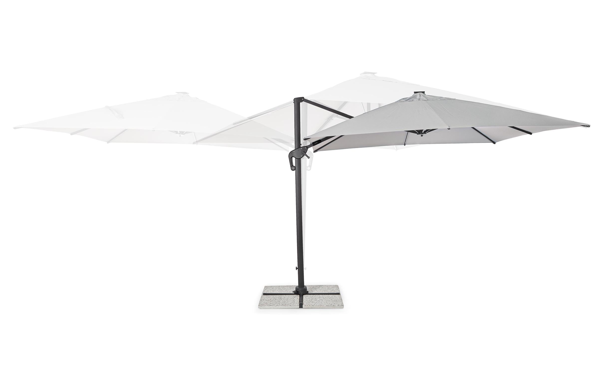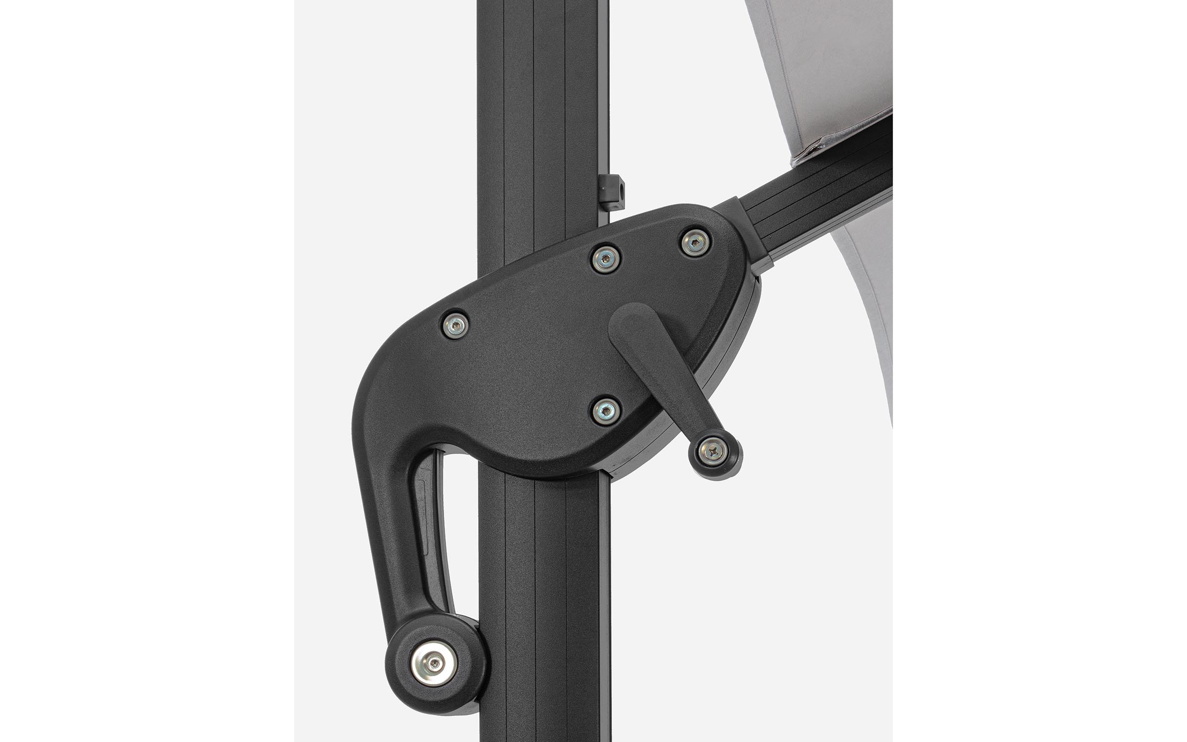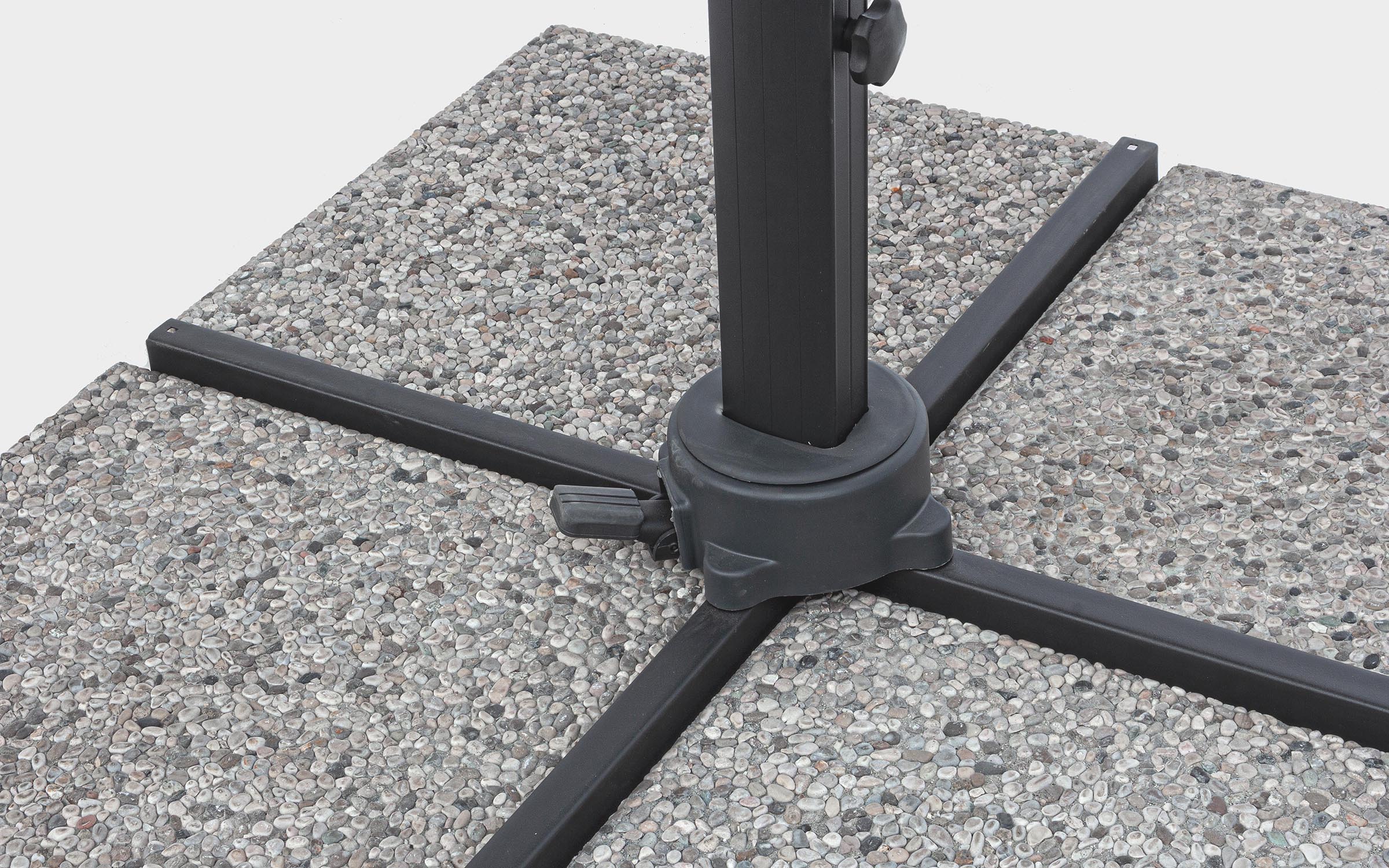 Czasza parasola może być obrócona o 360° lub zmienić kąt nachylenia na jeden z czterech dostępnych. Podstawa w kształcie krzyża wykonana jest ze stali. W zestawie znajduje się pokrowiec, jednak cementowe bazy należy dokupić oddzielnie.