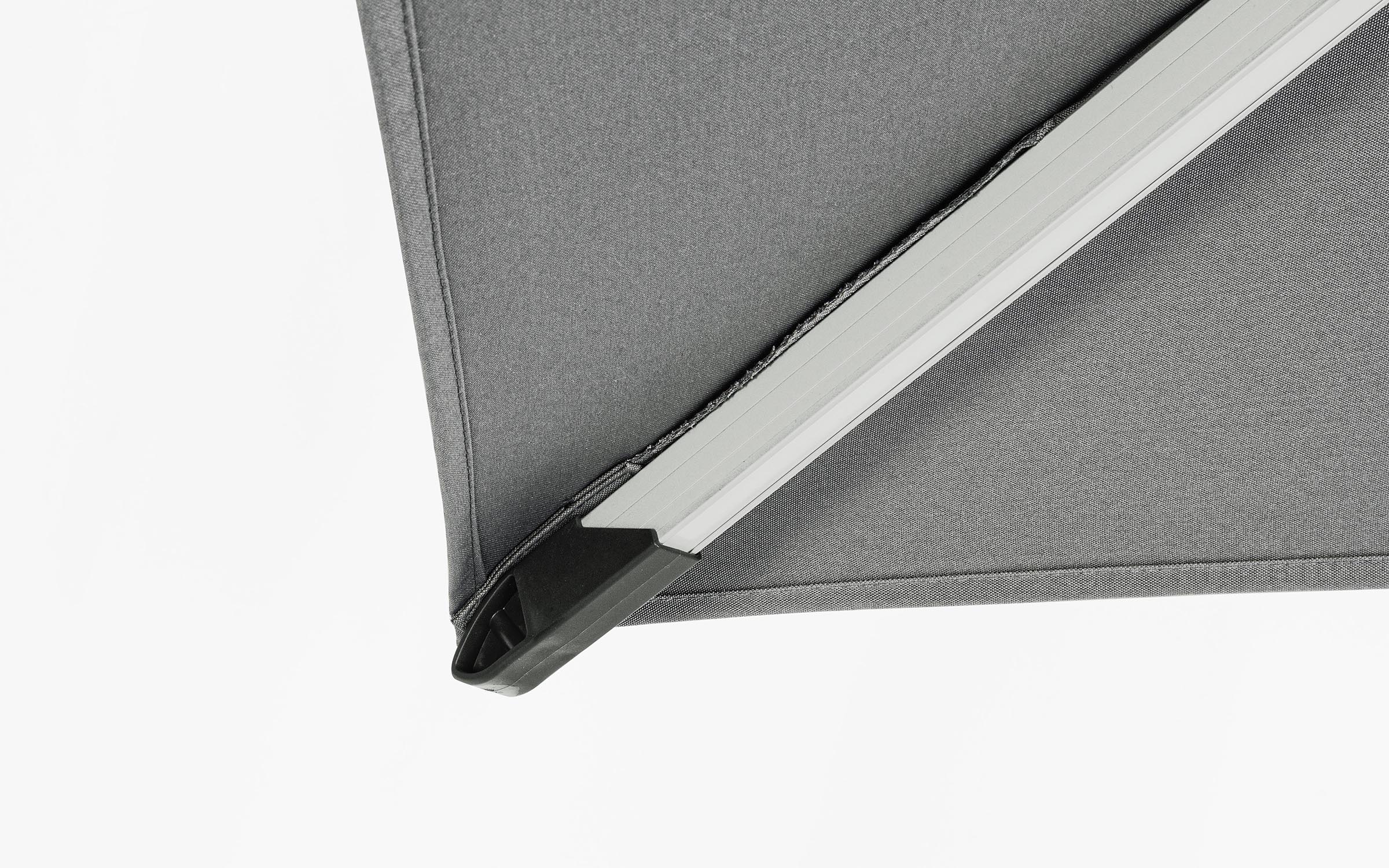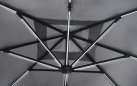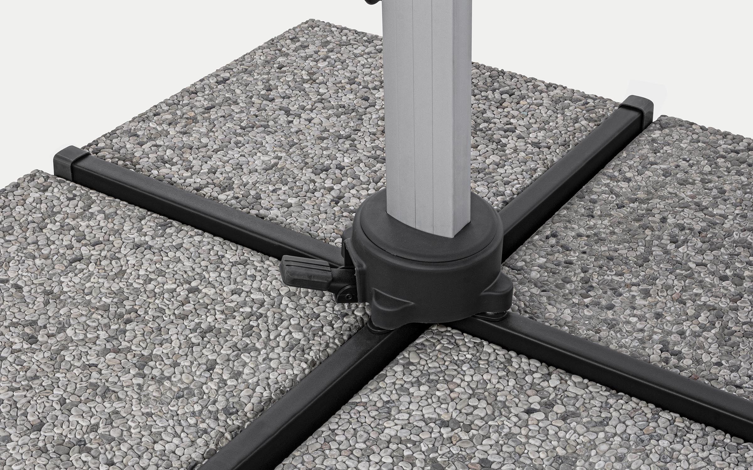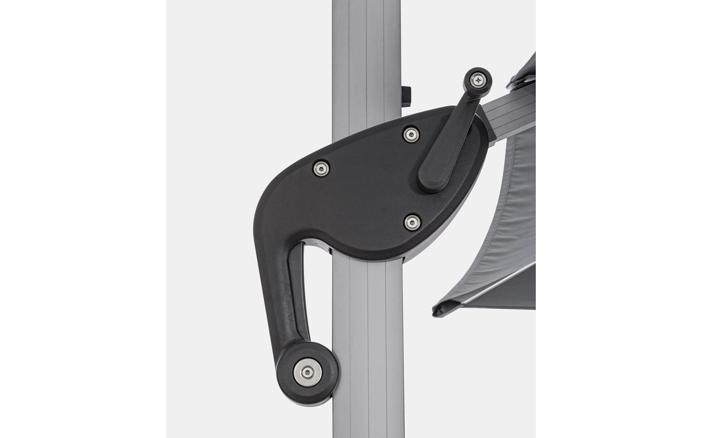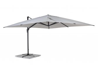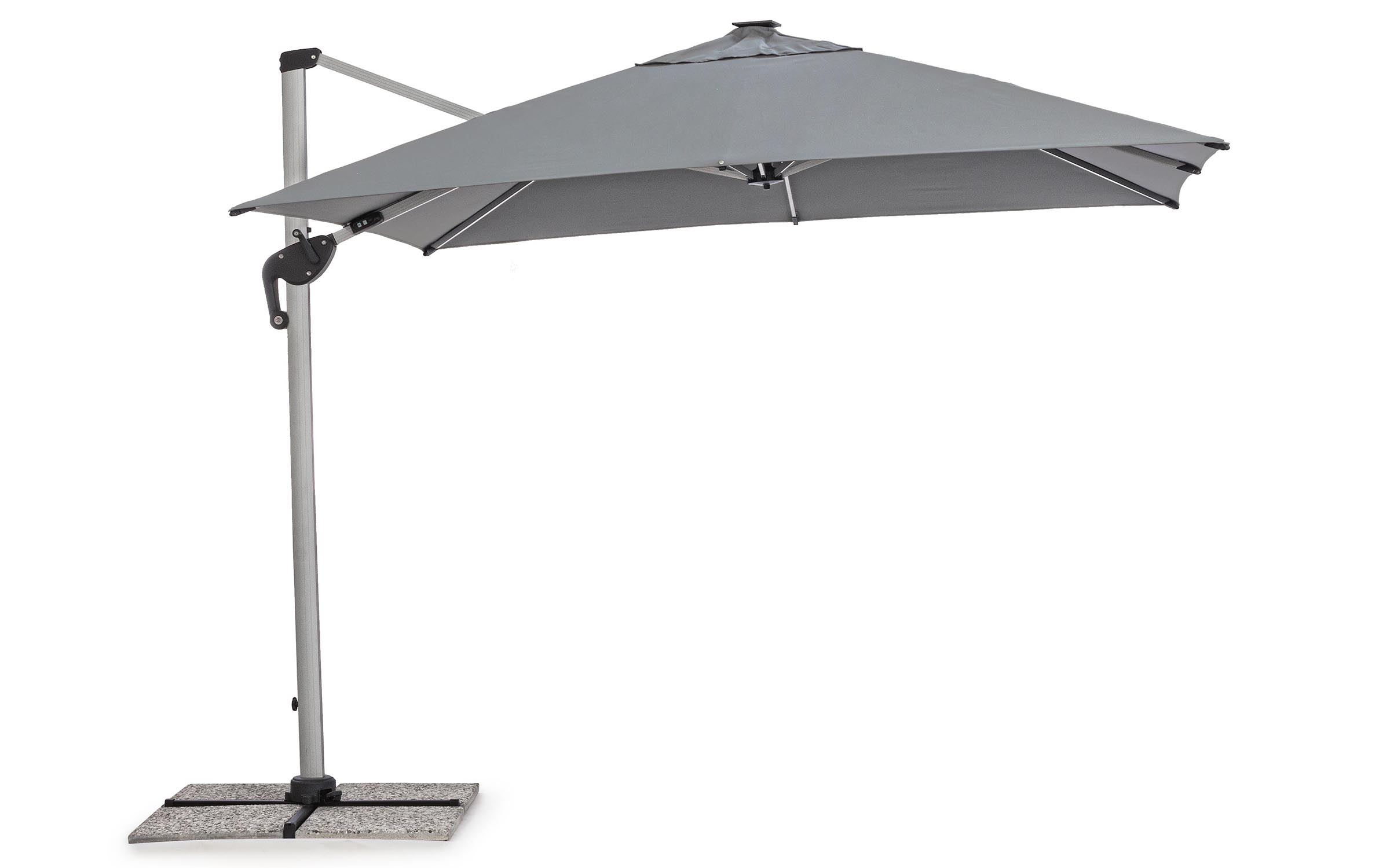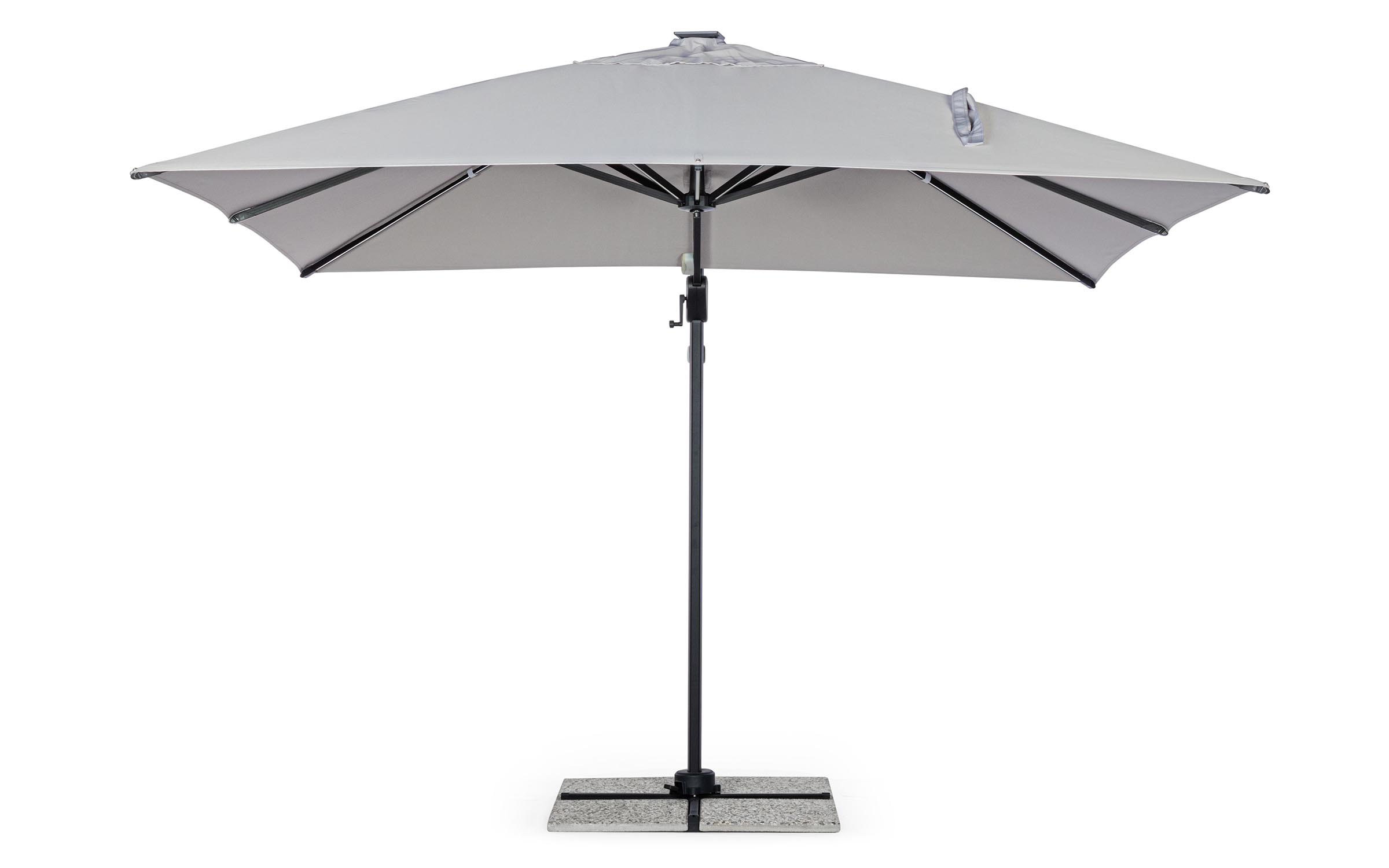 Czasza parasola może być obrócona o 360° lub zmienić kąt nachylenia na jeden z czterech dostępnych. Podstawa w kształcie krzyża wykonana jest ze stali. W zestawie znajduje się pokrowiec, jednak cementowe bazy należy dokupić oddzielnie.