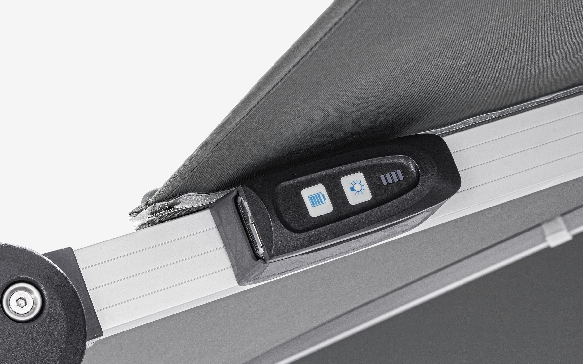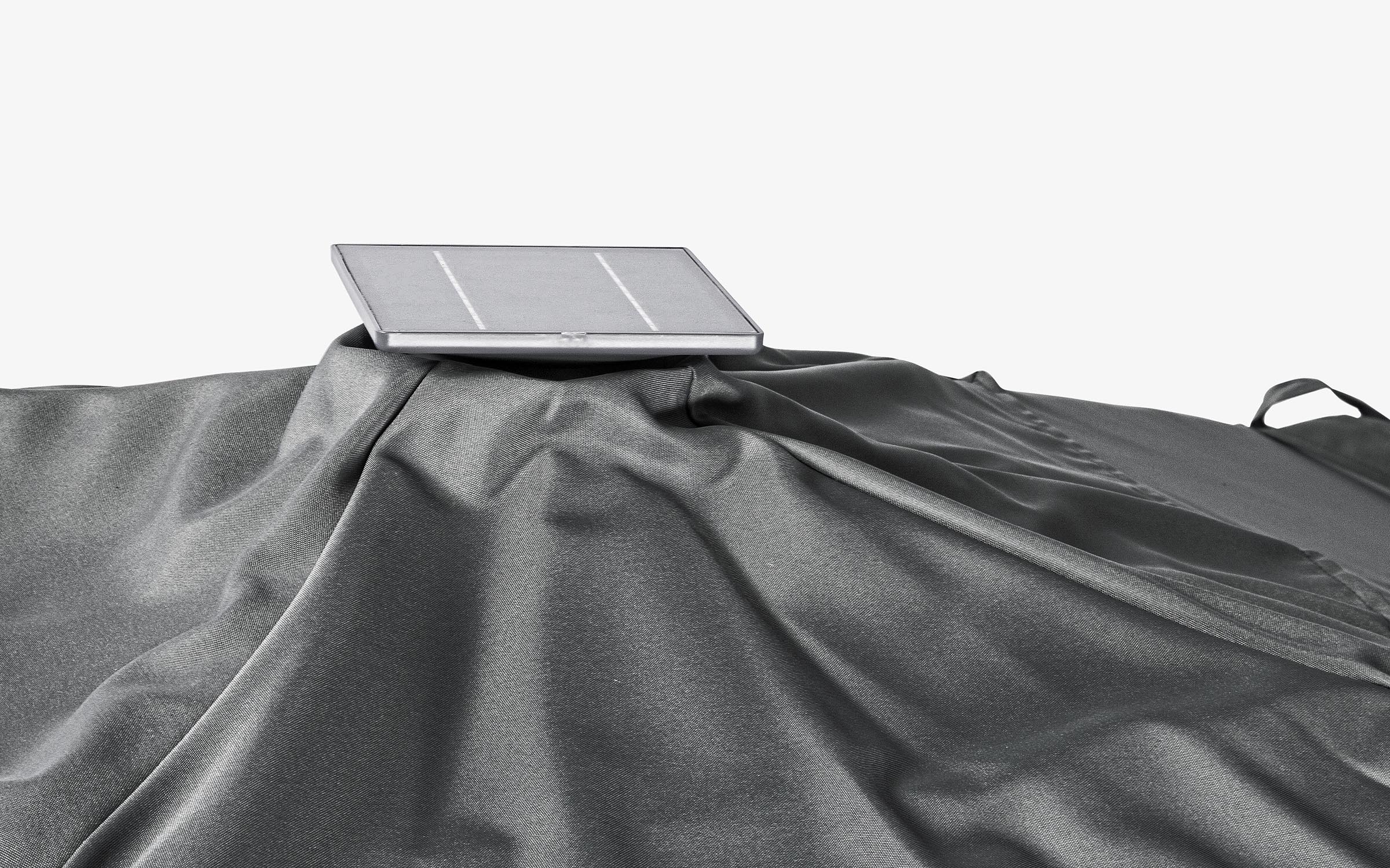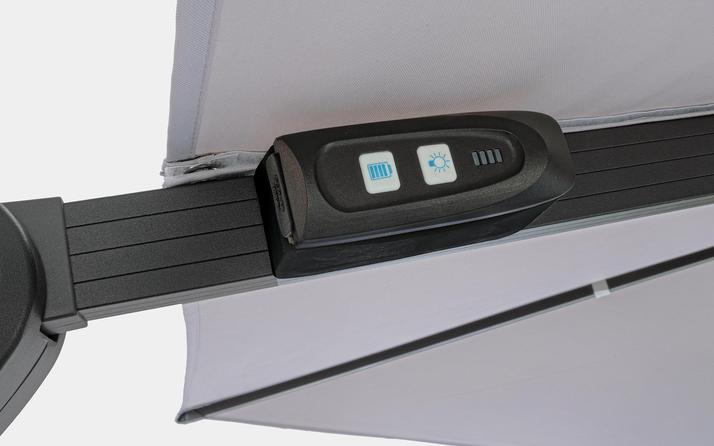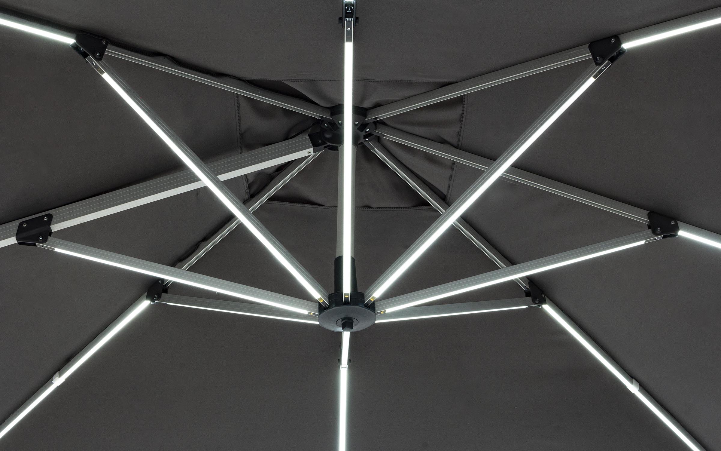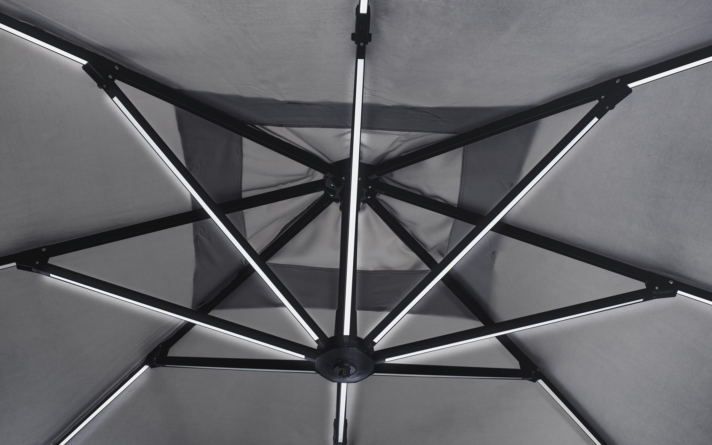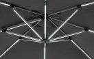 Oświetlenie białe LED w żebrach ładowane z dołączonego panela solarnego (na szczycie parasola).