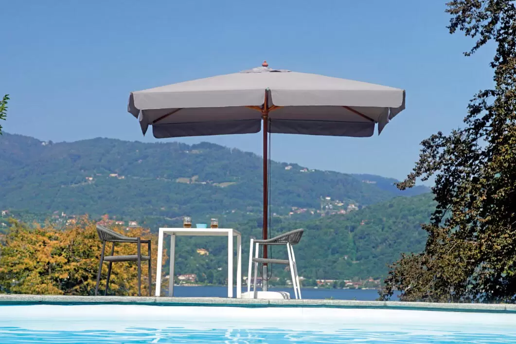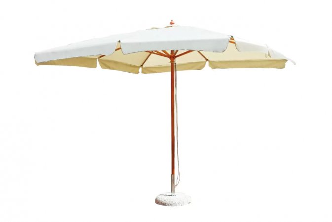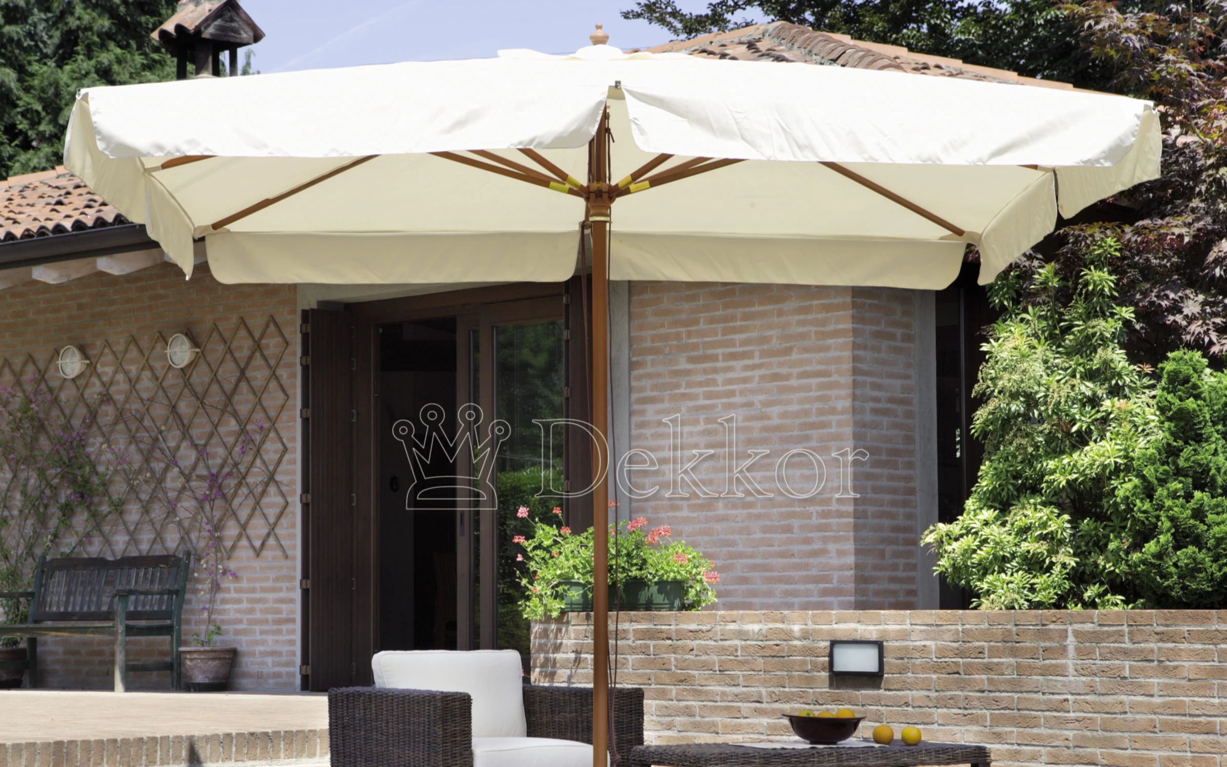 Lekki parasol ogrodowy z nogą centralną jednoczęściową z egzotycznego drewna i poszyciem z falbaną.