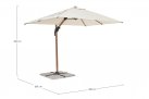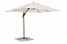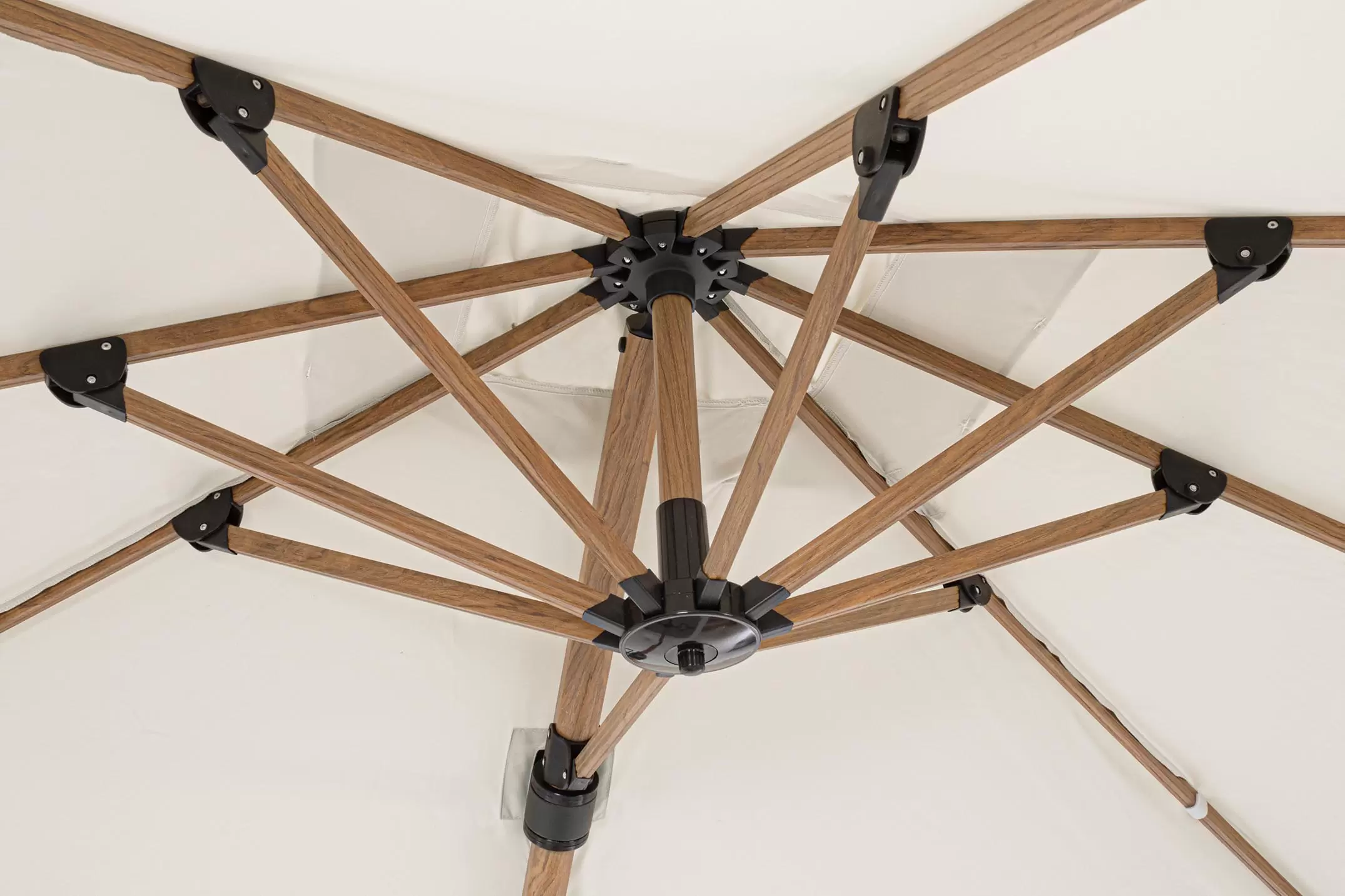 Parasol Orion to doskonała opcja zarówno do ogrodu, jak i na taras. Posiada on ramę wykonaną z aluminium z powłoką z efektem drewna i poszycie poliestrowe o gęstości 250 g/m2 pokryte PA (poliamidem) rozpięte na ramionach.