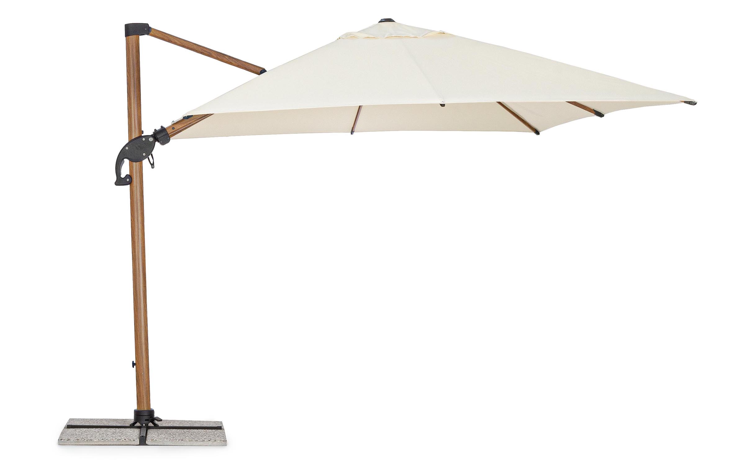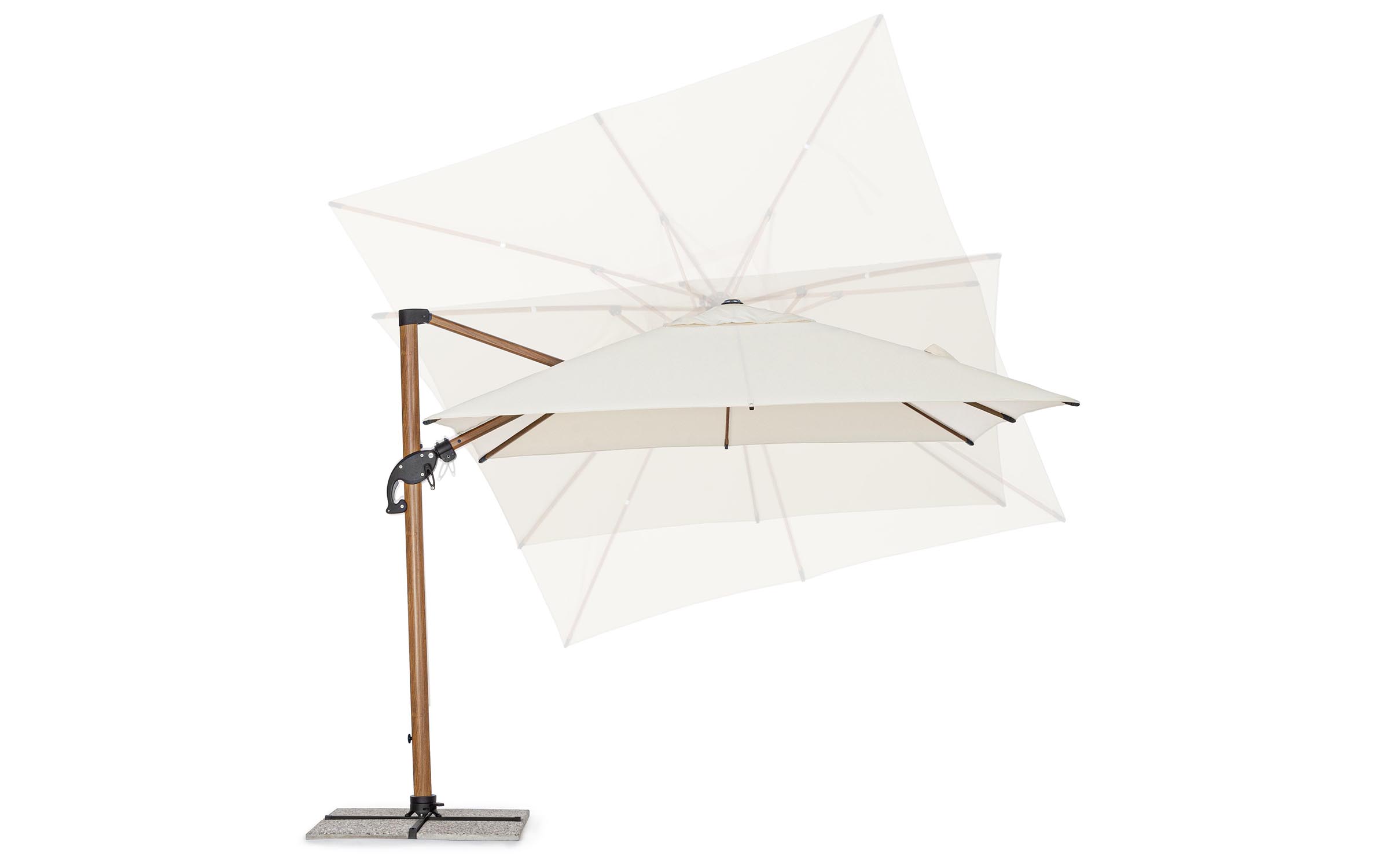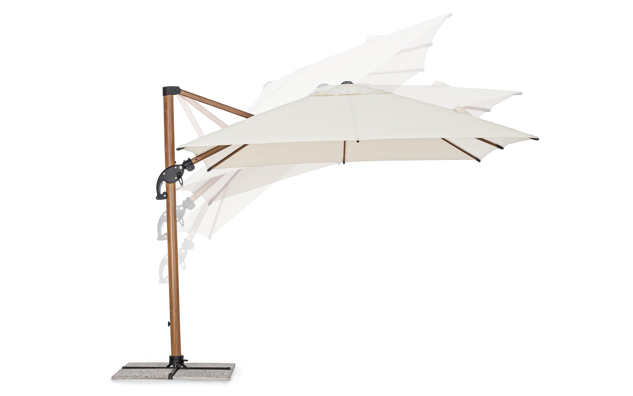 Czasza parasola może być obrócona o 360° wokół osi pionowej słupa za pomocą pedału lub zmienić kąt w 2 płaszczyznach.