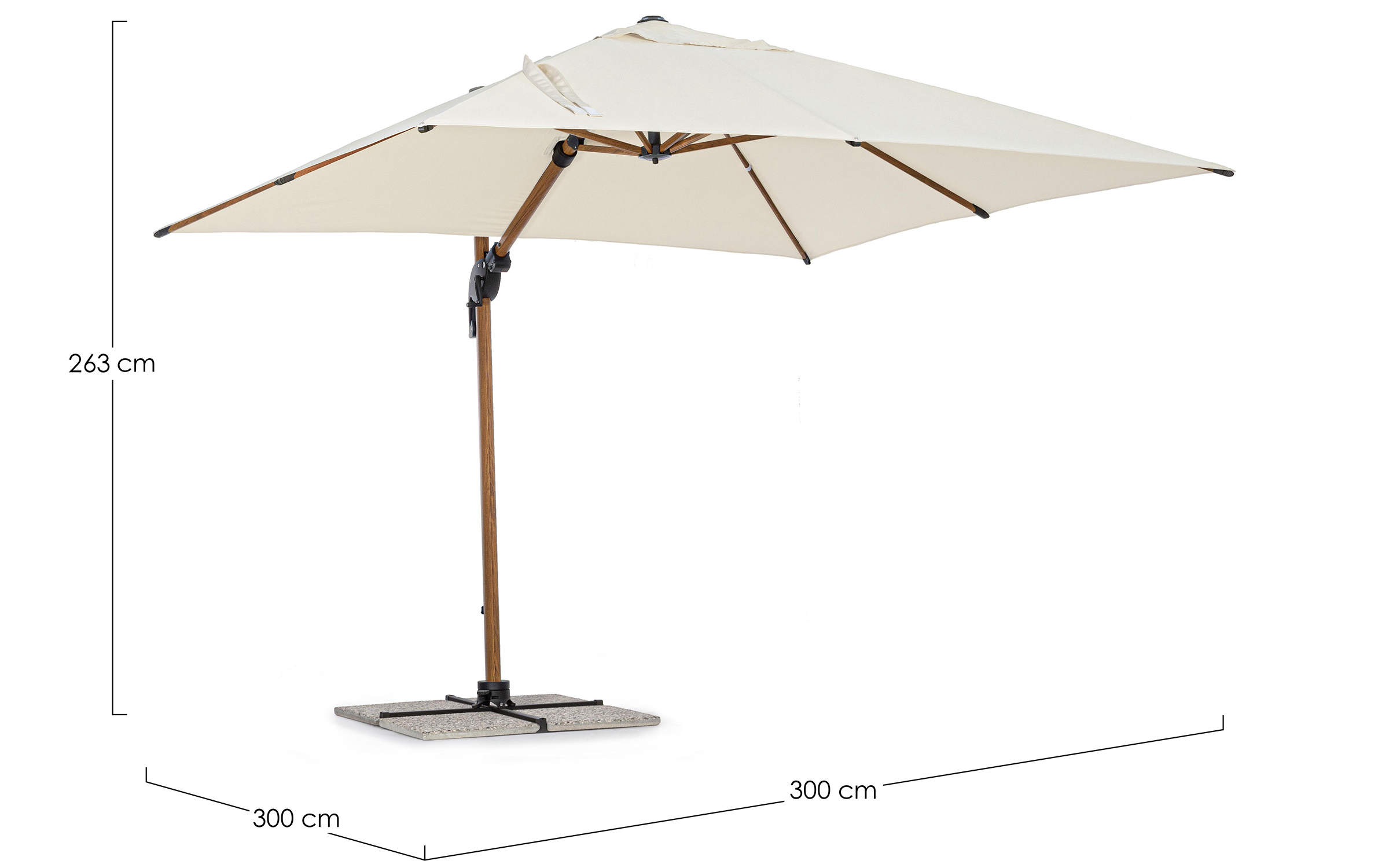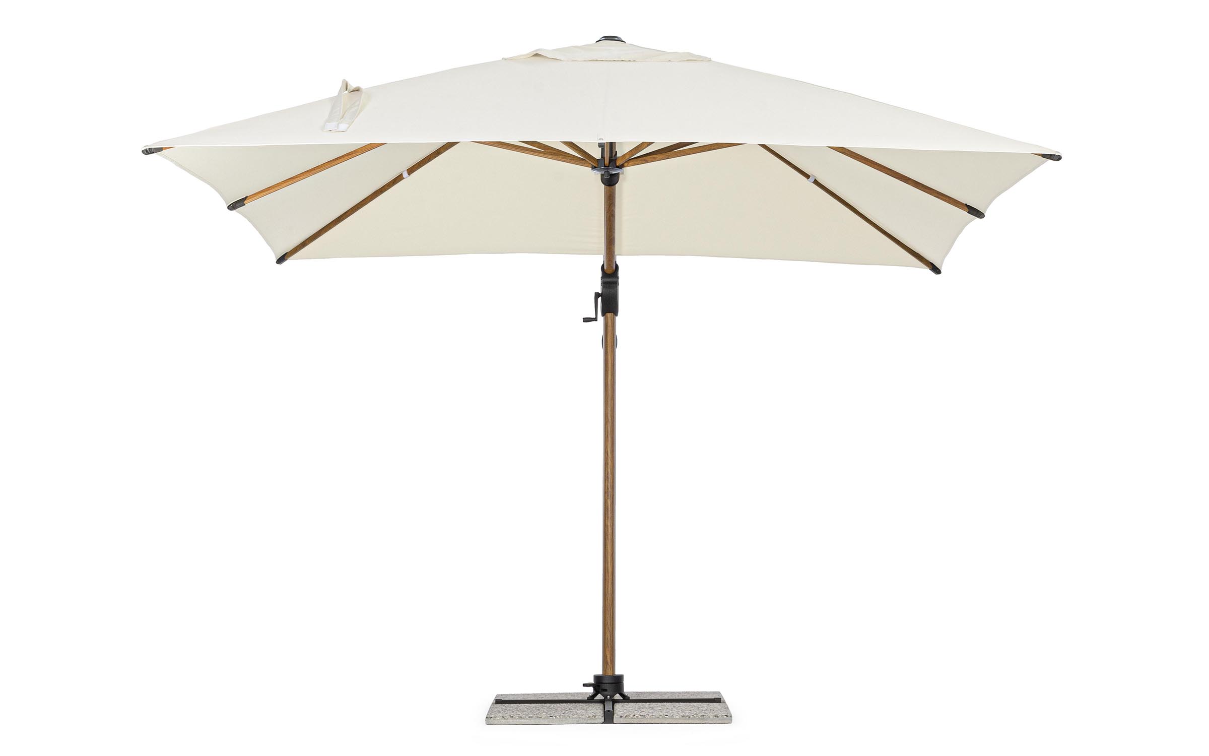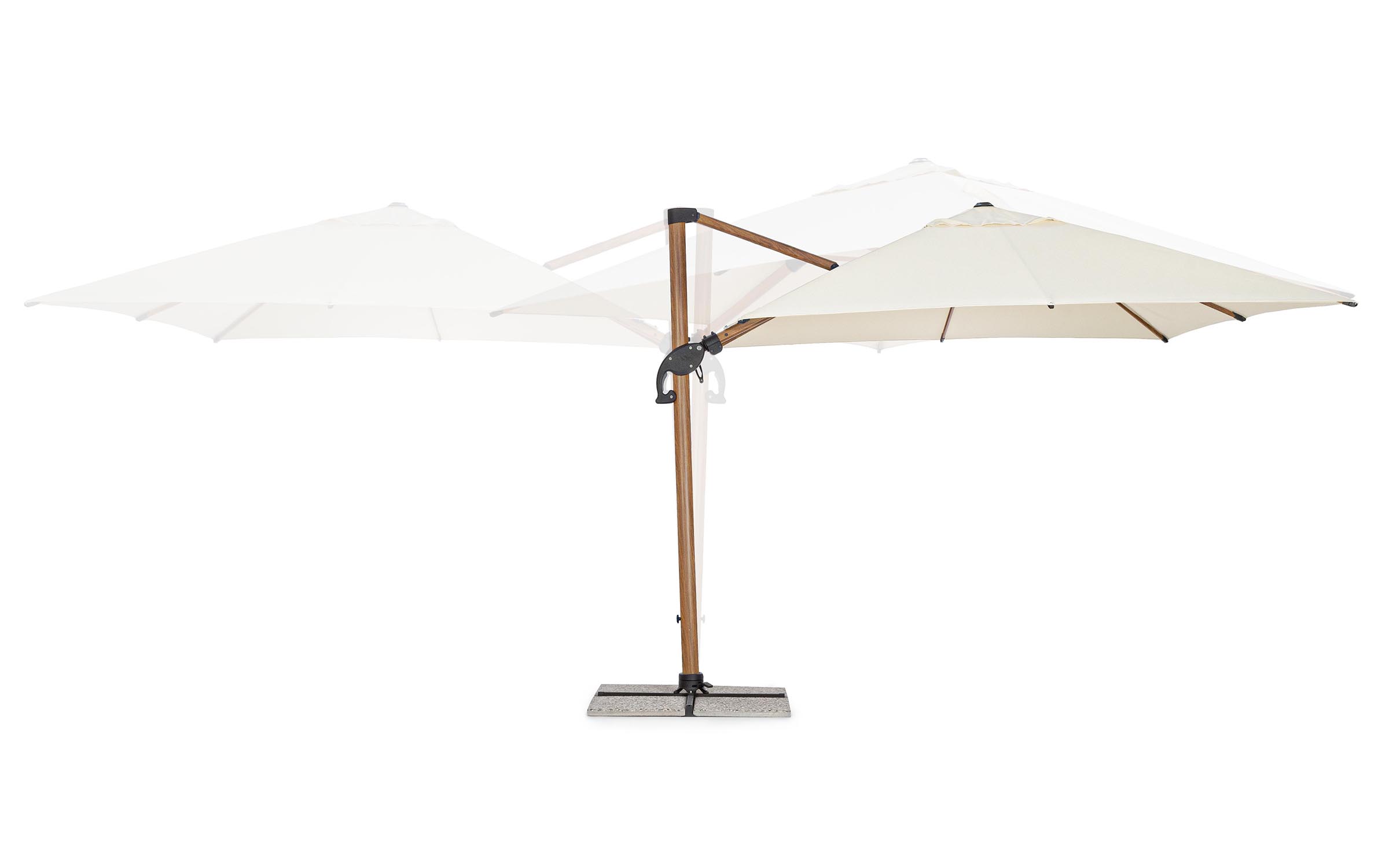 Czasza parasola może być obrócona o 360° wokół osi pionowej słupa za pomocą pedału lub zmienić kąt w 2 płaszczyznach.