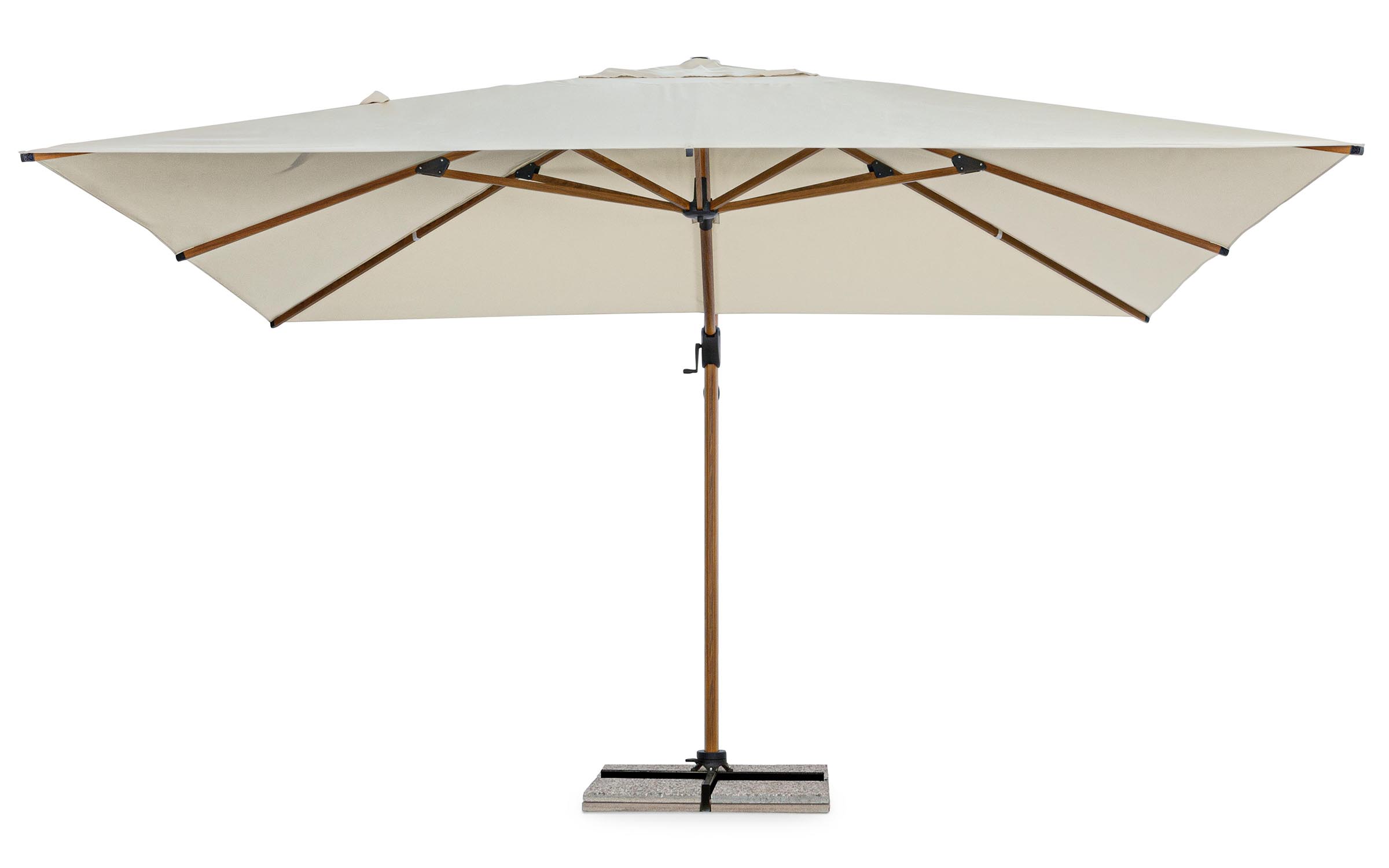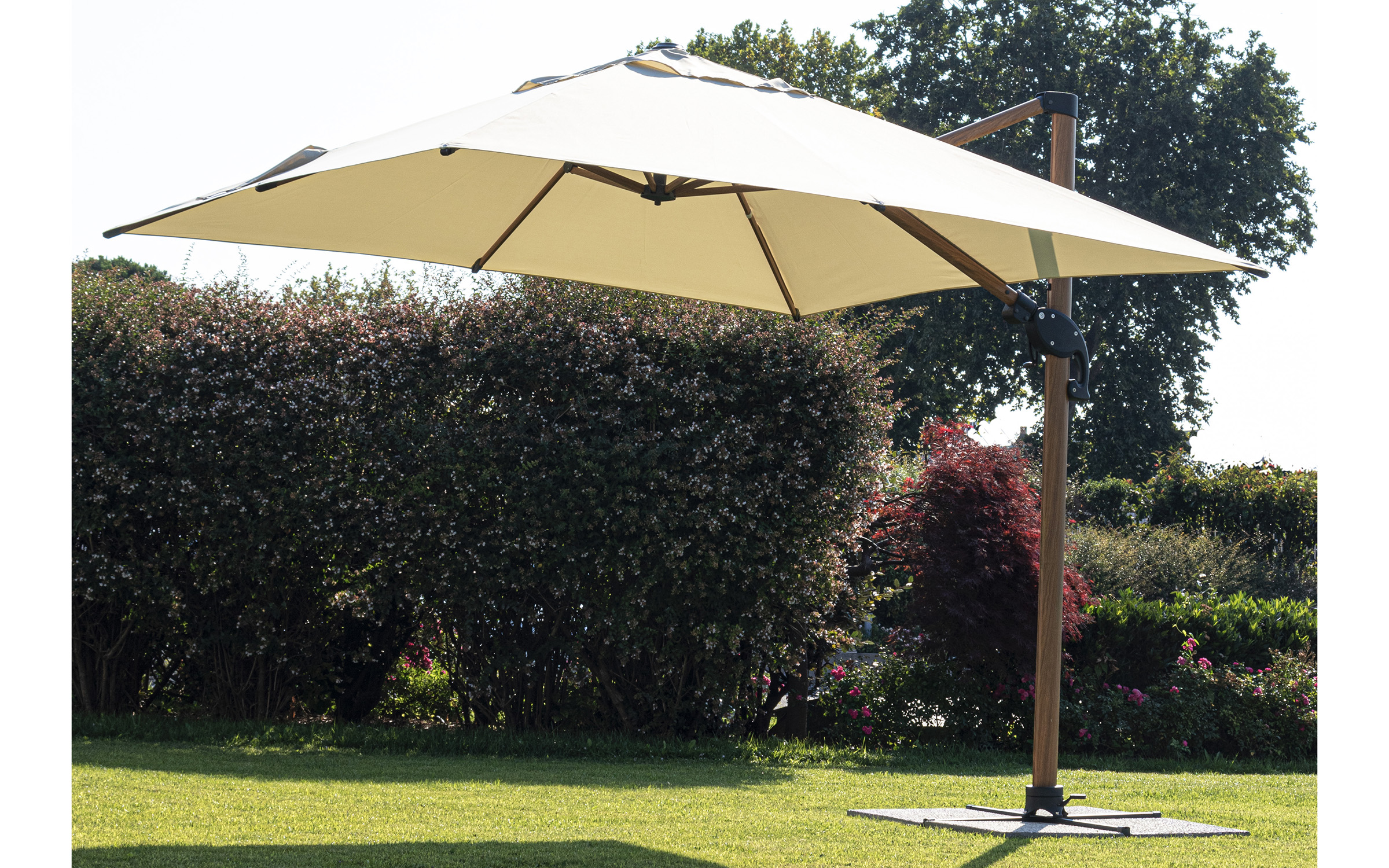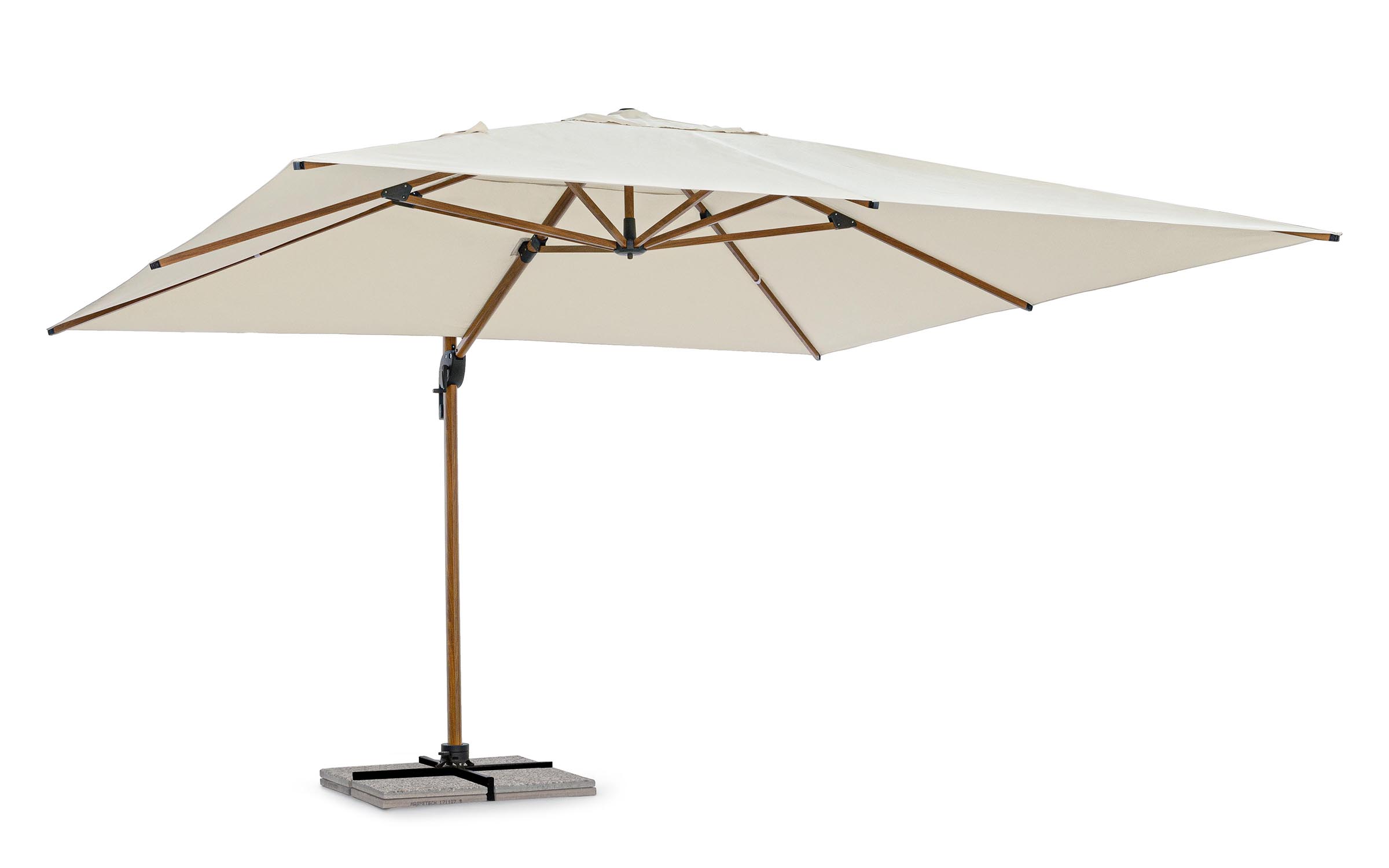 Czasza parasola może być obrócona o 360° wokół osi pionowej słupa za pomocą pedału lub zmienić kąt pochylenia w 1 płaszczyĹşnie.
